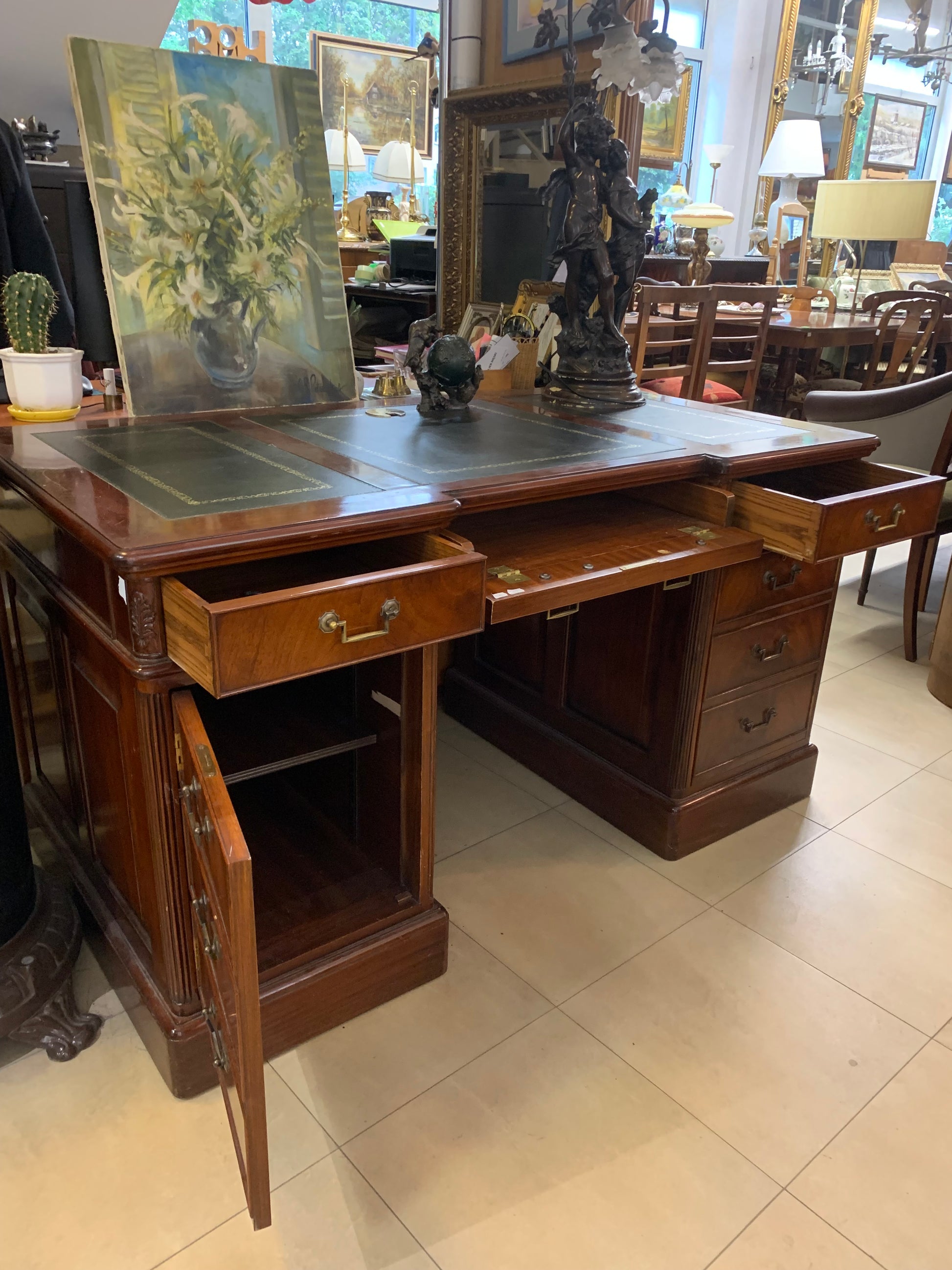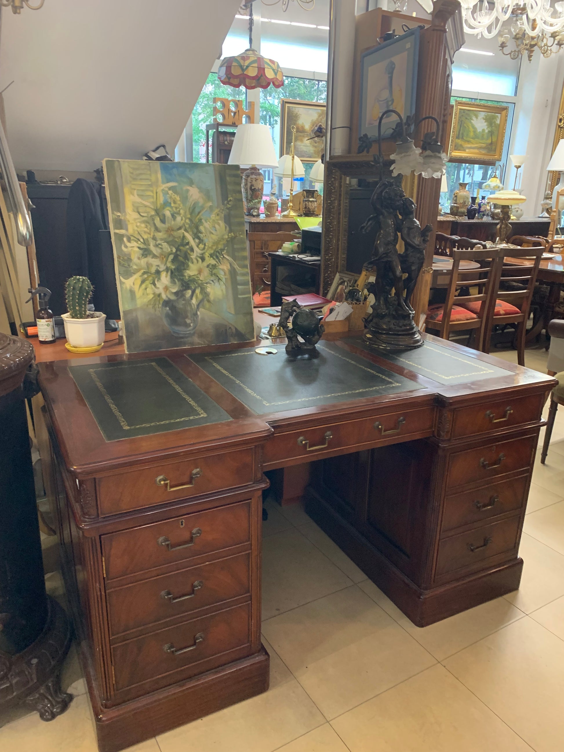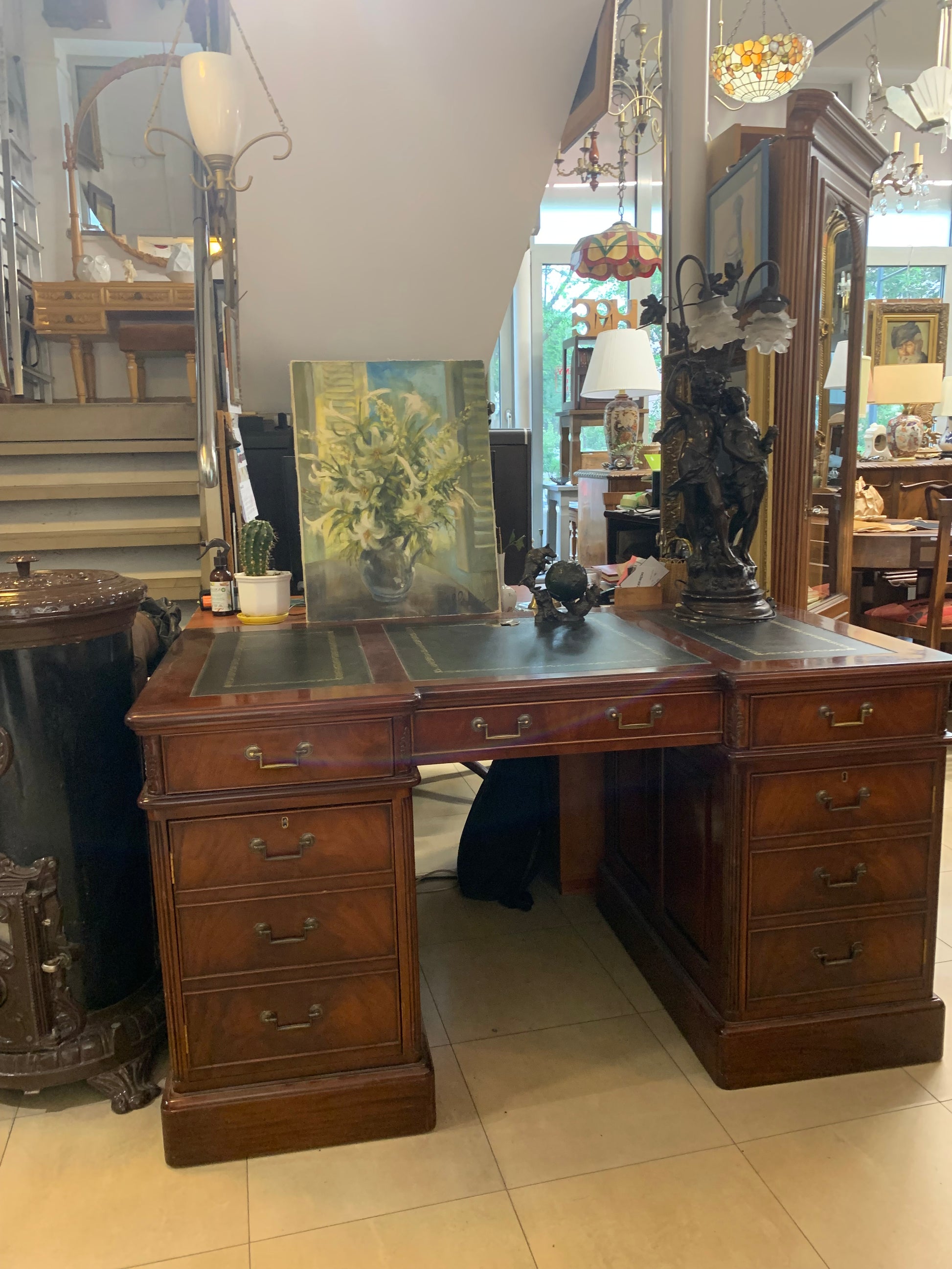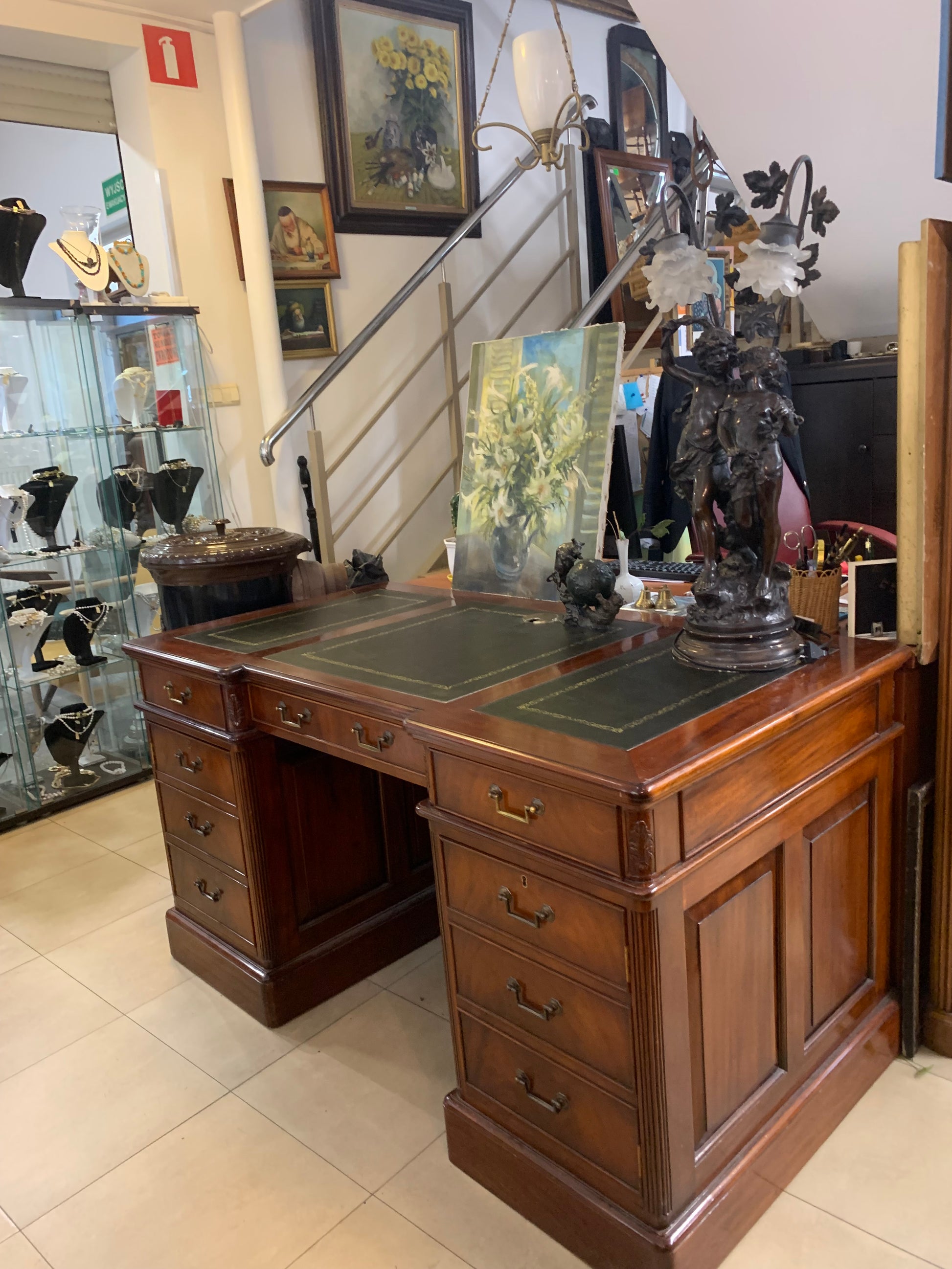 Biurko angielskie mahoniowe, blat - wyściełany skórą naturalną, wyposażone w szafki po bokach oraz praktyczne szufladki. Na blacie jest otwór do instalacji kabli do komputera. Możliwość ustawienia biurka na środku (tył mebla wykończony tak jak boki).
