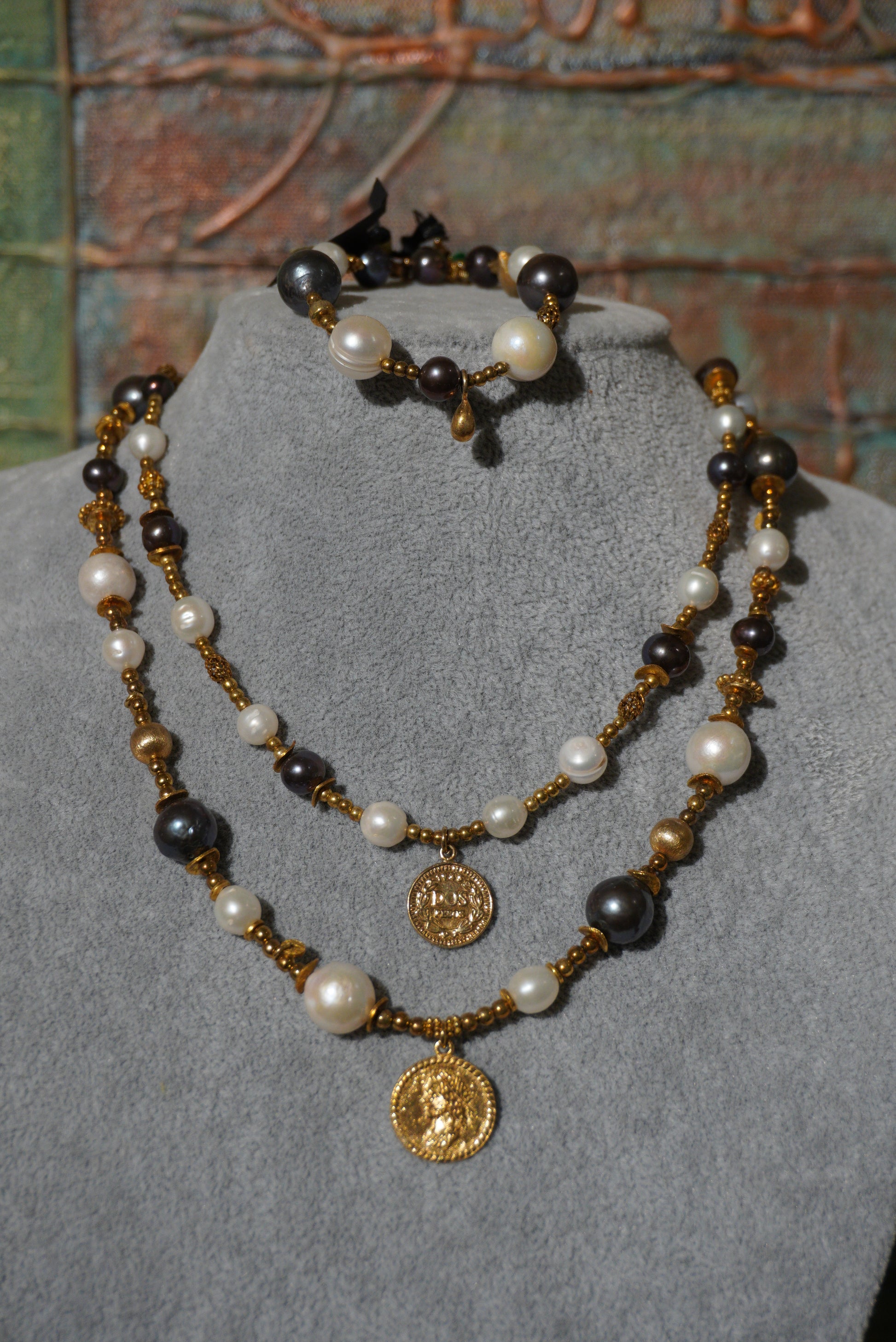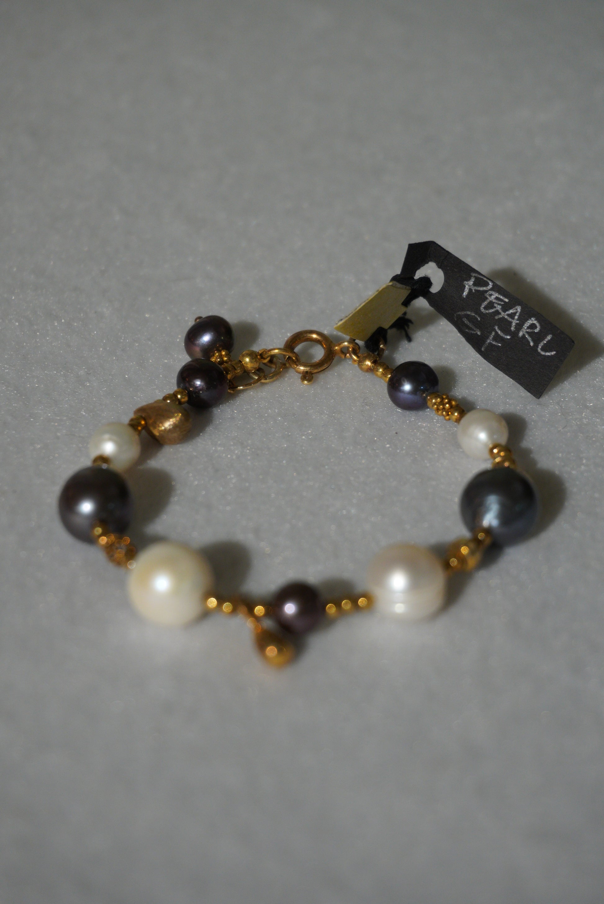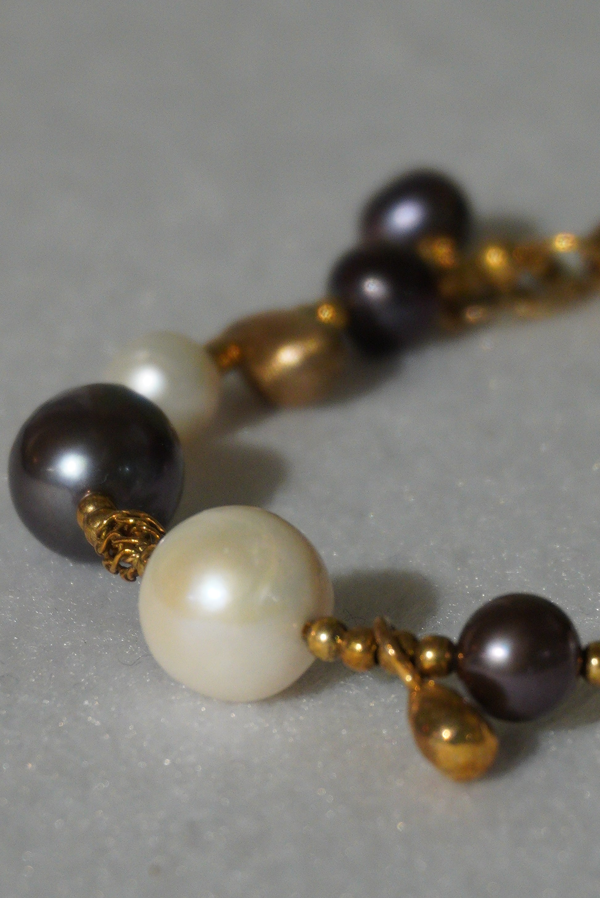 Bransoletka perła biała, bakłażanowa, przełożona zdobionym srebrem pozłacanym. Możliwość zakupienia naszyjnika do kompletu.