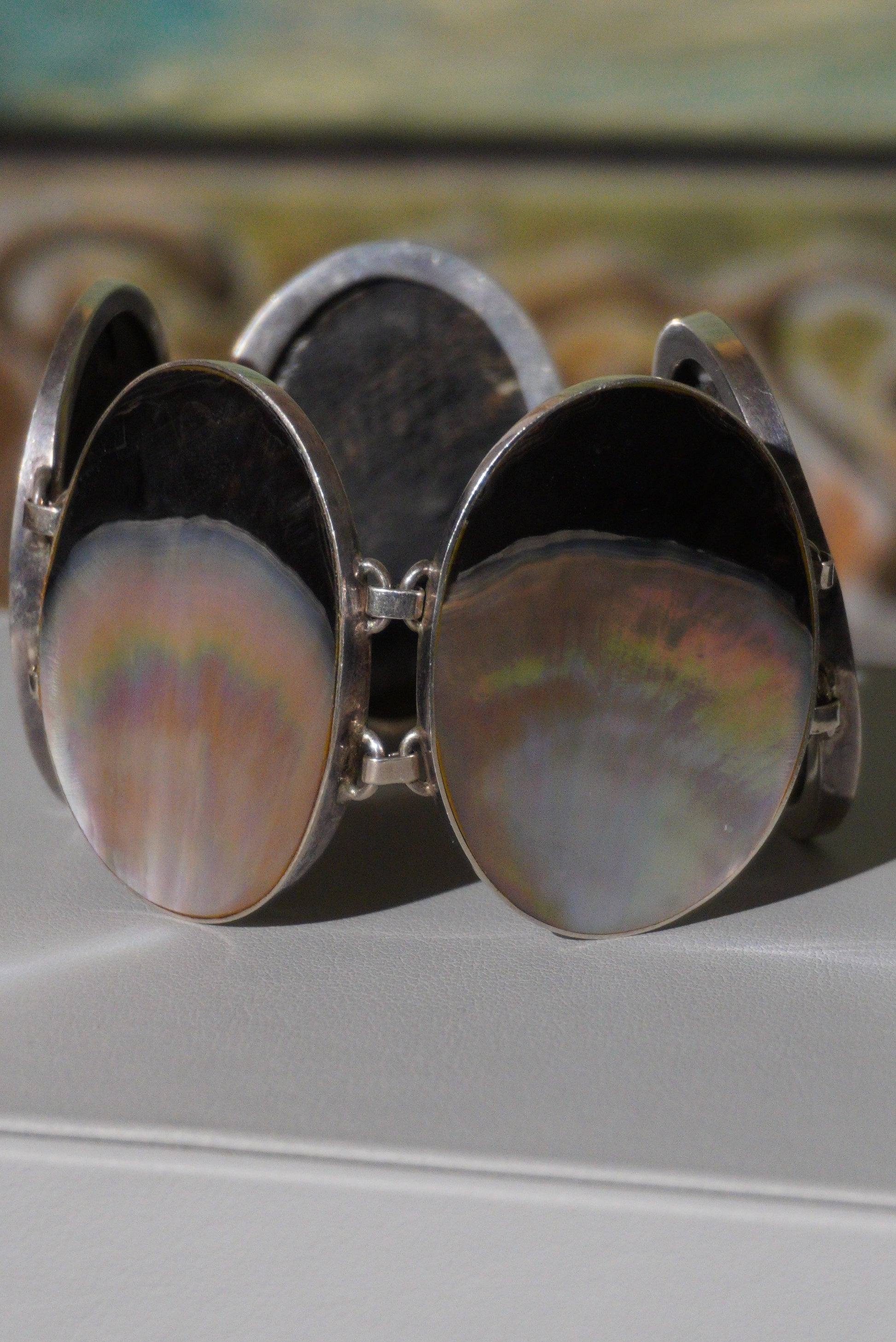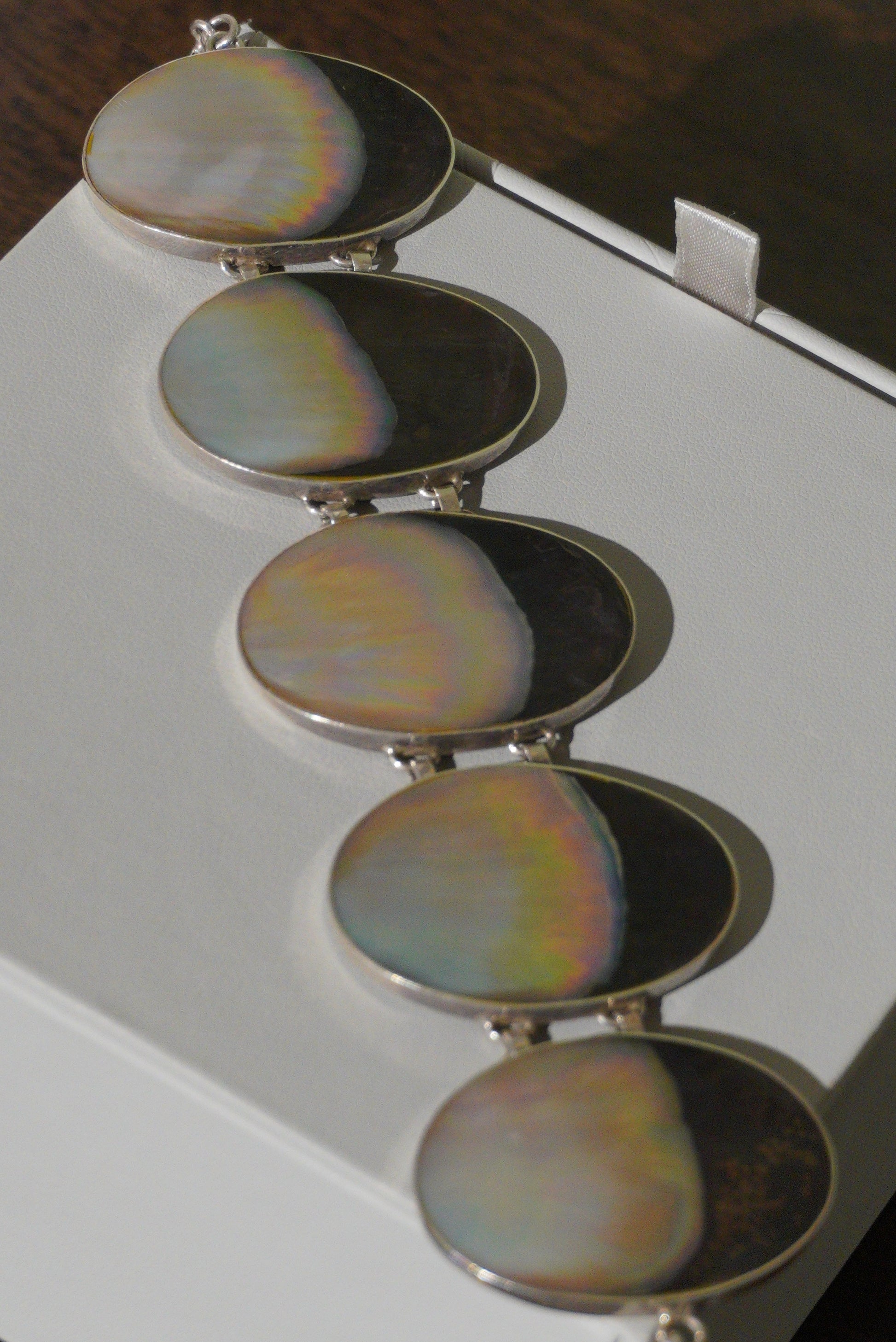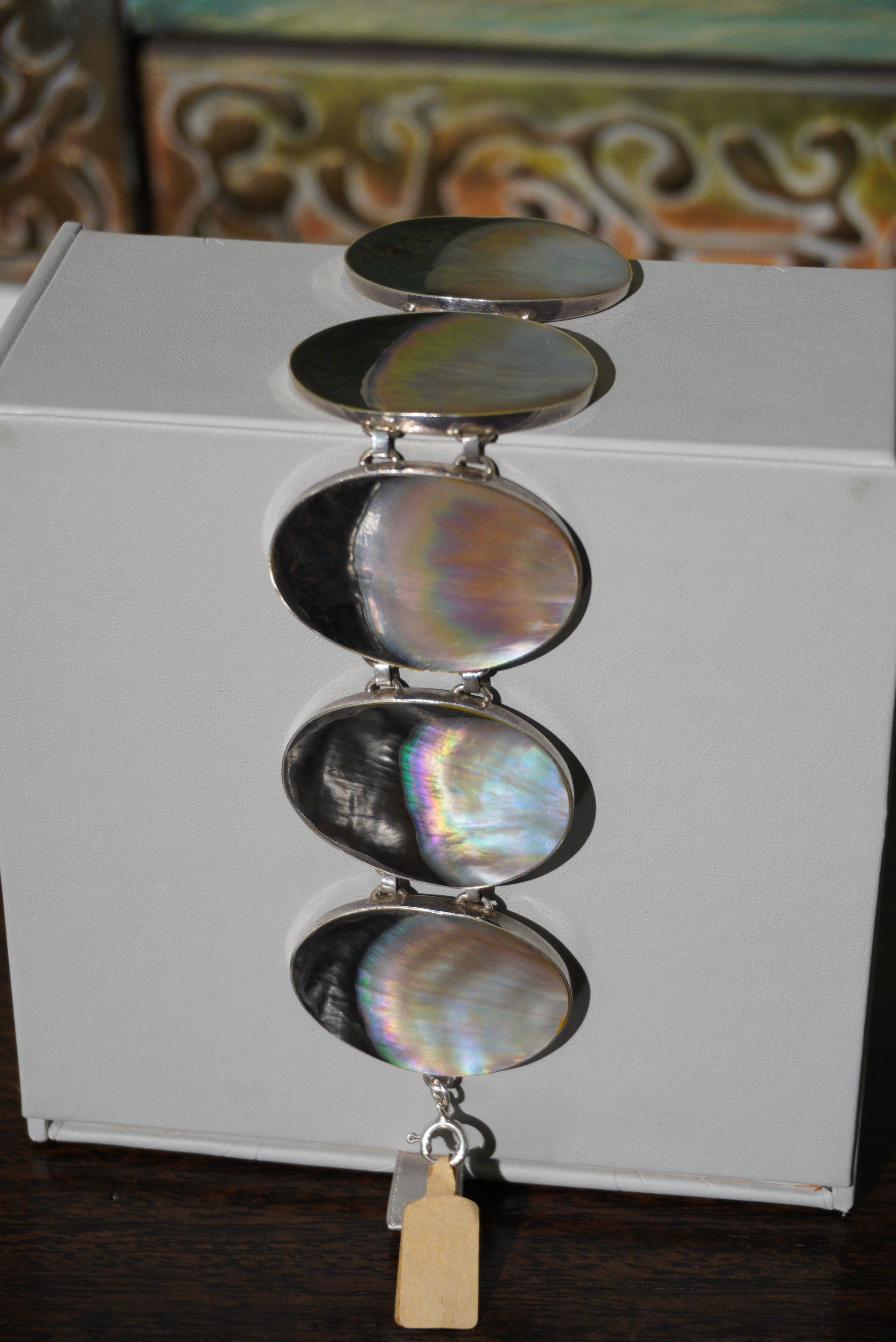 Efektowna bransoletka srebrna pr. 925, muszla. Do kompletu mamy naszyjnik i pierścionek.