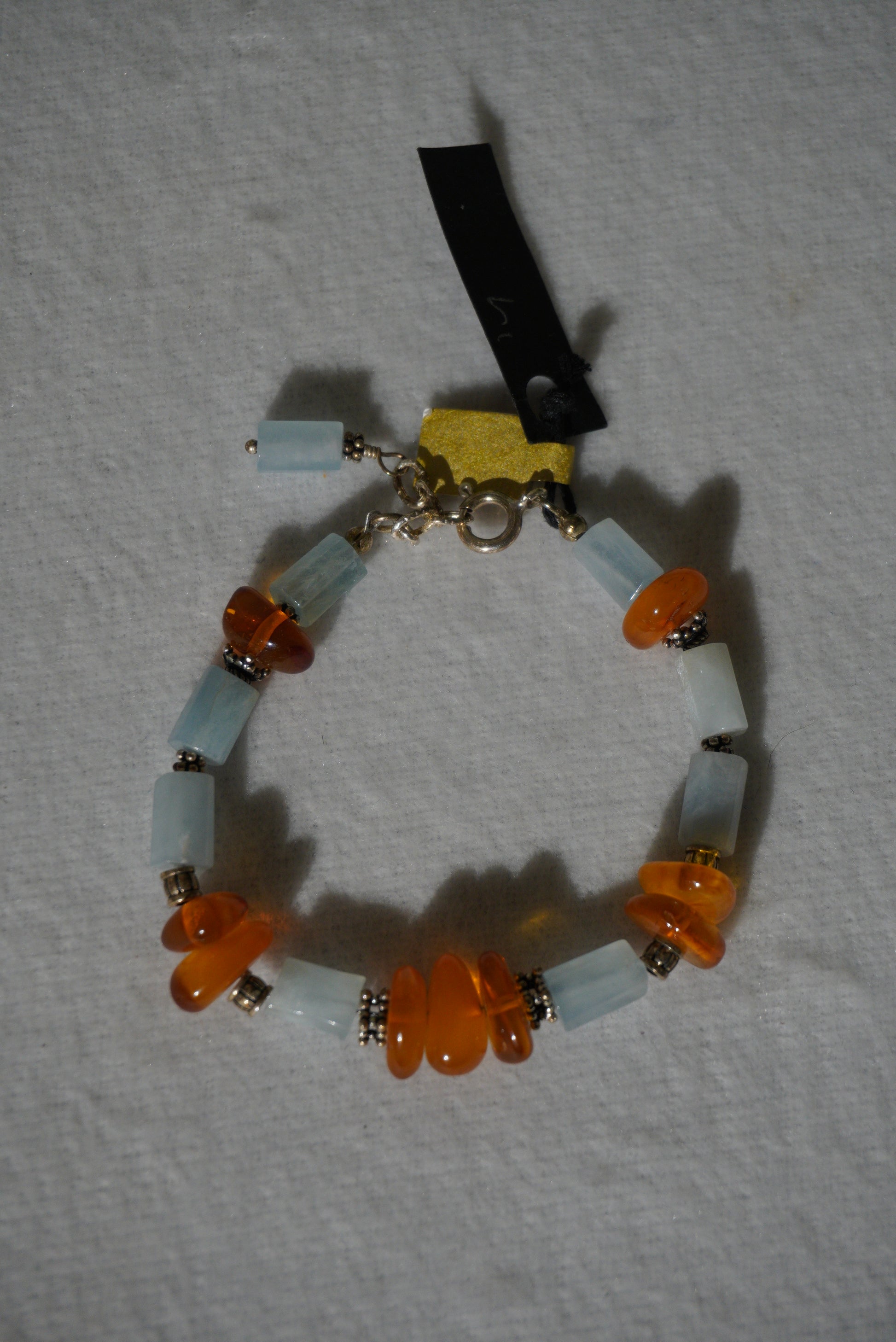 Bransoletka bursztyn, akwamaryn, srebro 925