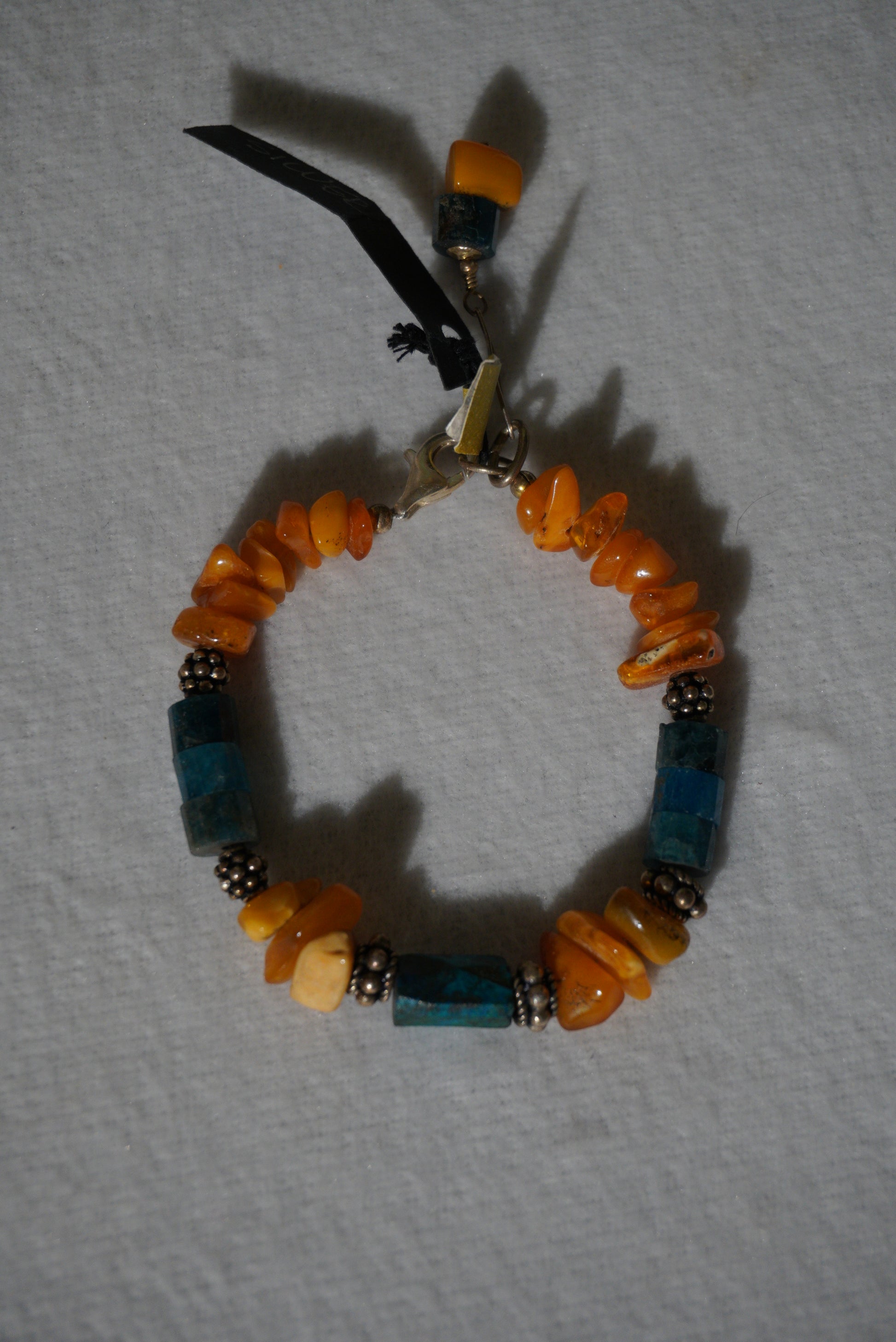 Bransoletka bursztyn, apatyt, chryzokola, srebro 925