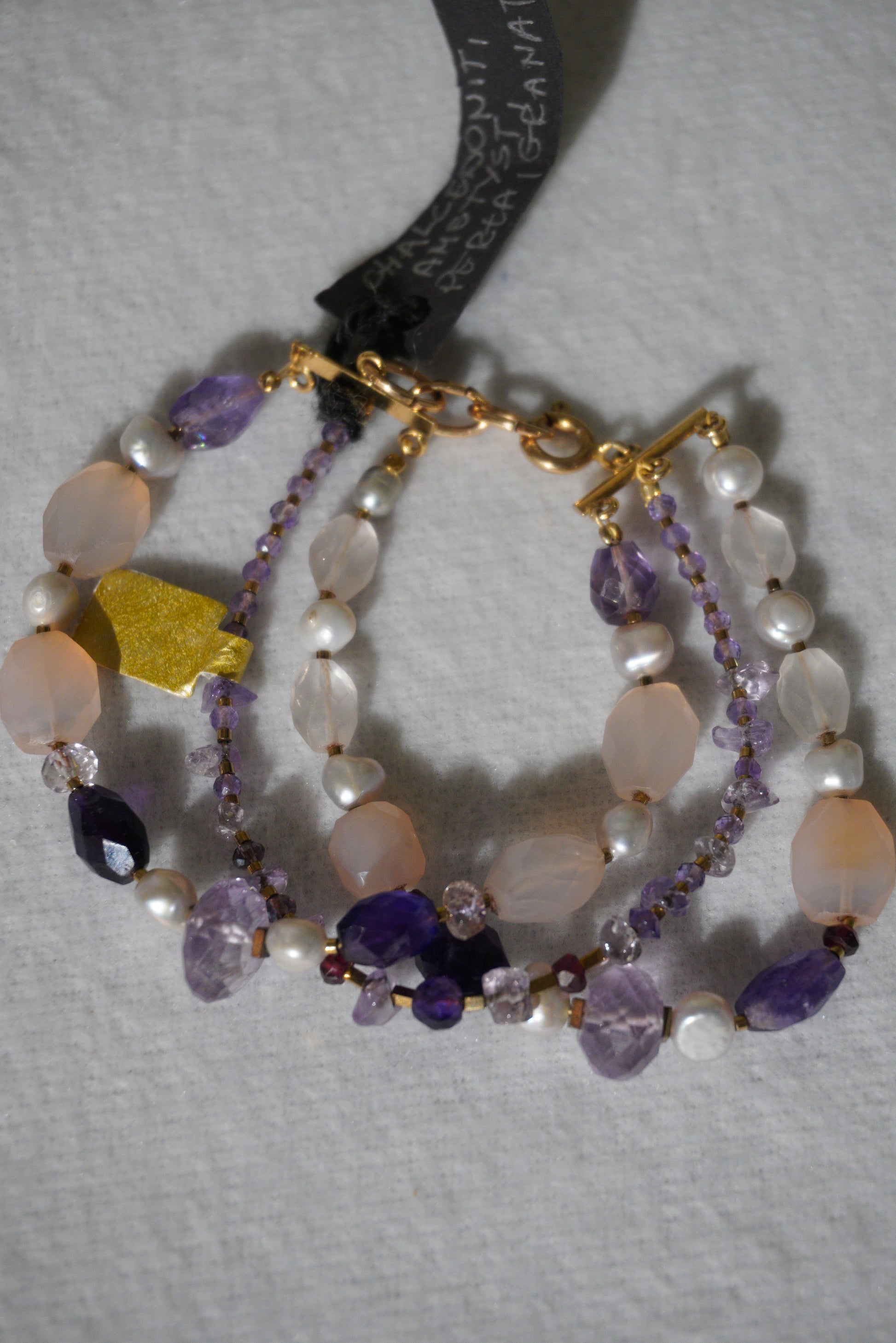 Bransoletka chalcedonit, ametyst, perła, granat, hematyt, srebro pozłacane 925