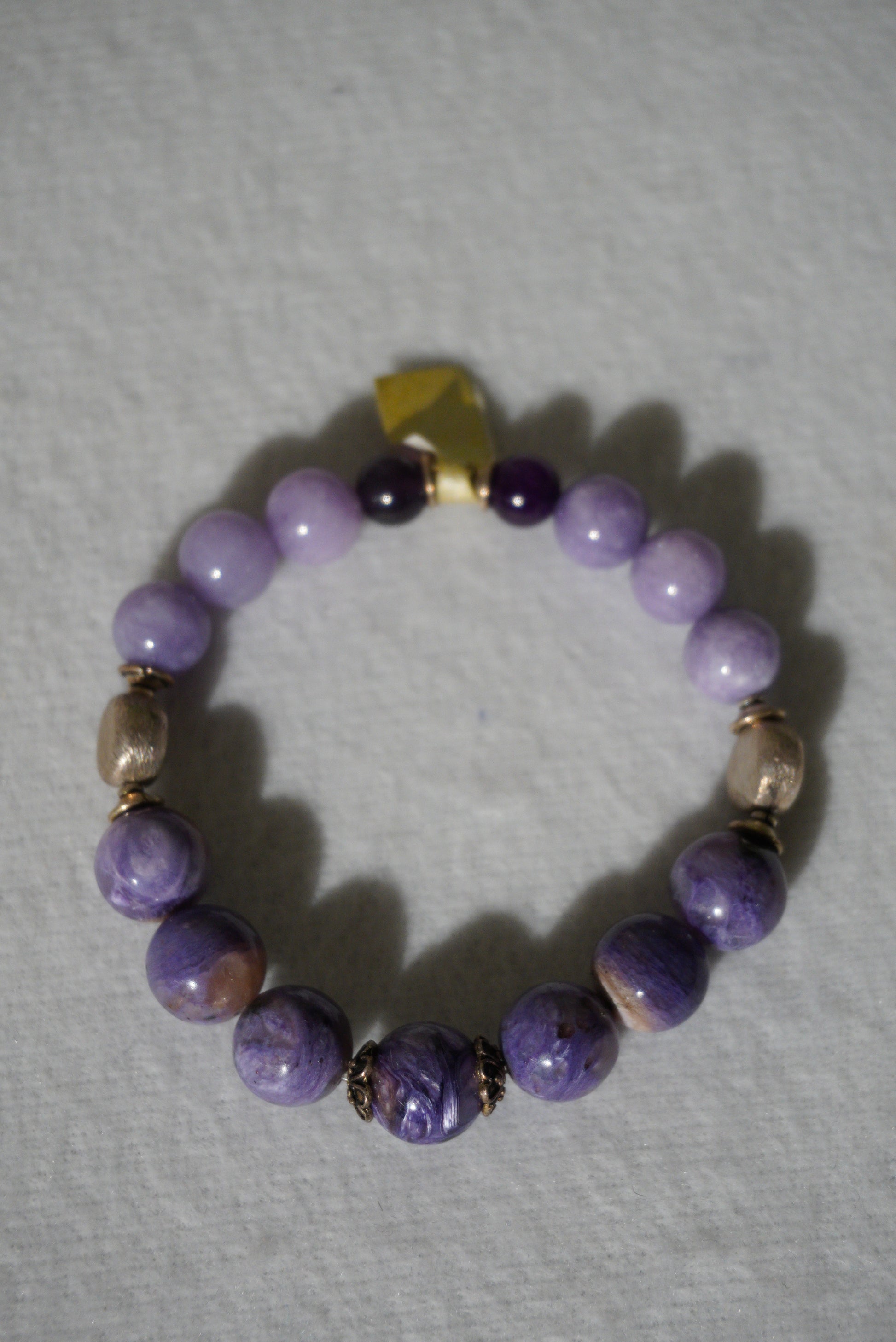 Bransoletka charoite, ametyst, srebro 925, na gumce
