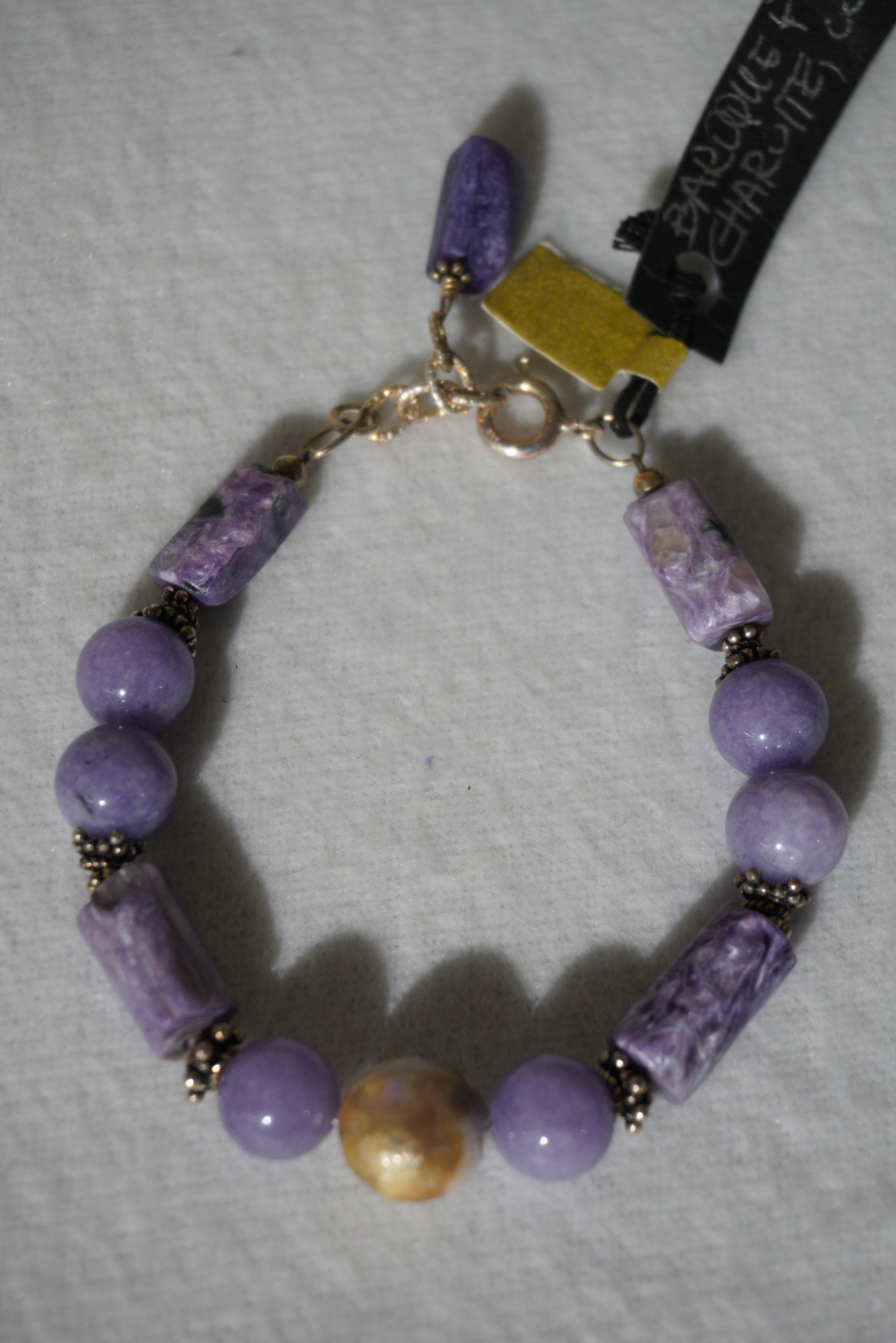 Bransoletka charoite, perła barokowa, jadeit, srebro 925