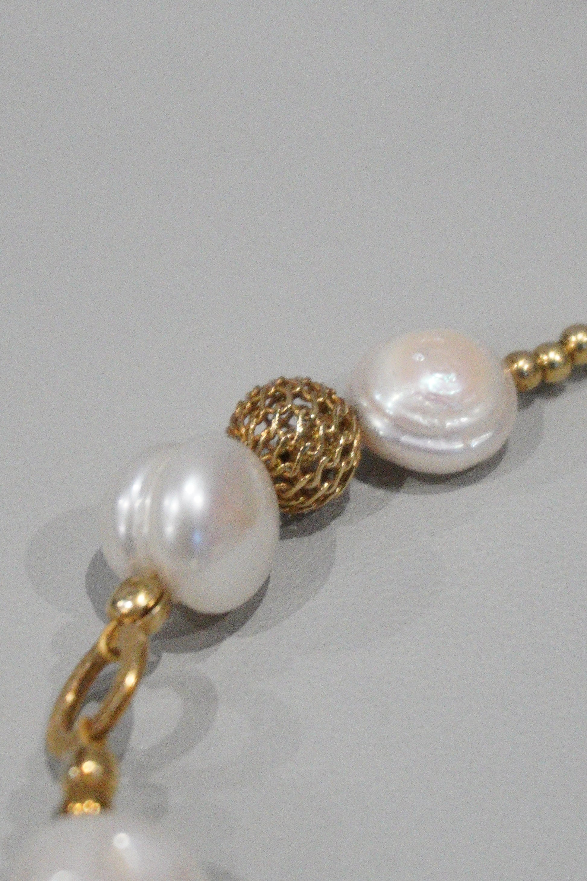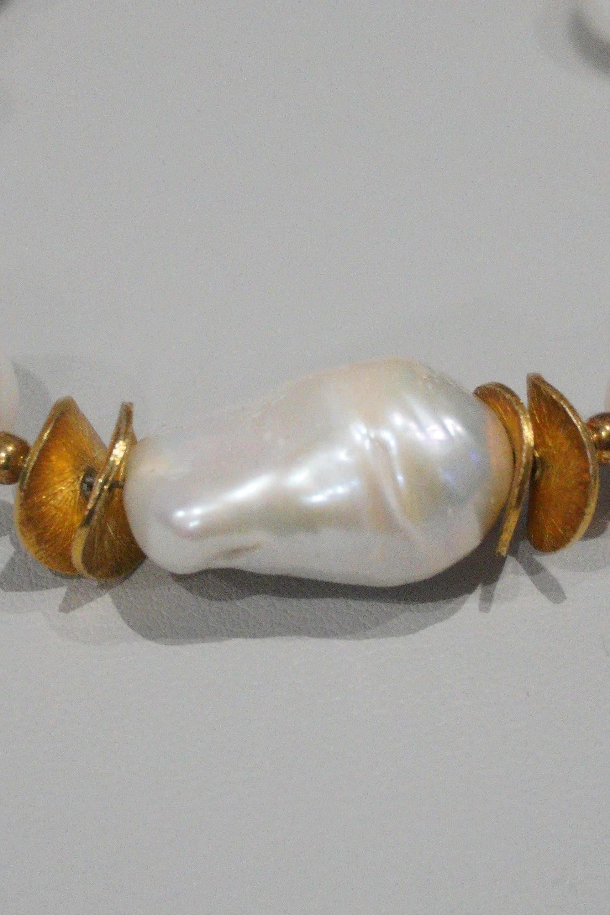 Piękna bransoletka z pereł hodowlanych, środek bransoletki perła barokowa, przekładki srebro pozłacane.