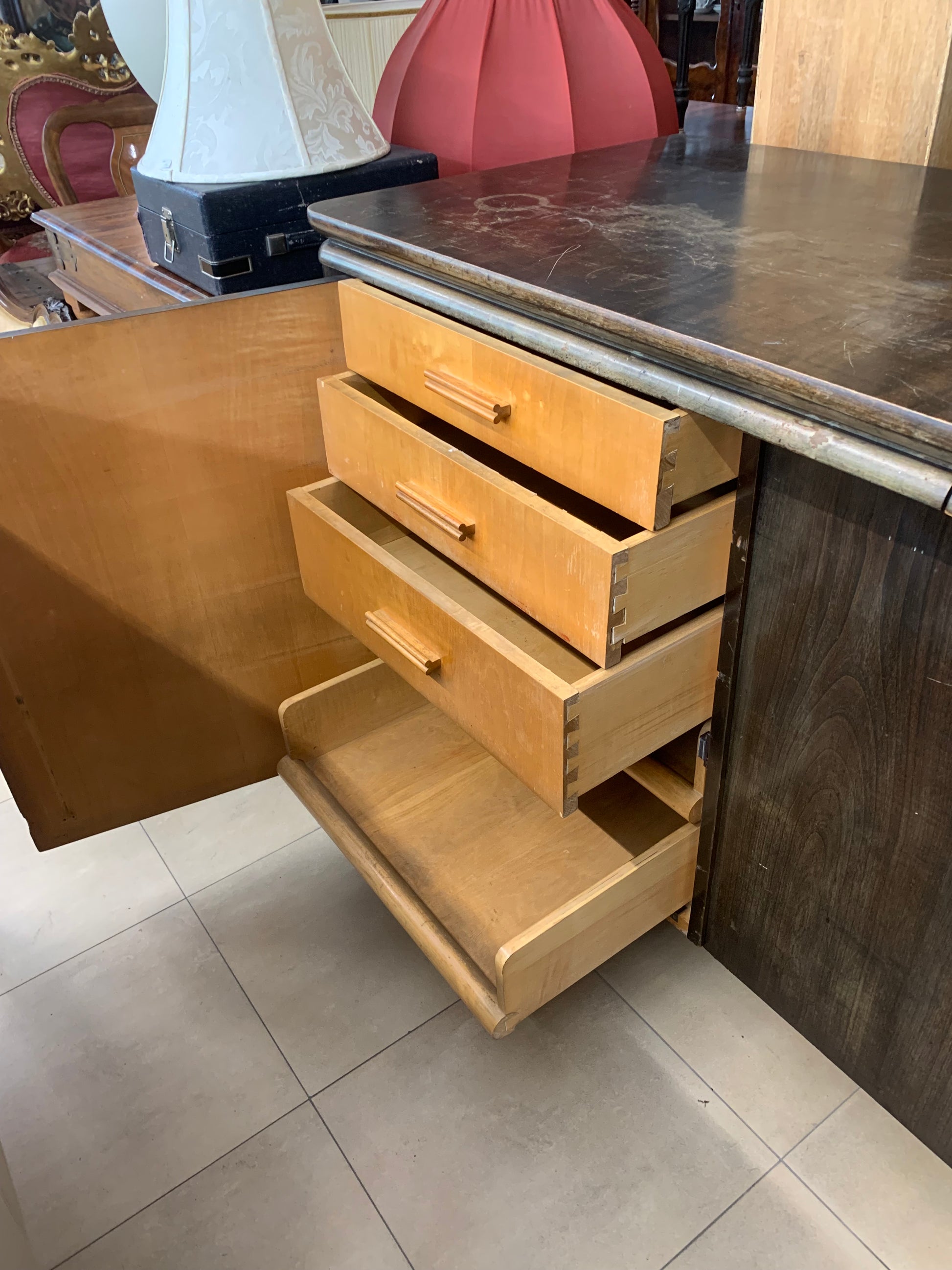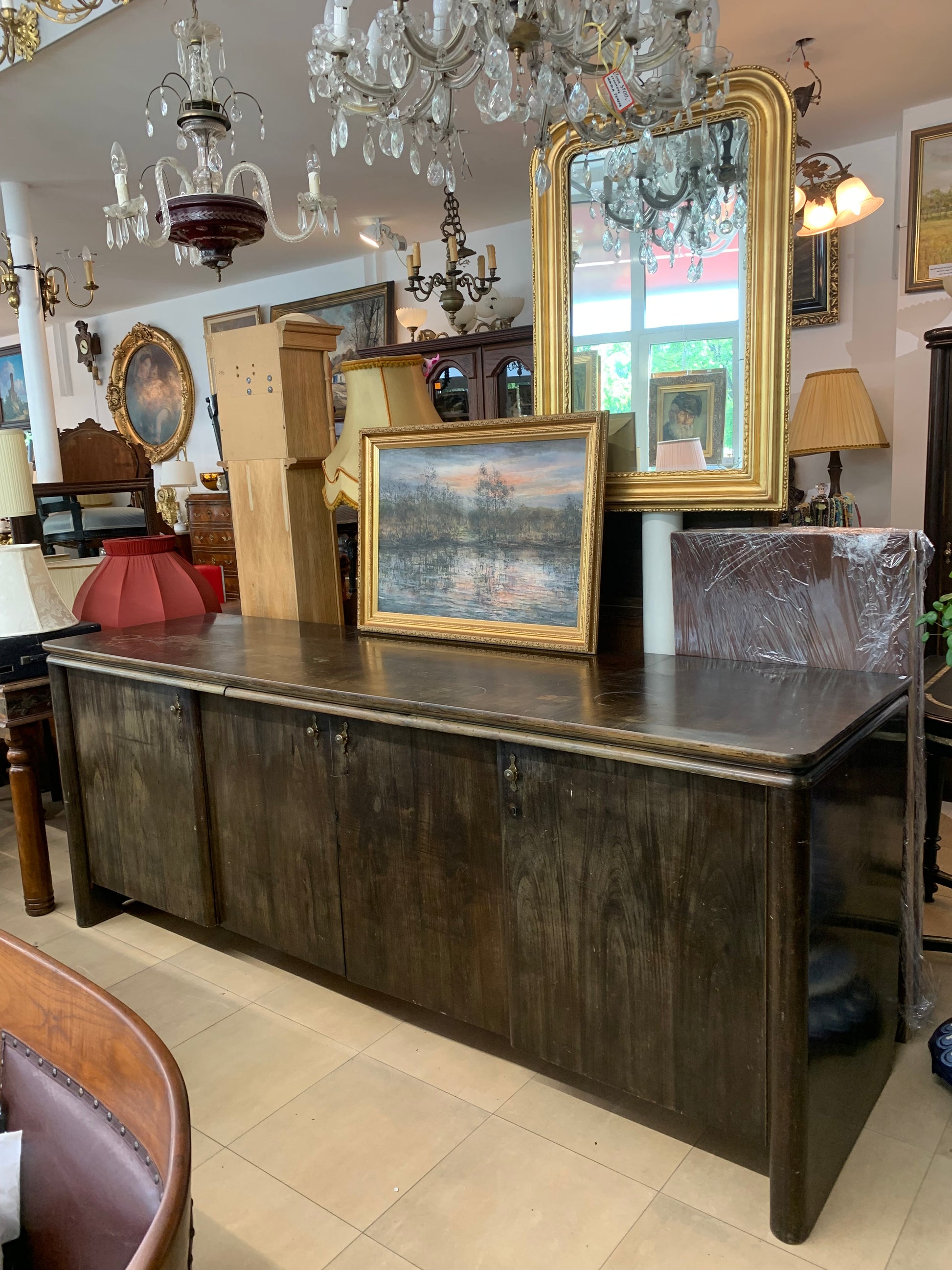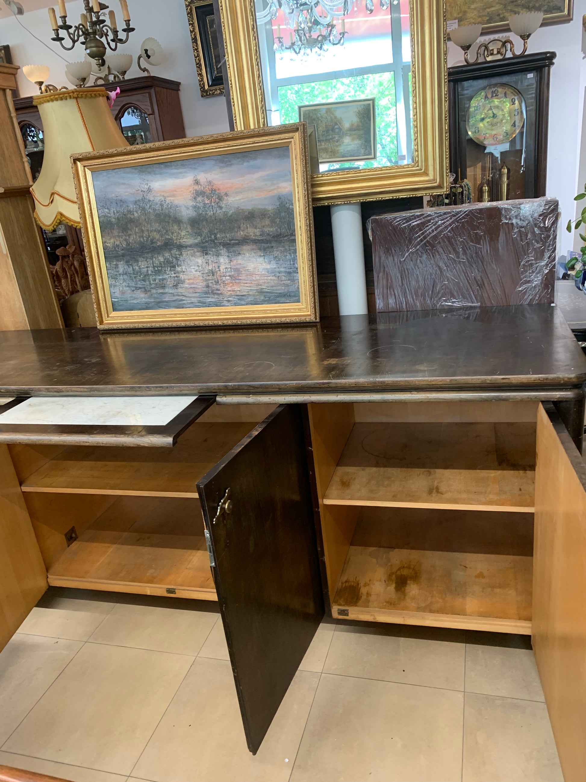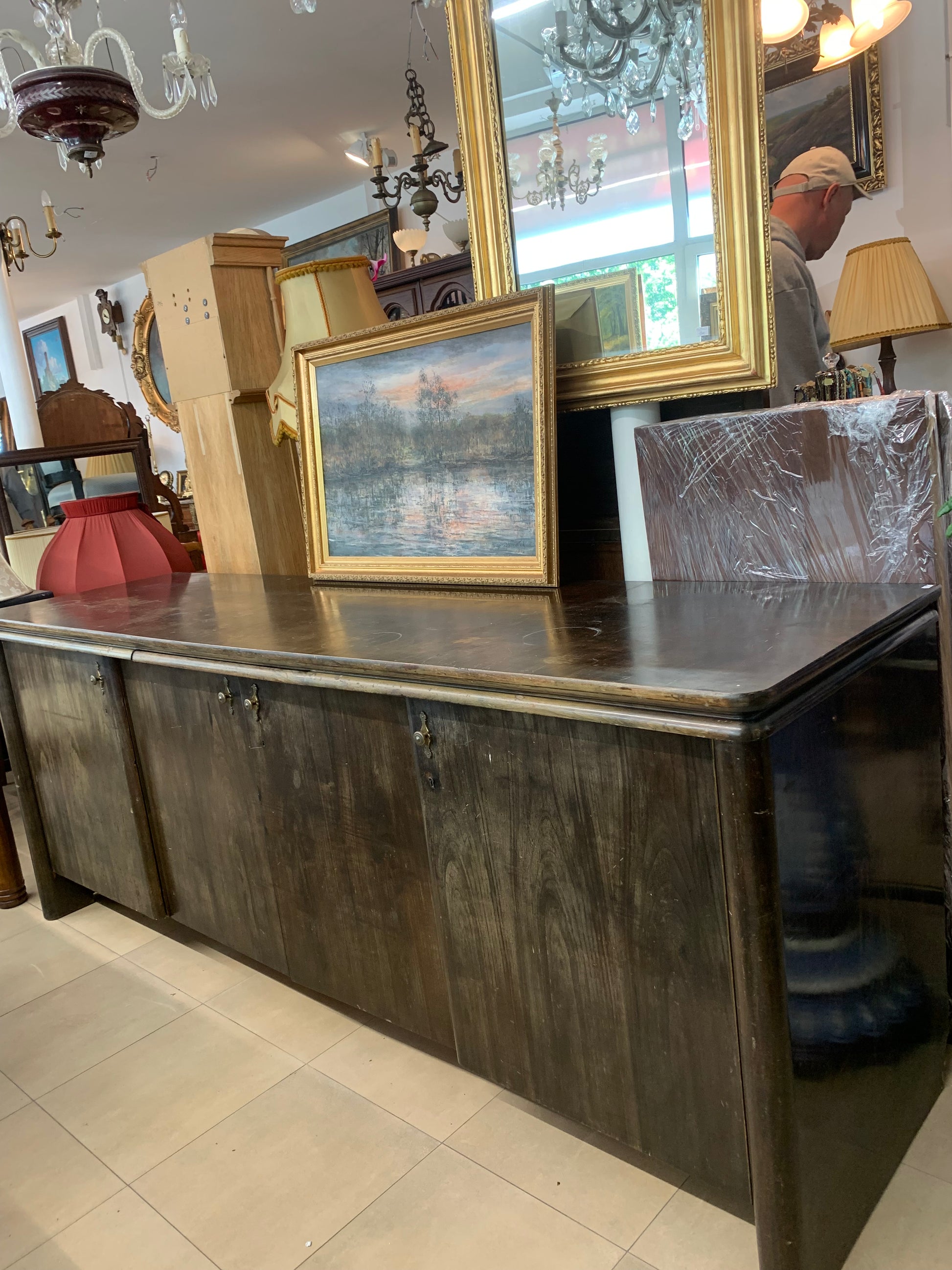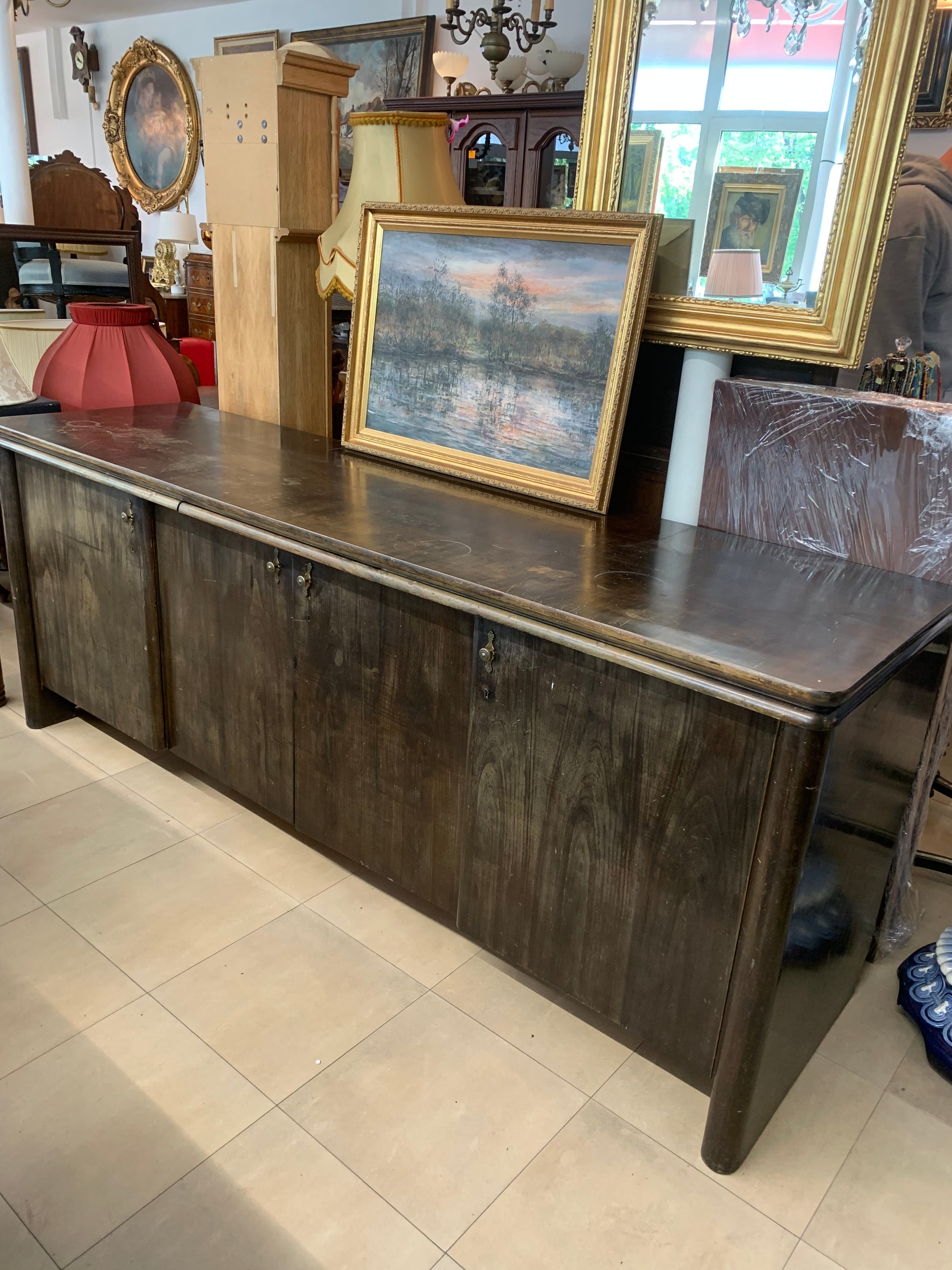 Solidny bufet przedwojenny z litego drewna orzechowego , przyciemniany w kolorze palisandru. W środku pojemne schowki z wysuwanymi szufladkami, półkami, blat wyposażony wysuwanym blatem pomocniczym. Dodatkowo do komody mamy wąską nadstawkę ( nie ma na zdjęciu). Stan w środku mebla - bardzo dobrze zachowany, na zewnątrz do odświeżenia. Polecamy! Do kompletu posiadamy witrynę oszkloną, stół rozkładany oraz zegar stojący w tym samym stylu.