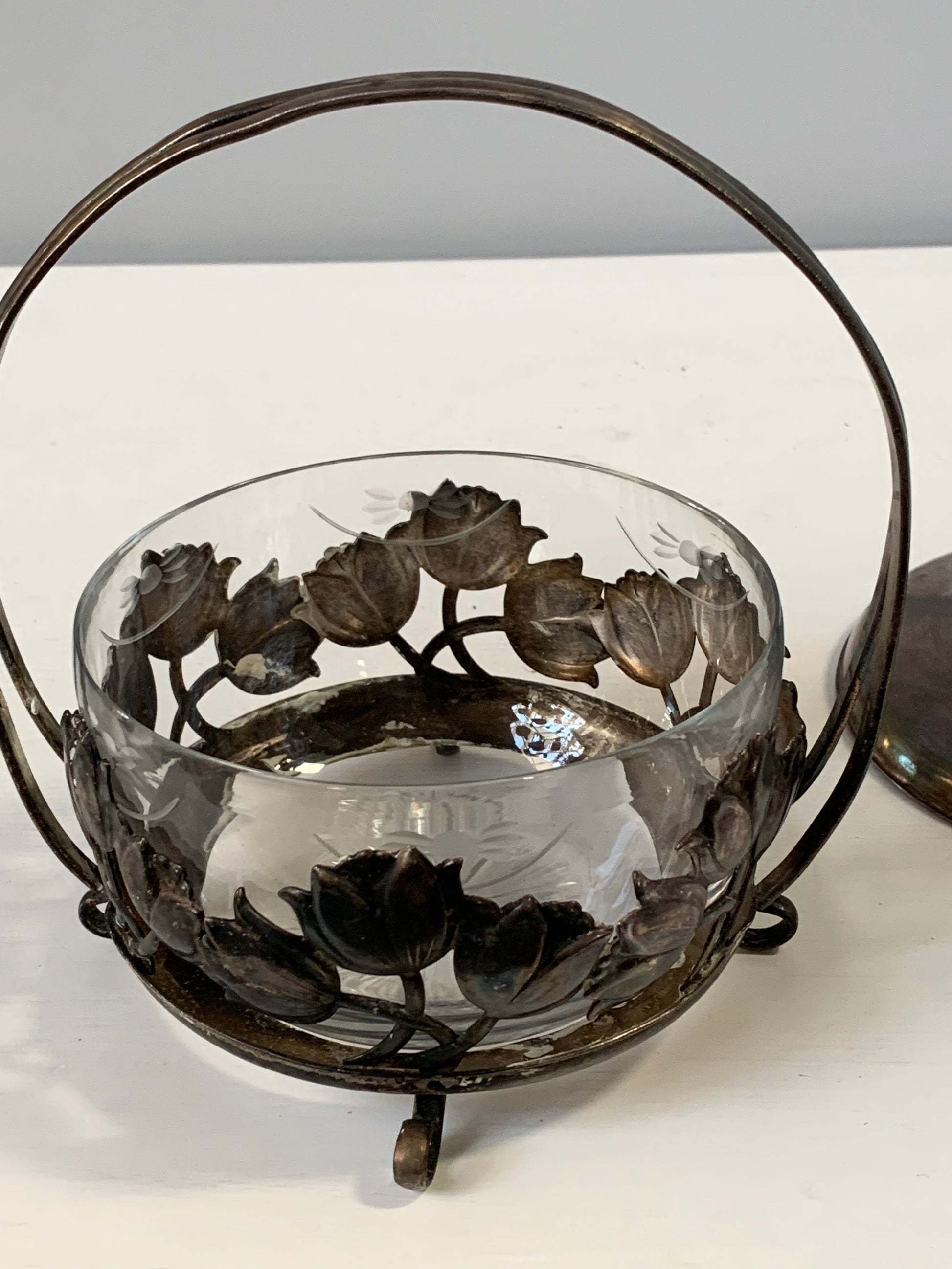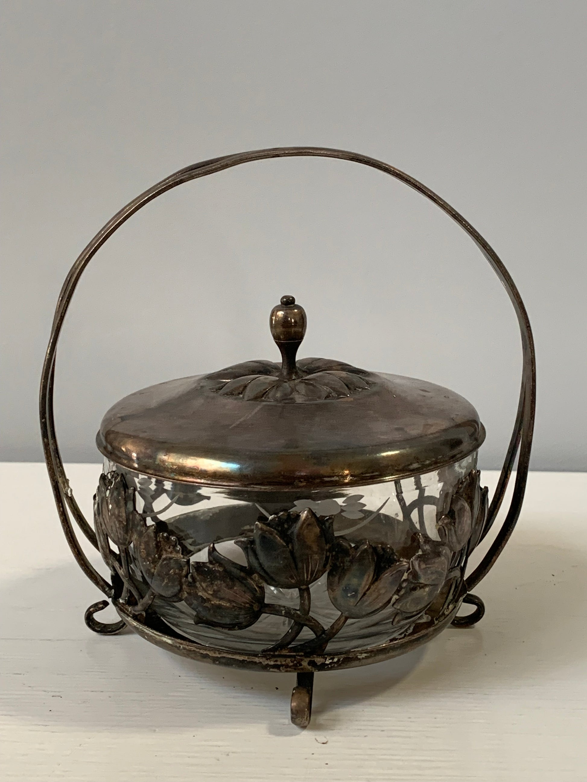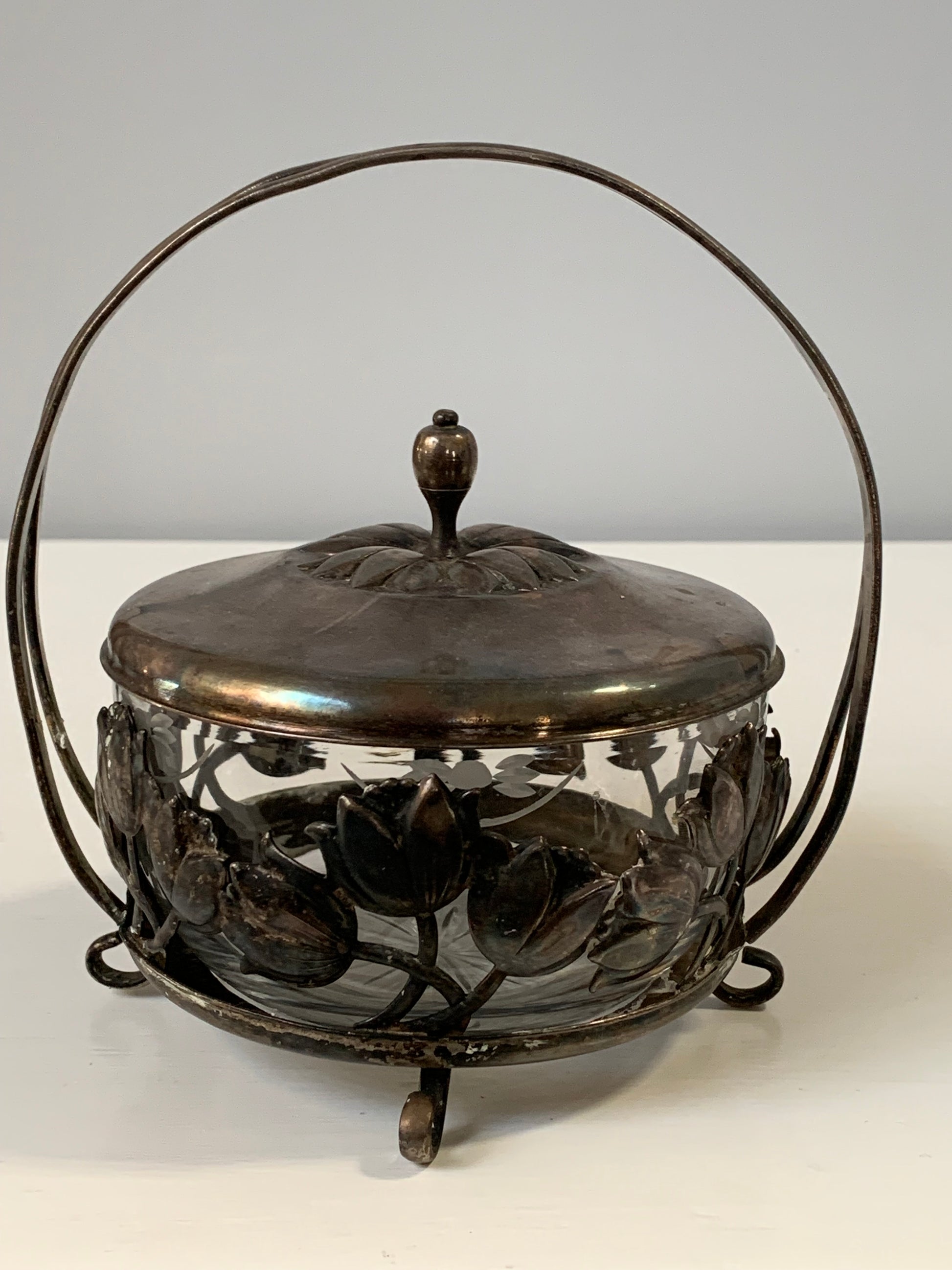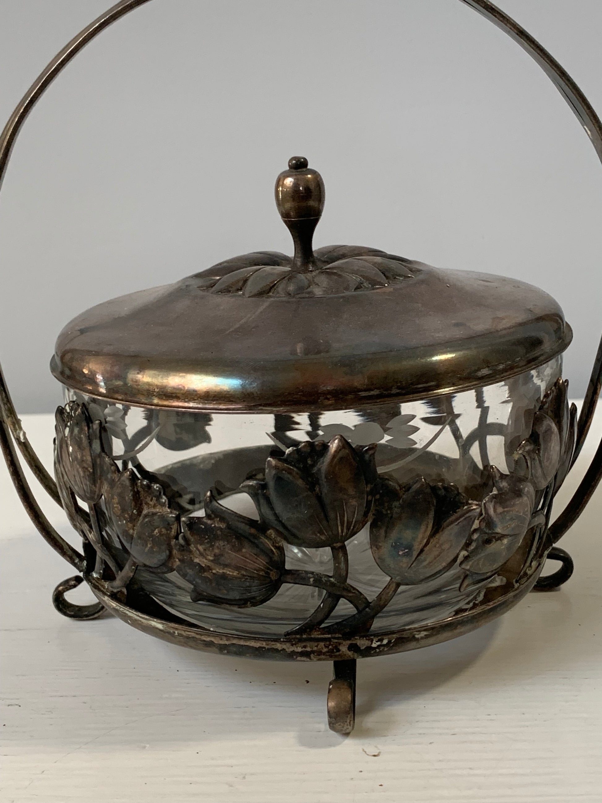 Cukiernica HEFRA Resovia z pokrywką posrebrzana ze szklanym wkładem.