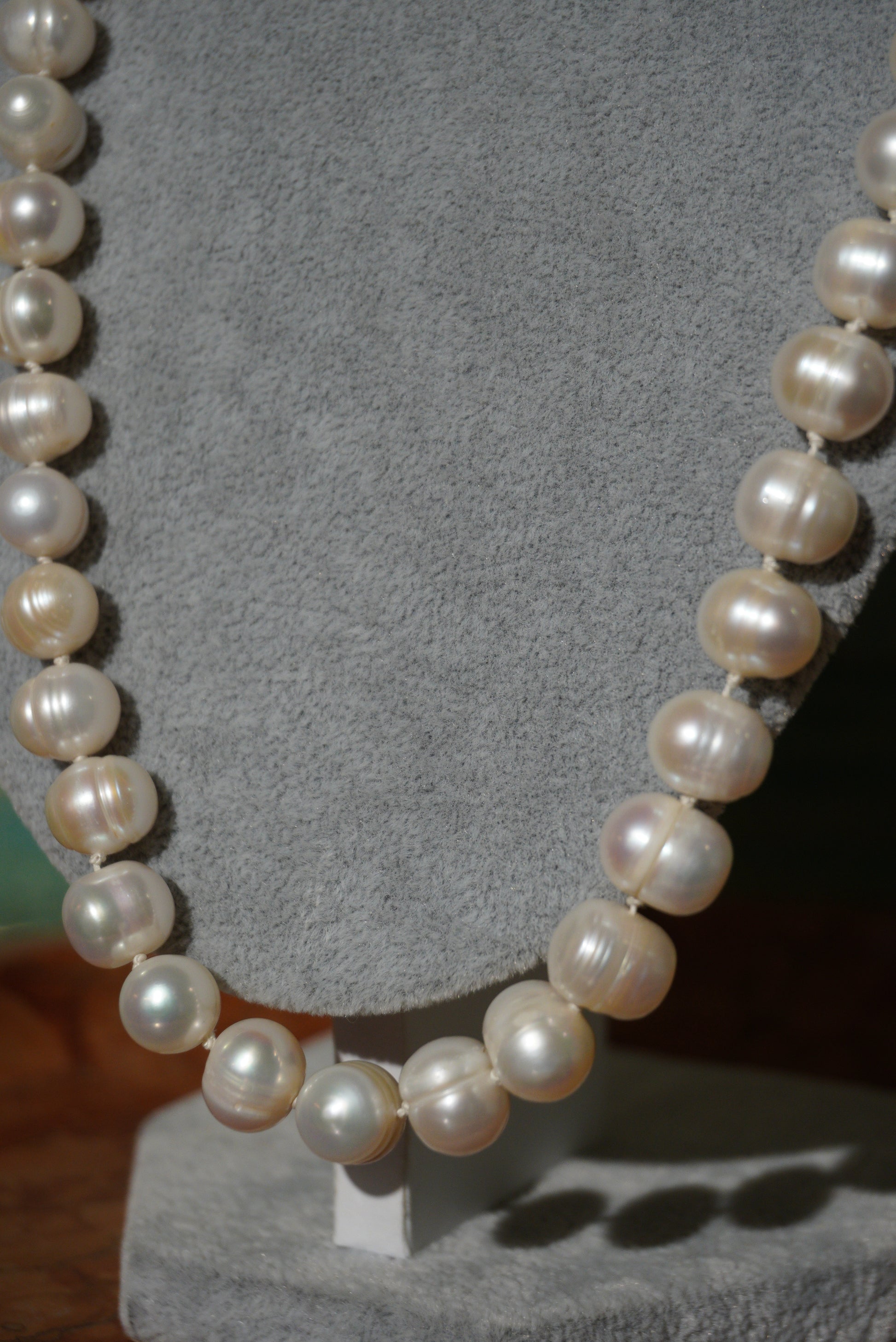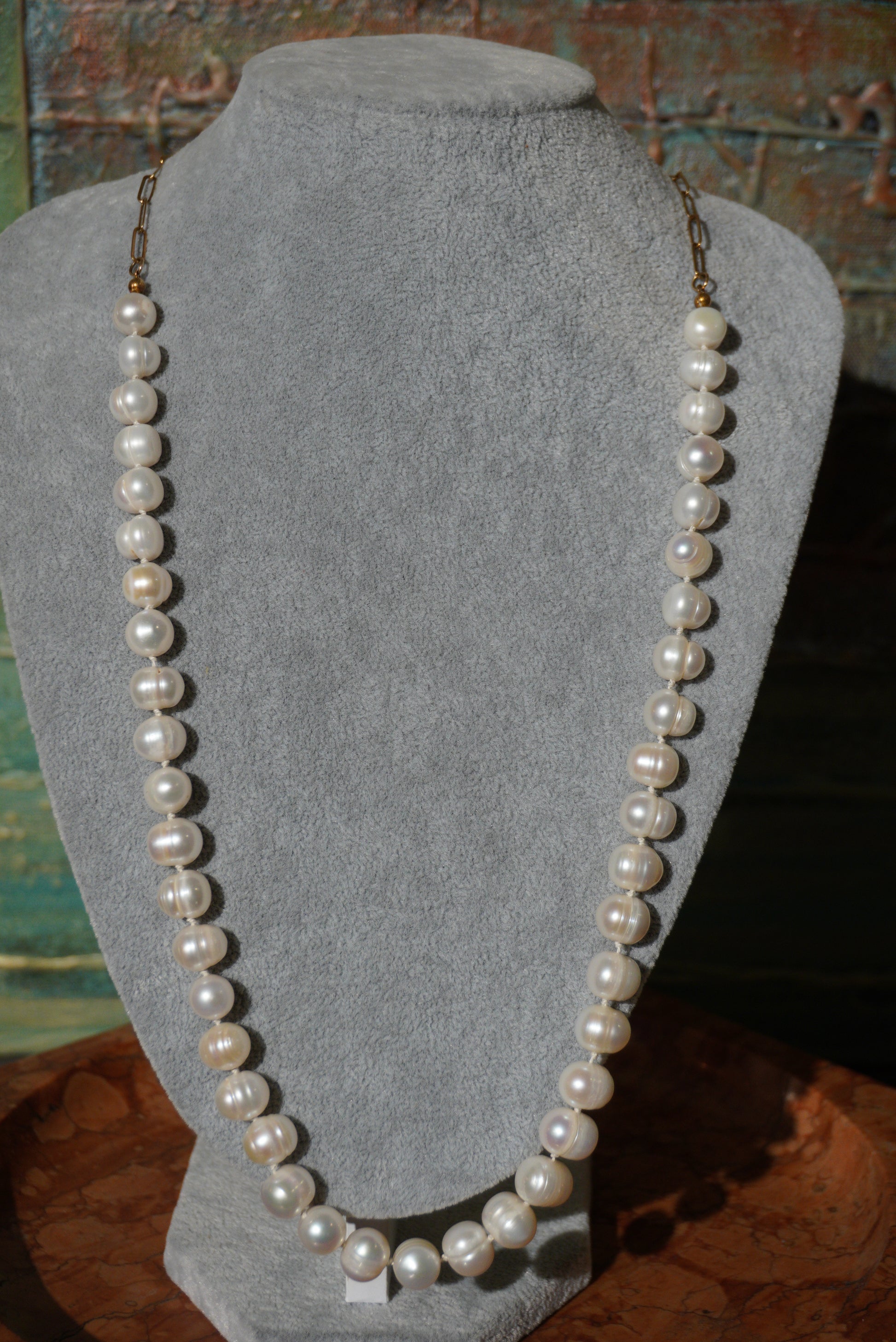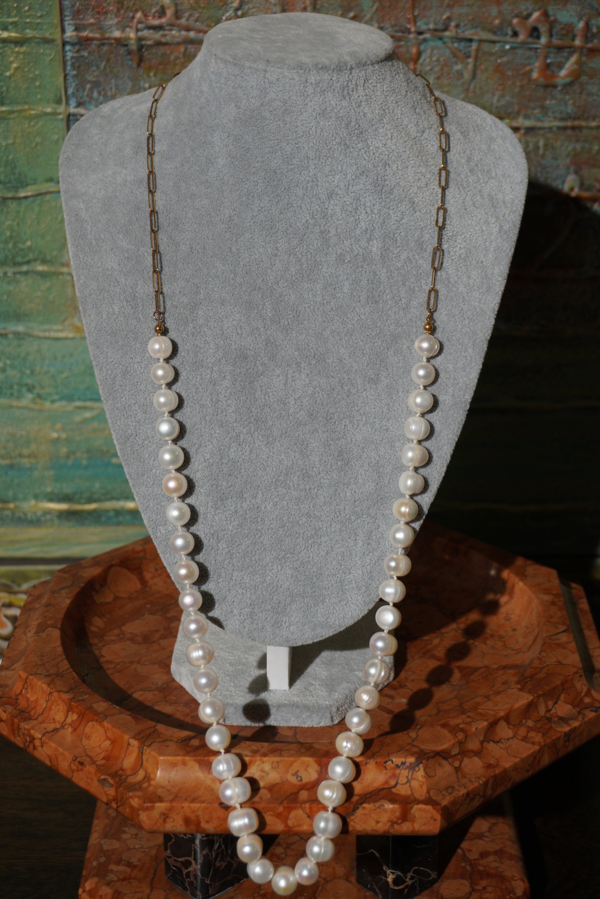 Długi naszyjnik z białych pereł supełkowanych, łańcuszek ze srebra pozłacanego.