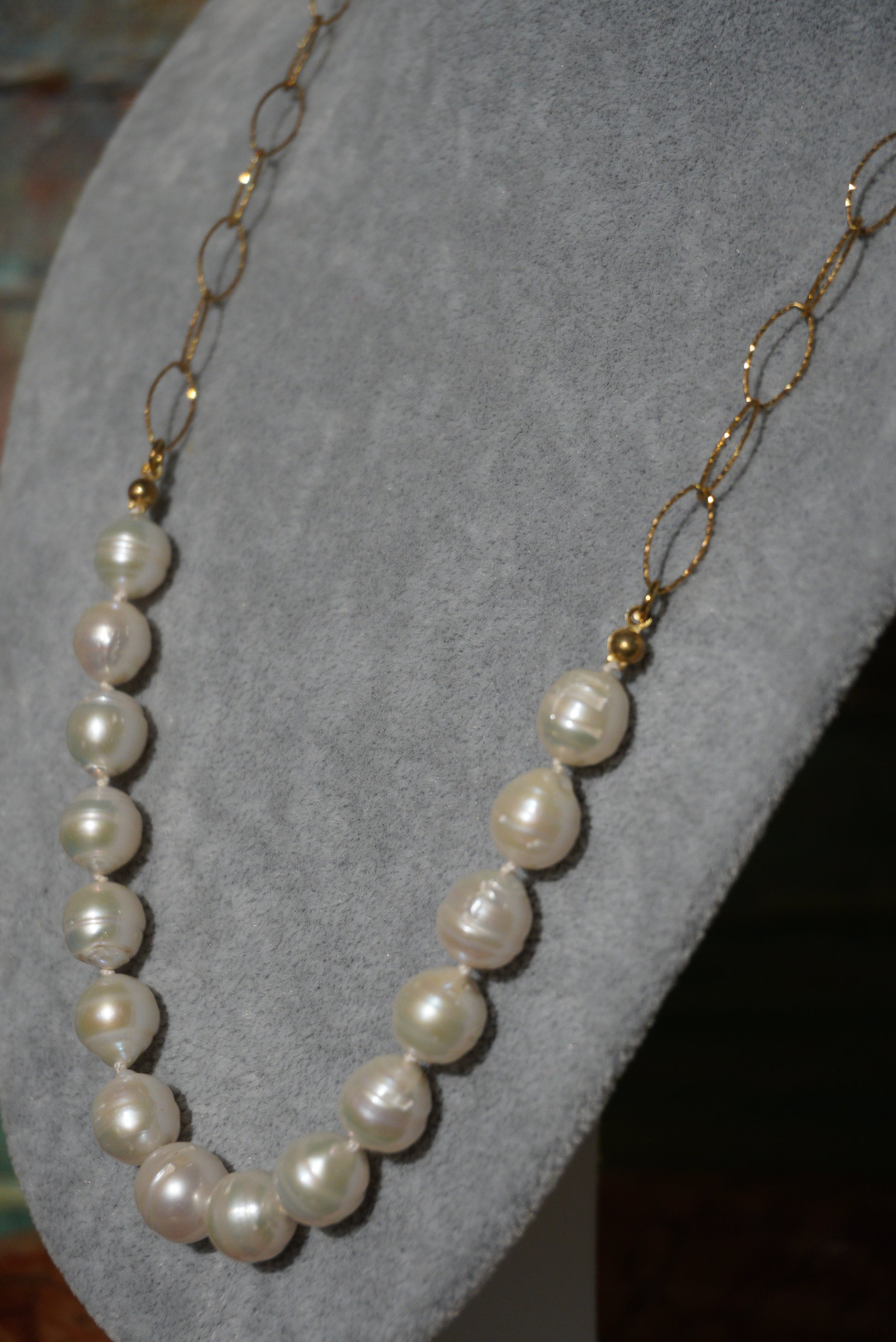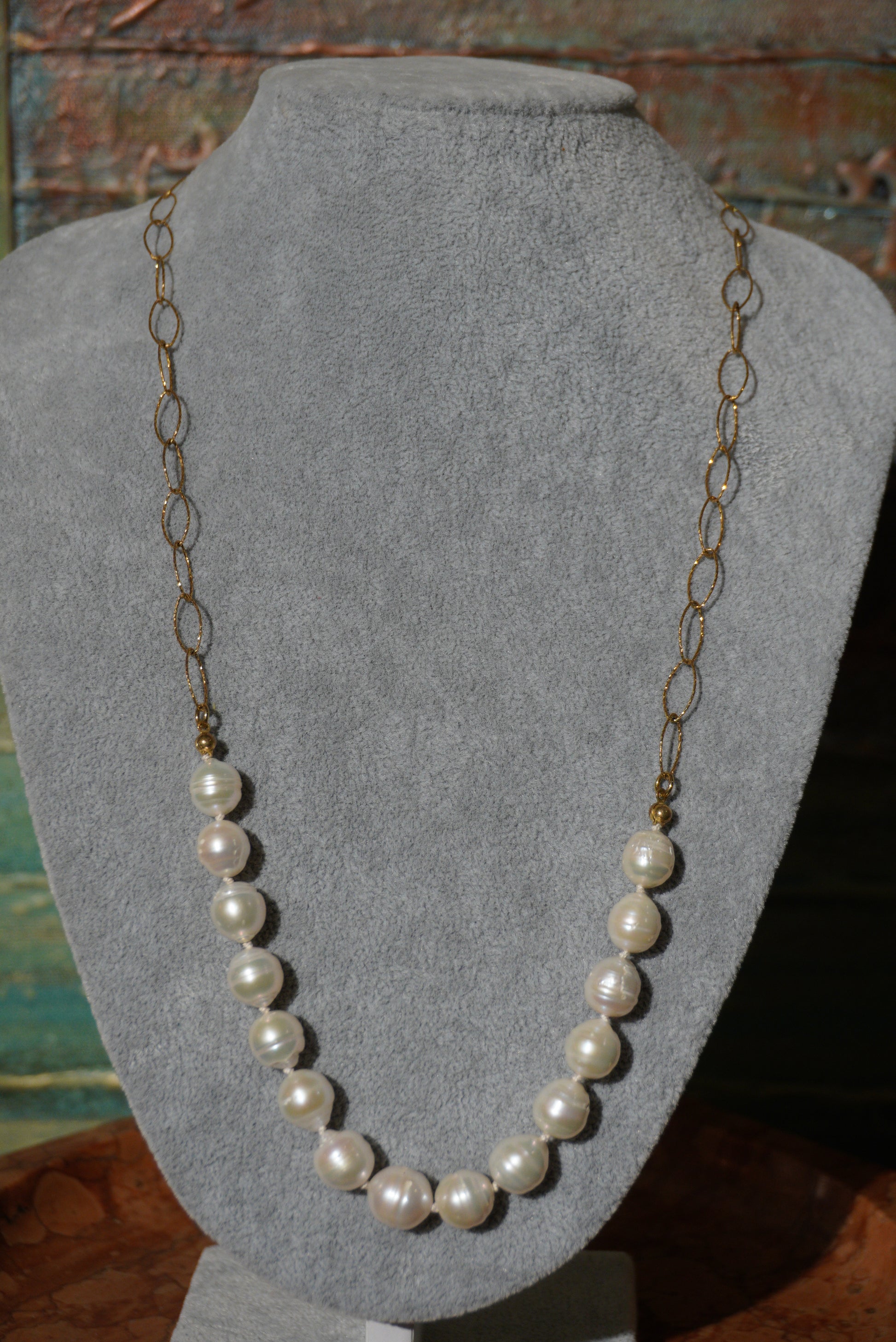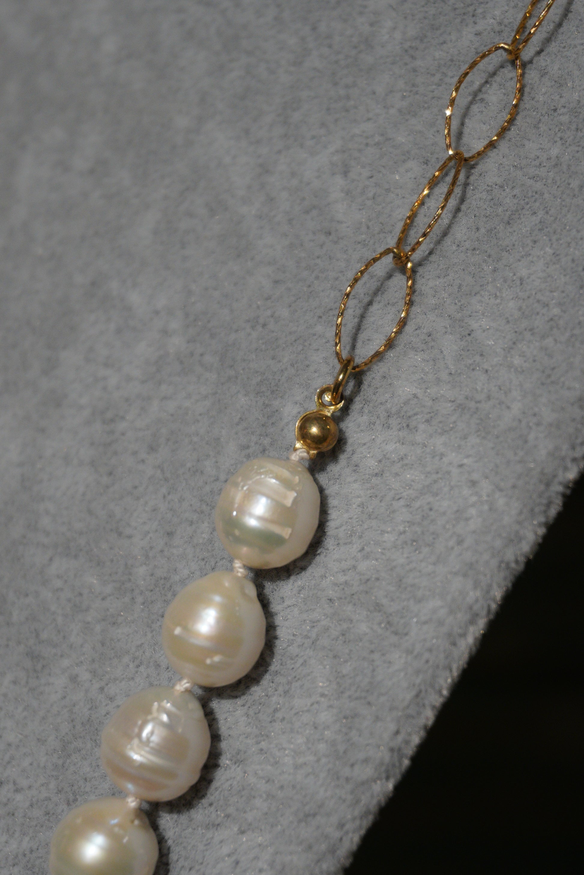 Długi naszyjnik z białych pereł hodowlanych na pozłacanym, ażurowym łańcuszku.