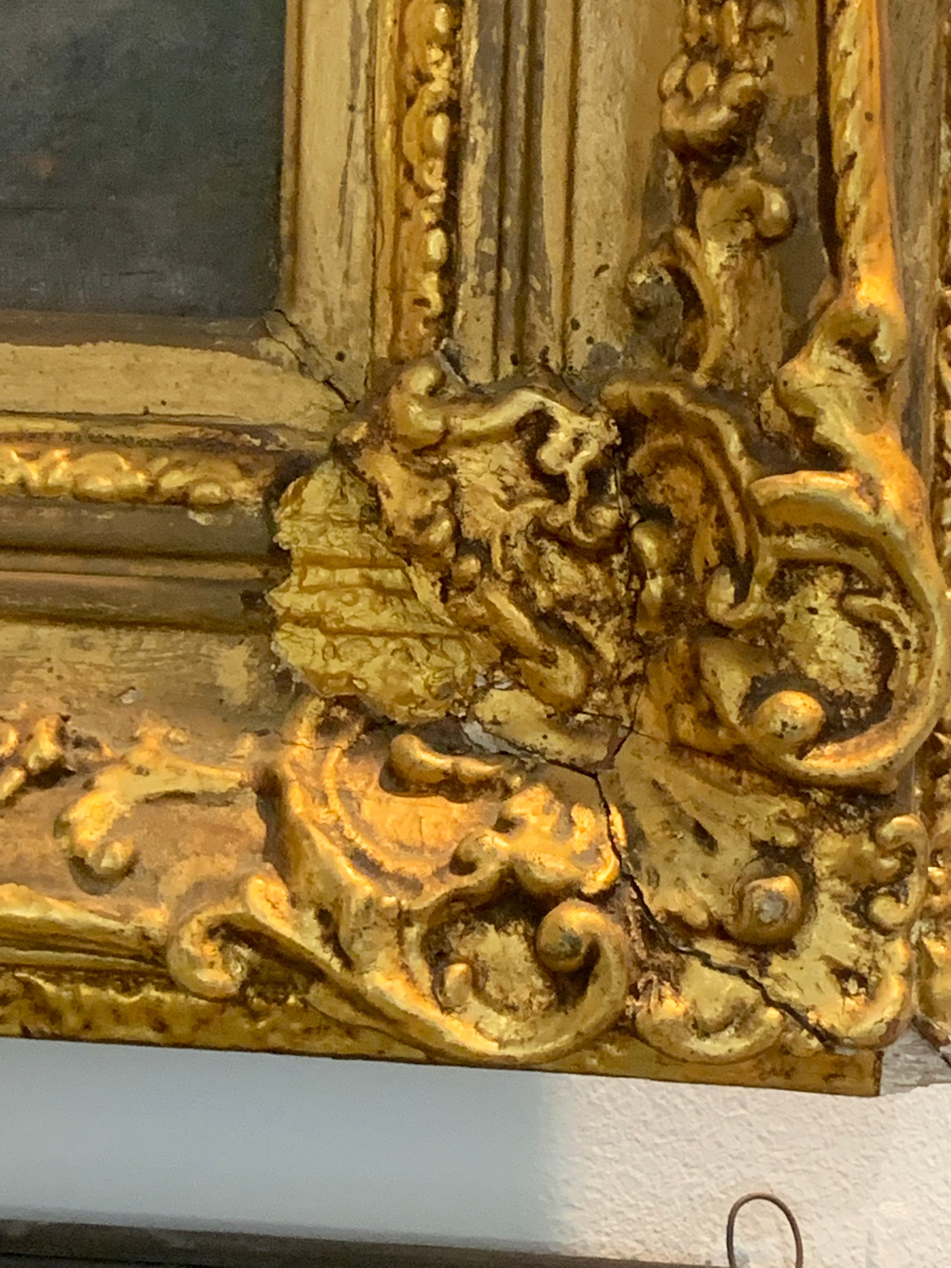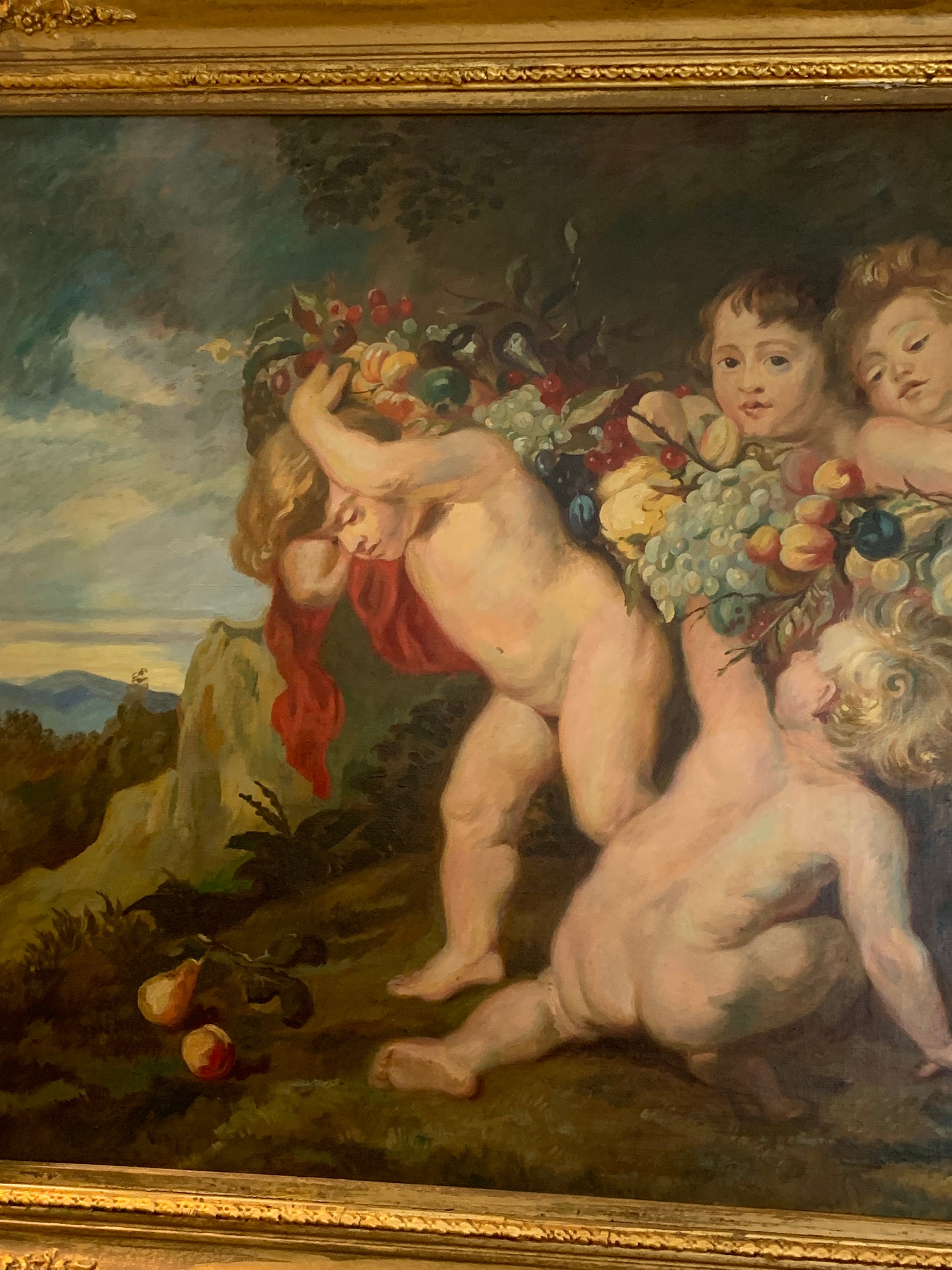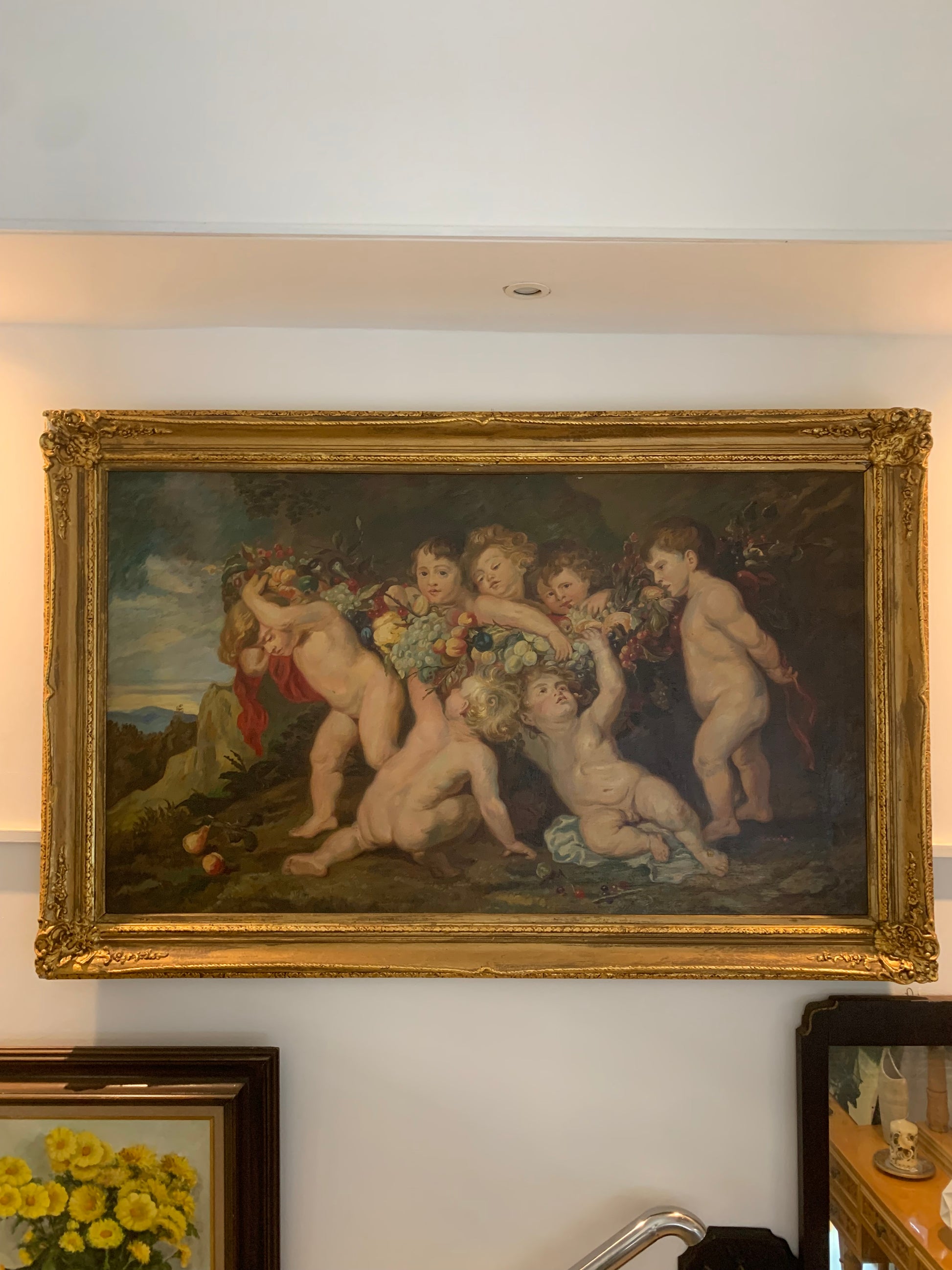 Duży, zabytkowy obraz, kopia Rubensa "Putta z girlandami owoców", technika: olej na płótnie przedstawiający bawiące się putta z girlandą owoców. Dzieło oprawione w dużą, drewnianą, złoconą ramę zdobioną rzeźbieniami.