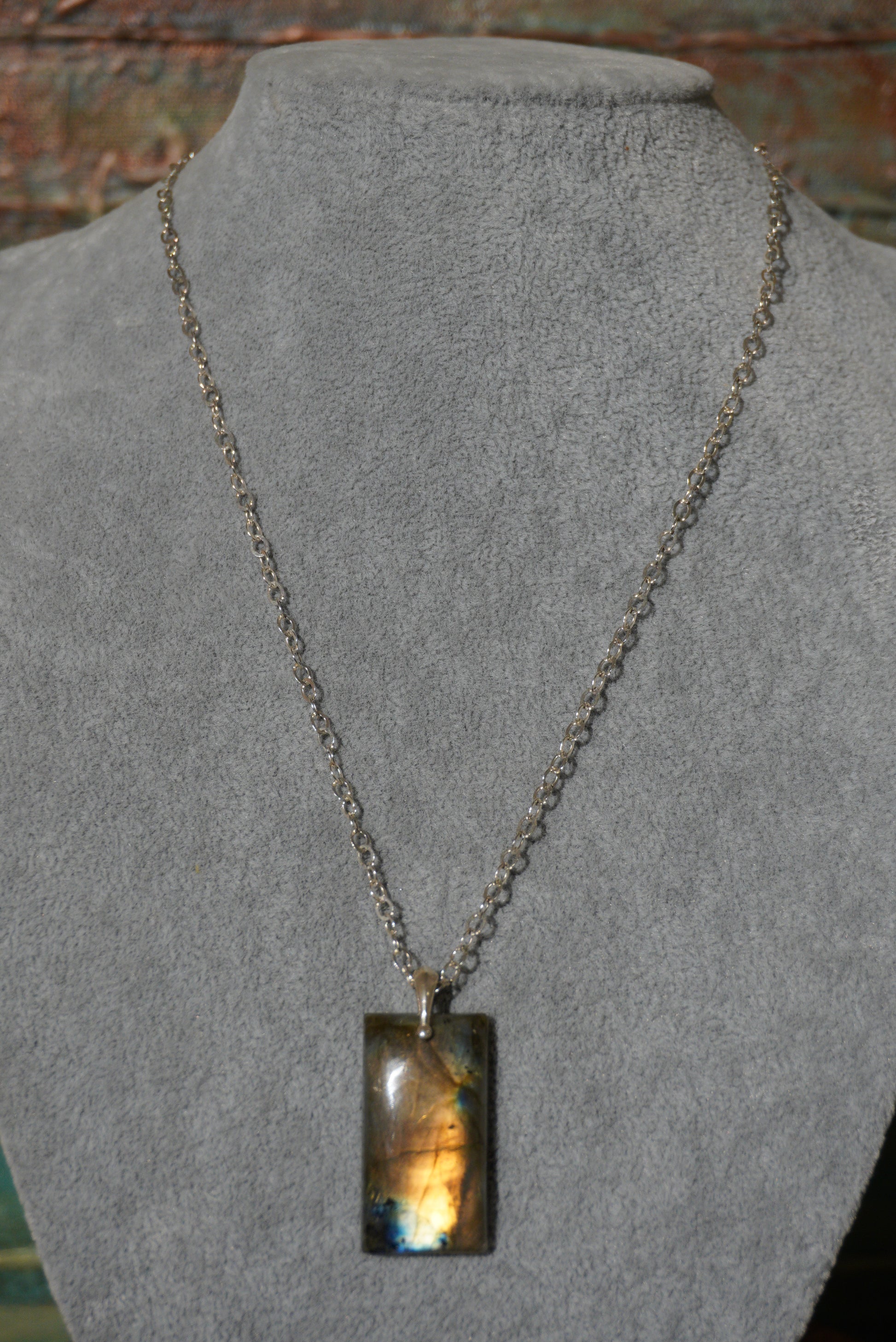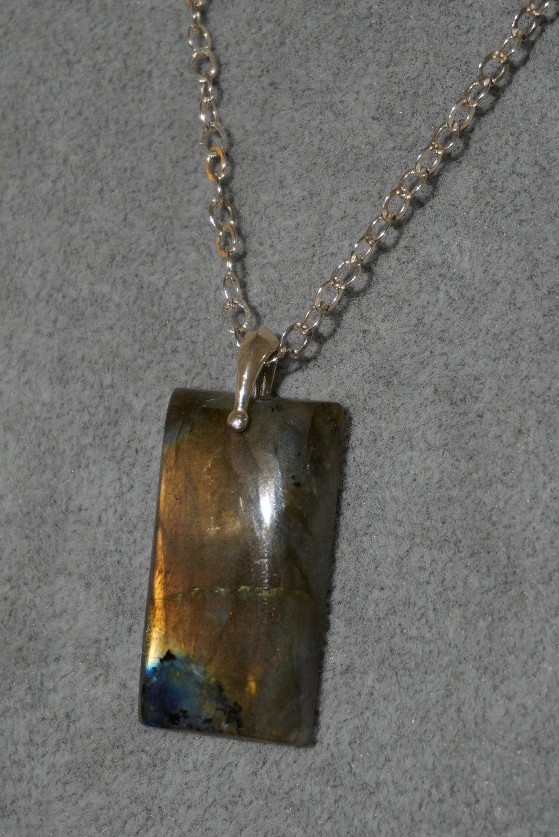 Efektowny naszyjnik, łańcuszek srebrny, wisior labradoryt w niebieskozielonej barwie.
