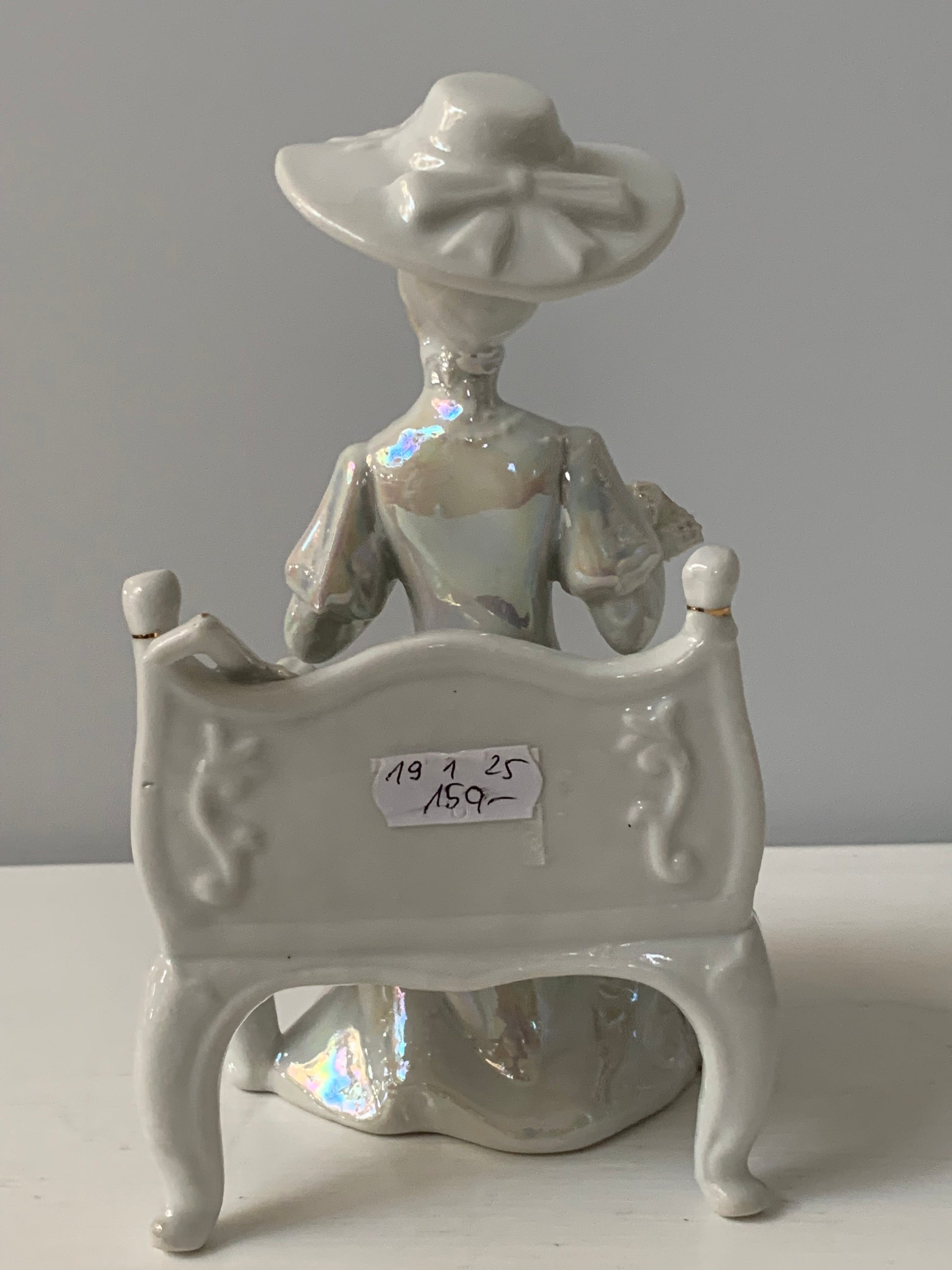 Figurka porcelanowa, dama na ławce, szkliwiona