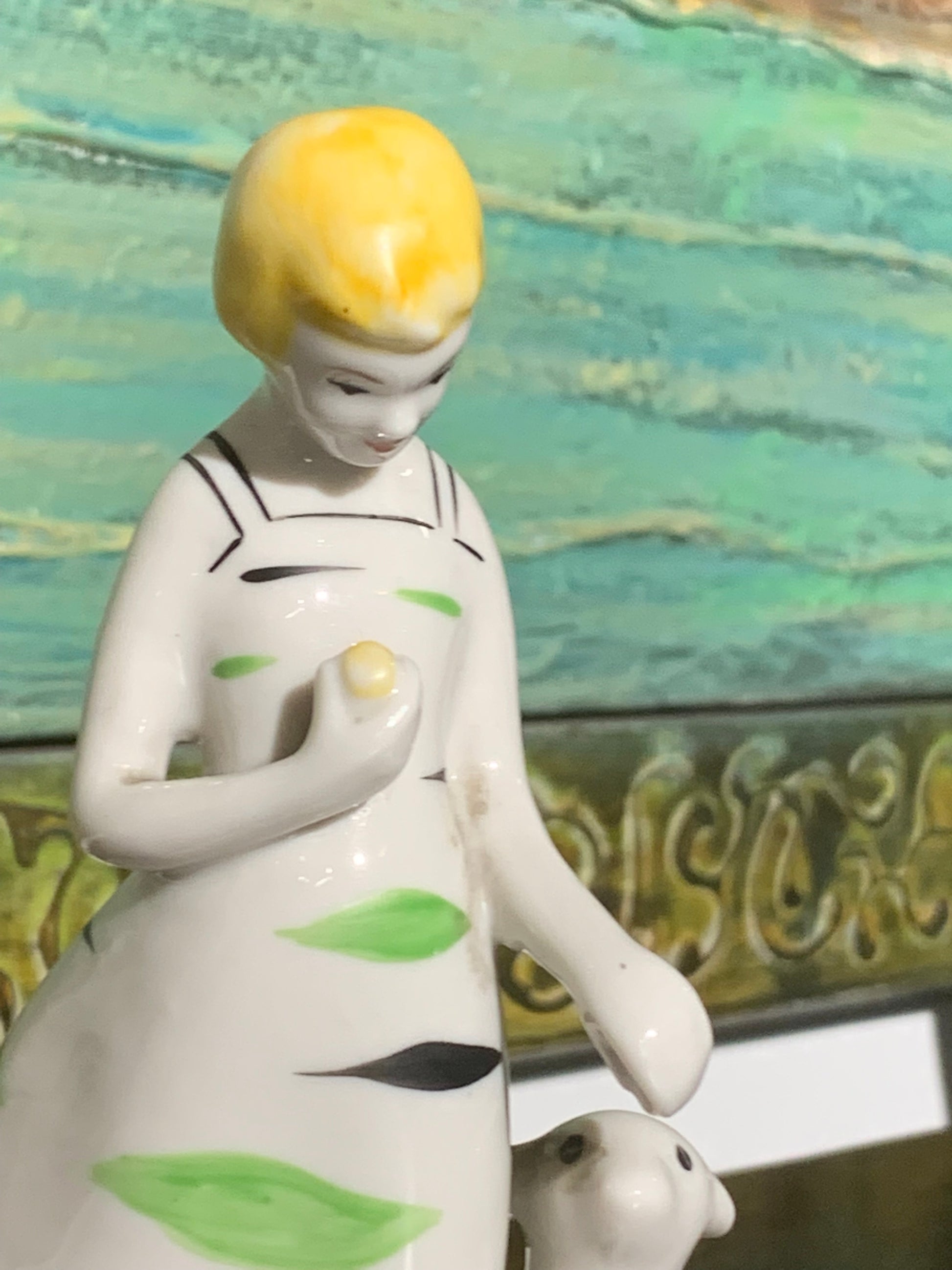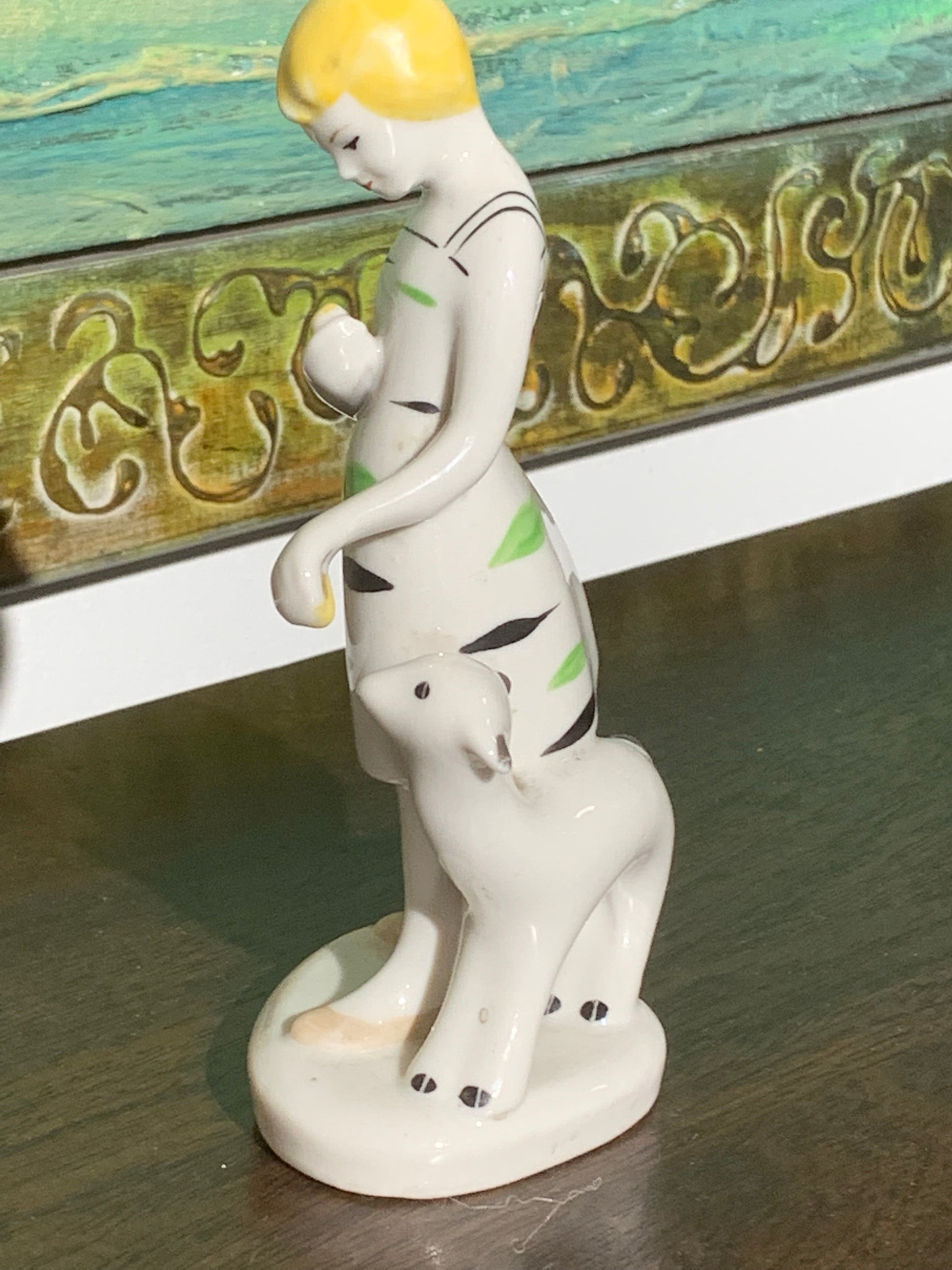 Kolekcjonerska figura dziewczynka z owieczką. Porcelana biała delikatnie podmalowana pastelowymi barwami. Sygnatura z lat 60-tych starej manufaktury Polonne (Ukraina). Wysokość 17 cm, szerokość 8 cm, stan bardzo dobry.