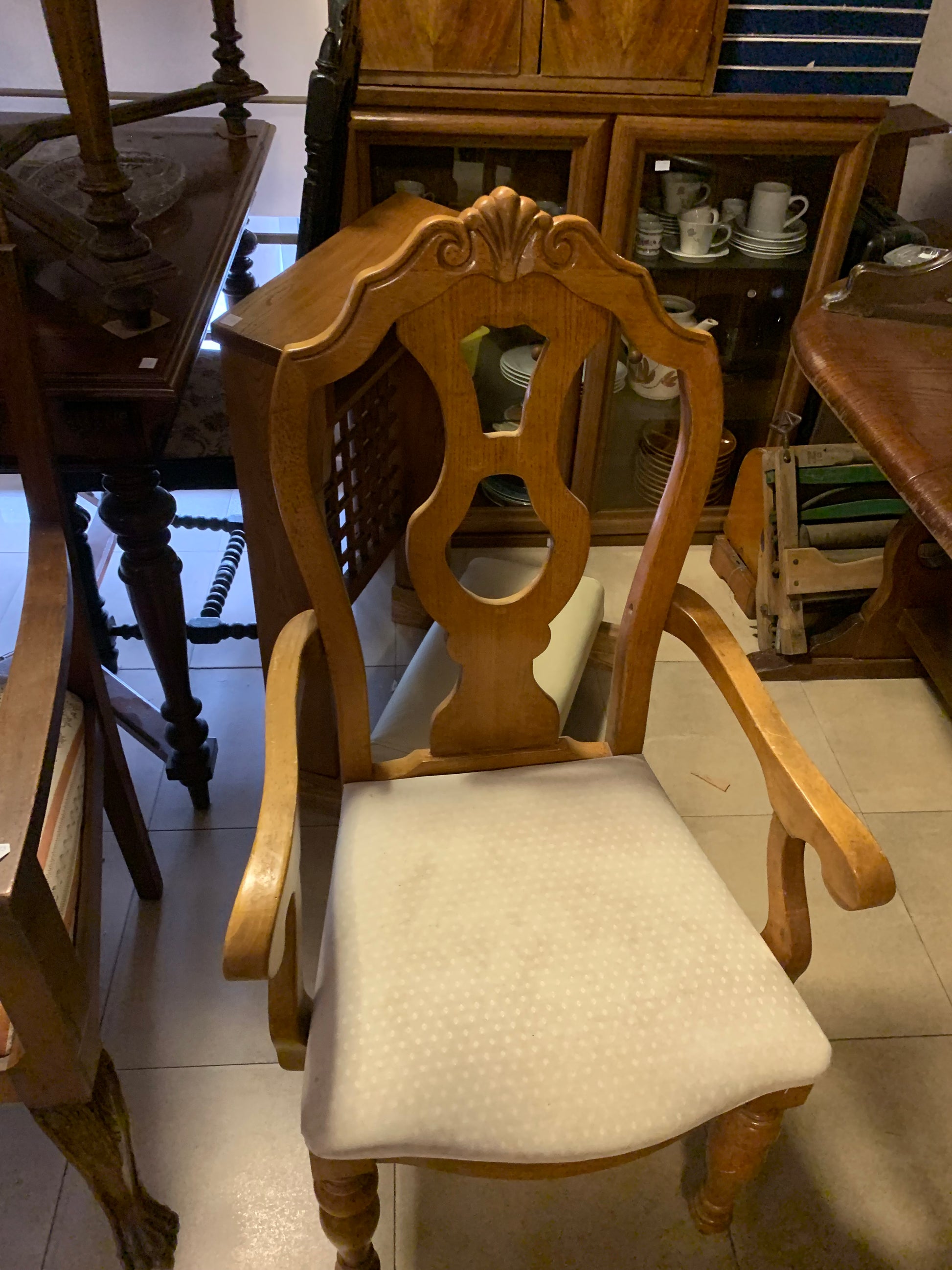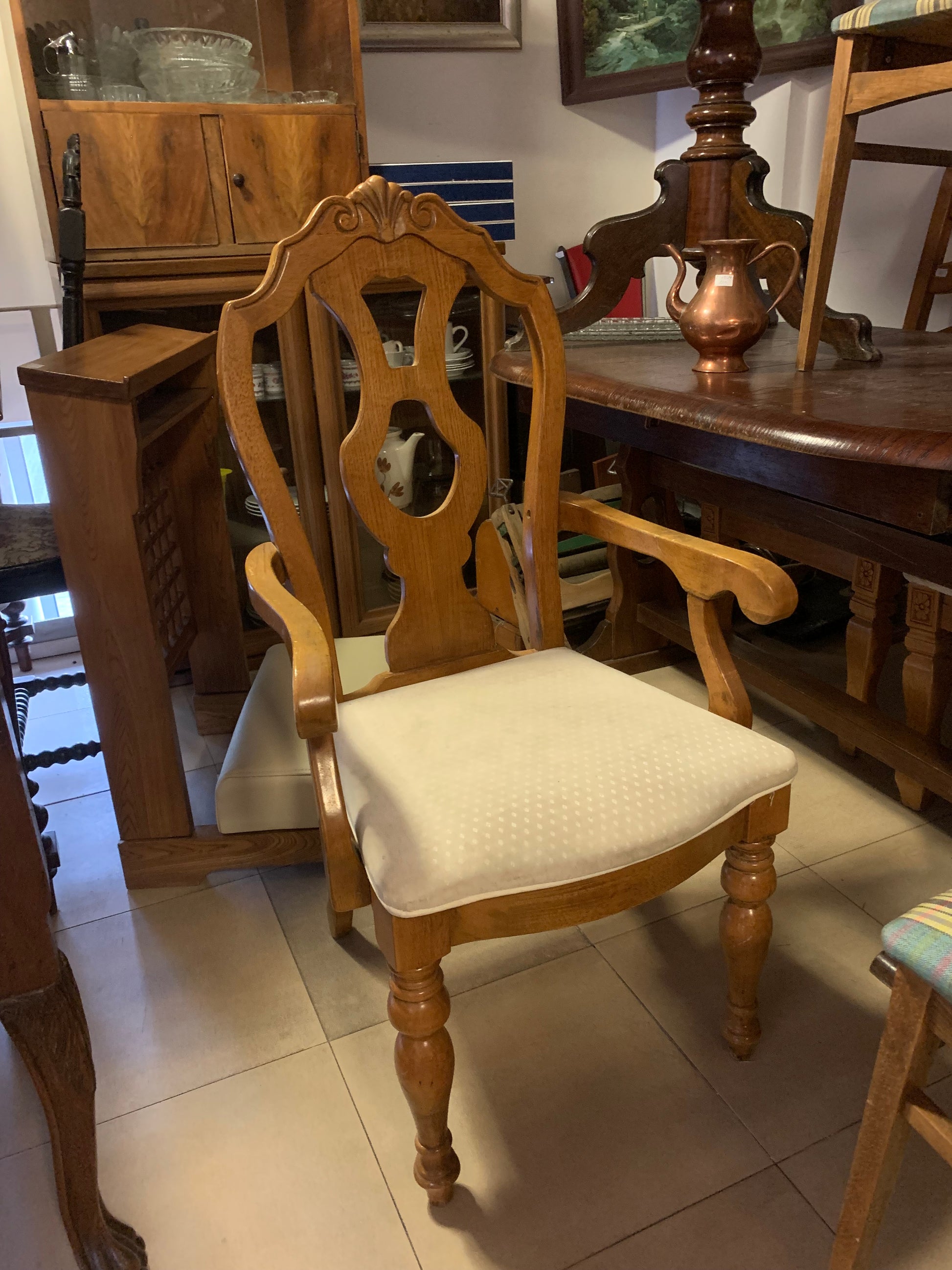 Fotel dębowy, krzesło z oparciami, tapicerowane, w dobrym stanie.