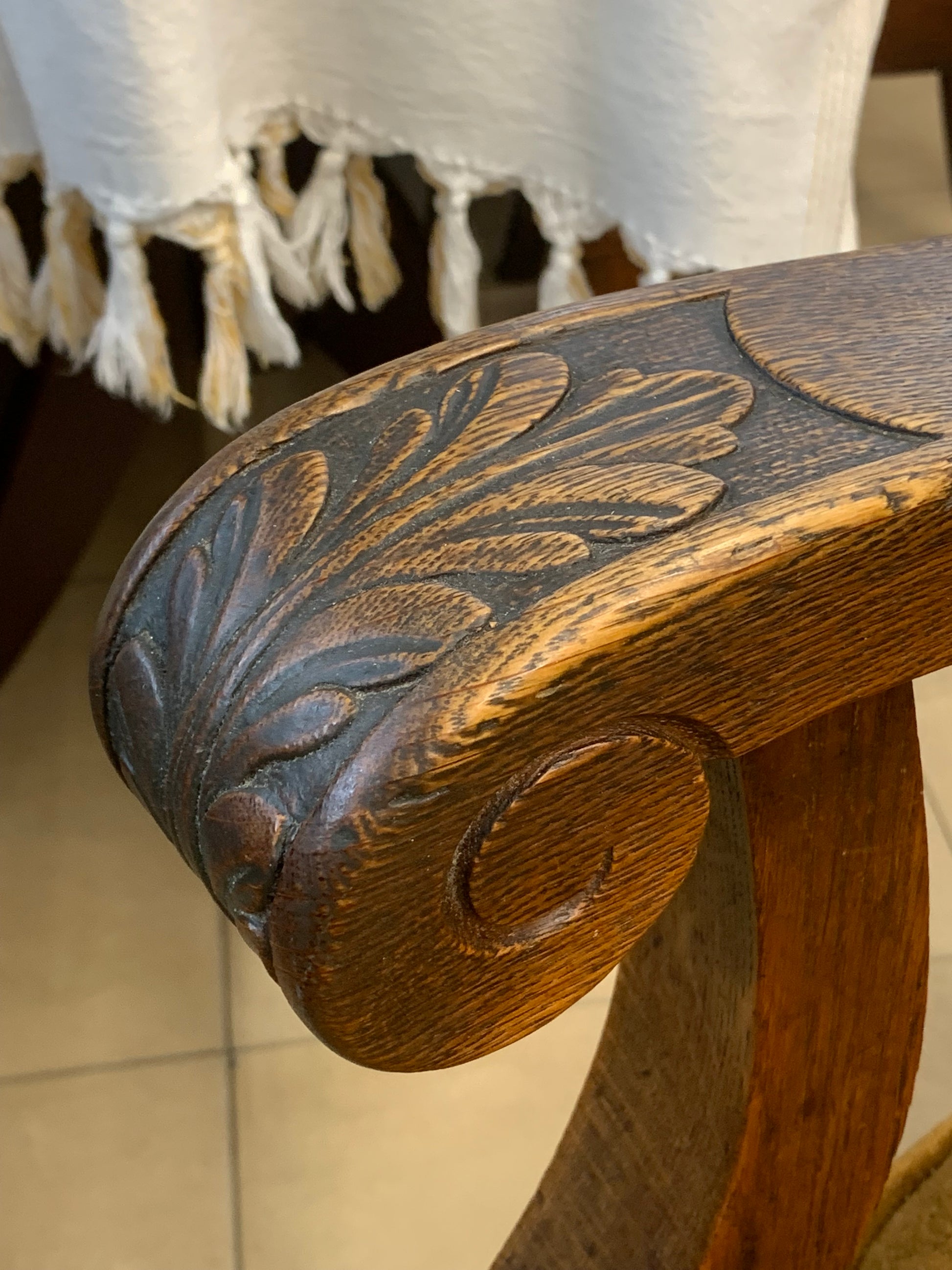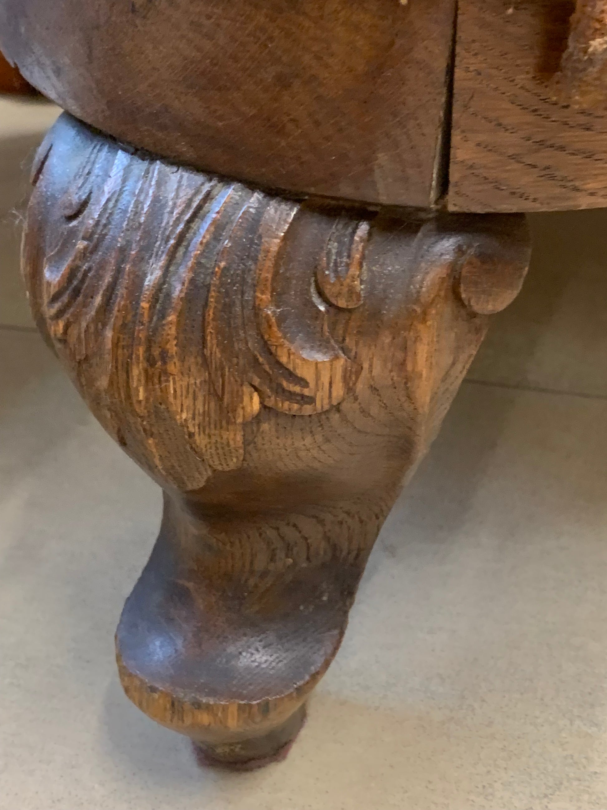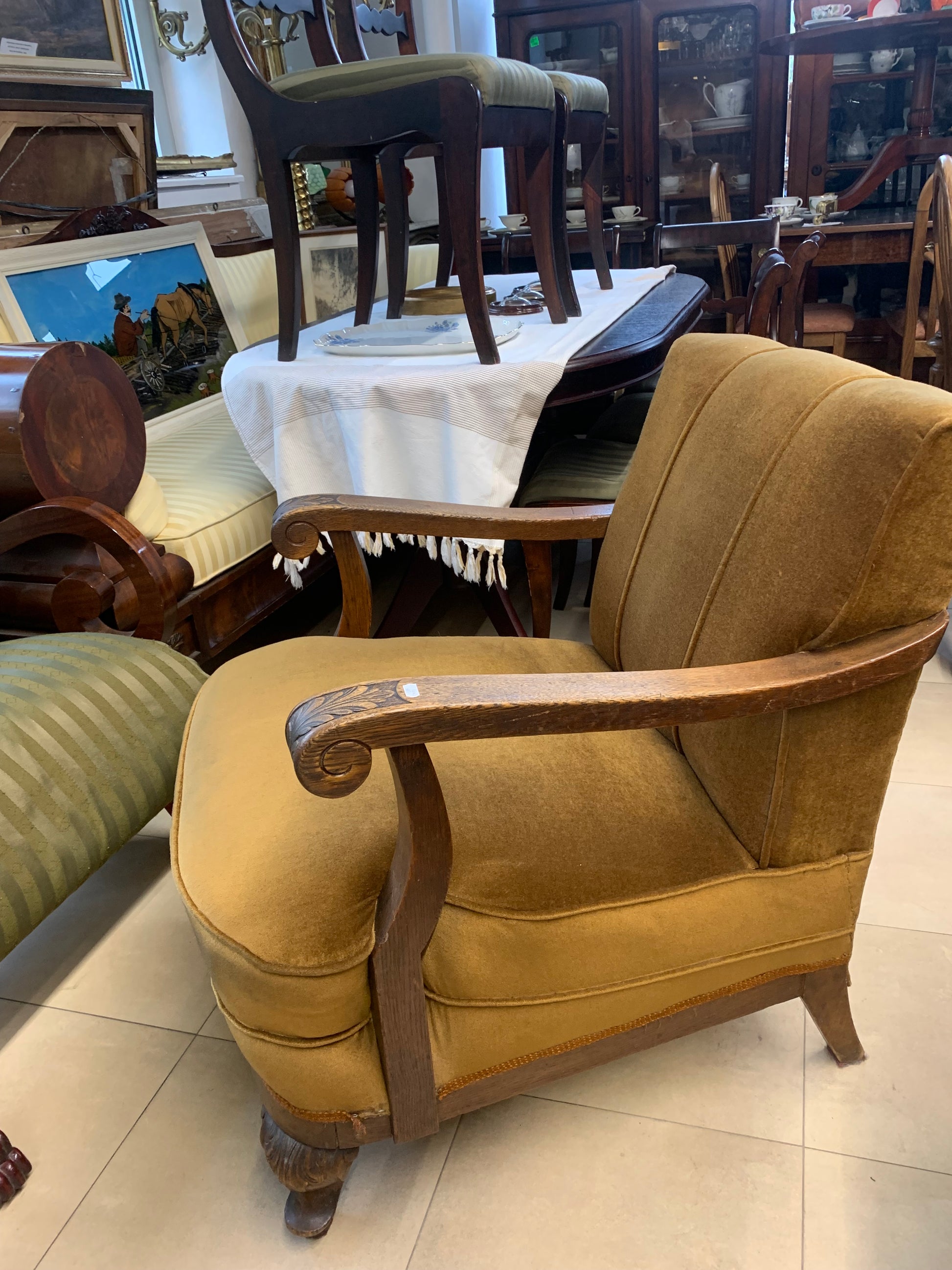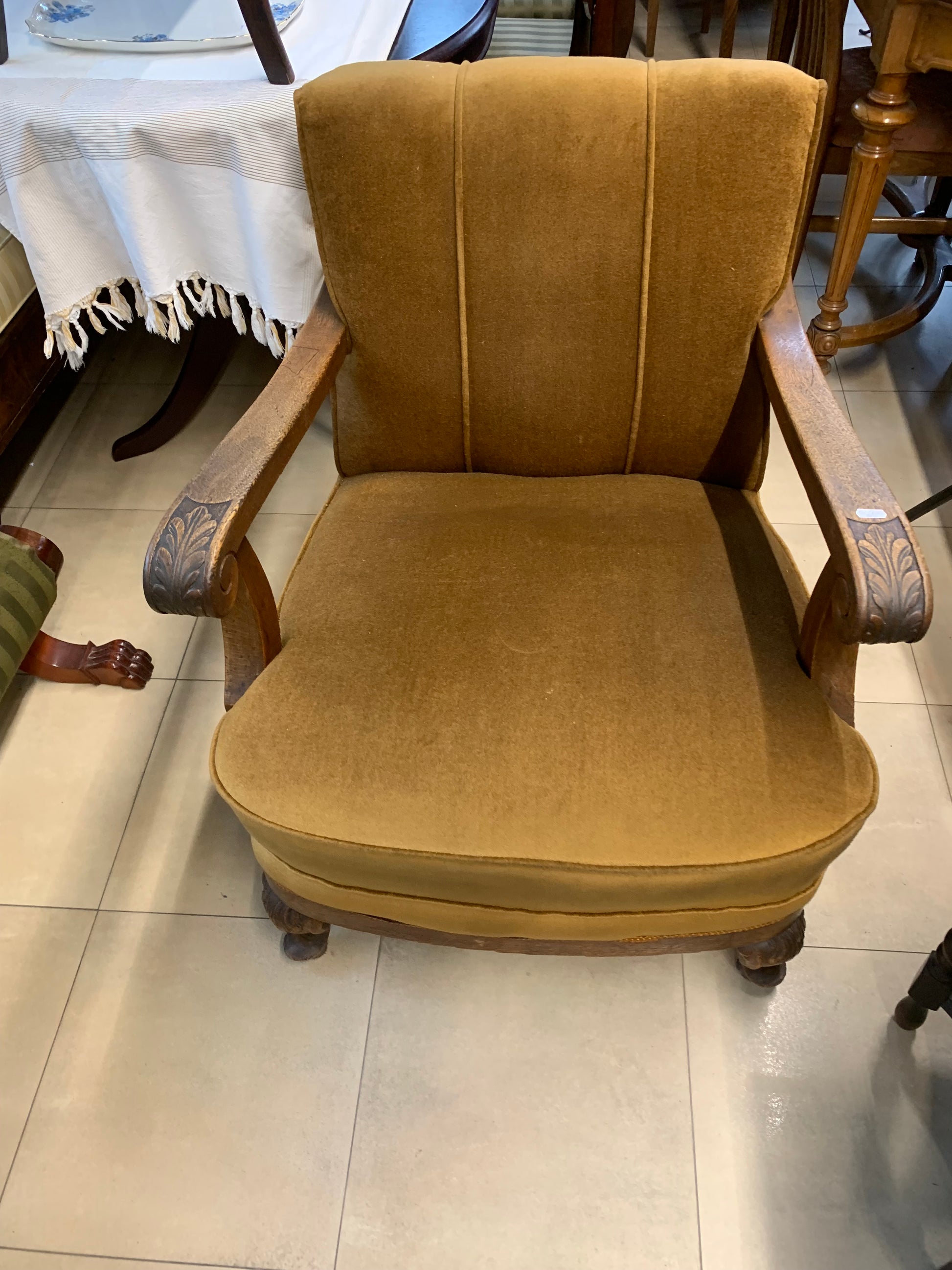 Fotel klubowy Chippendale zabytkowy, siedzisko na sprężynach, solidny, rzeźbiony stelaż z drewna dębowego.