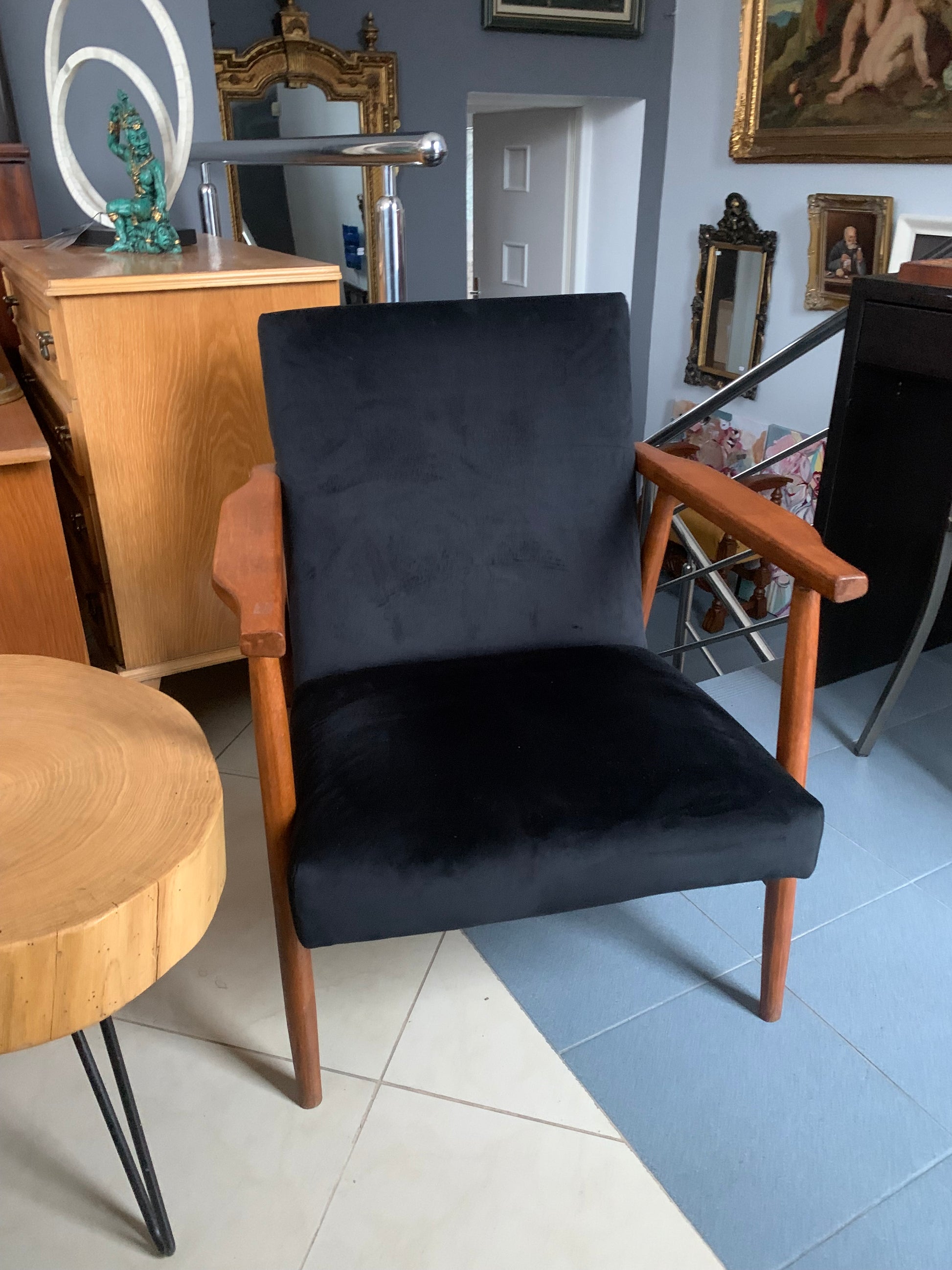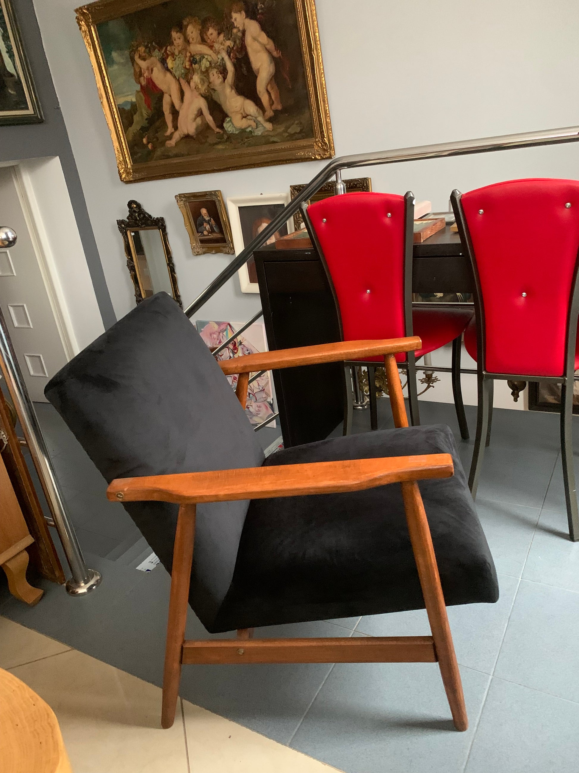 Fotel Lisek PRL, typ 300-190, po gruntownej renowacji, wymienione pasy, gąbka, tapicerka - welur w kolorze czarnym.