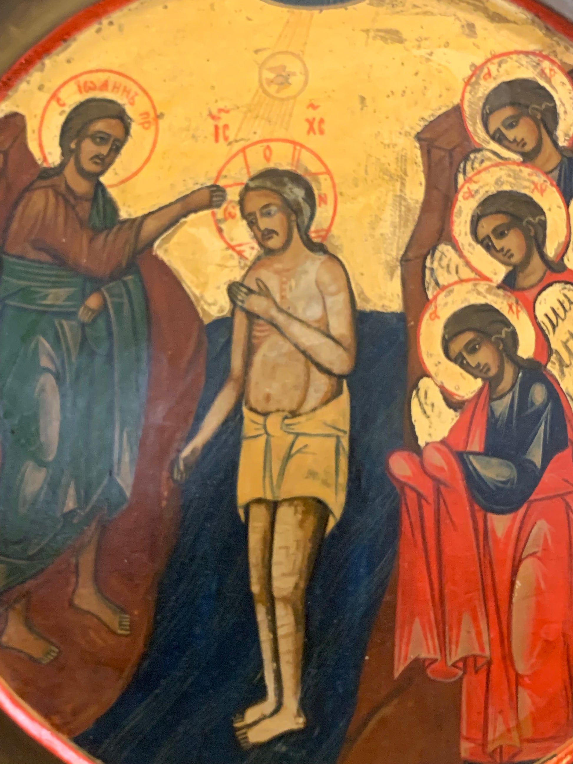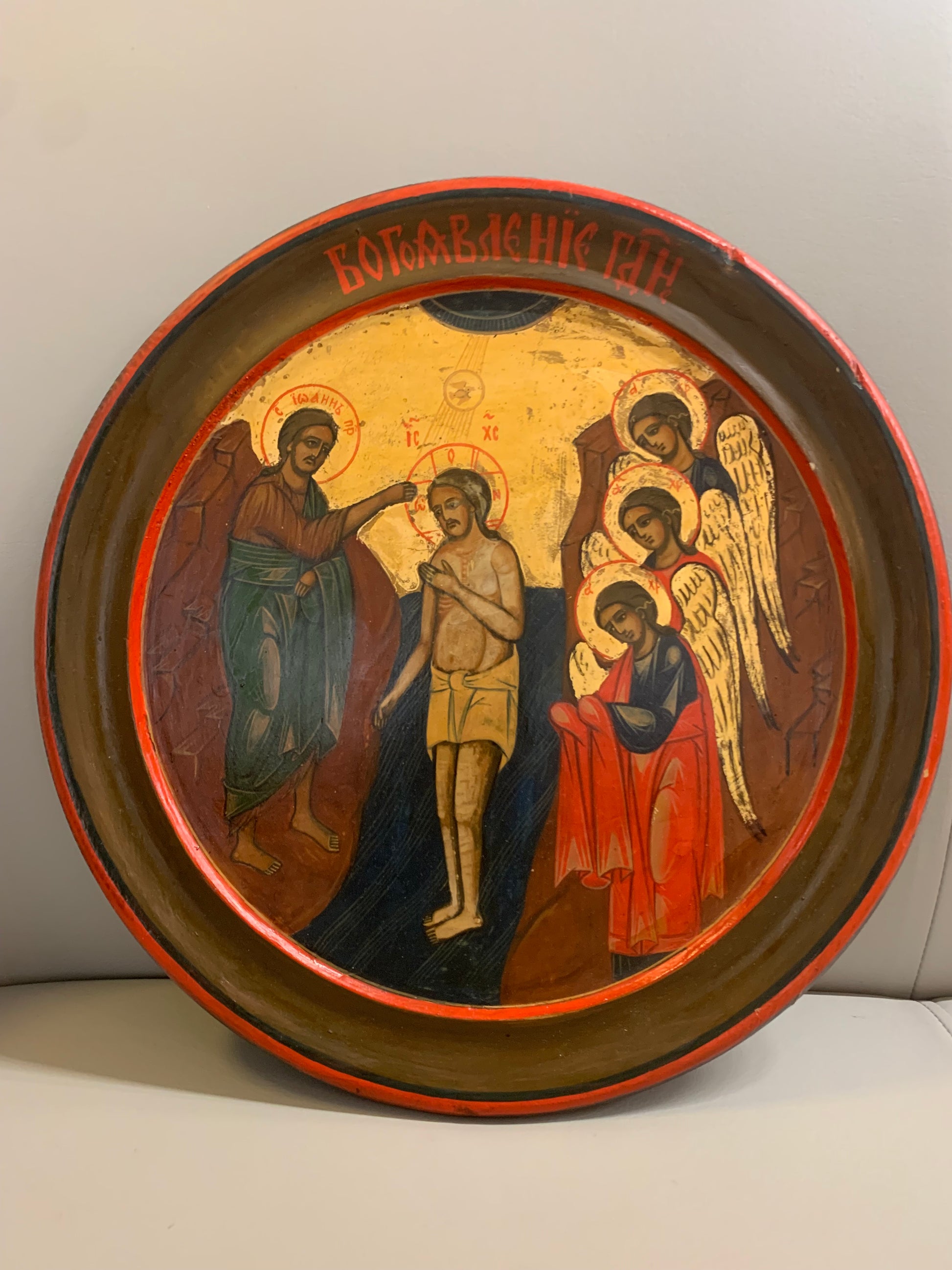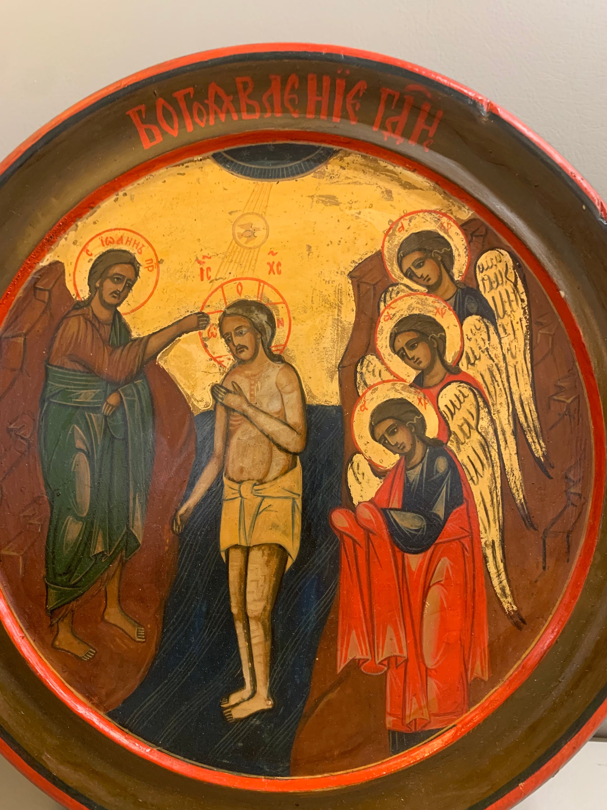 Ikona prawosławna, okrągła "Chrzest Pański" lata 60-e XX w. Technika: tempera, deska.