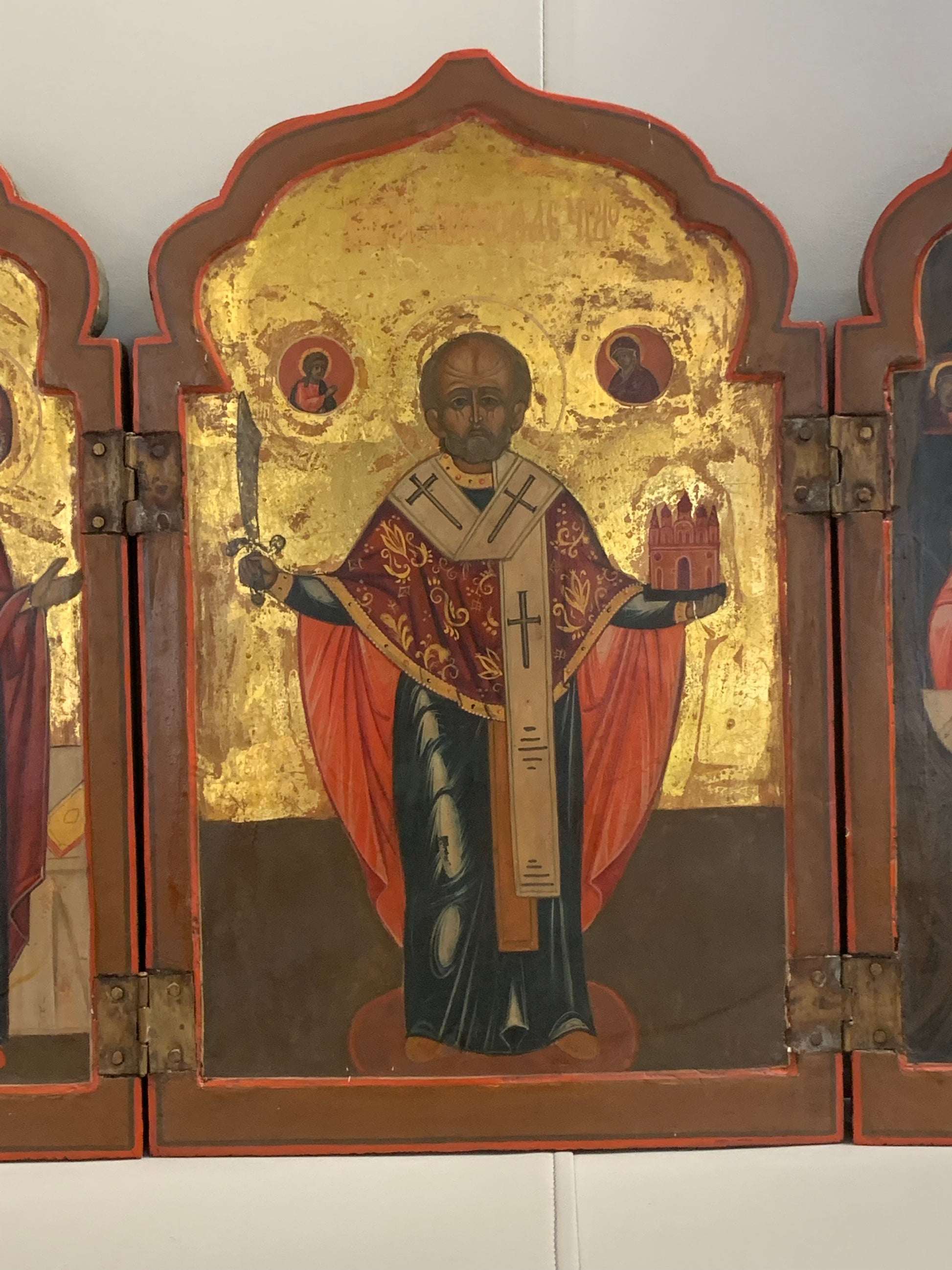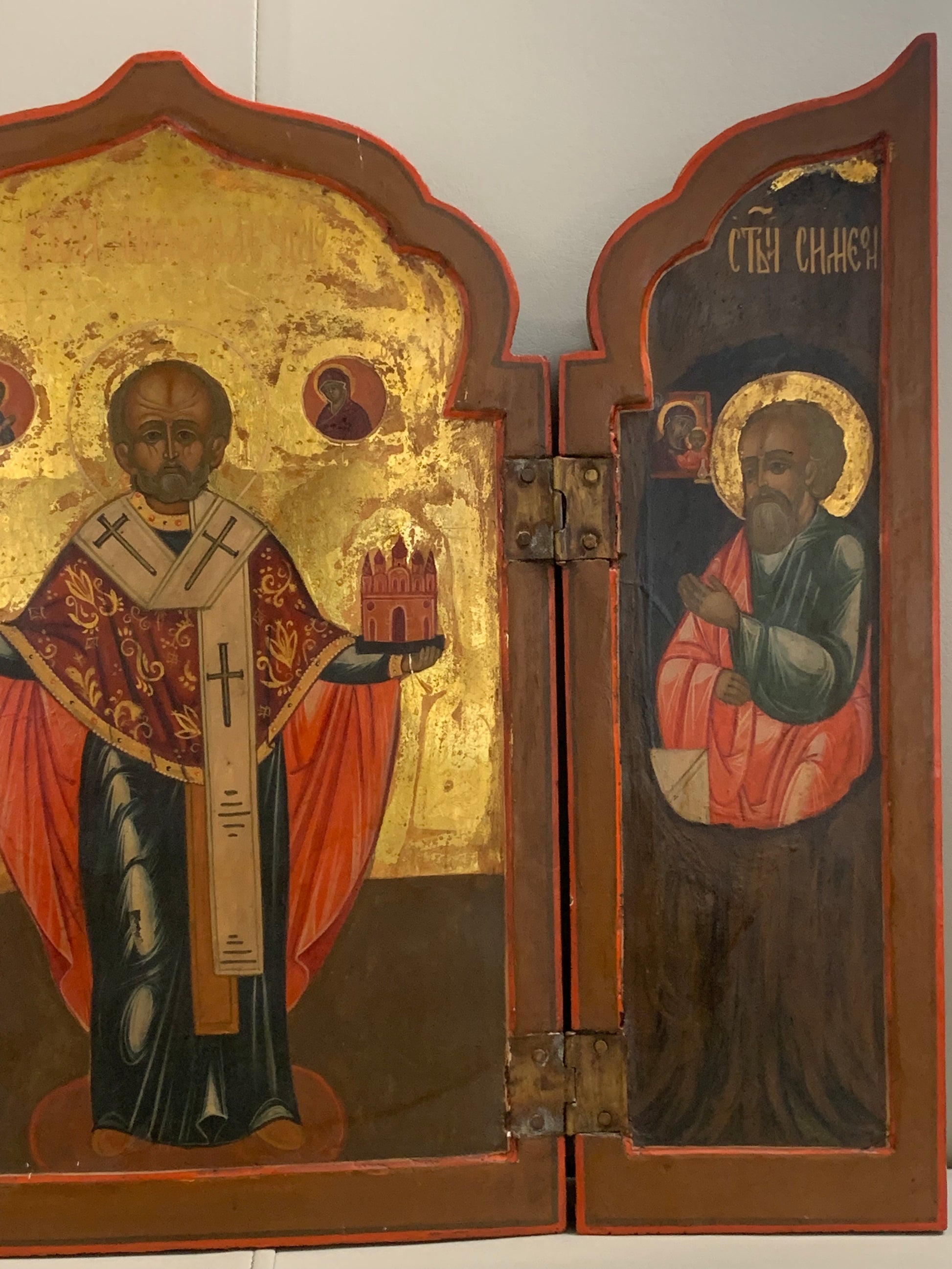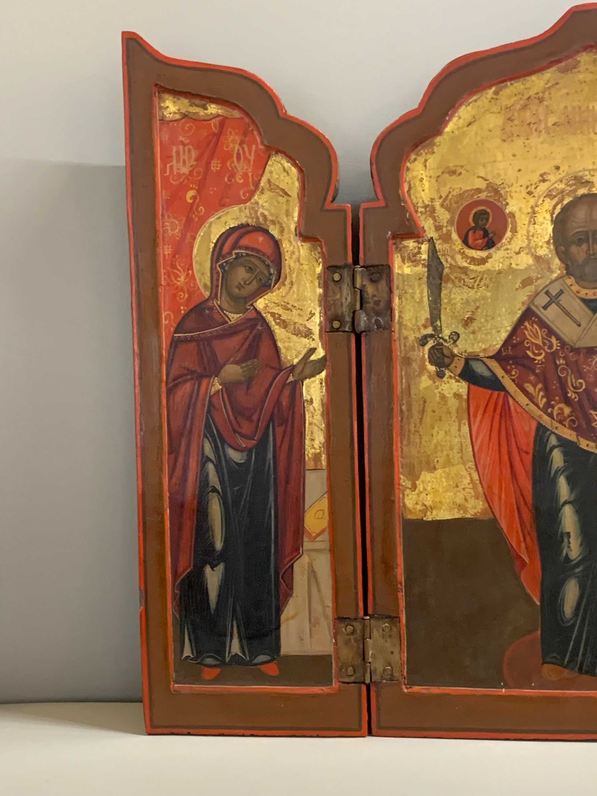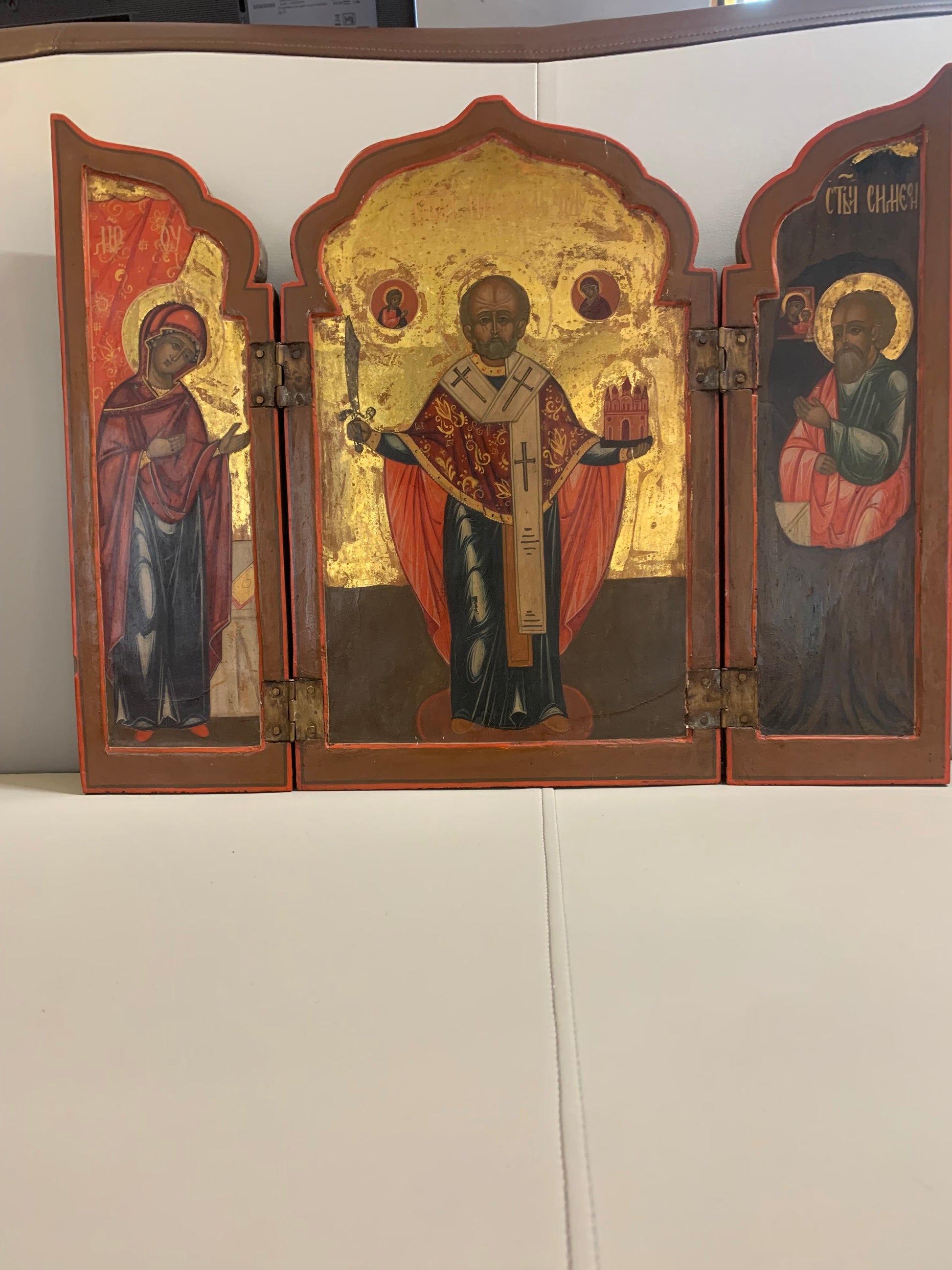Ikona Podróżna, tryptyk XIX w. - Matka Boska, Św. Mikołaj i Św. Symeon. Technika: tempera, deska. Stan: bardzo dobry.