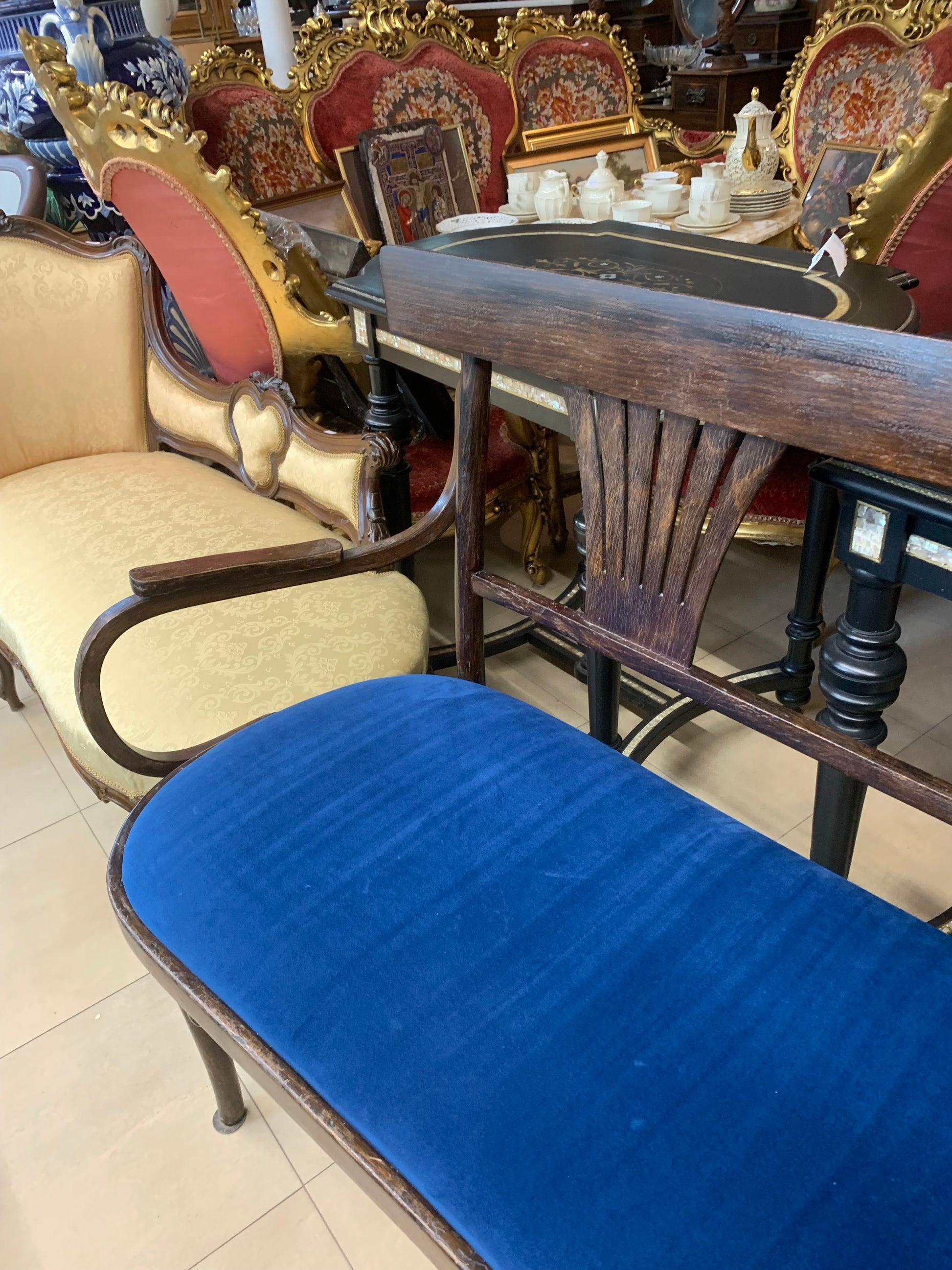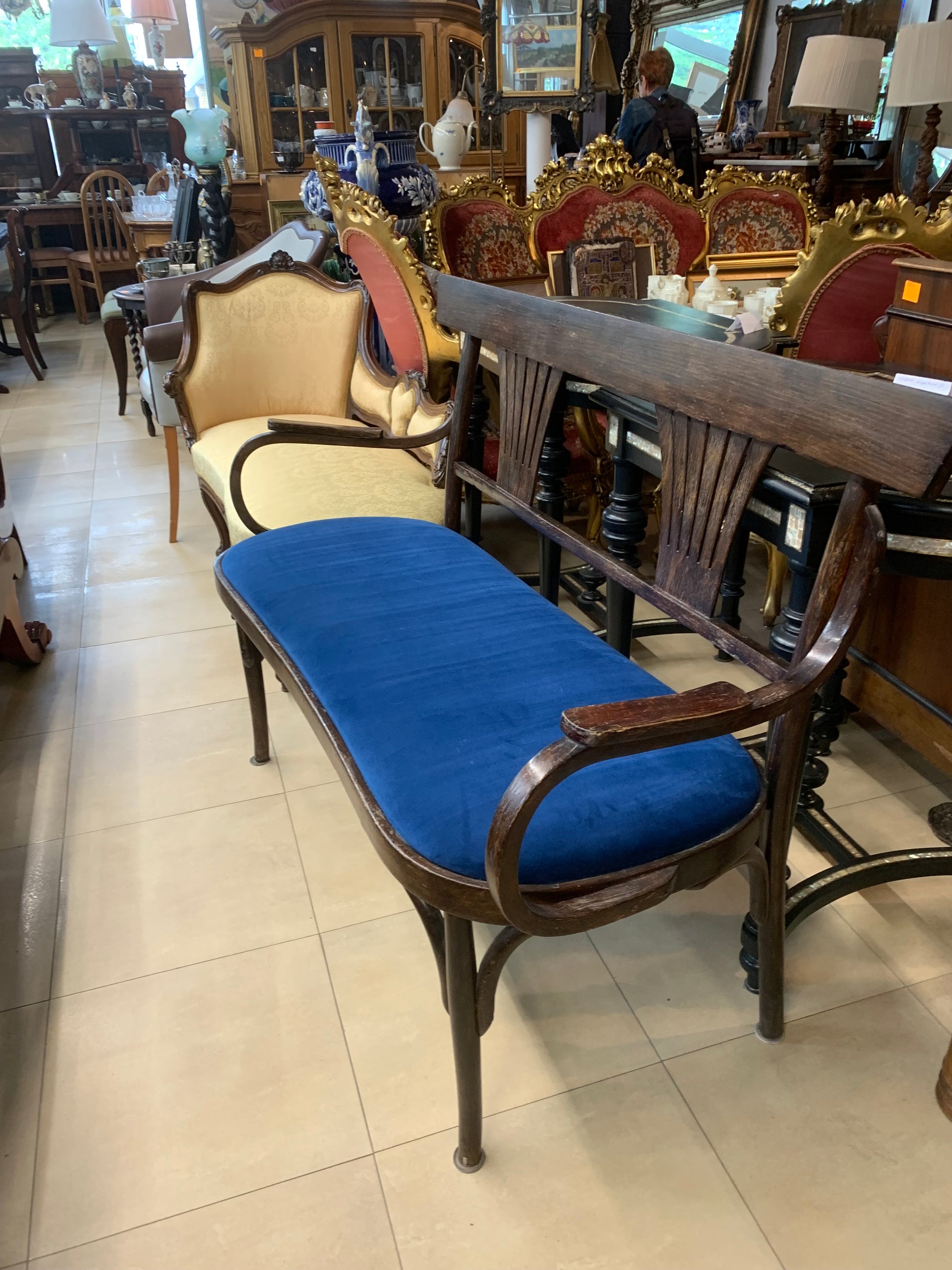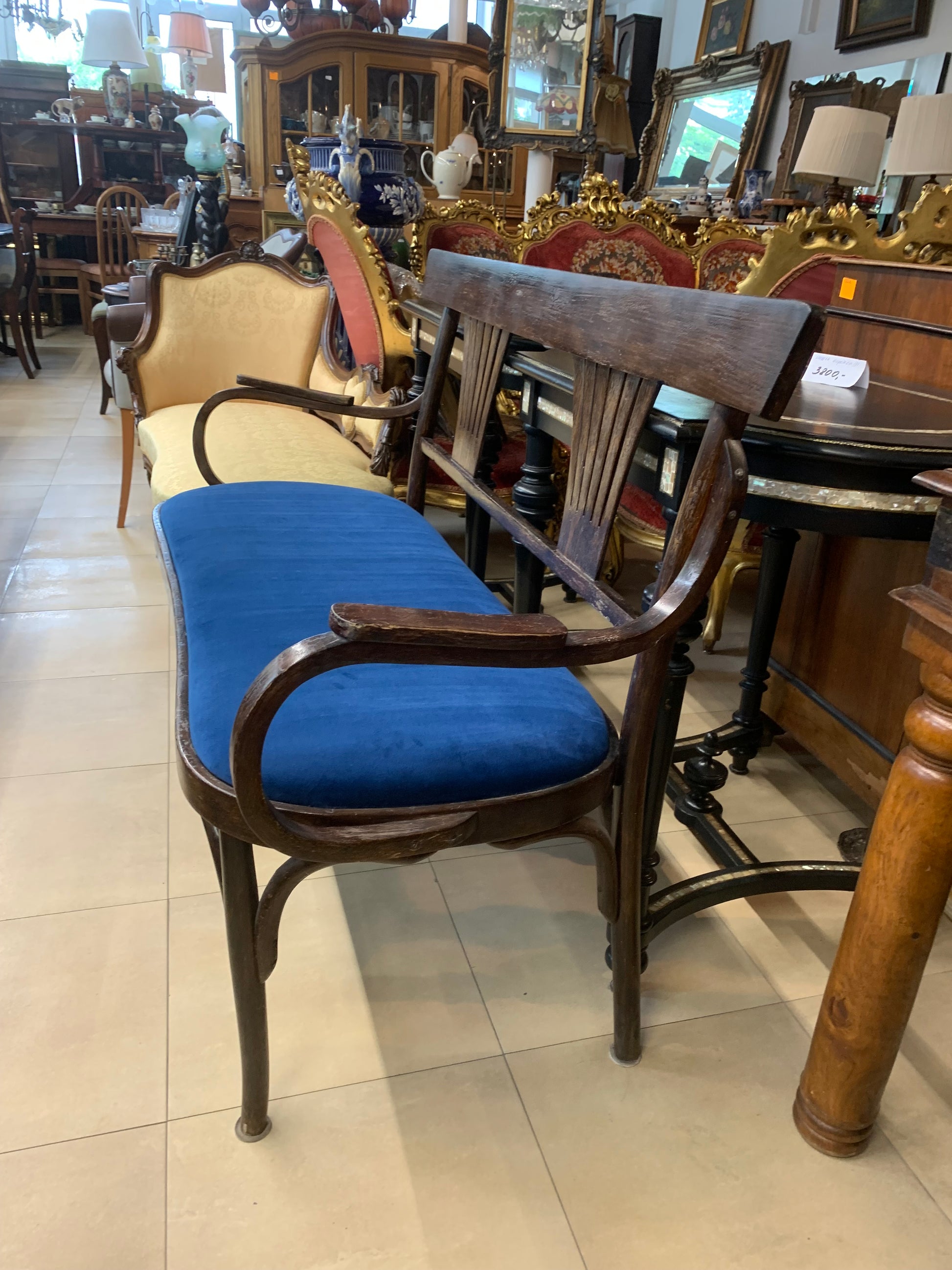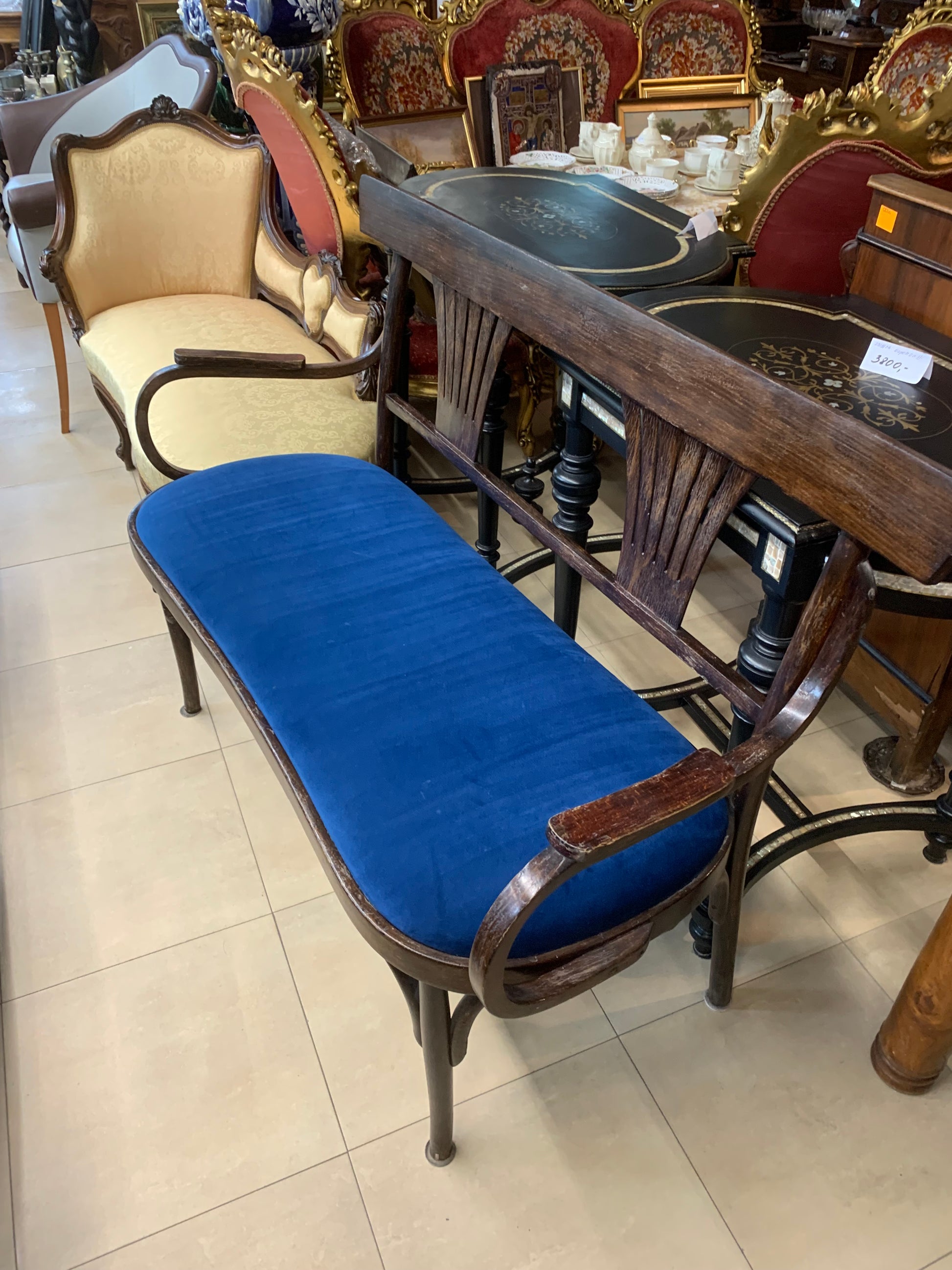 Kanapa, siedzisko do przedpokoju Thonet, tapicerka w kolorze chabrowym, stan - dobry. Wymiary: 123 x 47 cm, wysokość 90 cm