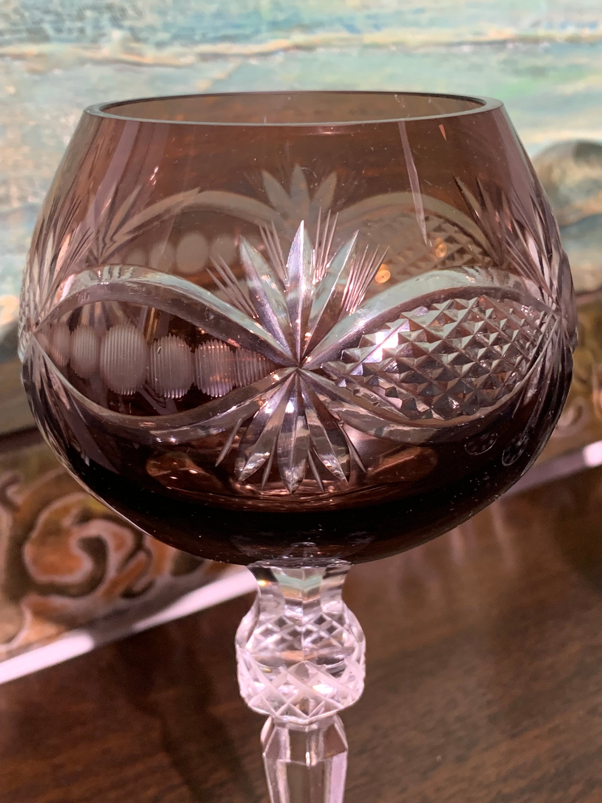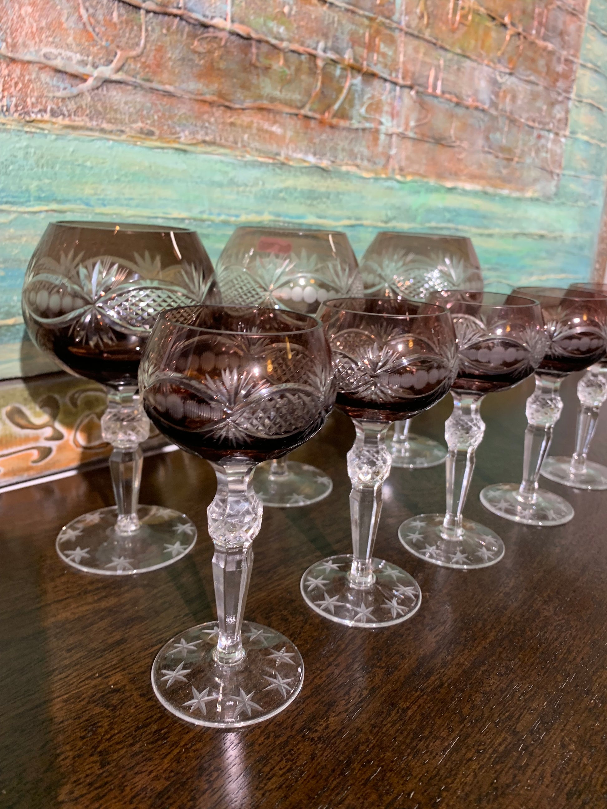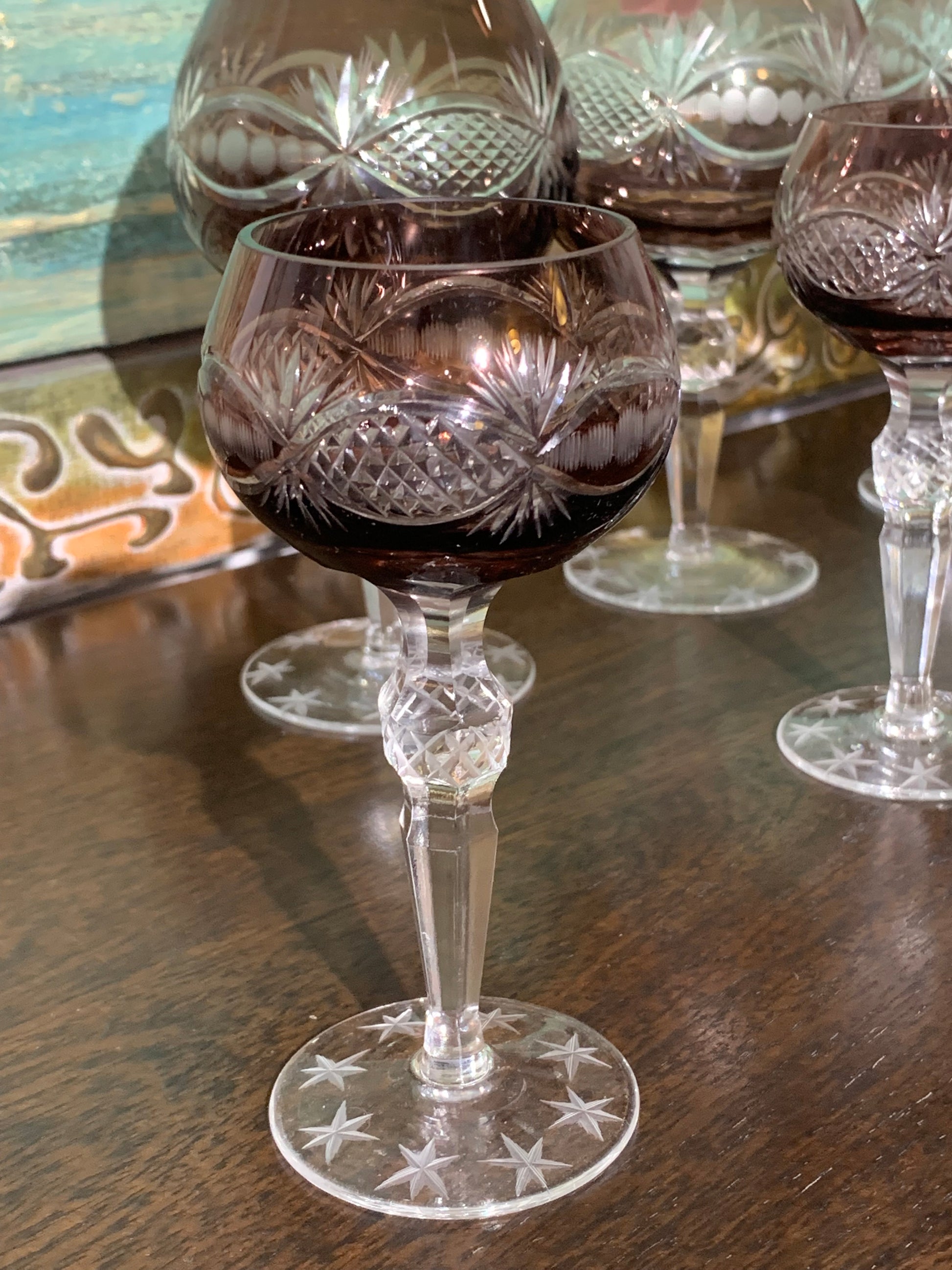 Komplet kieliszków kryształowych do wina w kolorze burgund, 5 małych i 3 duże. Stan: dobry.