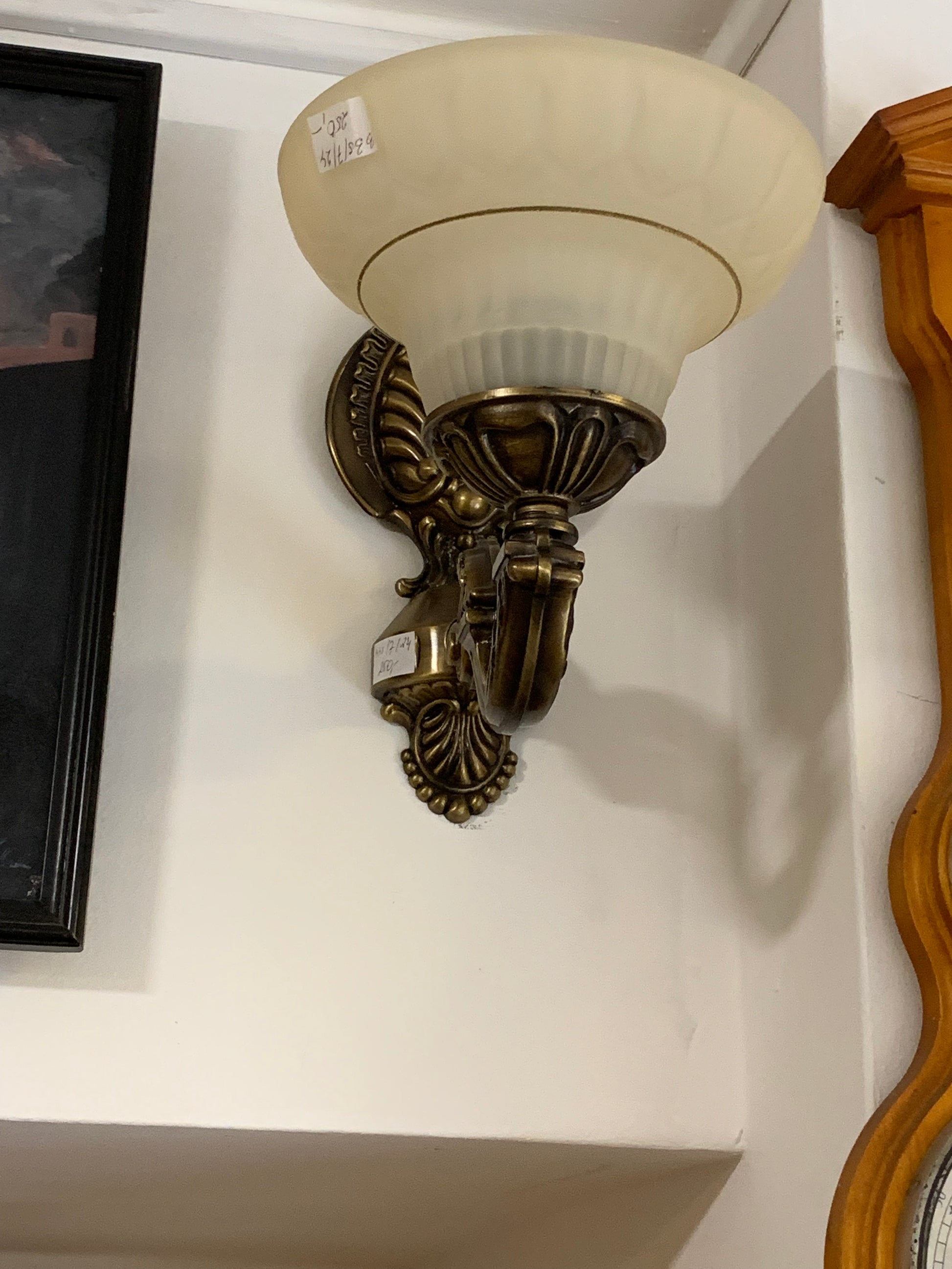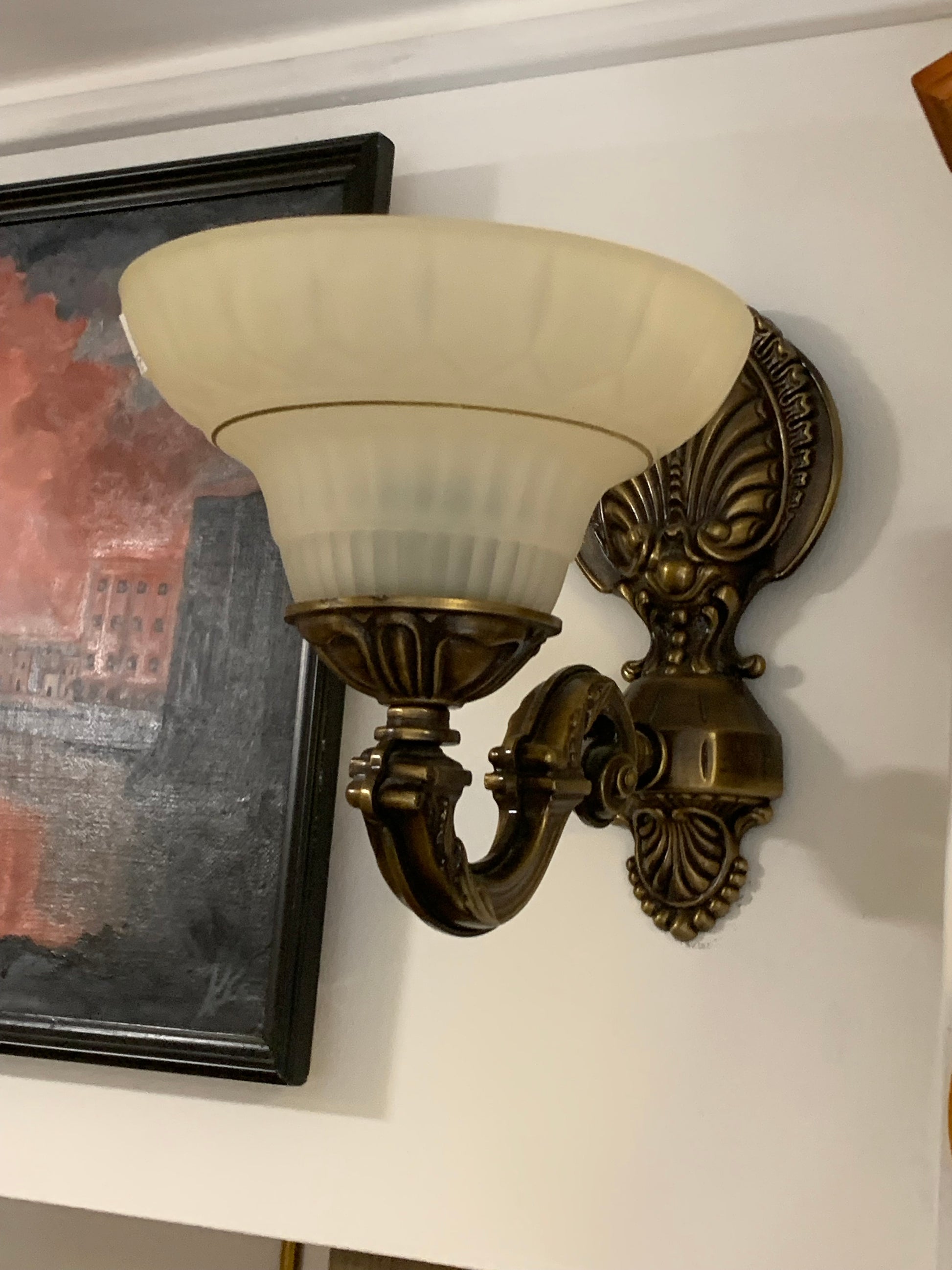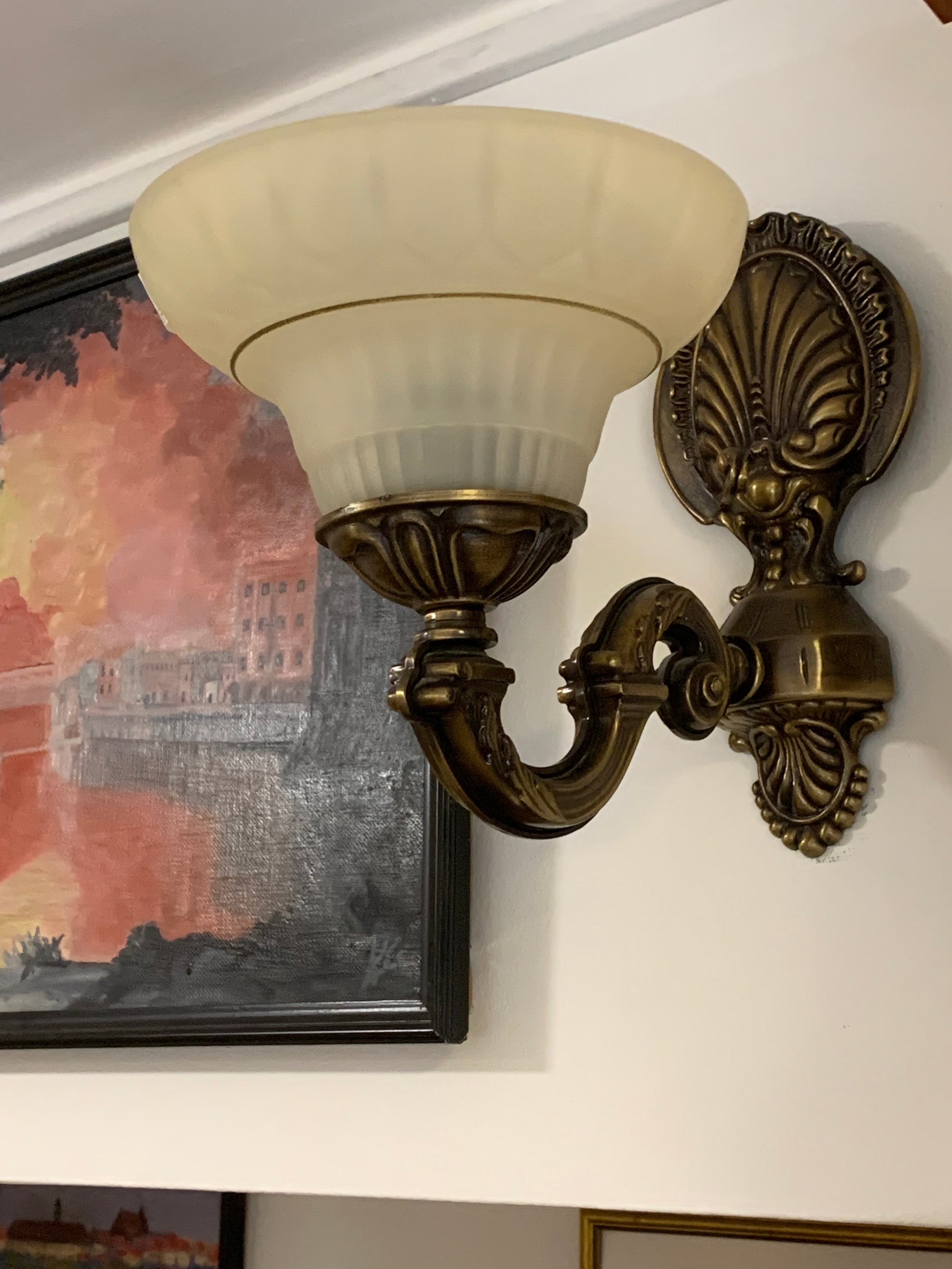 Kinkiet włoski z mosiądzu, klosz z mlecznego szkła. W ofercie są dwa stylowe kinkiety w bardzo dobrym stanie.