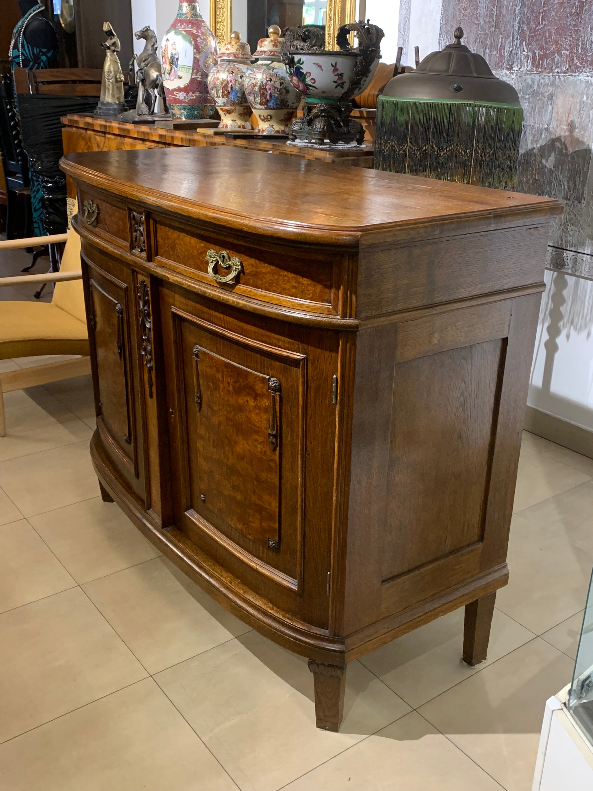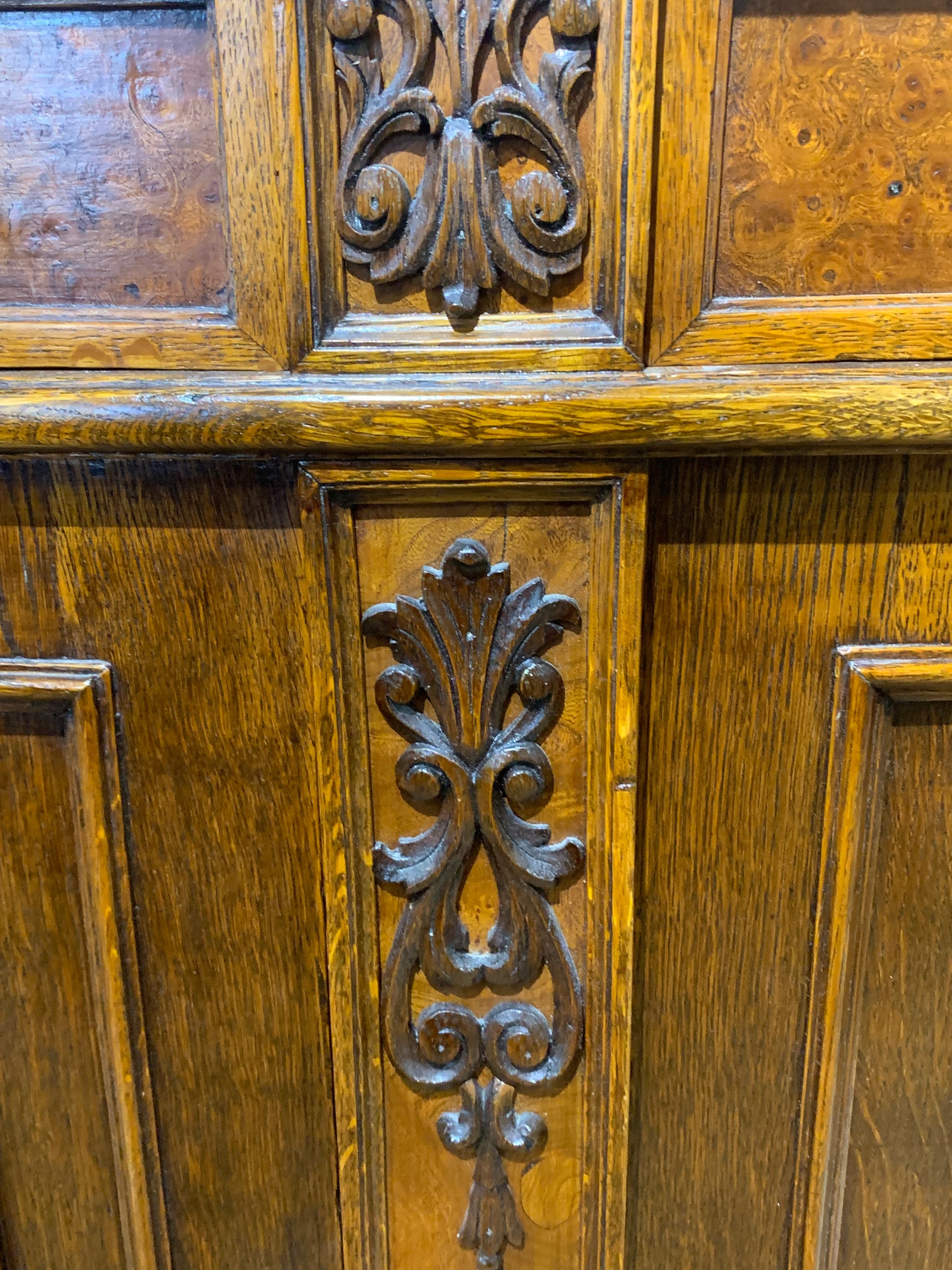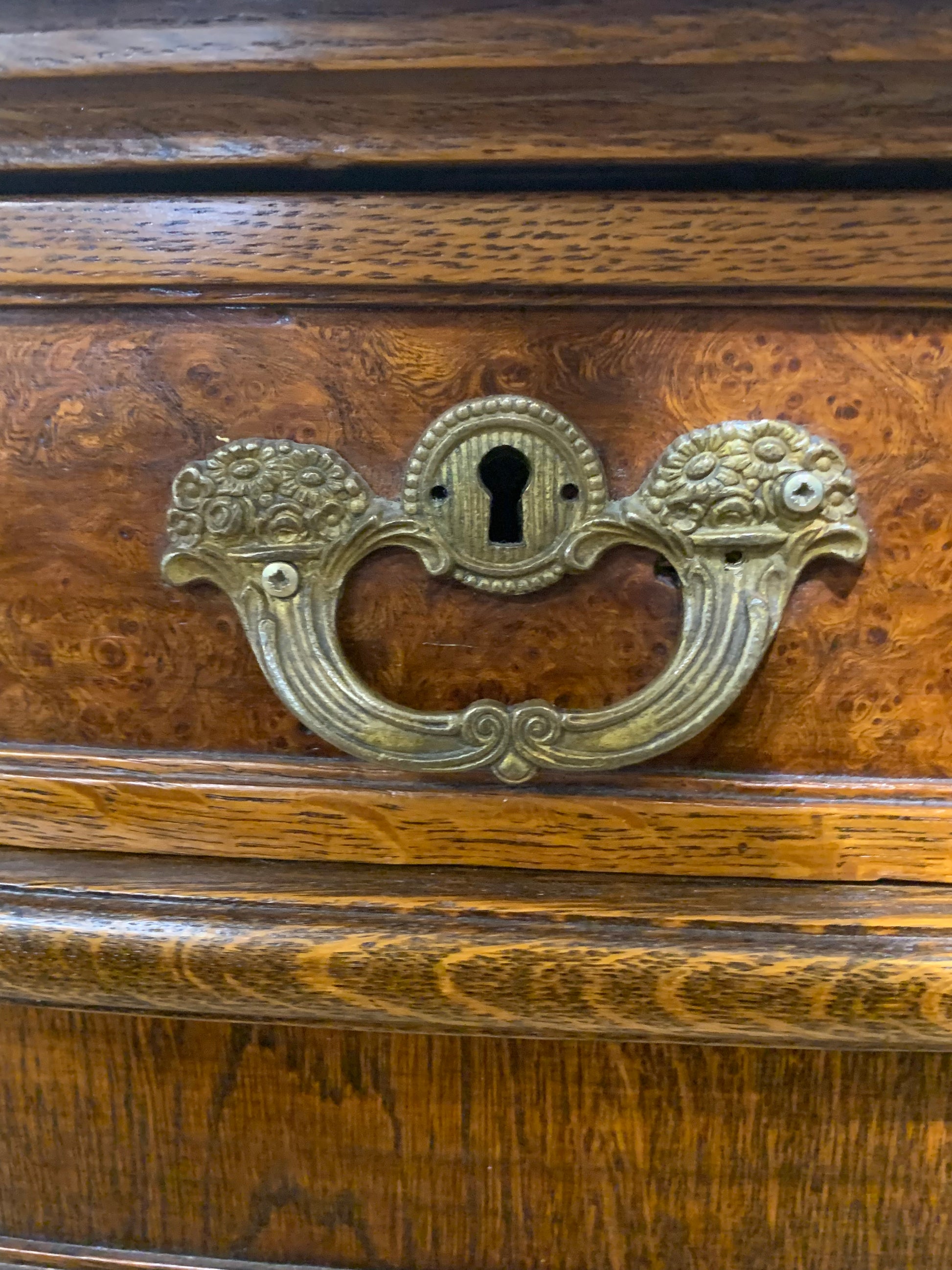 Komoda secesyjna, dębowa, ozdobiona czeczotą, rzeźbieniami i mosiężnymi uchwytami. Do kompletu w ofercie jest kredens secesyjny z lustrem, jak na zdjęciu.