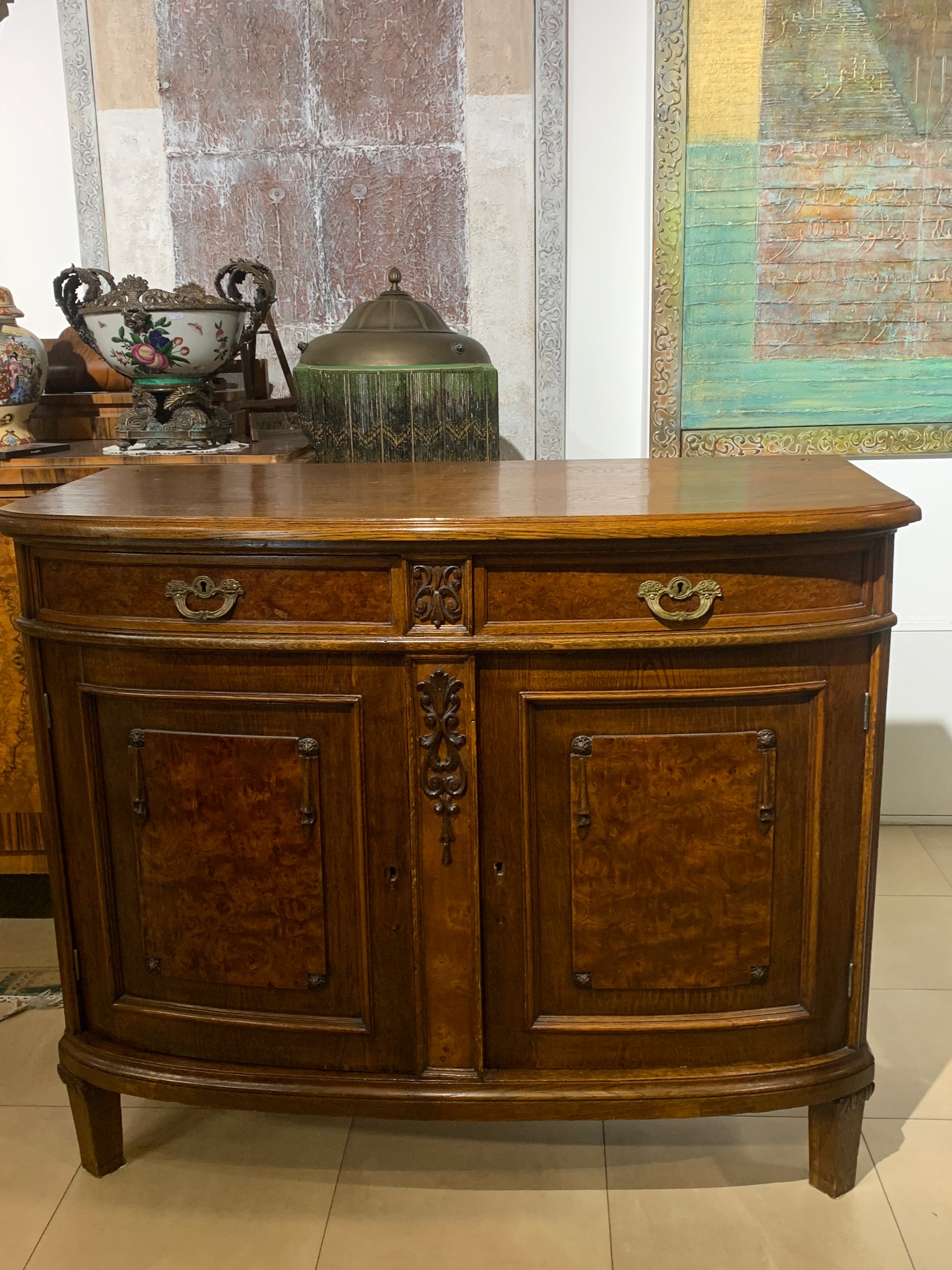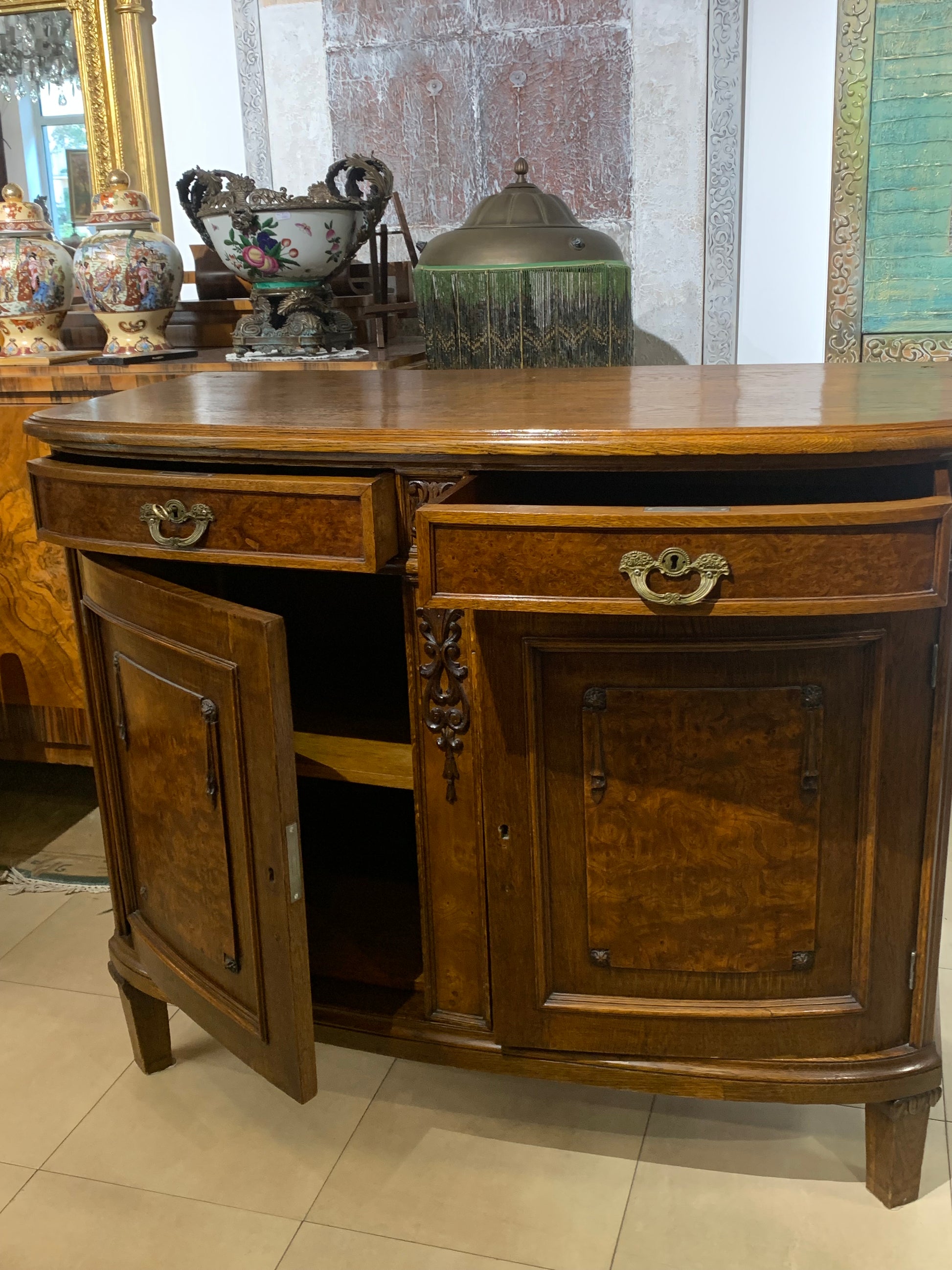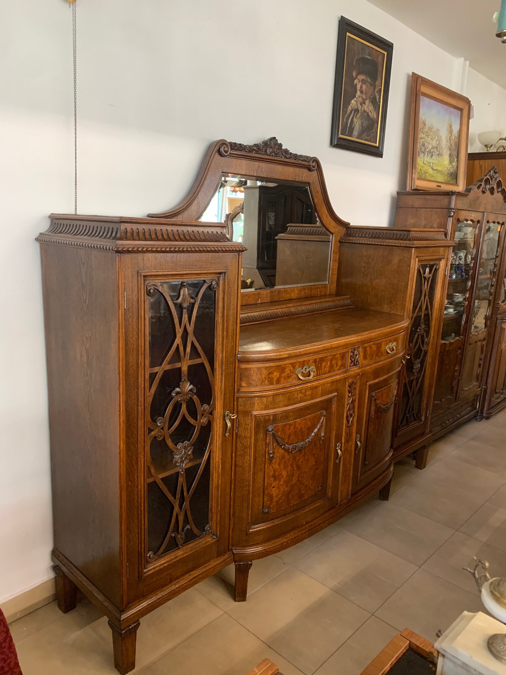 Komoda secesyjna, dębowa, ozdobiona czeczotą, rzeźbieniami i mosiężnymi uchwytami. Do kompletu w ofercie jest kredens secesyjny z lustrem, jak na zdjęciu.