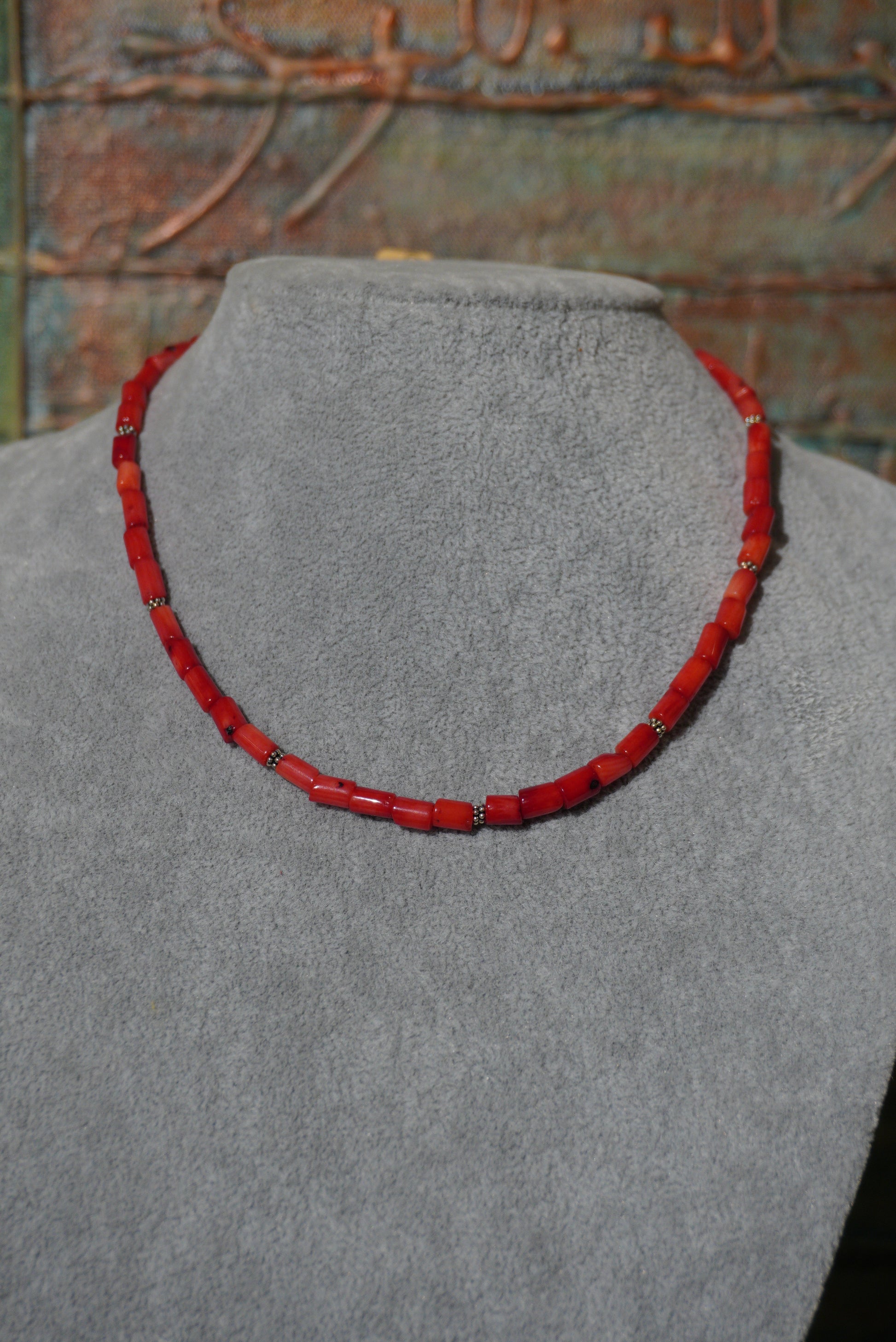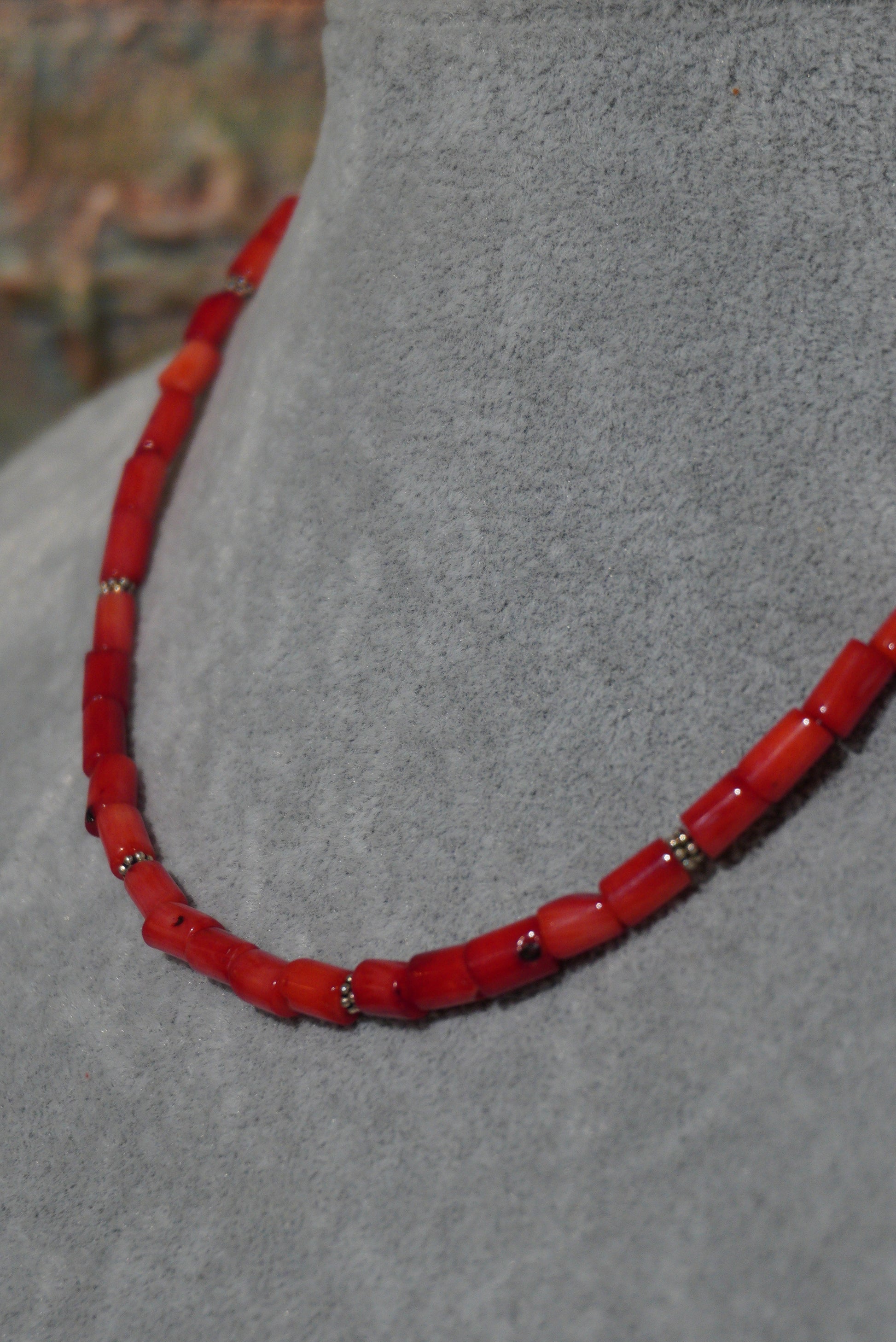 Drobny naszyjnik z koralu czerwonego, przełożony srebrnymi zdobieniami, zapięcia ze srebra.