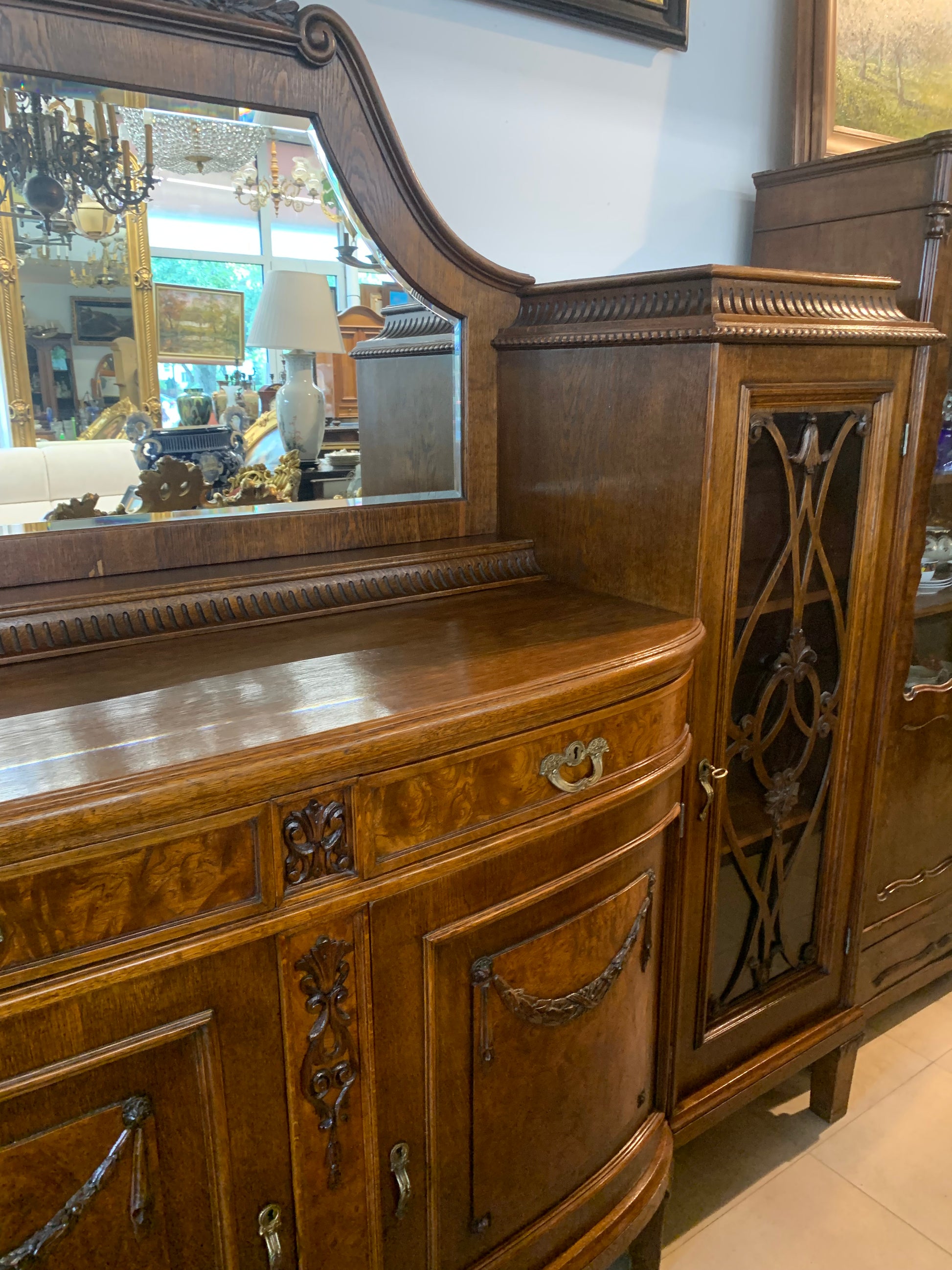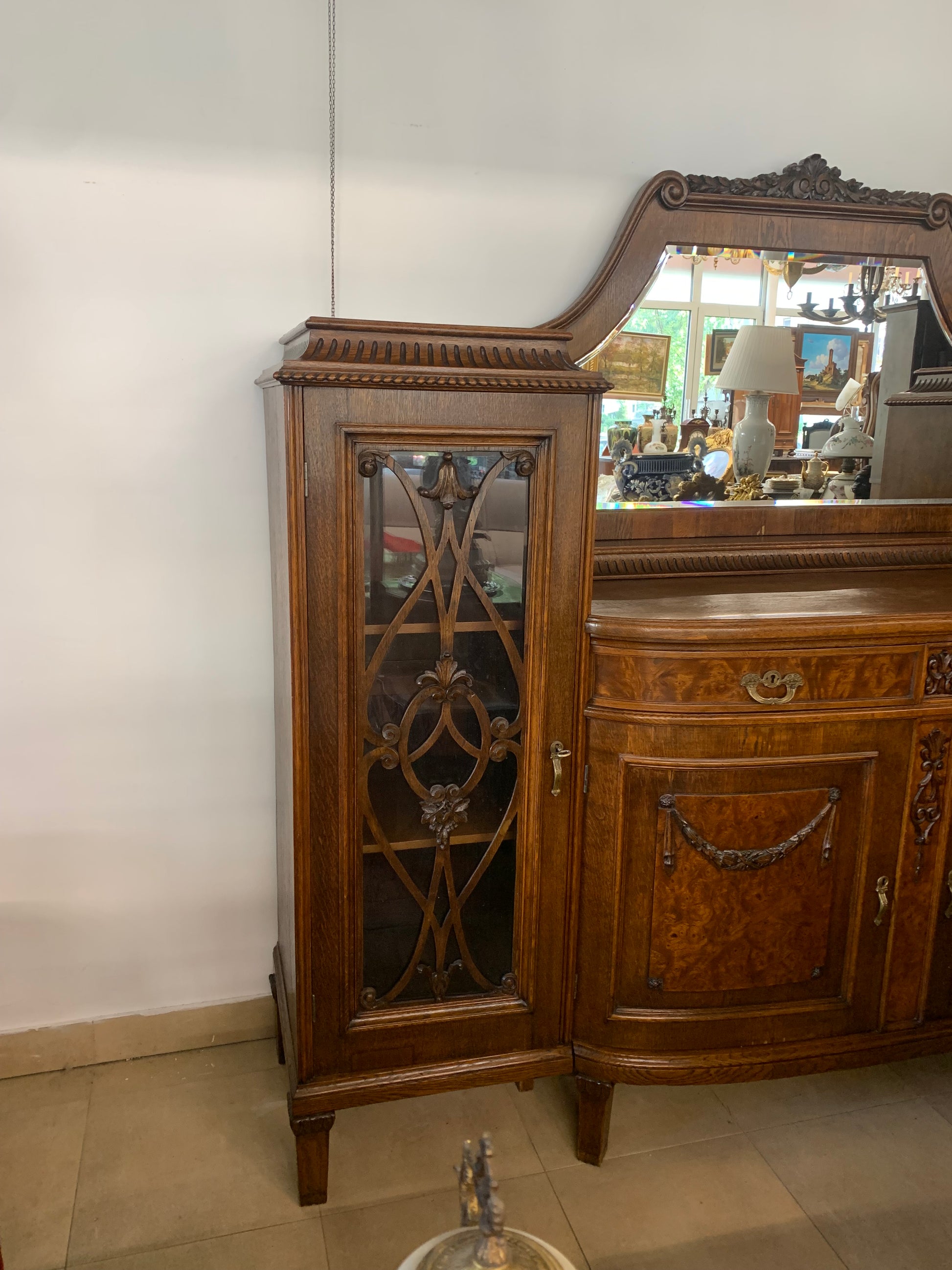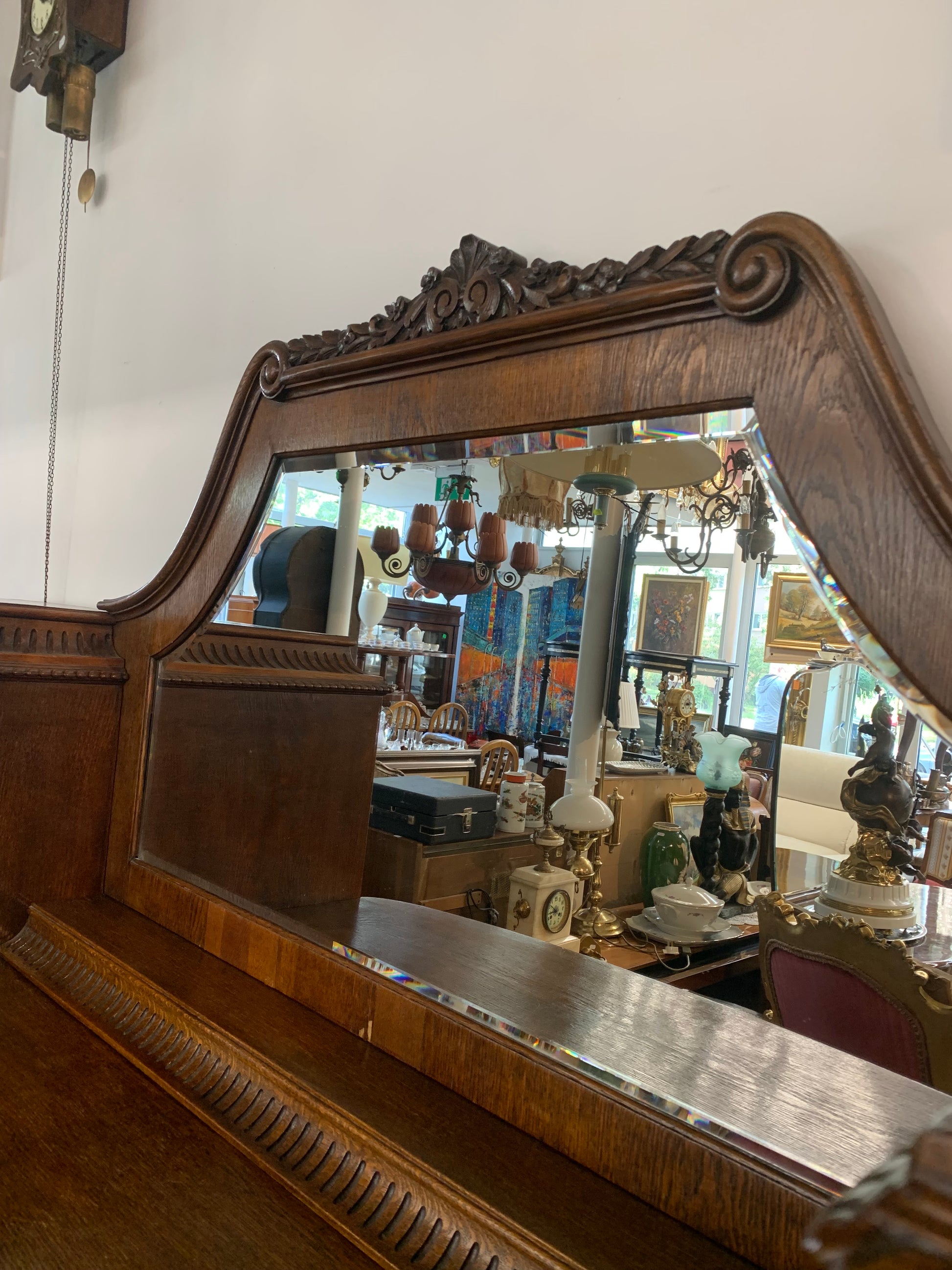 Kredens secesyjny, dębowy z lustrem, zdobiony rzeźbionymi girlandami, mosiężnymi uchwytami, oszklony, tafla lustra fazowana. Do kompletu w ofercie jest komoda w podobnym stylu.