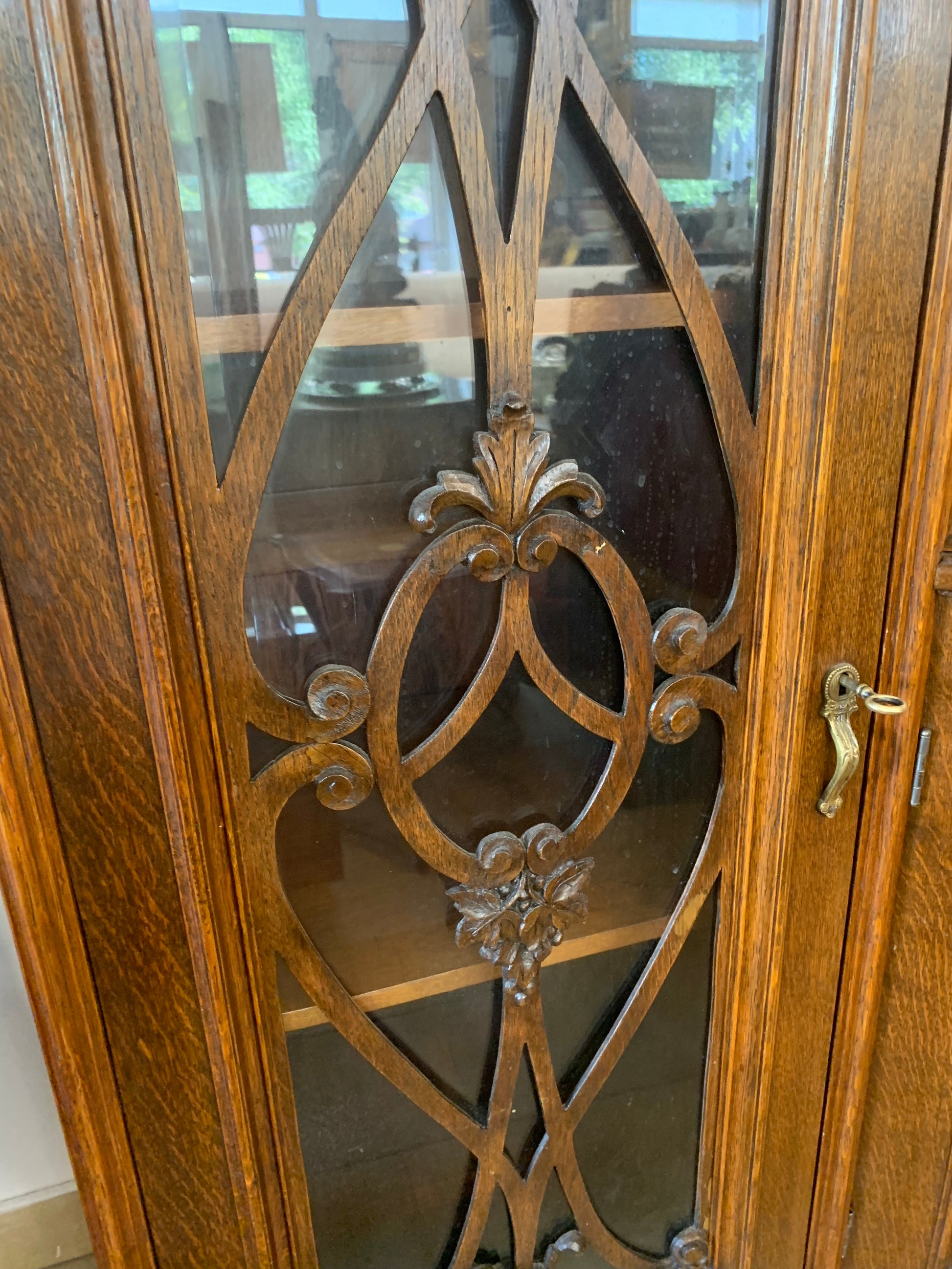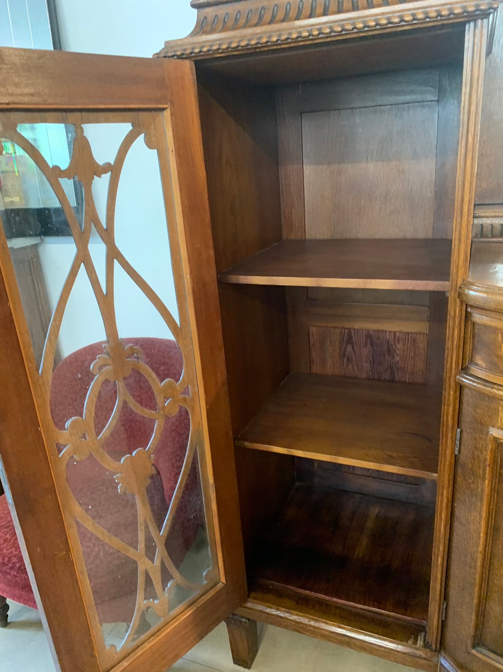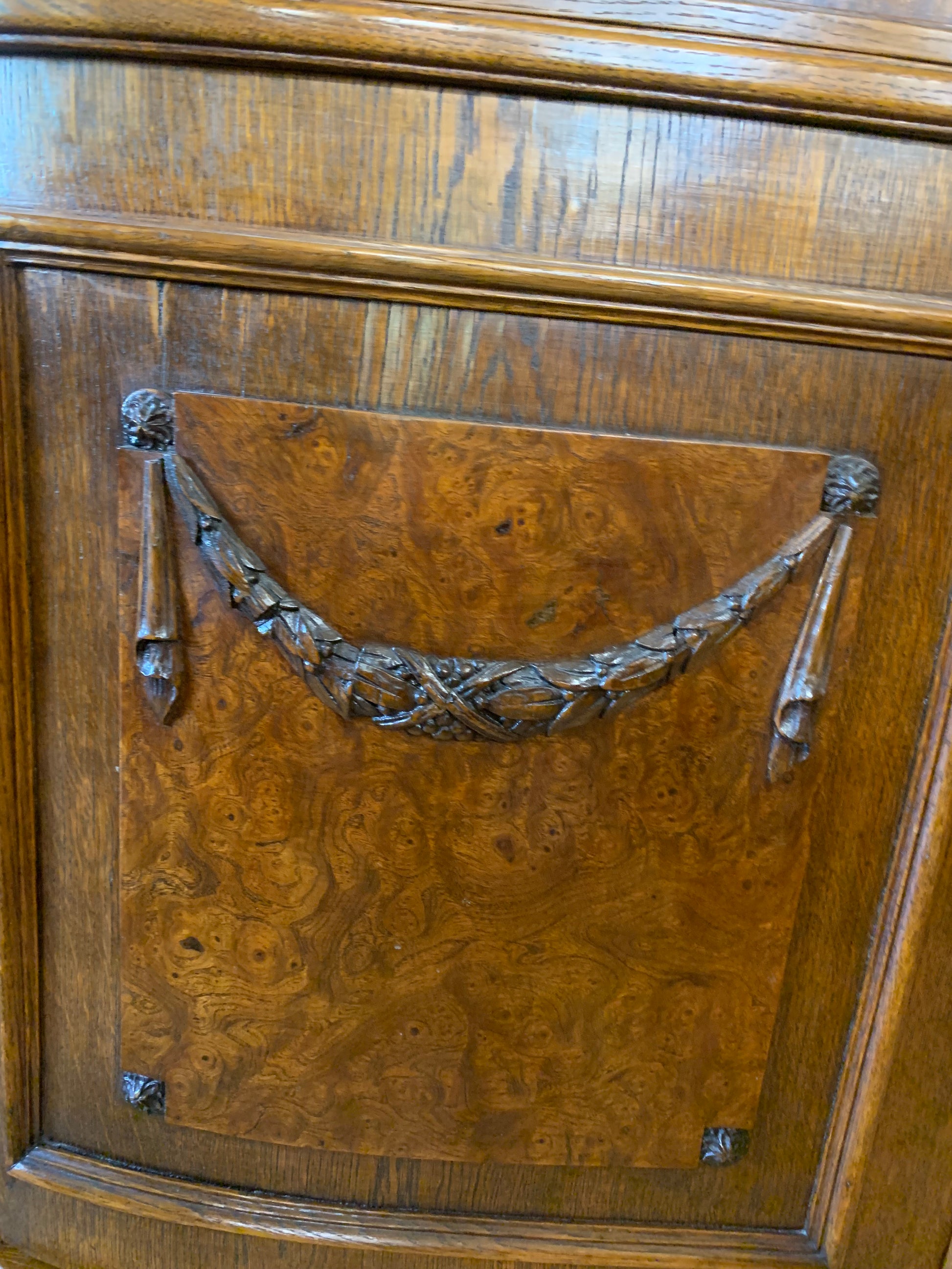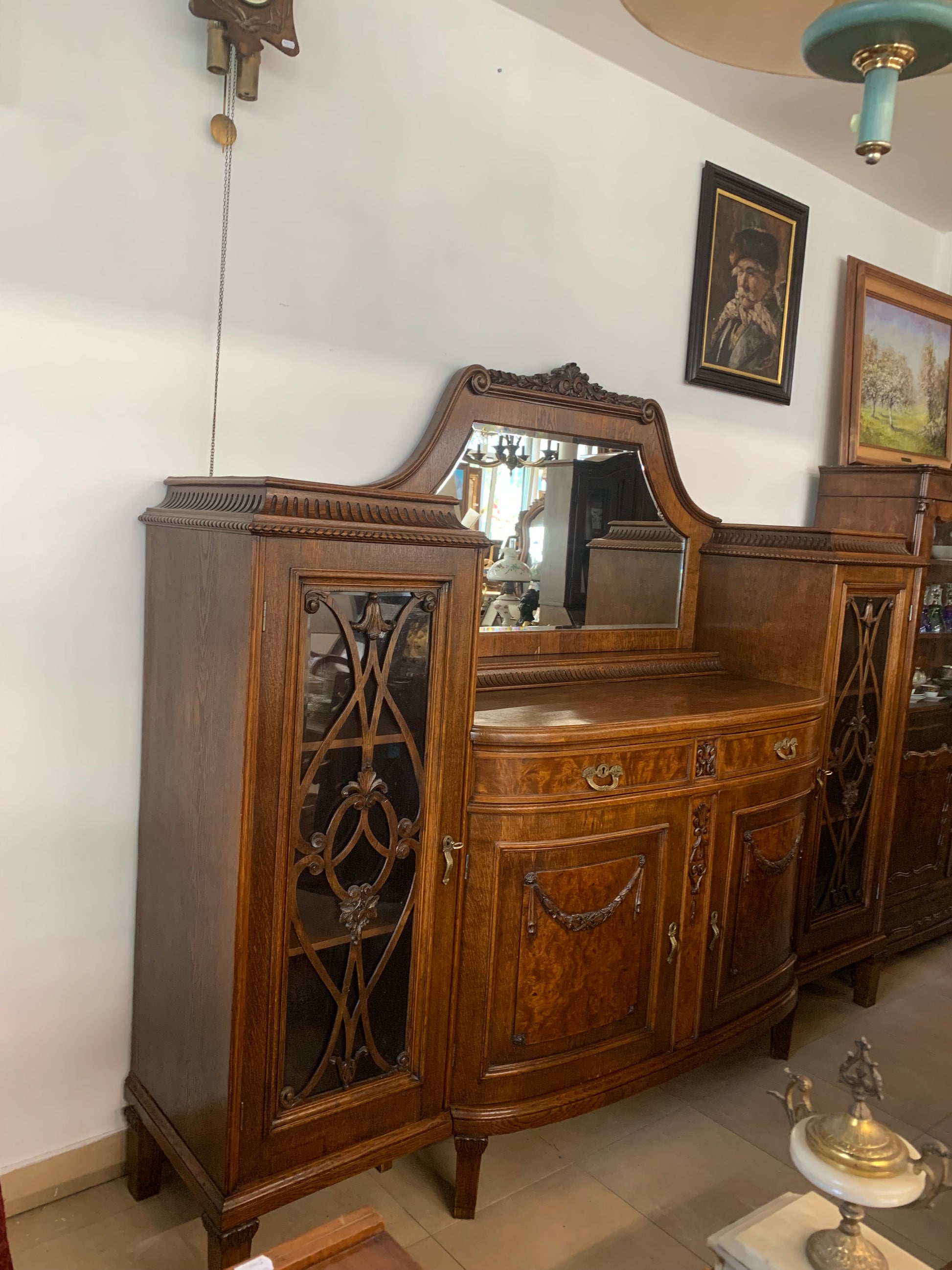 Kredens secesyjny, dębowy z lustrem, zdobiony rzeźbionymi girlandami, mosiężnymi uchwytami, oszklony, tafla lustra fazowana. Do kompletu w ofercie jest komoda w podobnym stylu.