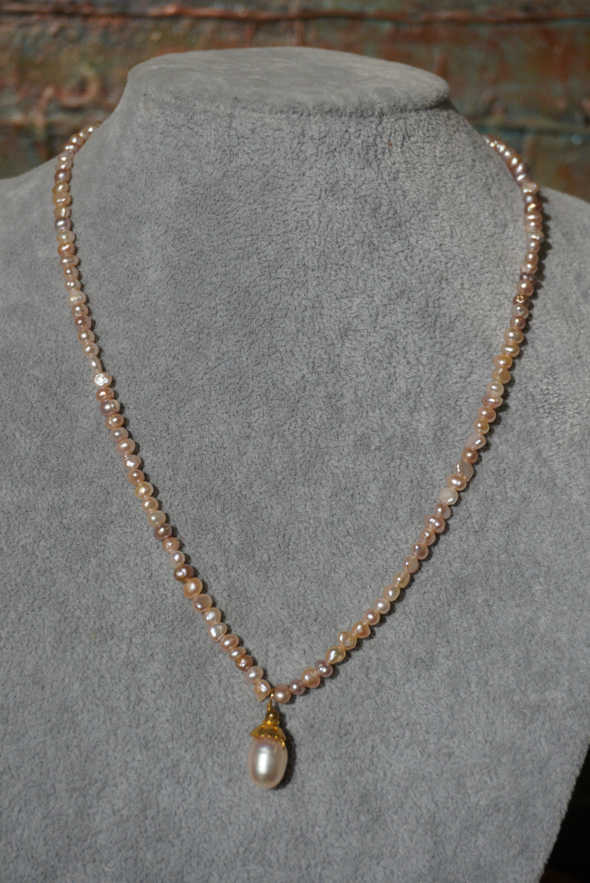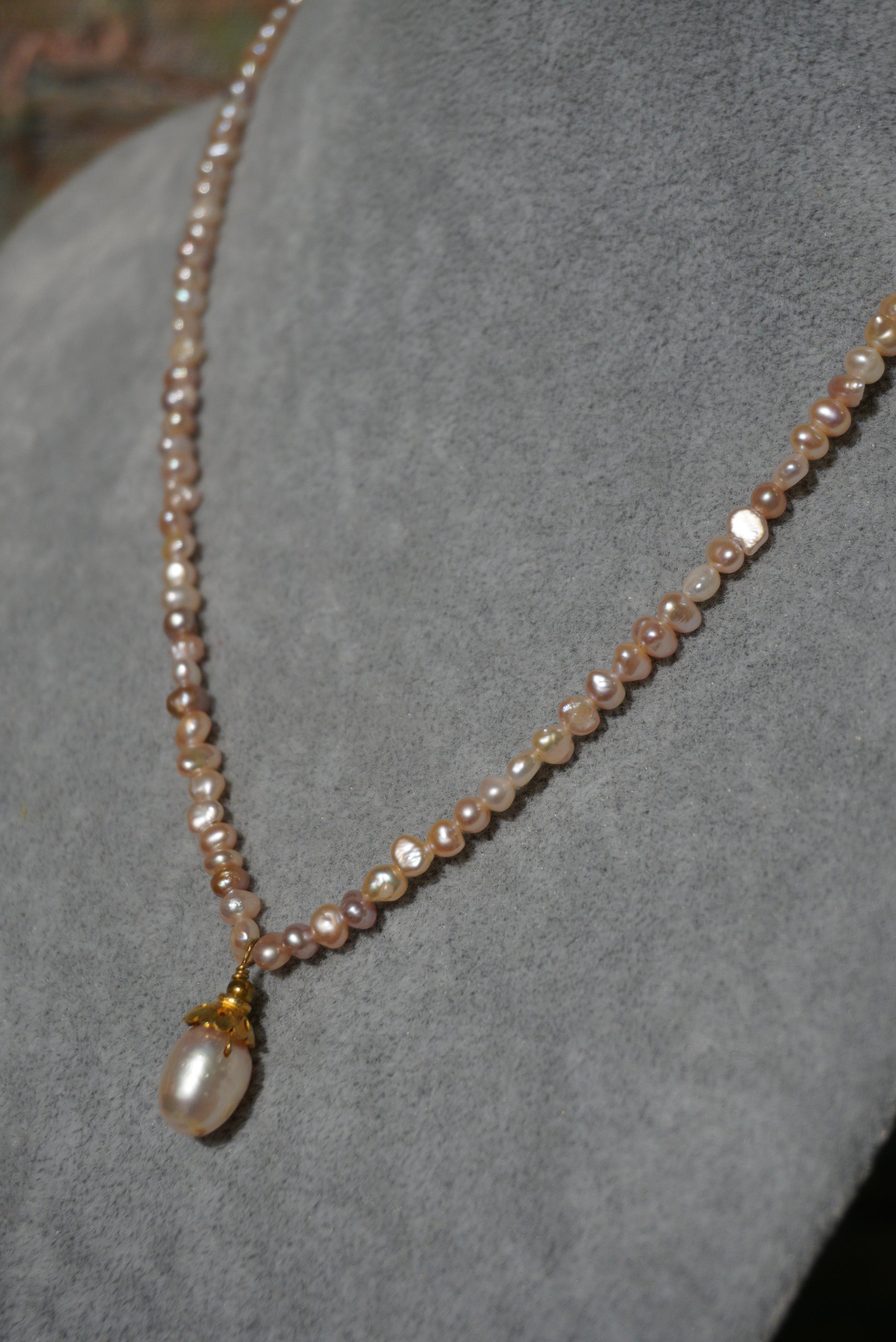Krótki naszyjnik z drobnych pereł hodowlanych w kolorze różowo beżowym, z zawieszką z perły oprawionej w srebro pozłacane.