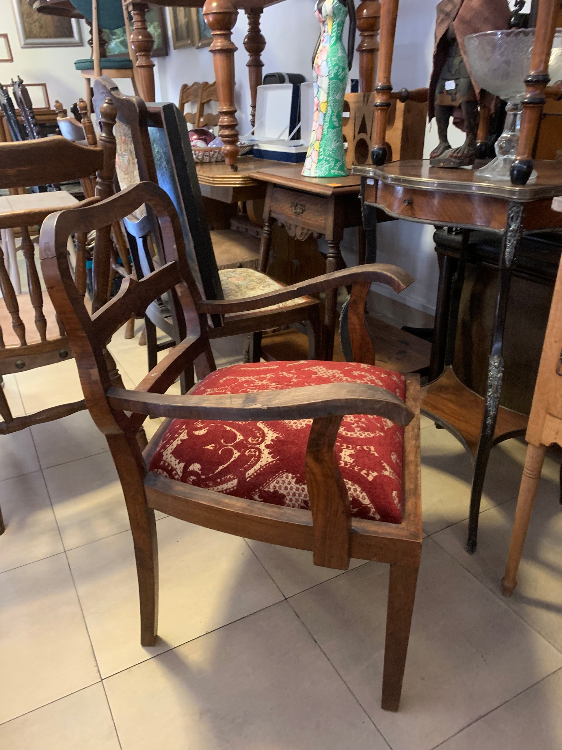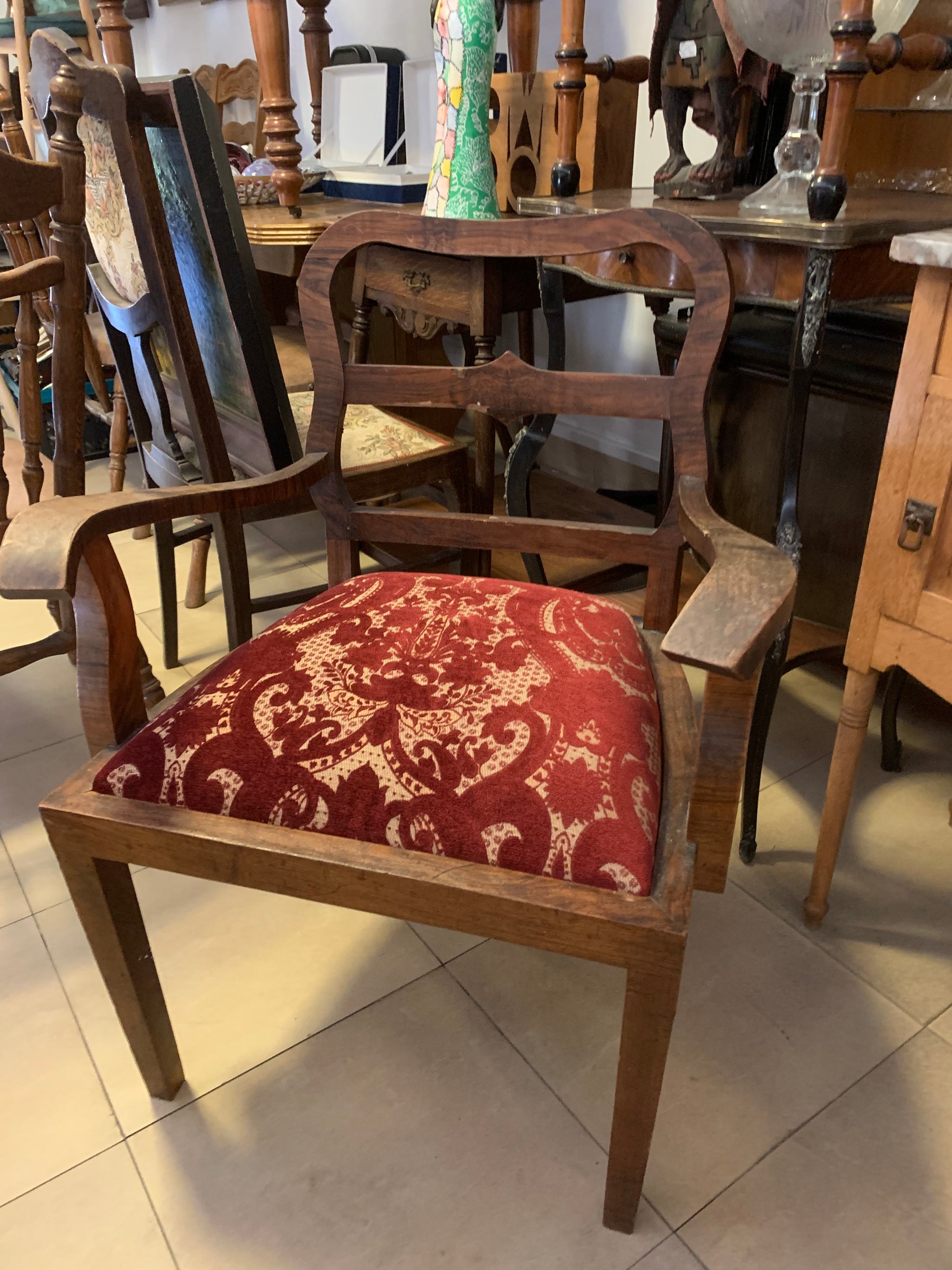 Fotel, krzesło z oparciami, tapicerowane, na sprężynach, siedzisko - nowa, gobelinowa tkanina w bordowo-złotym kolorze.