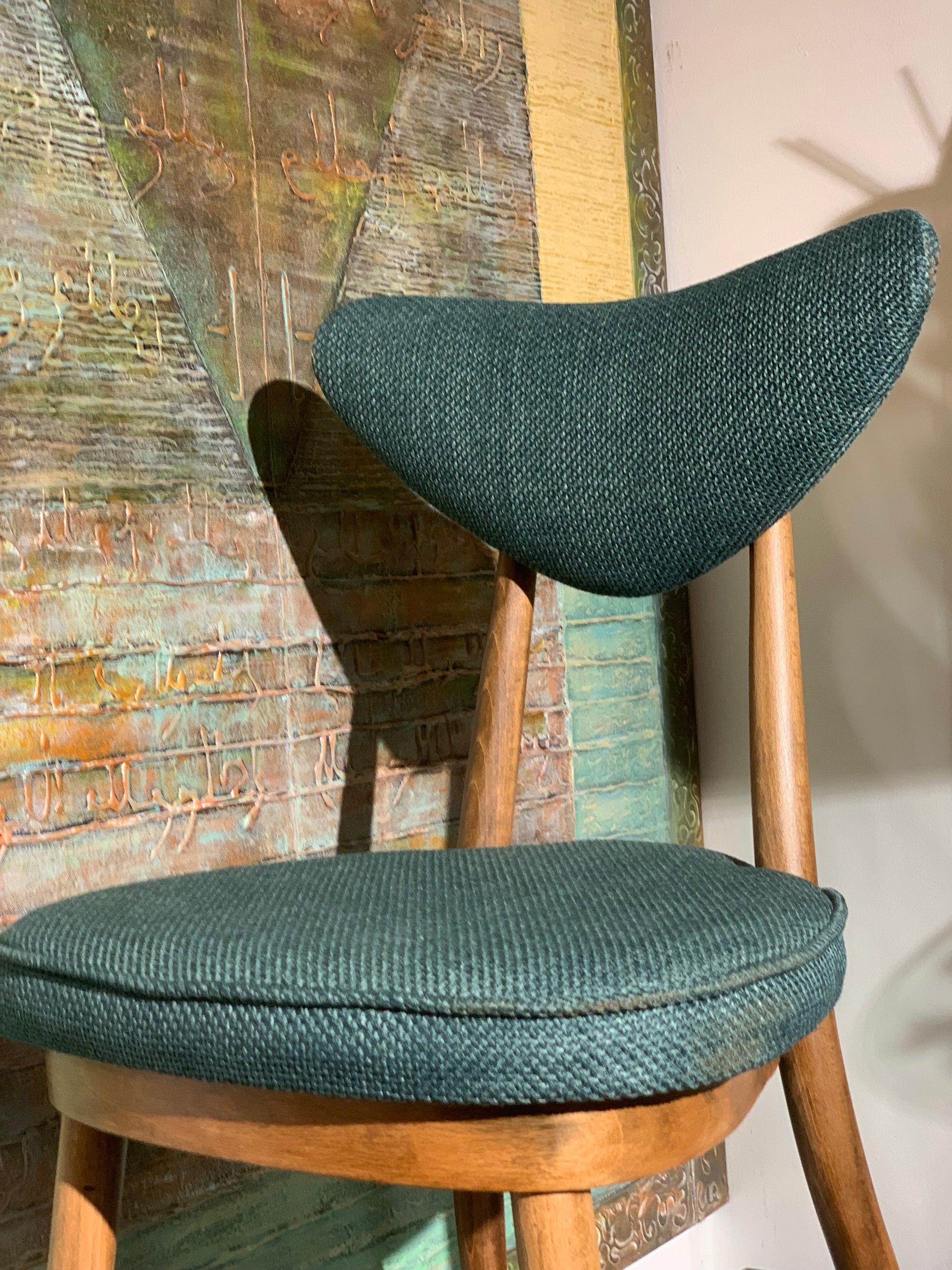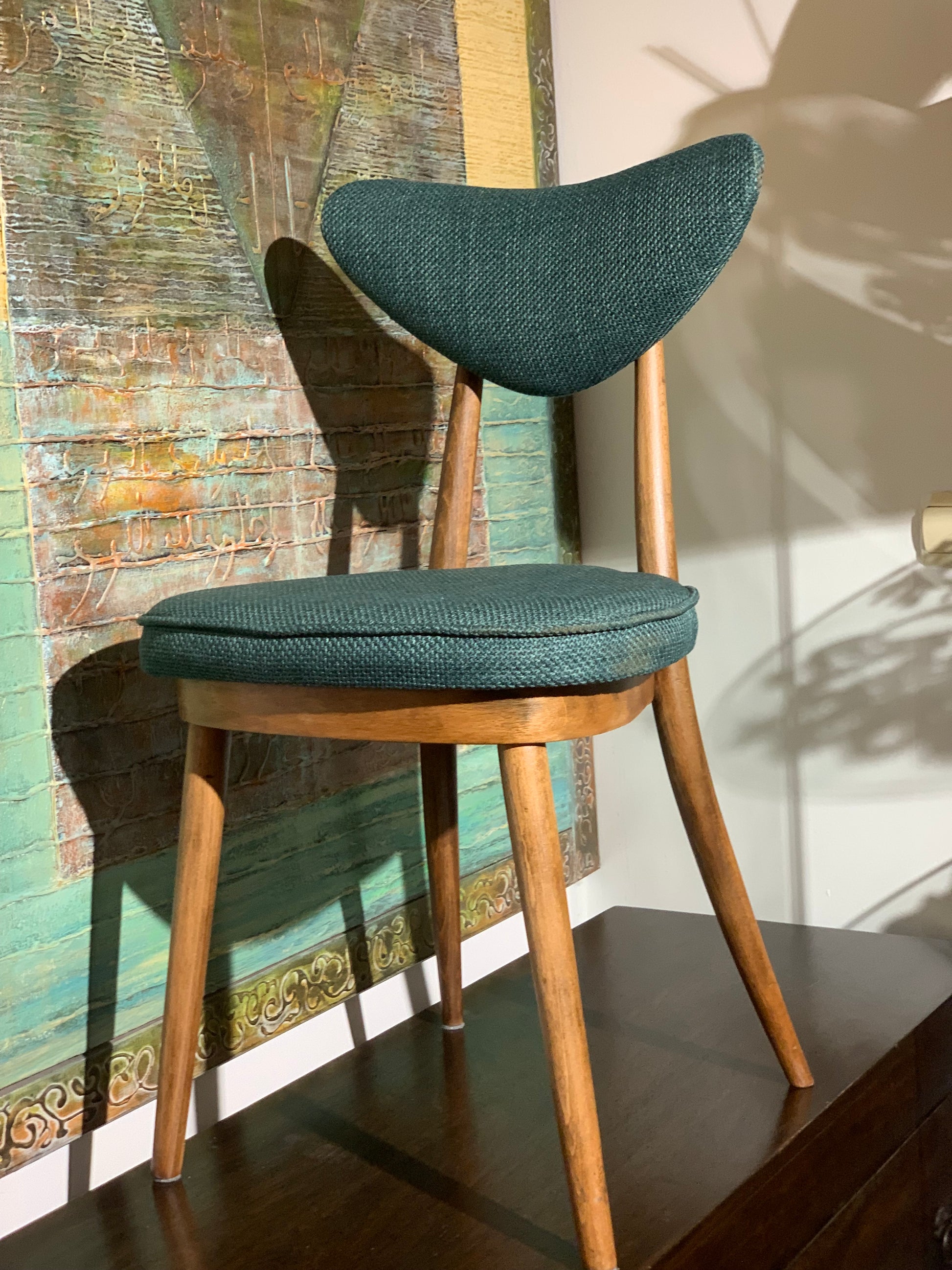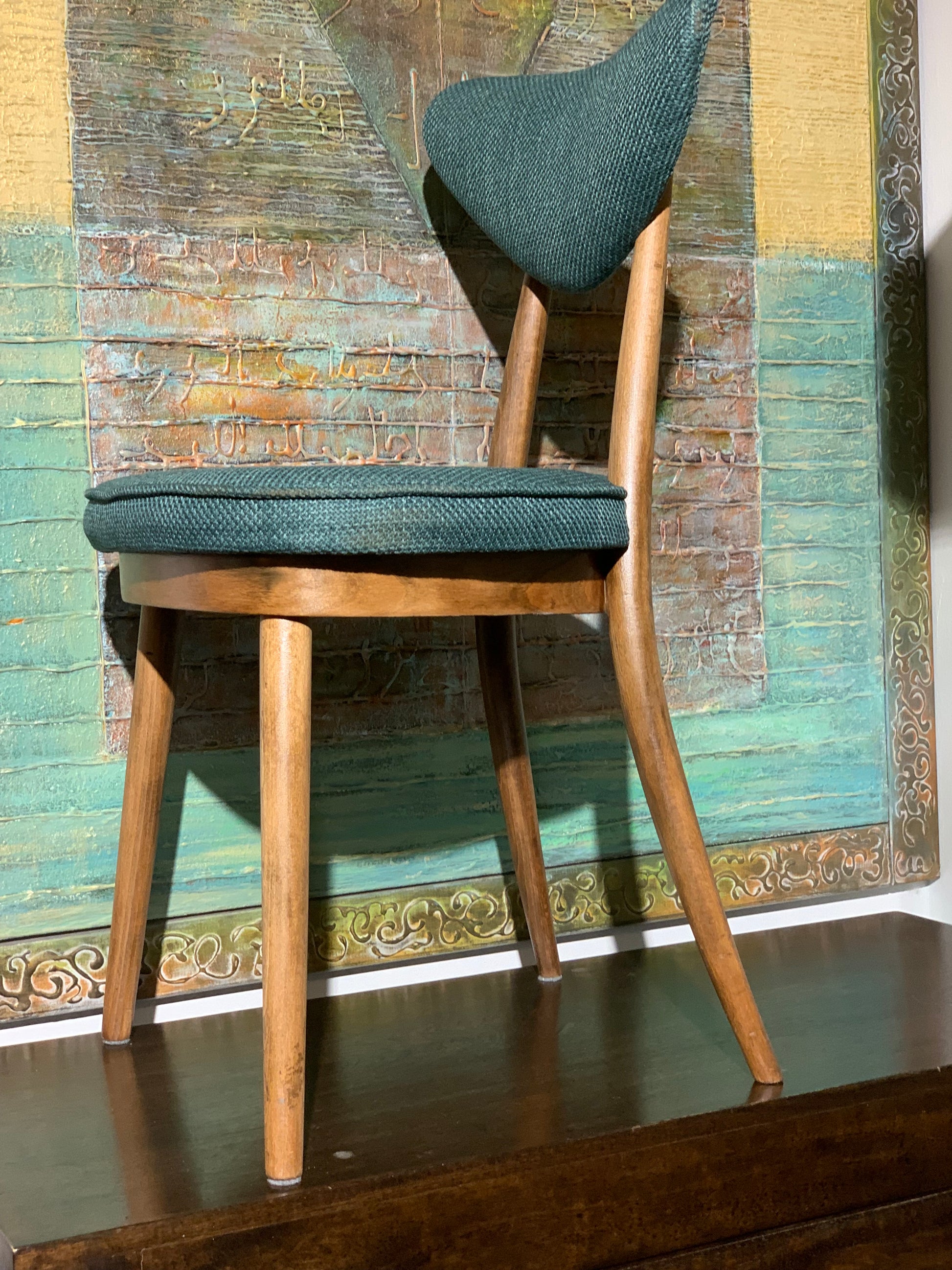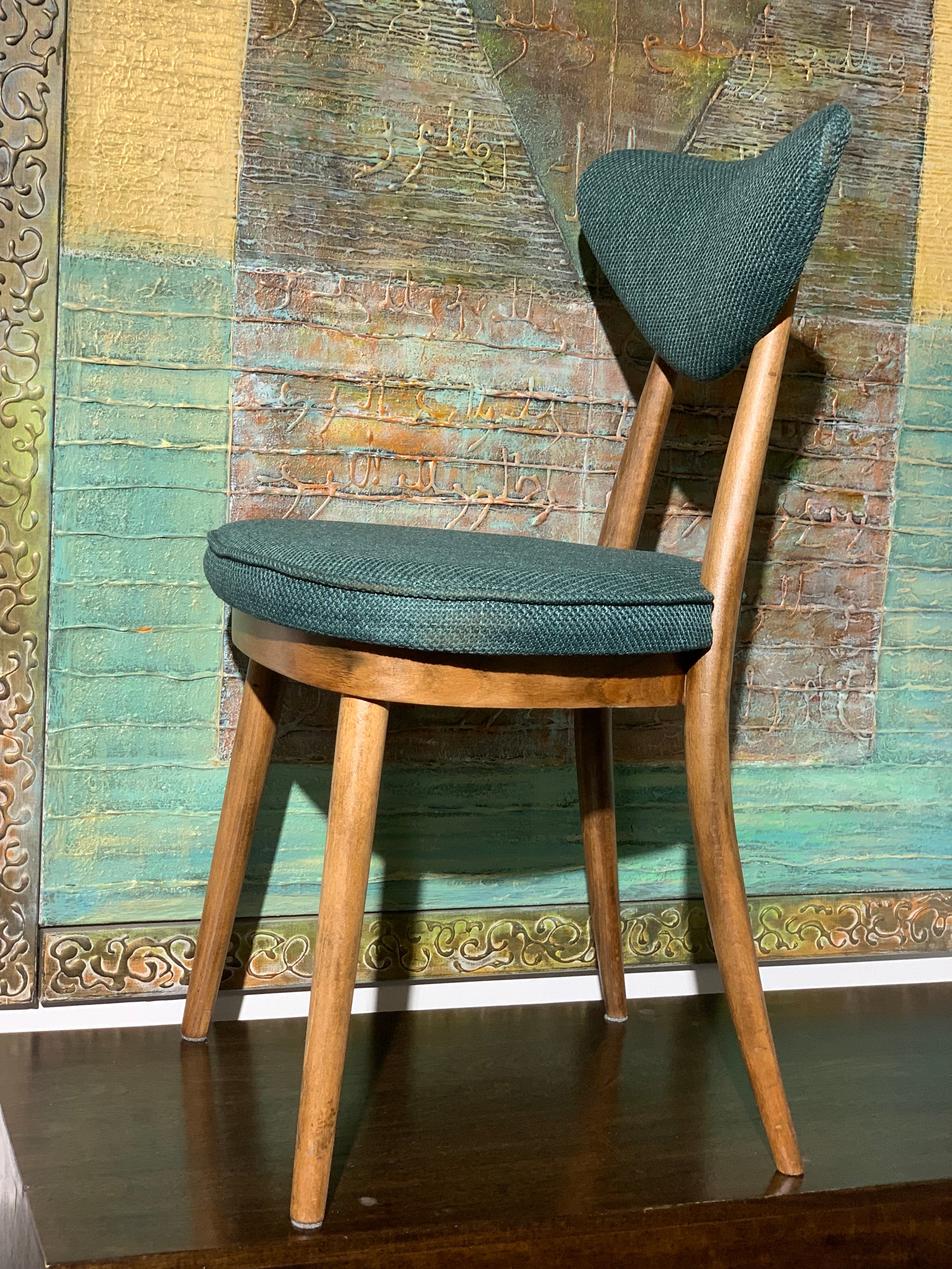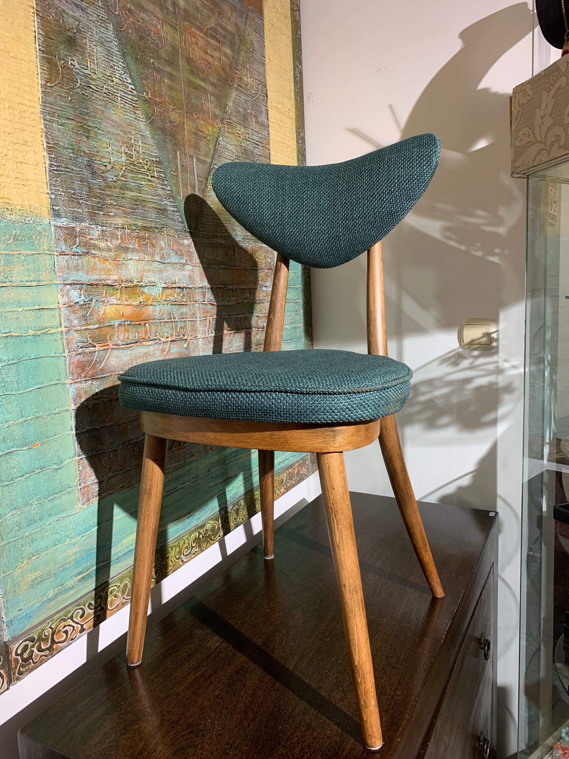 Kolekcjonerskie krzesło "serduszko" PRL z lat 60-ch po kompleksowej renowacji. Tapicerka w kolorze ciemnozielonym. Stelaż - buczyna w kolorze ciemnego orzecha. W ofercie jest krzesło - tapicerka w kolorze jasnoszarym, jedno w kolorze pomarańczowym.