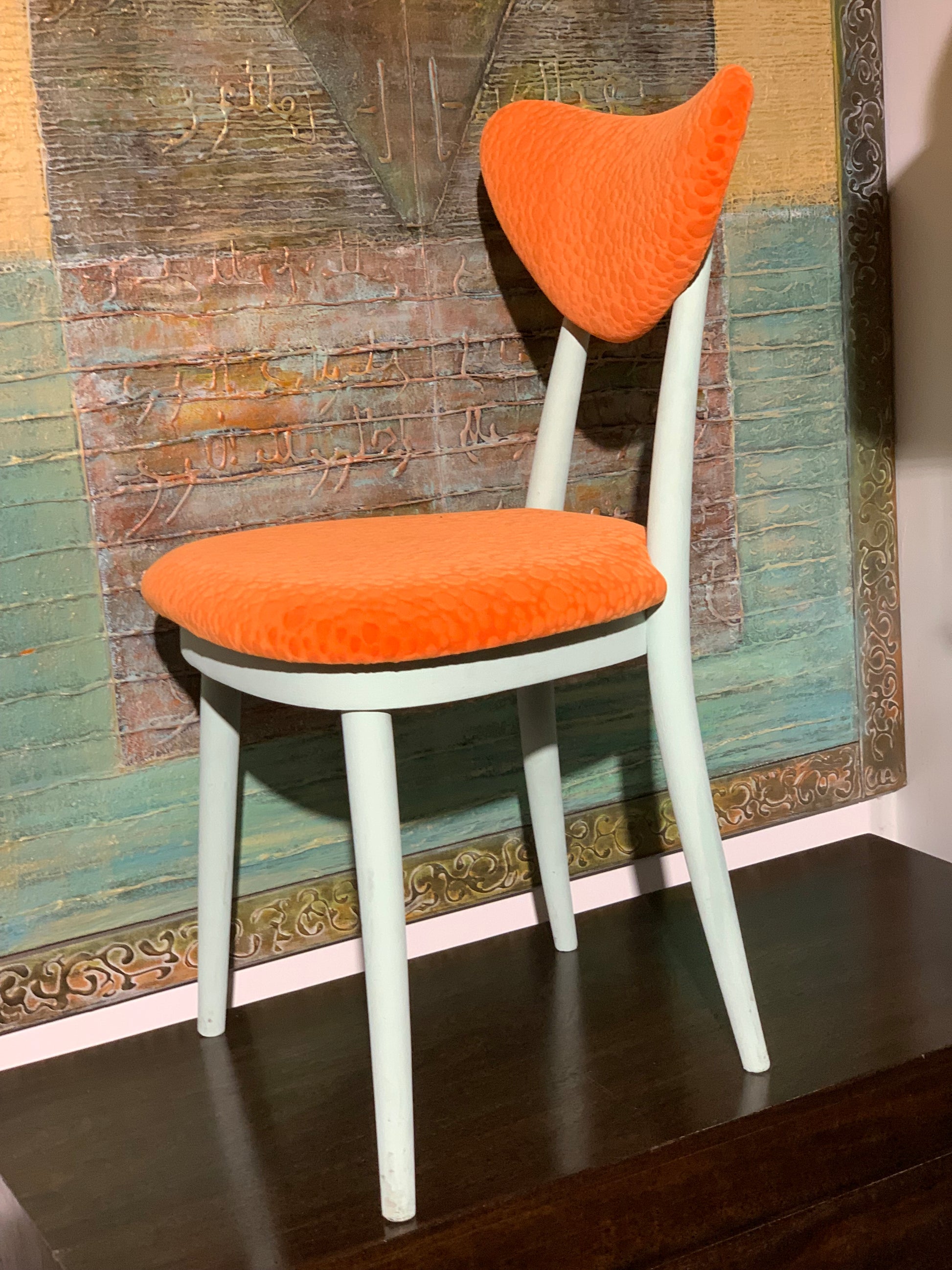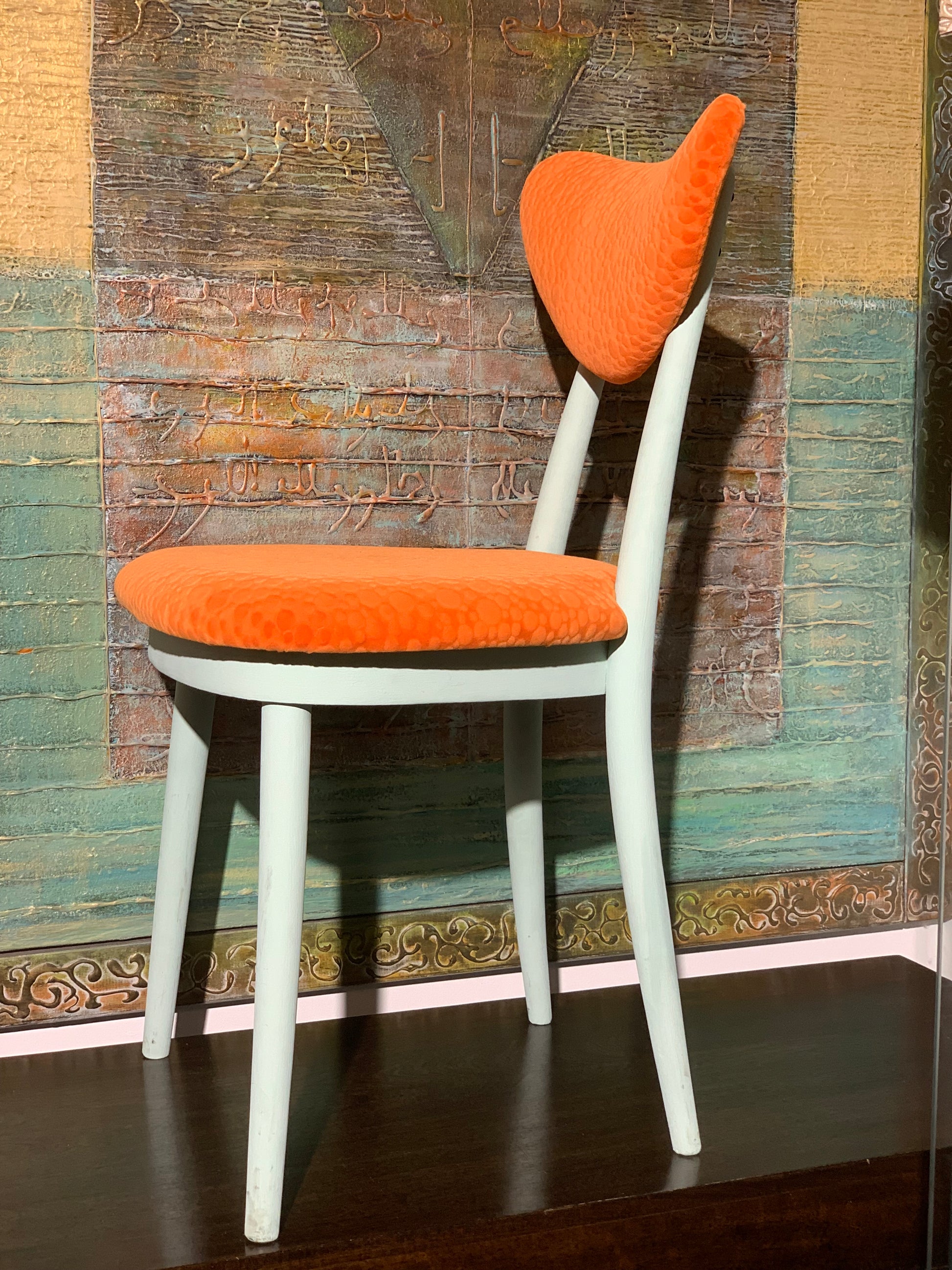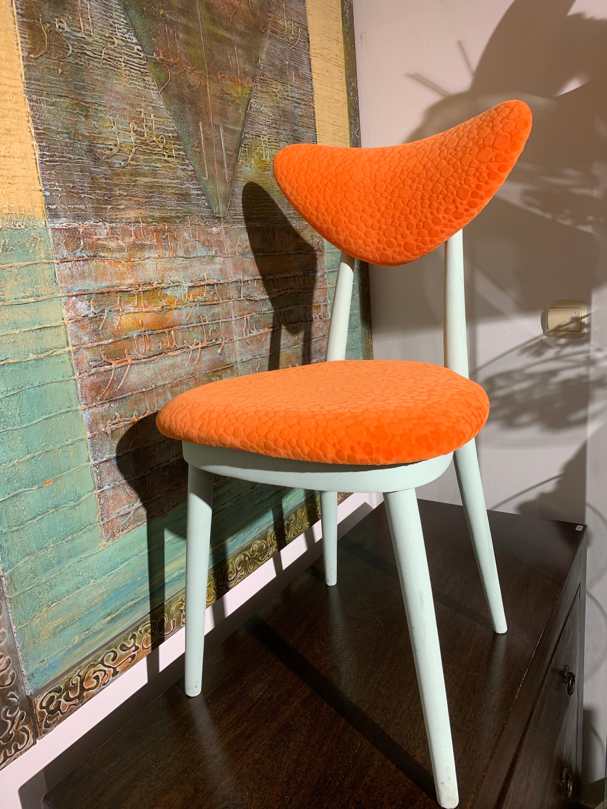 Kolekcjonerskie krzesło "serduszko" PRL z lat 60-ch po kompleksowej renowacji. Tapicerka w kolorze pomarańczowym. Stelaż - buczyna, w kolorze białym. W ofercie jest 2 krzesła - tapicerka w kolorze zielonym, jedno w kolorze szarym.