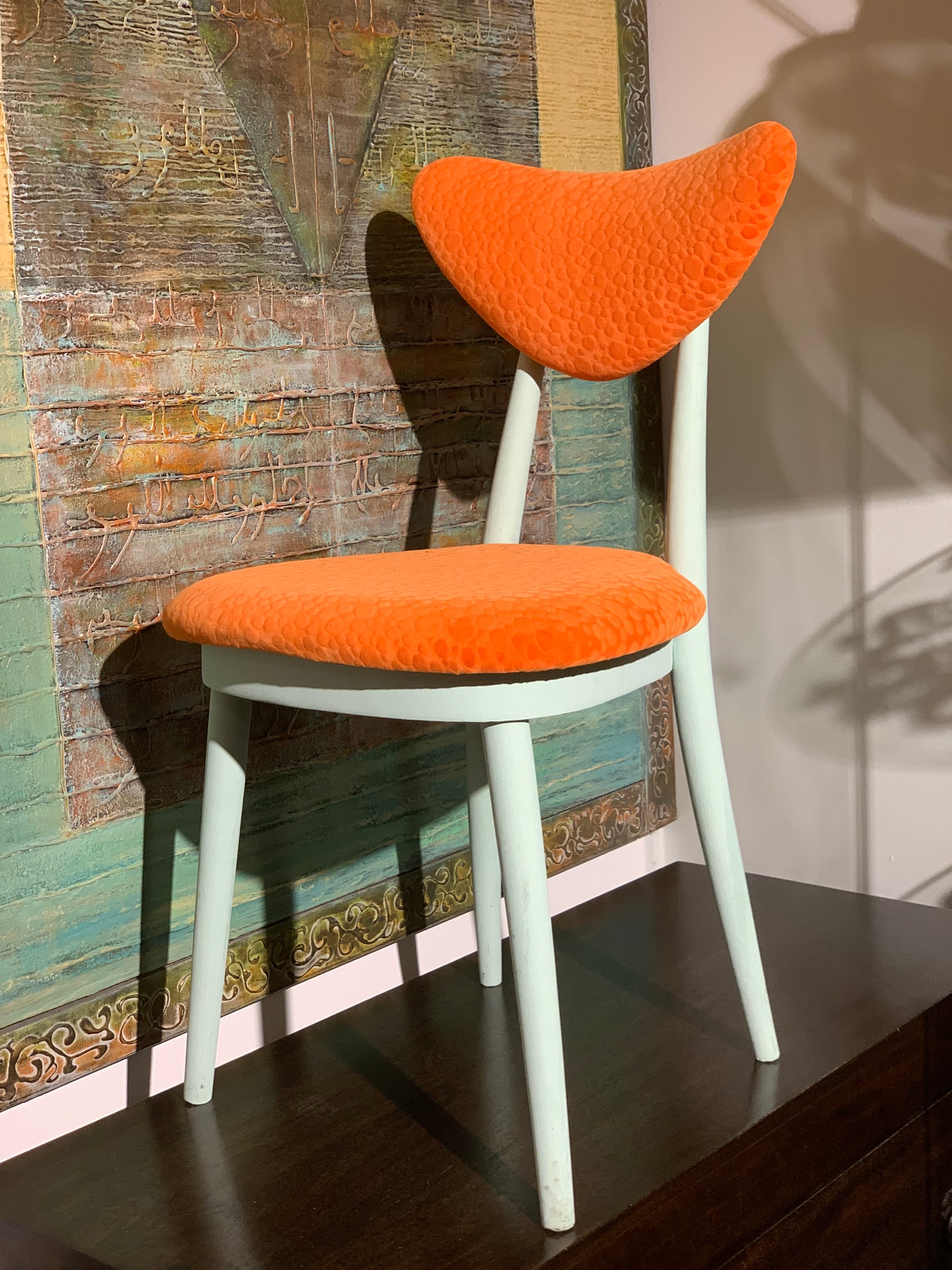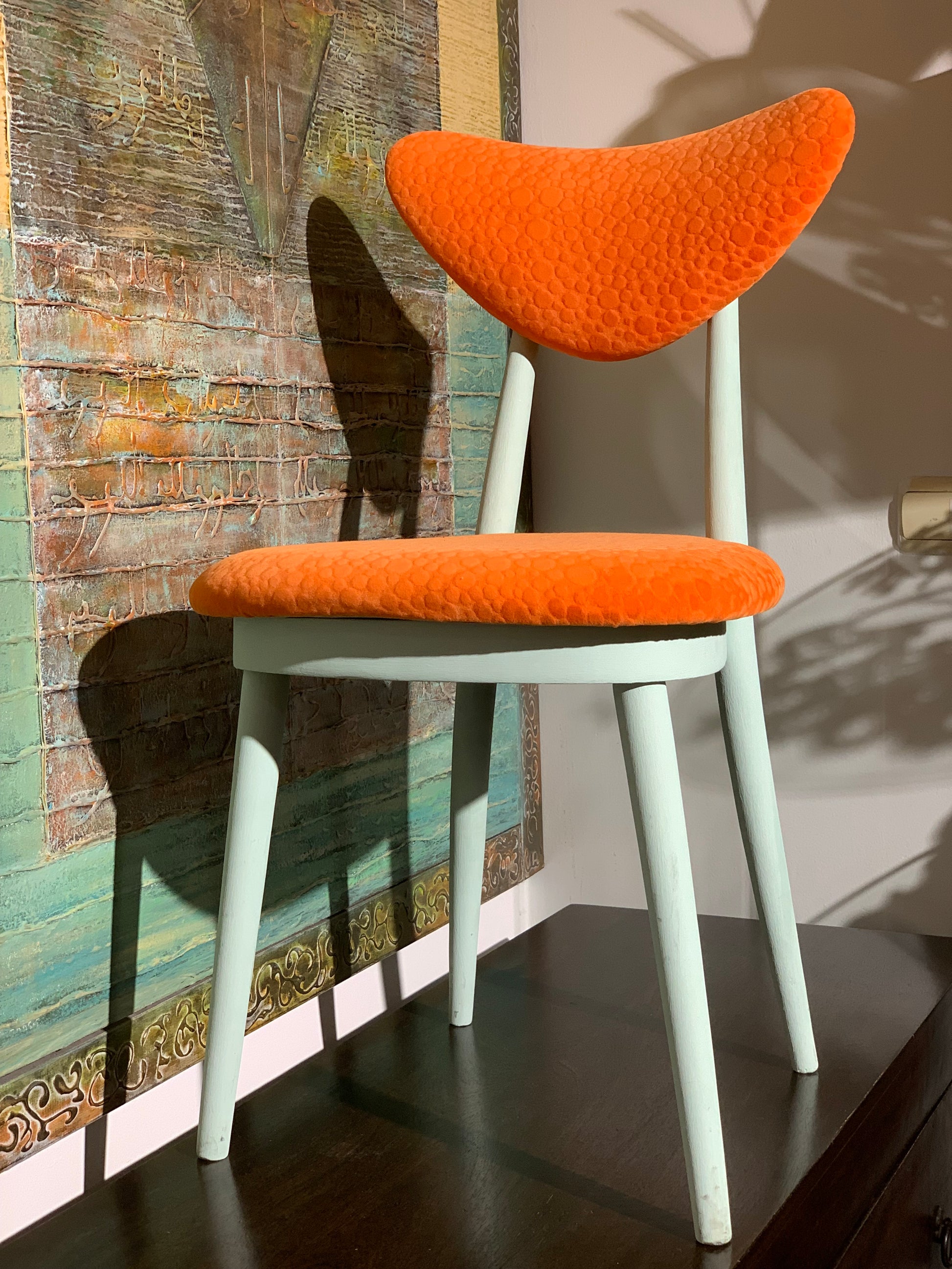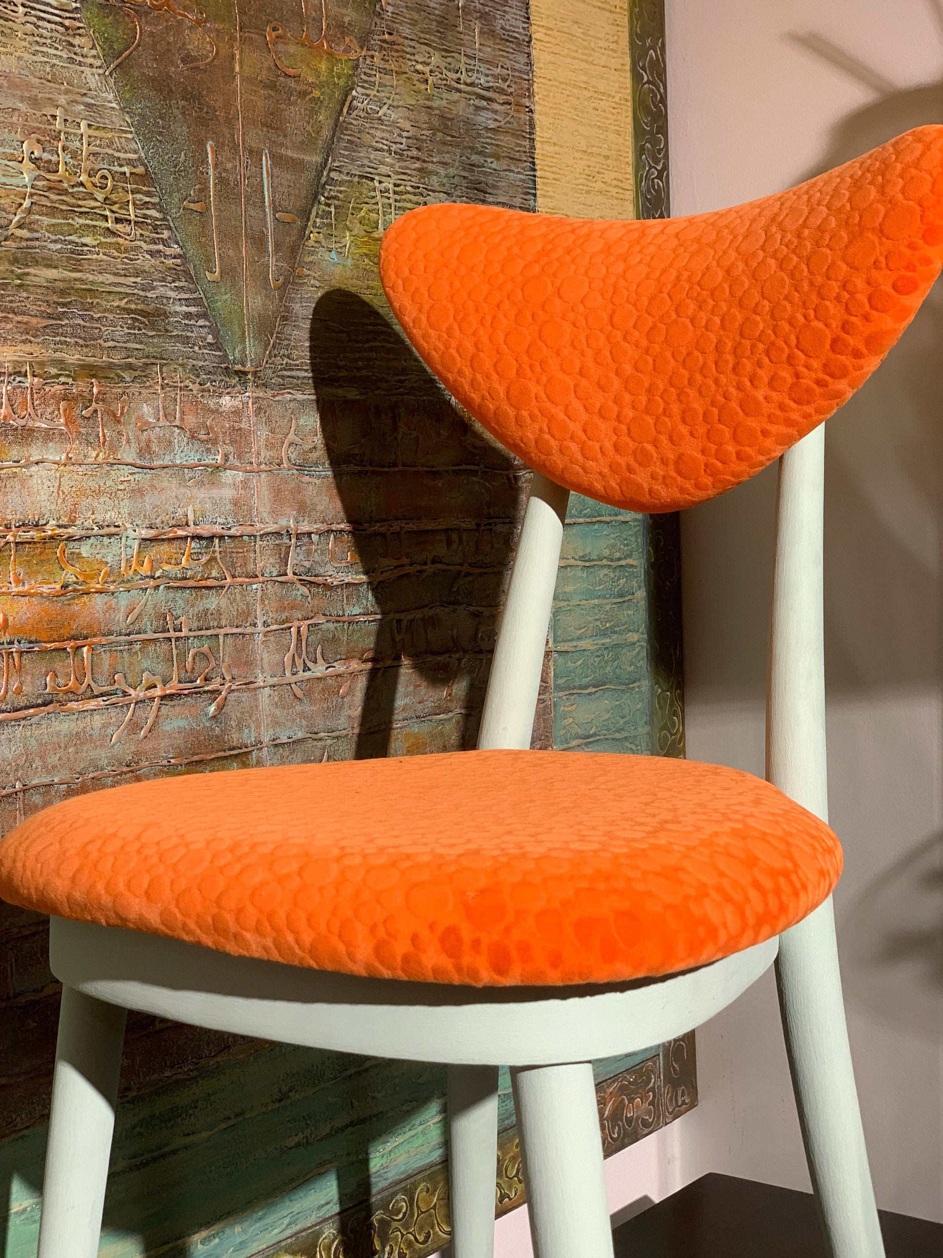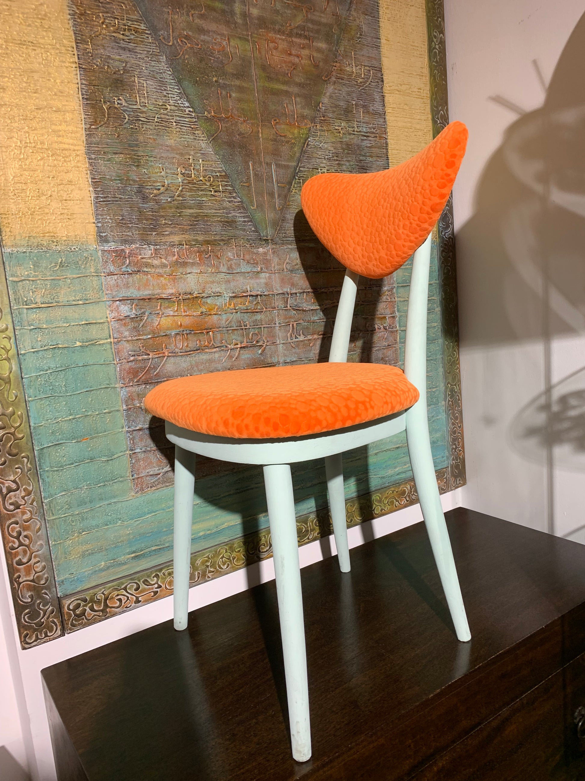 Kolekcjonerskie krzesło "serduszko" PRL z lat 60-ch po kompleksowej renowacji. Tapicerka w kolorze pomarańczowym. Stelaż - buczyna, w kolorze białym. W ofercie jest 2 krzesła - tapicerka w kolorze zielonym, jedno w kolorze szarym.