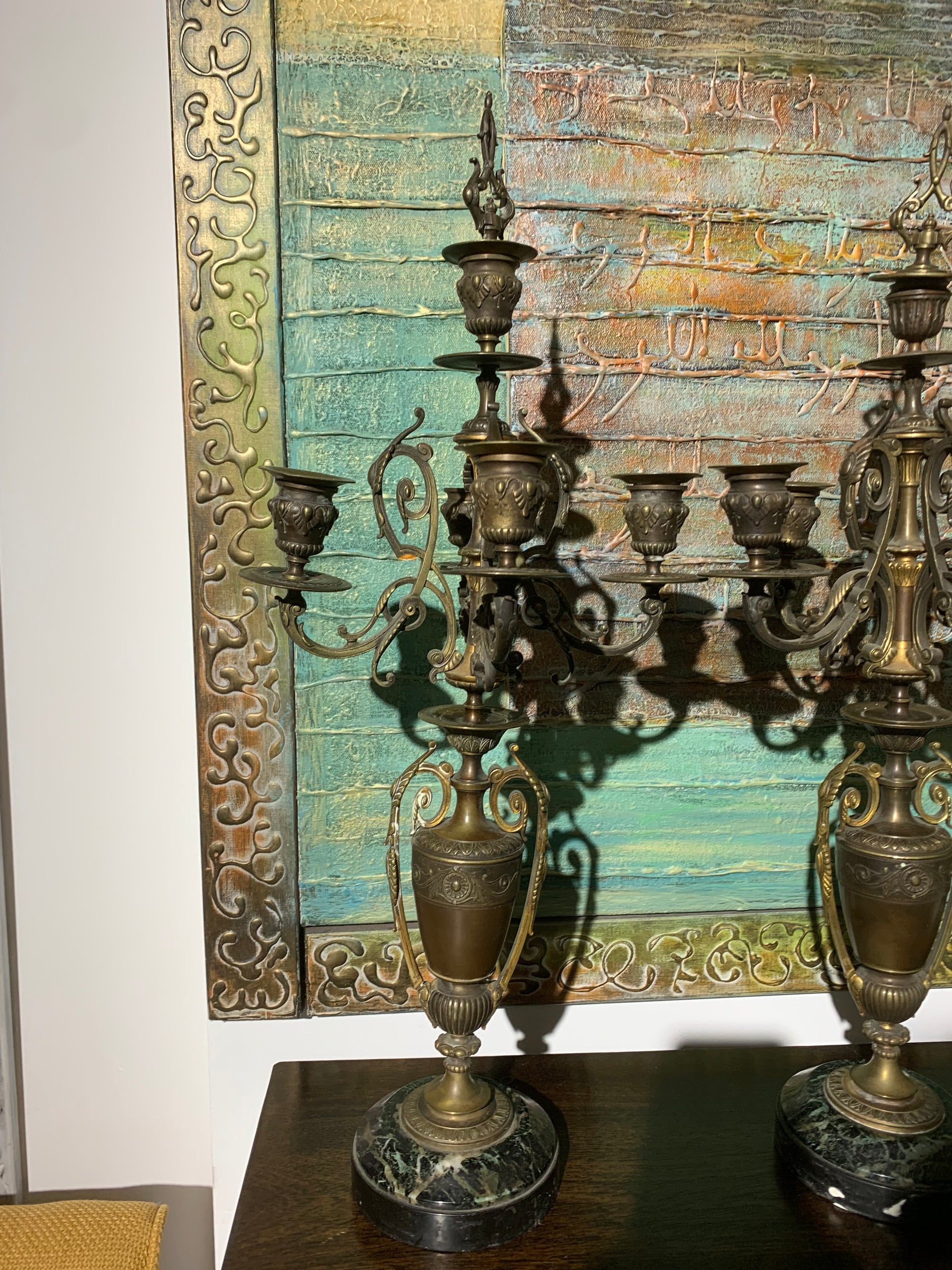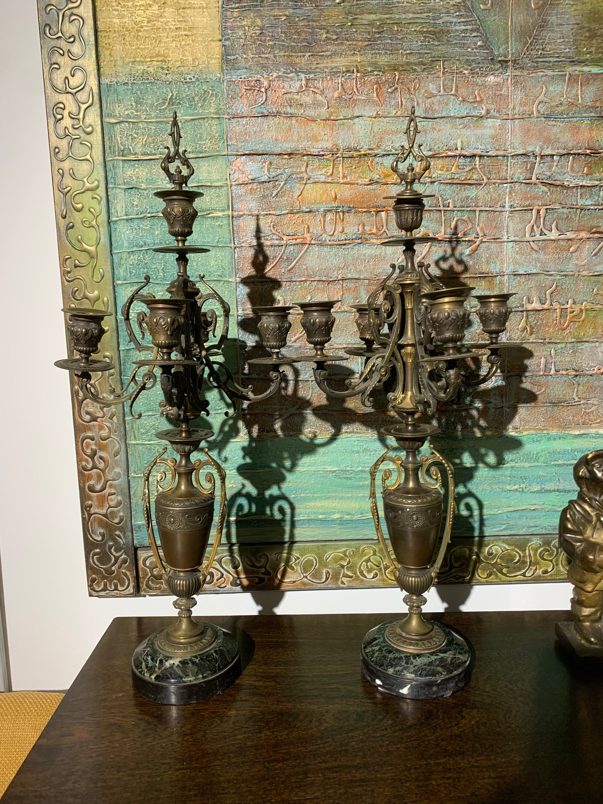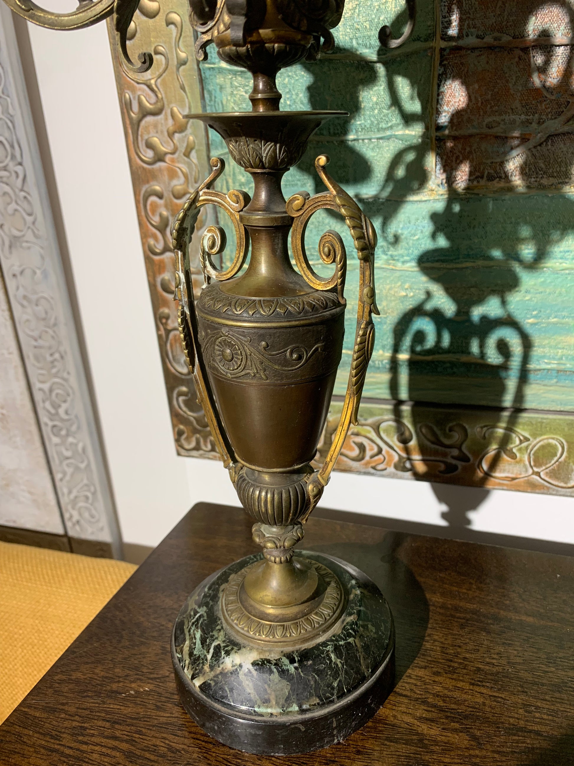 Kandelabry, dwa świeczniki na marmurowych podstawach, pięknie zdobione motywem roślinnym, styl secesja, garnitur kominkowy z brązu, Francja. Sprzedawane tylko w komplecie (dwa świeczniki).