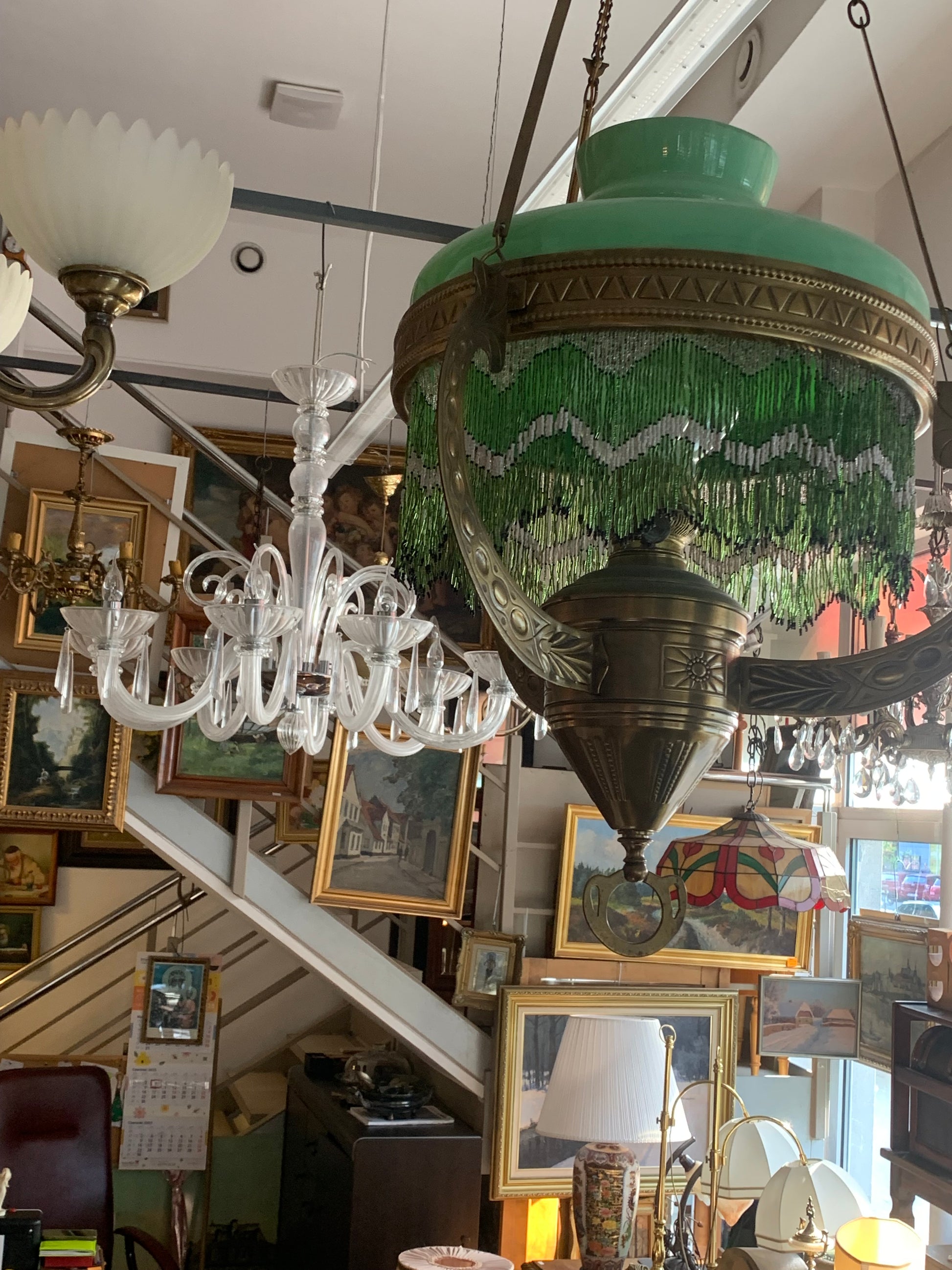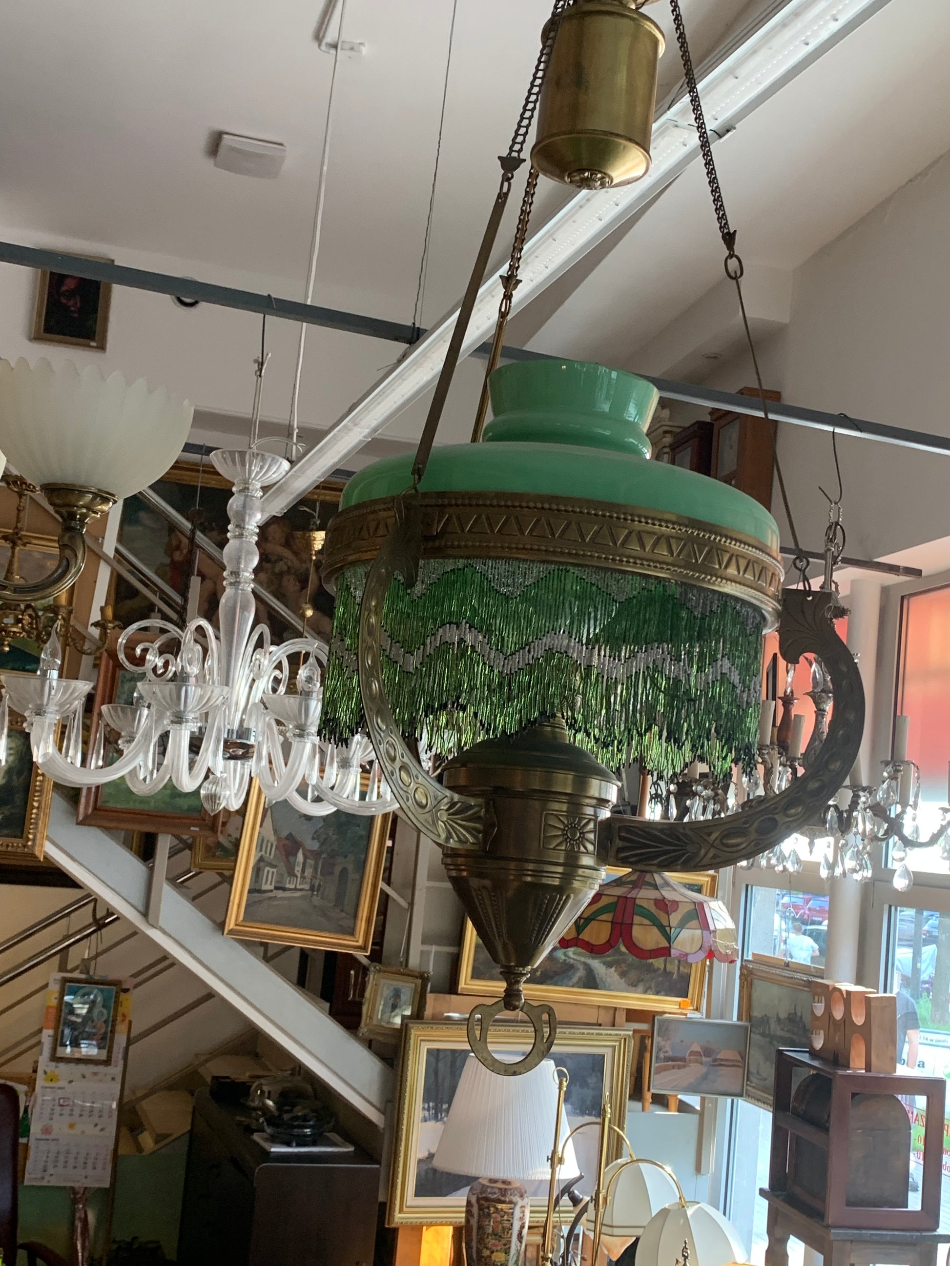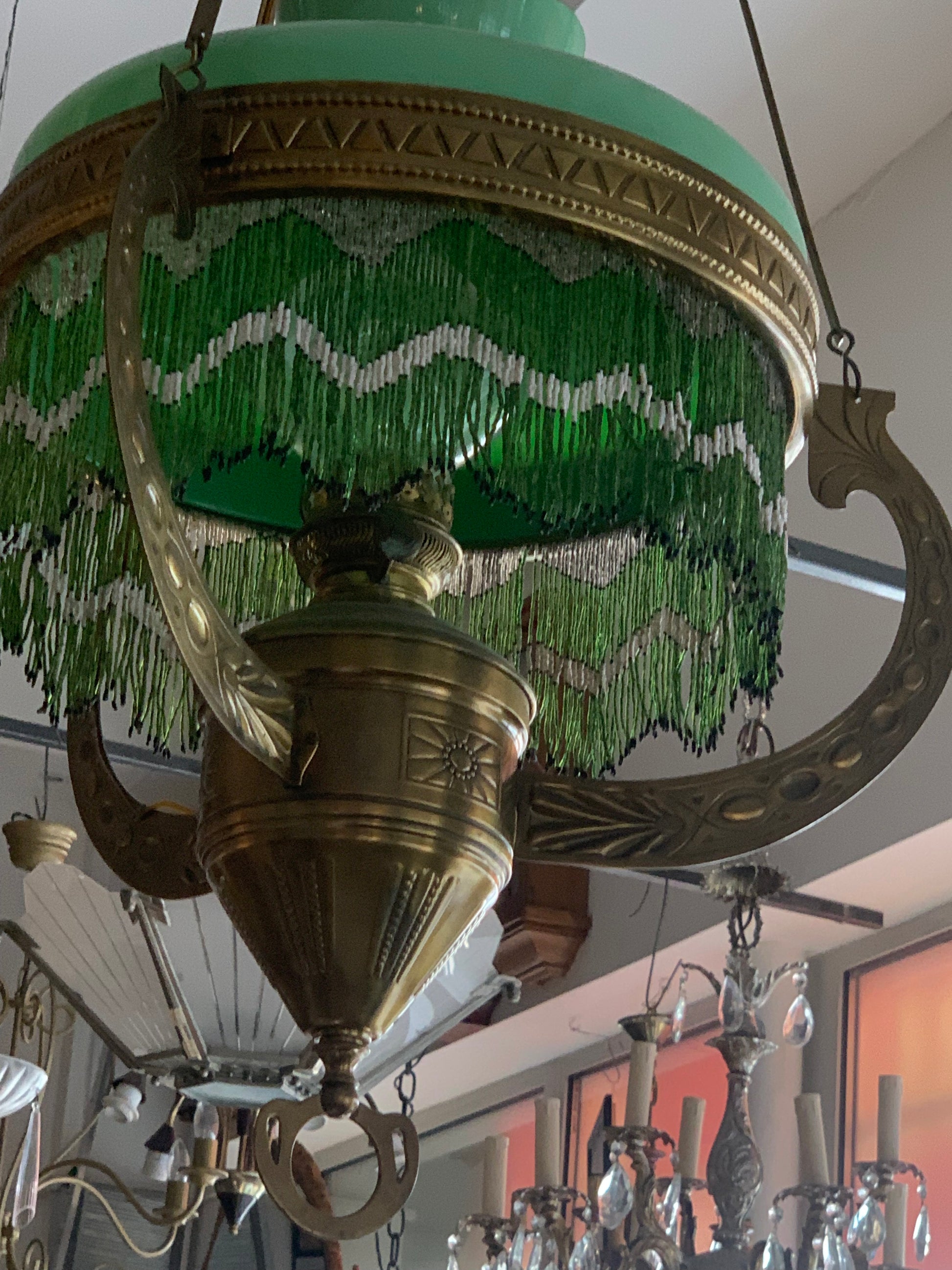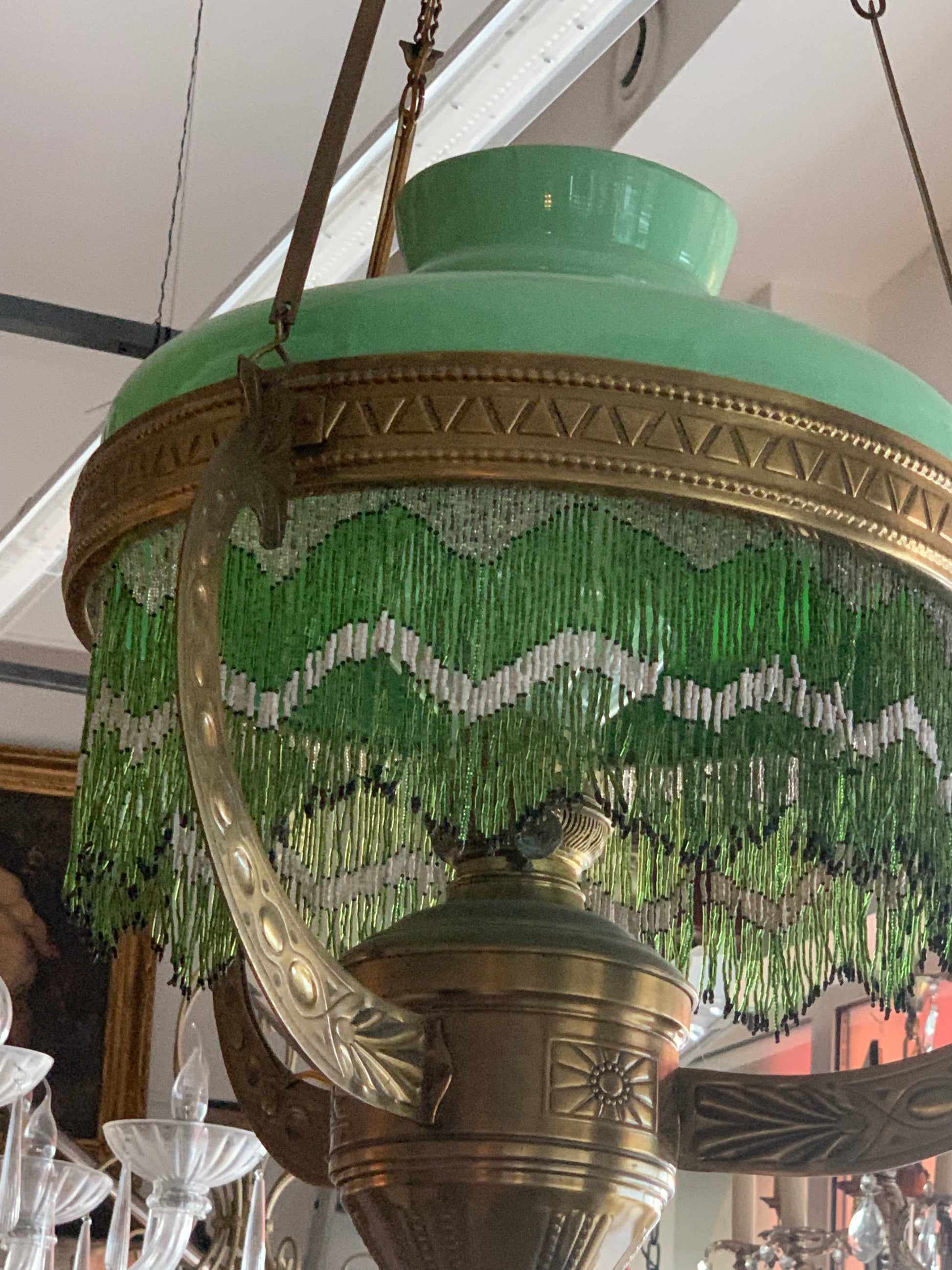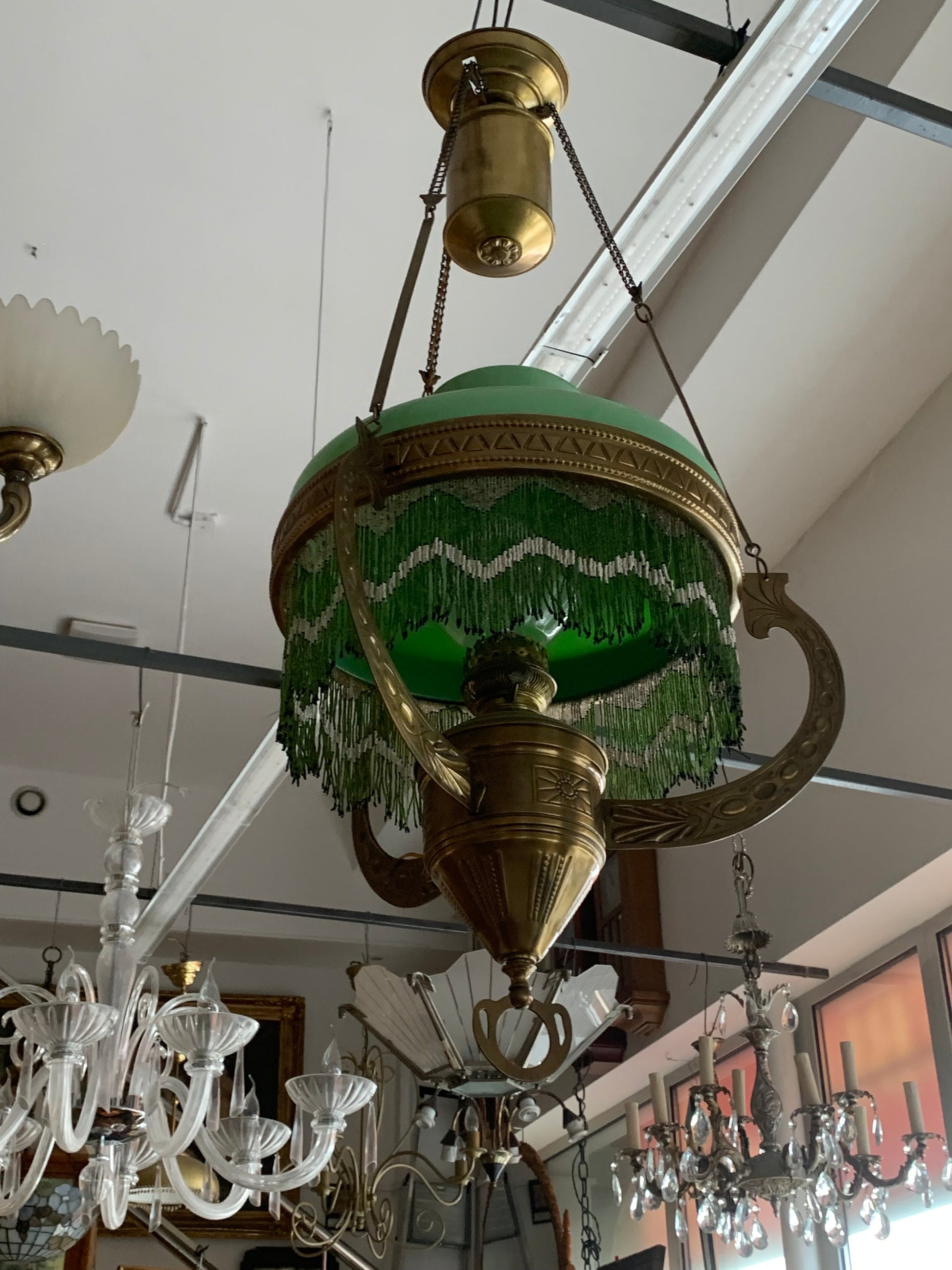 Lampa antyczna, naftowa, XIX wiek, mosiądz, oryginalny, szklany klosz w zielonym kolorze, zawieszony na trzech mosiężnych łańcuchach, przerobiona na elektryczną. Stan: sprawna, bardzo dobry.
