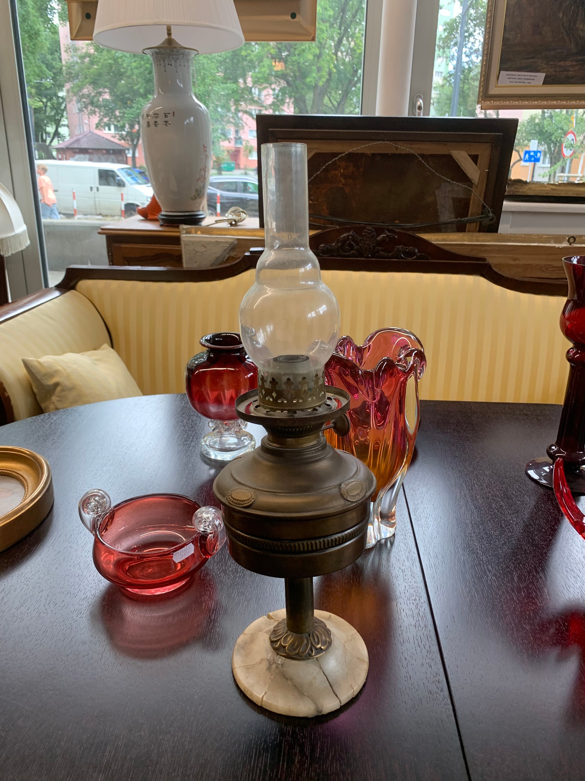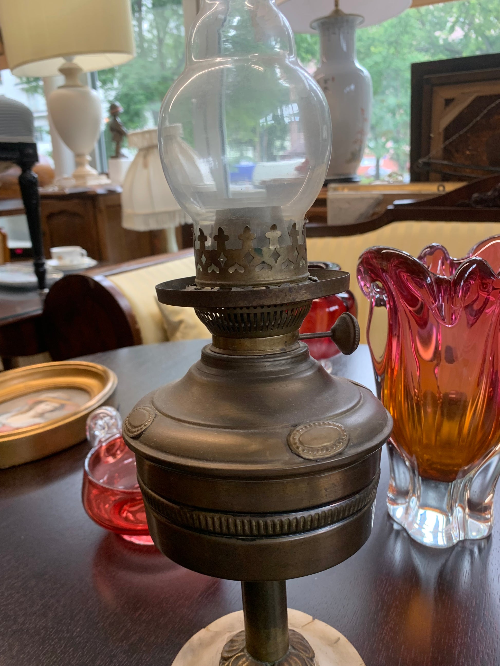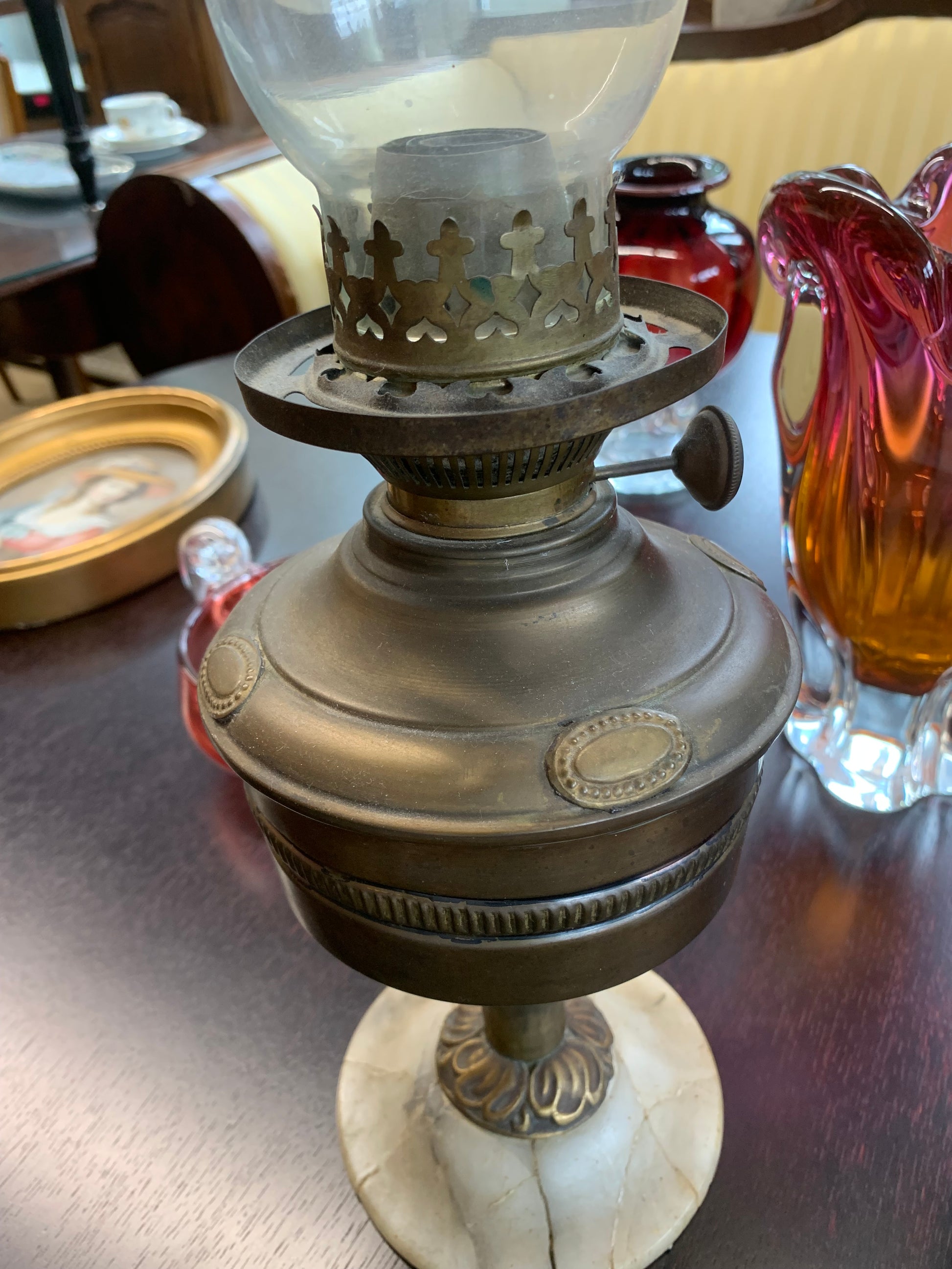 Lampa naftowa, mosiężna, starodawna. Podstawa z onyksu potrzaskana i sklejona. Stan: sprawna.