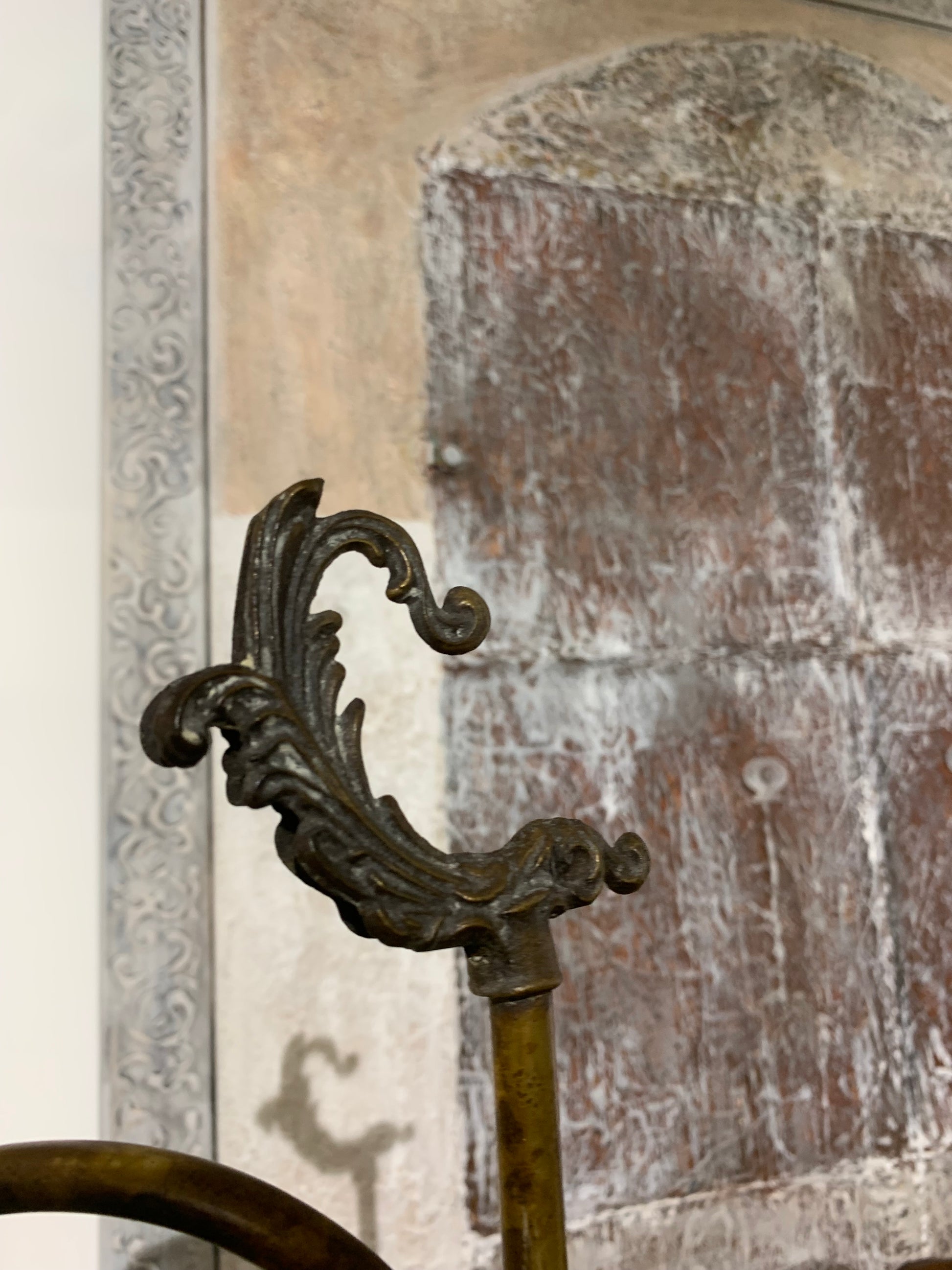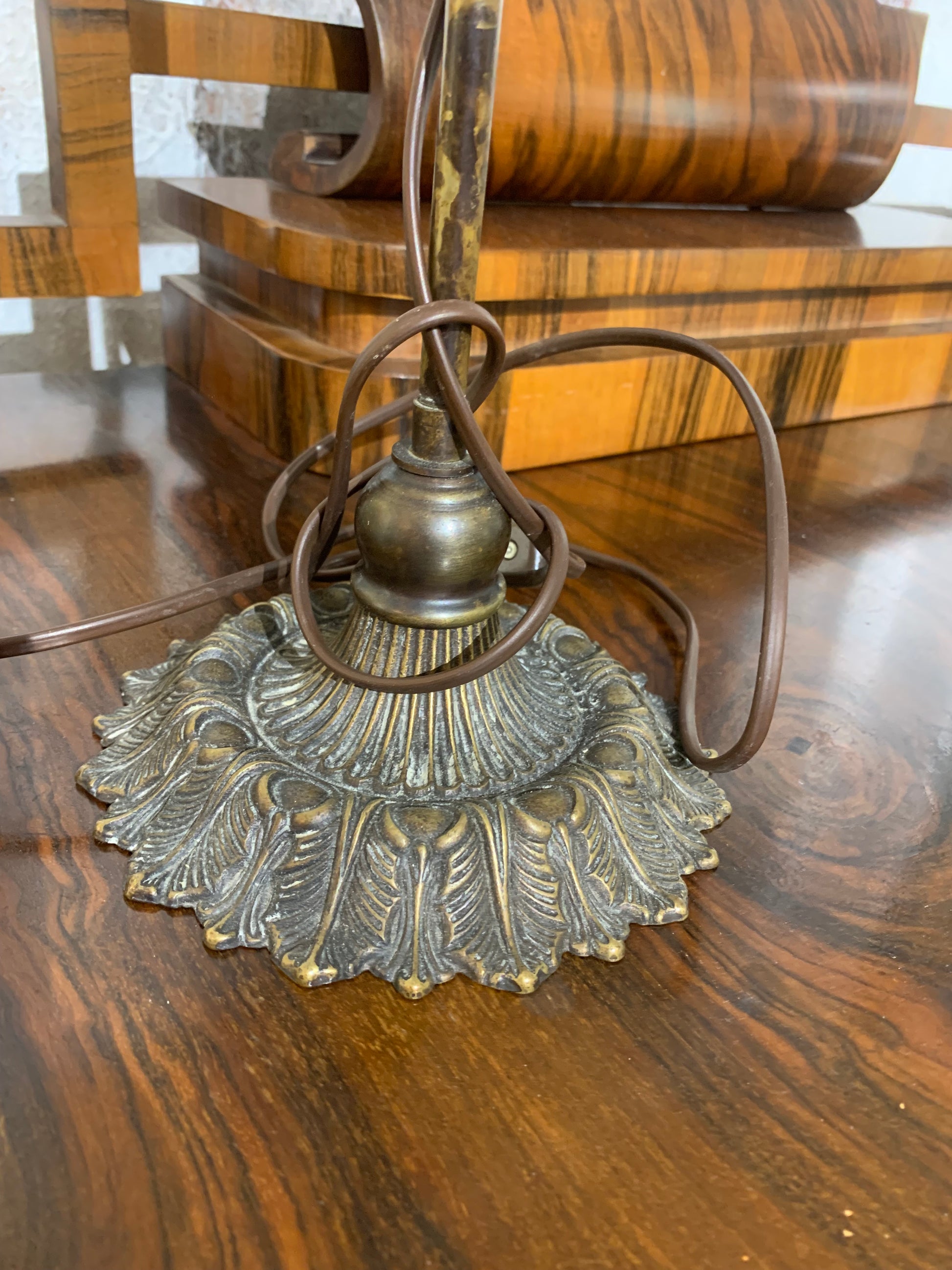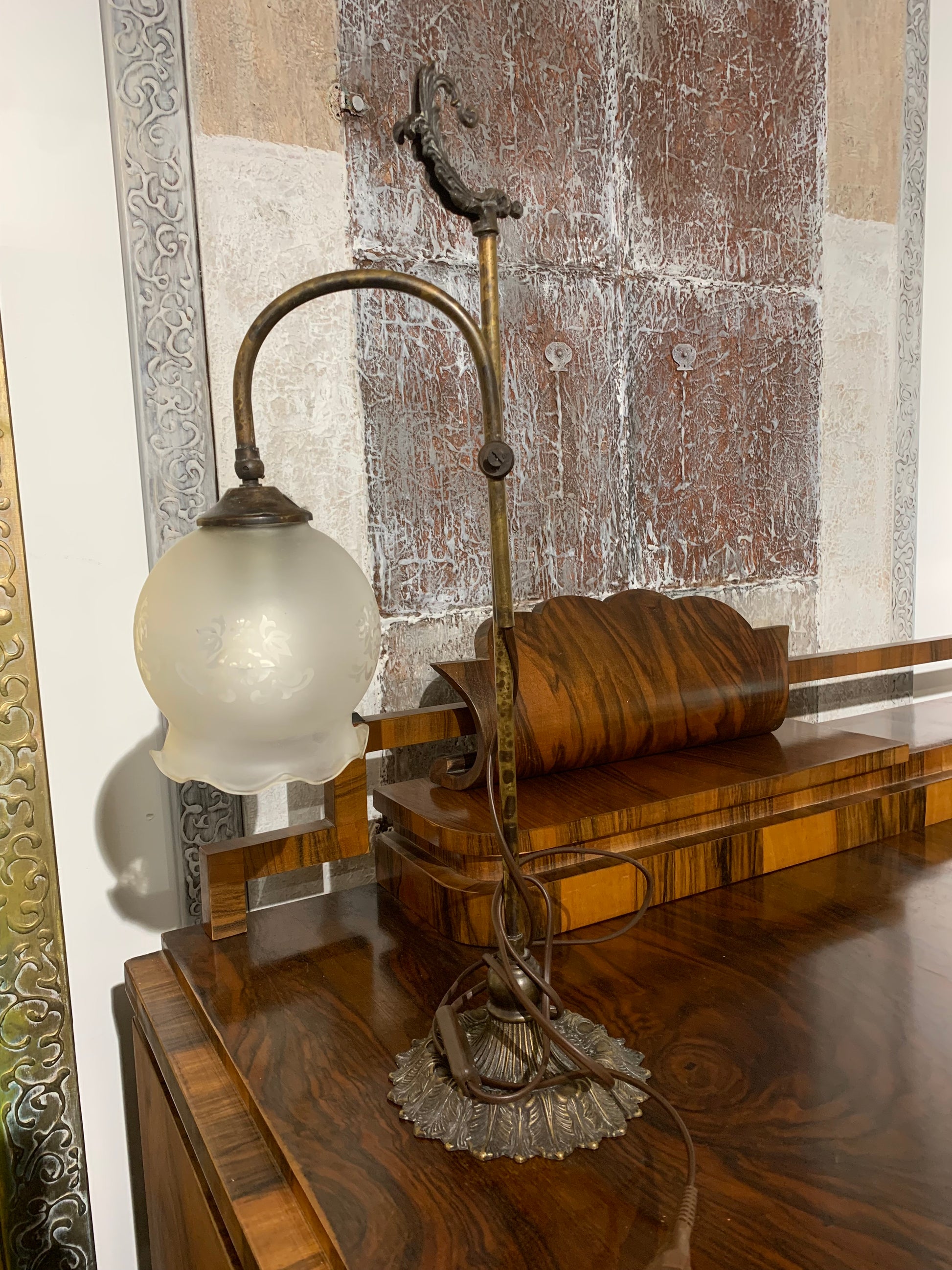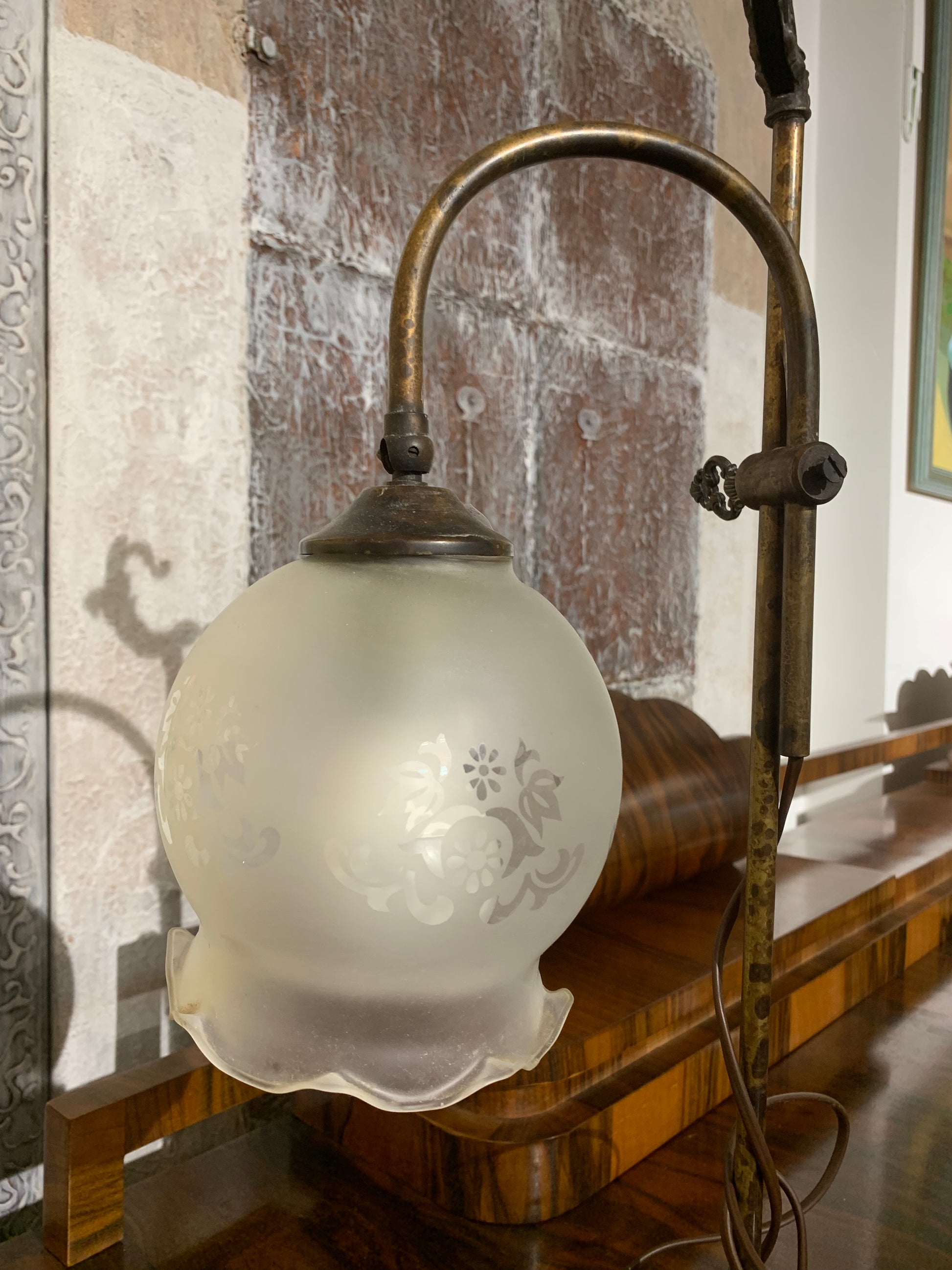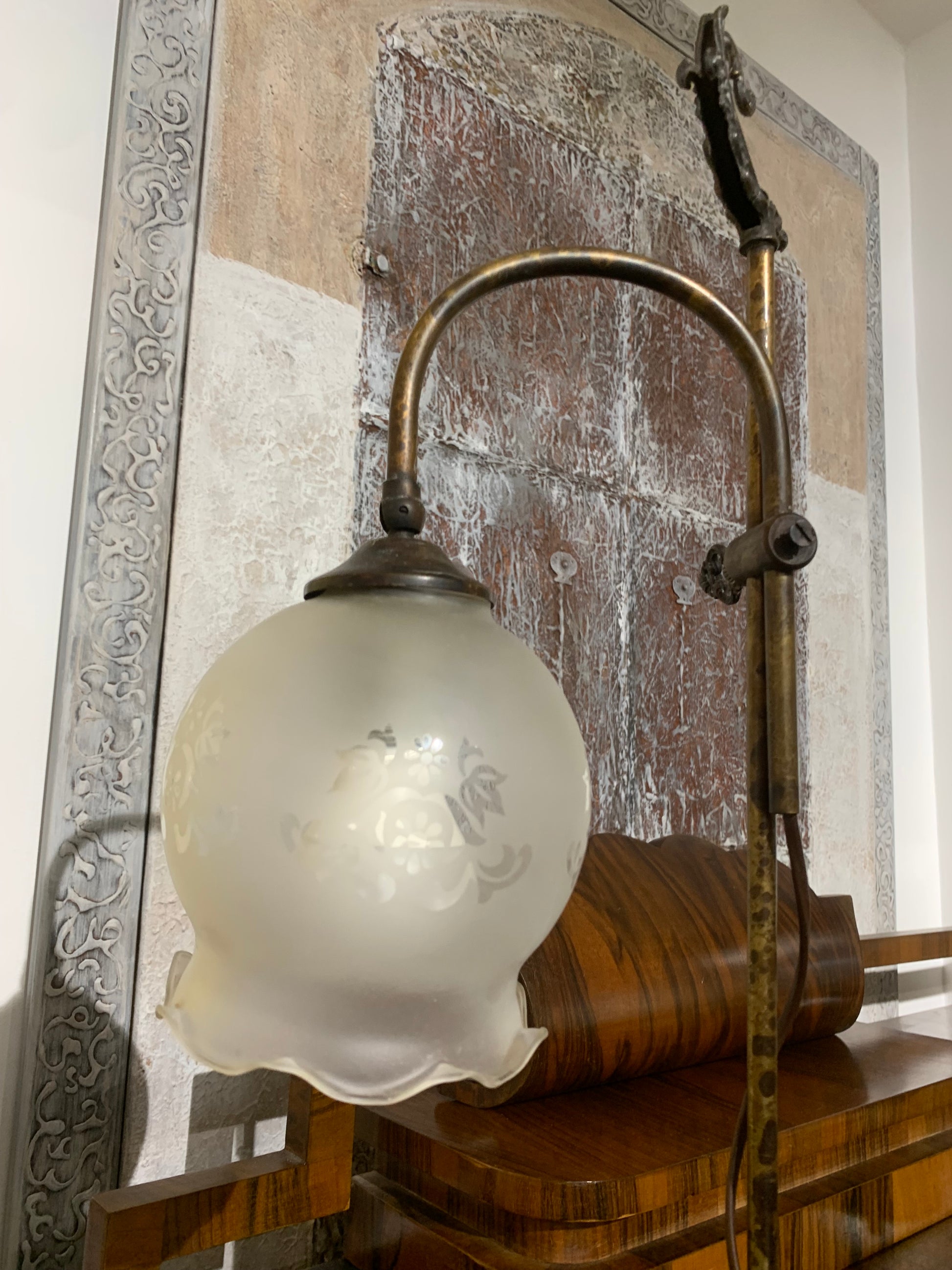 Antyczna lampa secesyjna, z mosiądzu, ze szklanym kloszem w kształcie dzwonka. Sprawna, stan dobry. Możliwość regulacji wysokości.