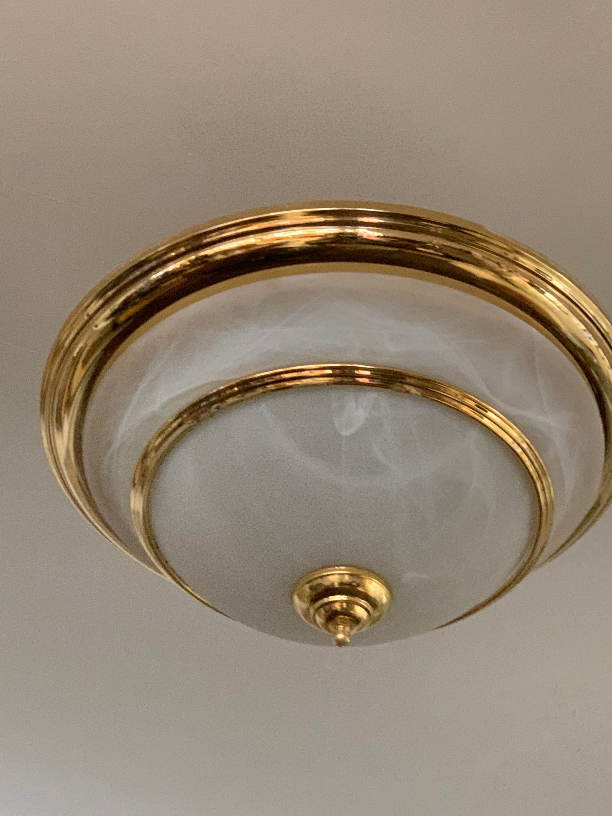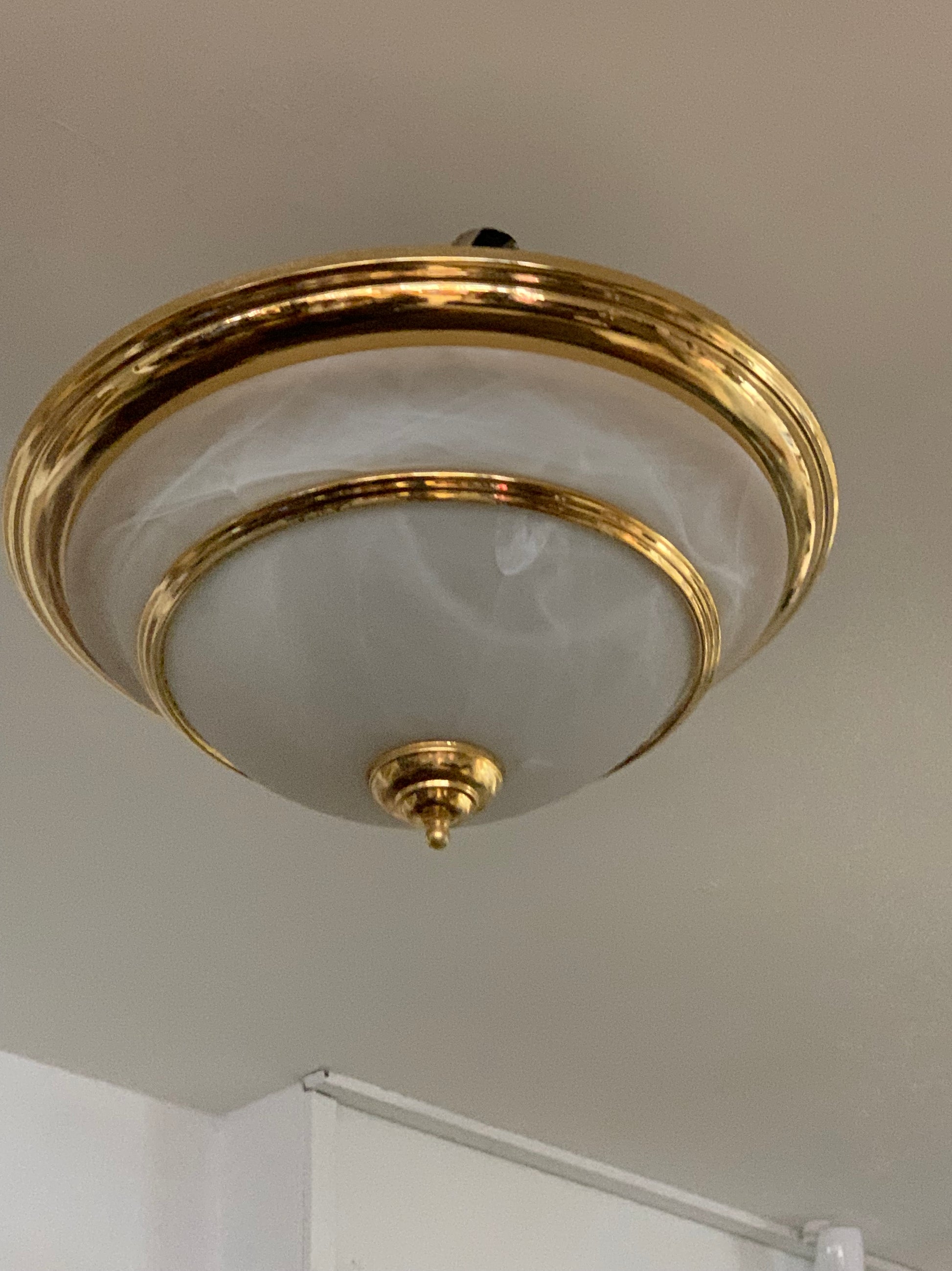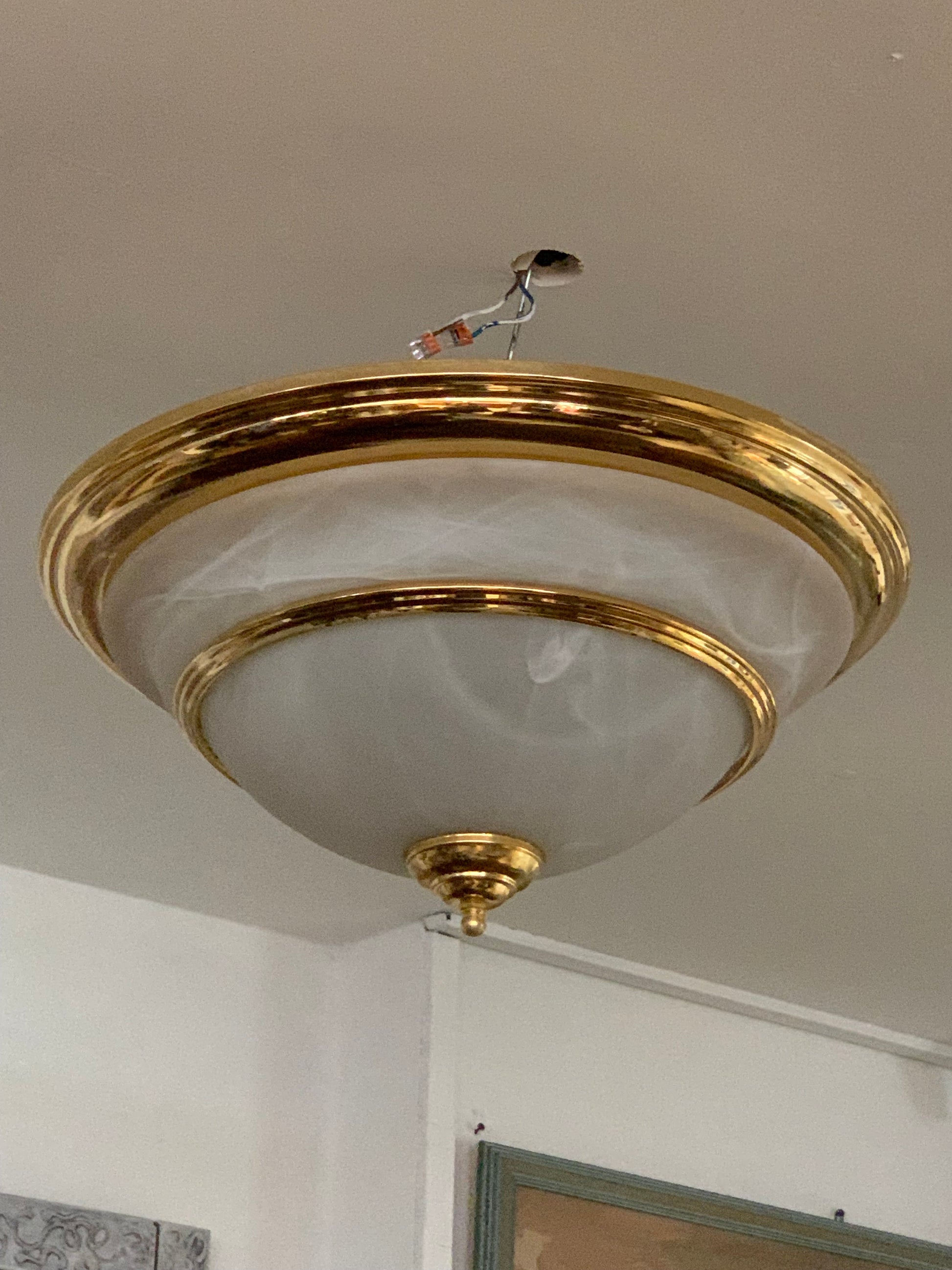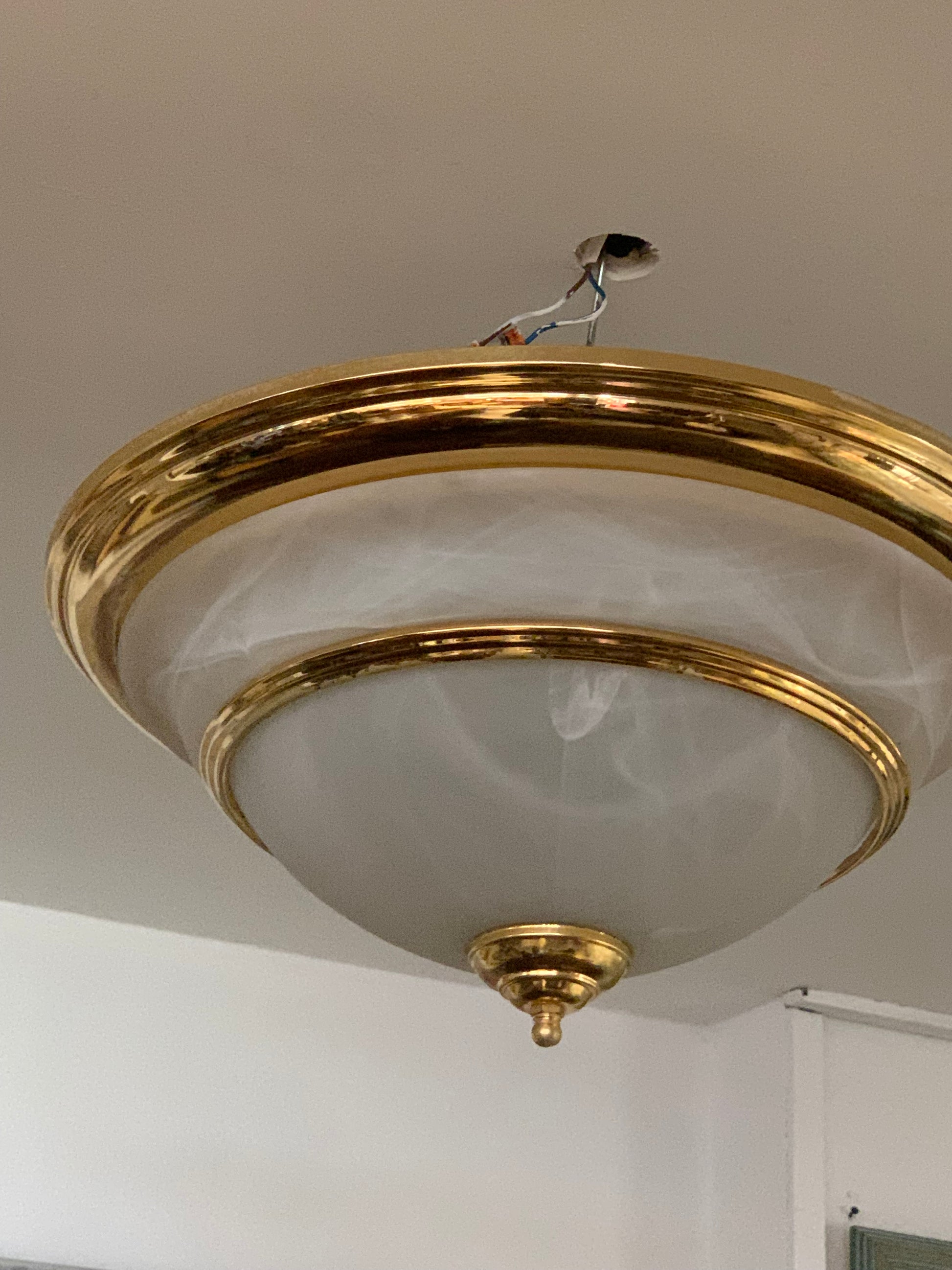 Lampa sufitowa, Plafon, Orion, matowe opalowe szkło, złota, sprawna.