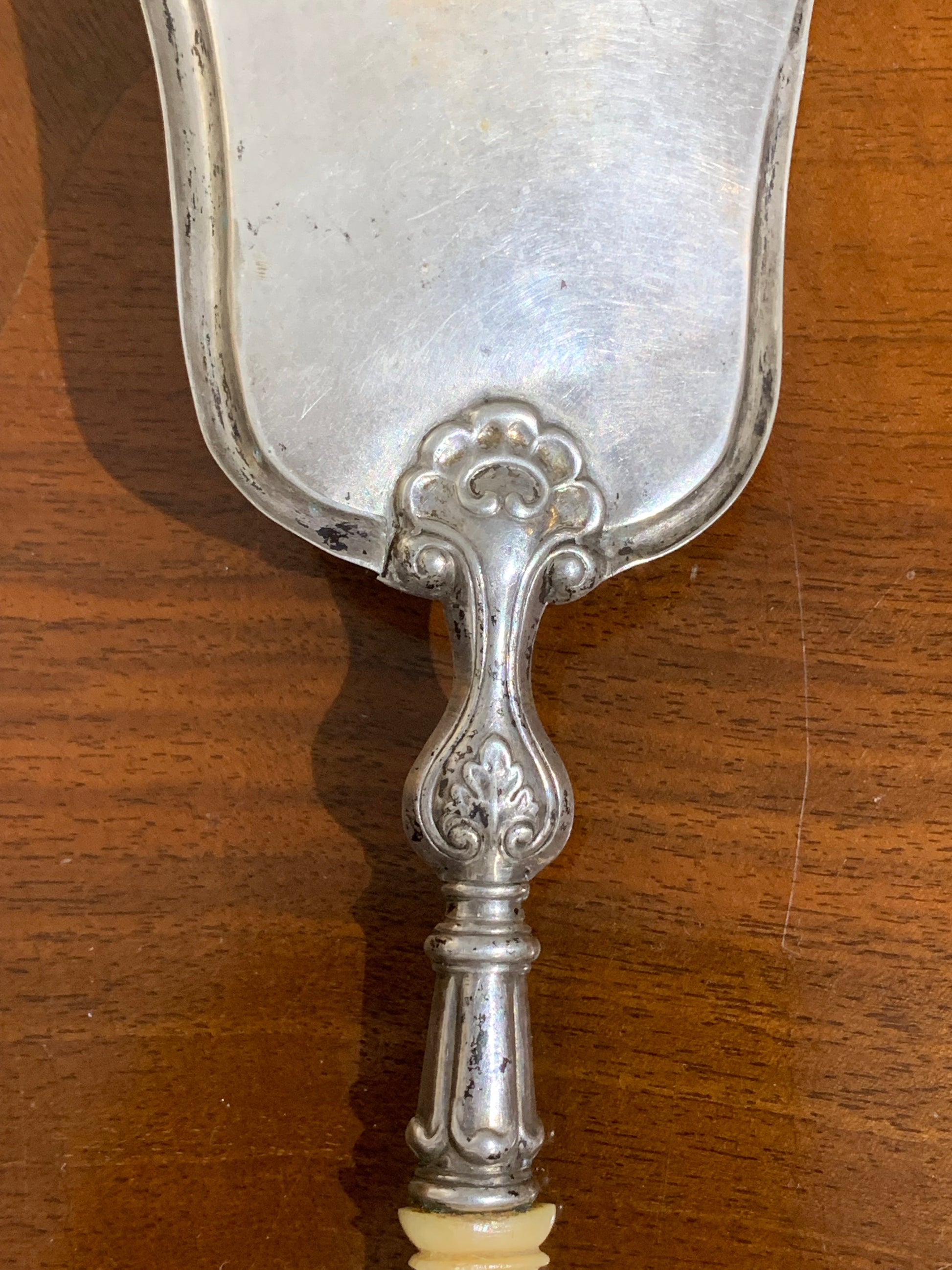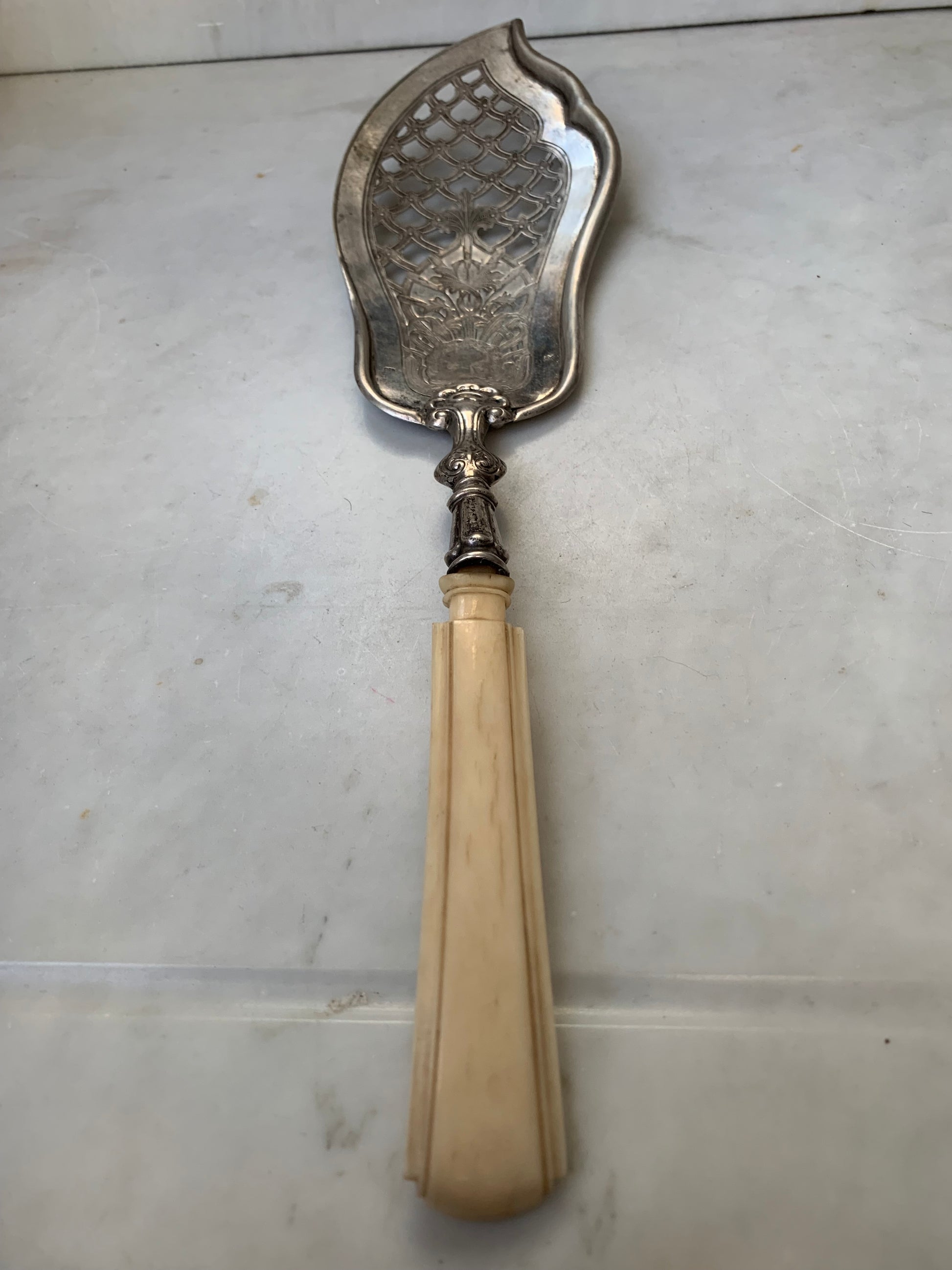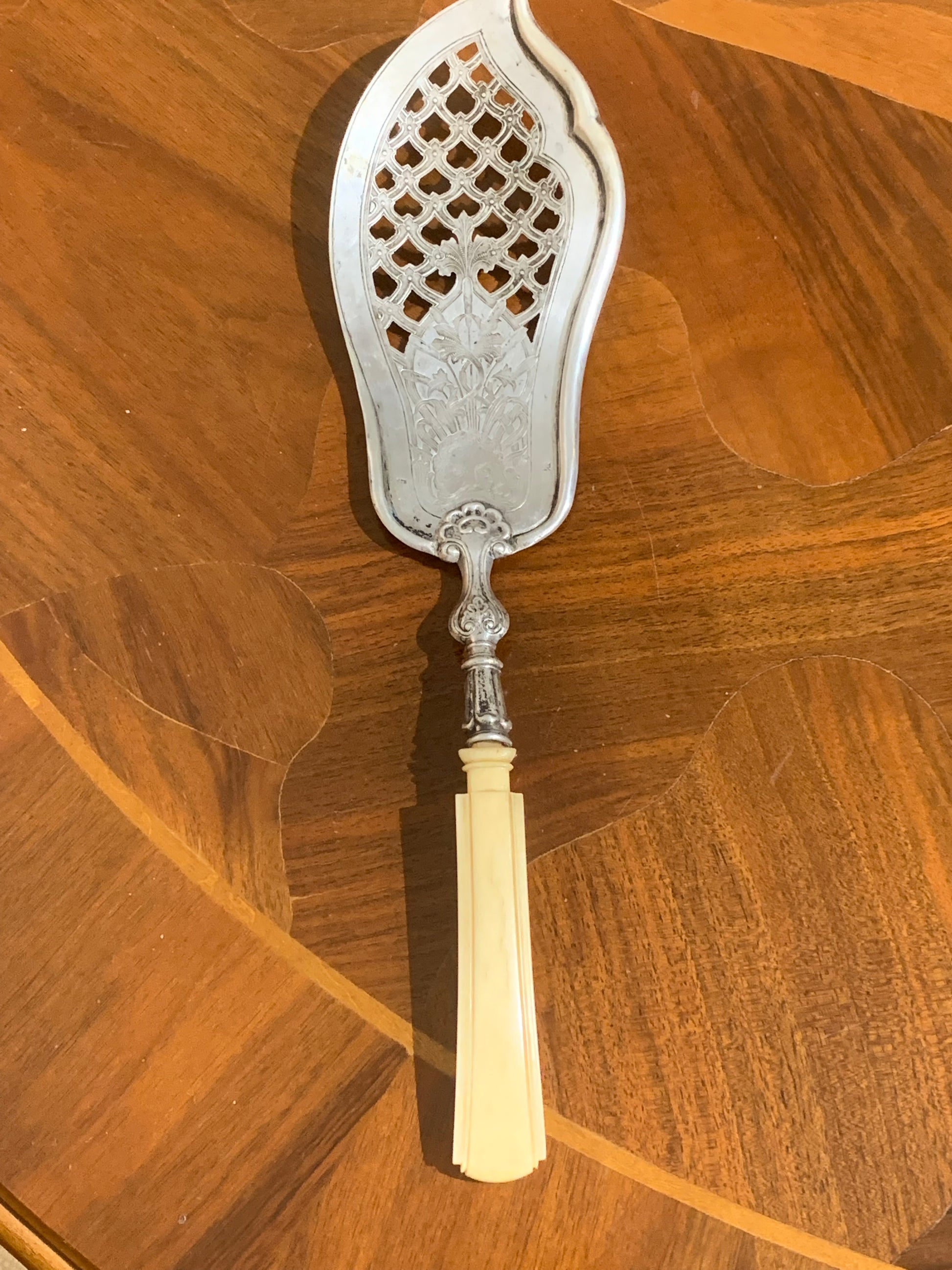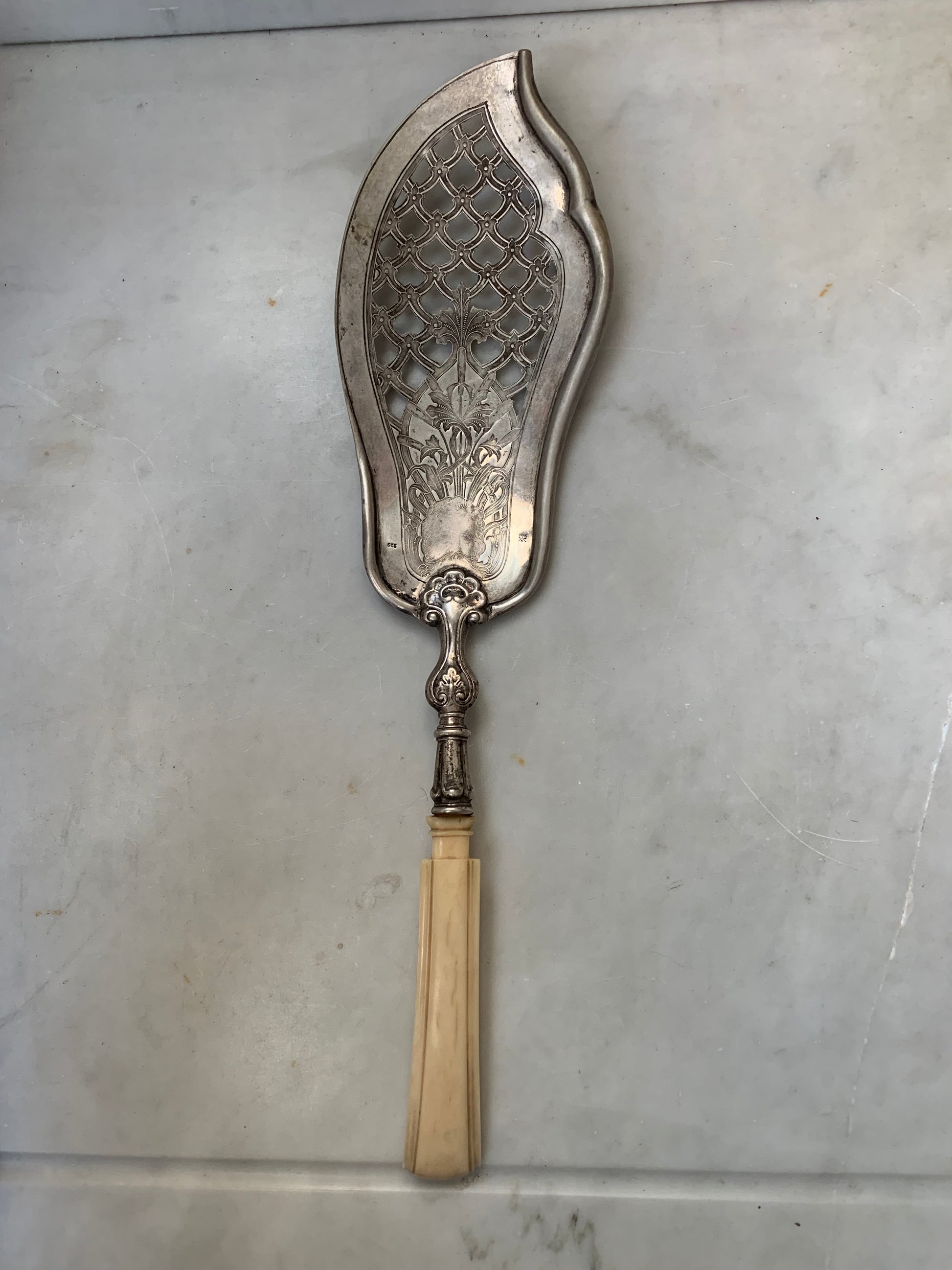 Łopatka srebrna do serwowania ryb secesyjna, 20-te lata XX w. Próba srebra 625, punca dwie skrzyżowane flagi i duże litery GK. Piękny, ażurowy, secesyjnjy wzór z motywem roślinnym, uchwyt z kości.