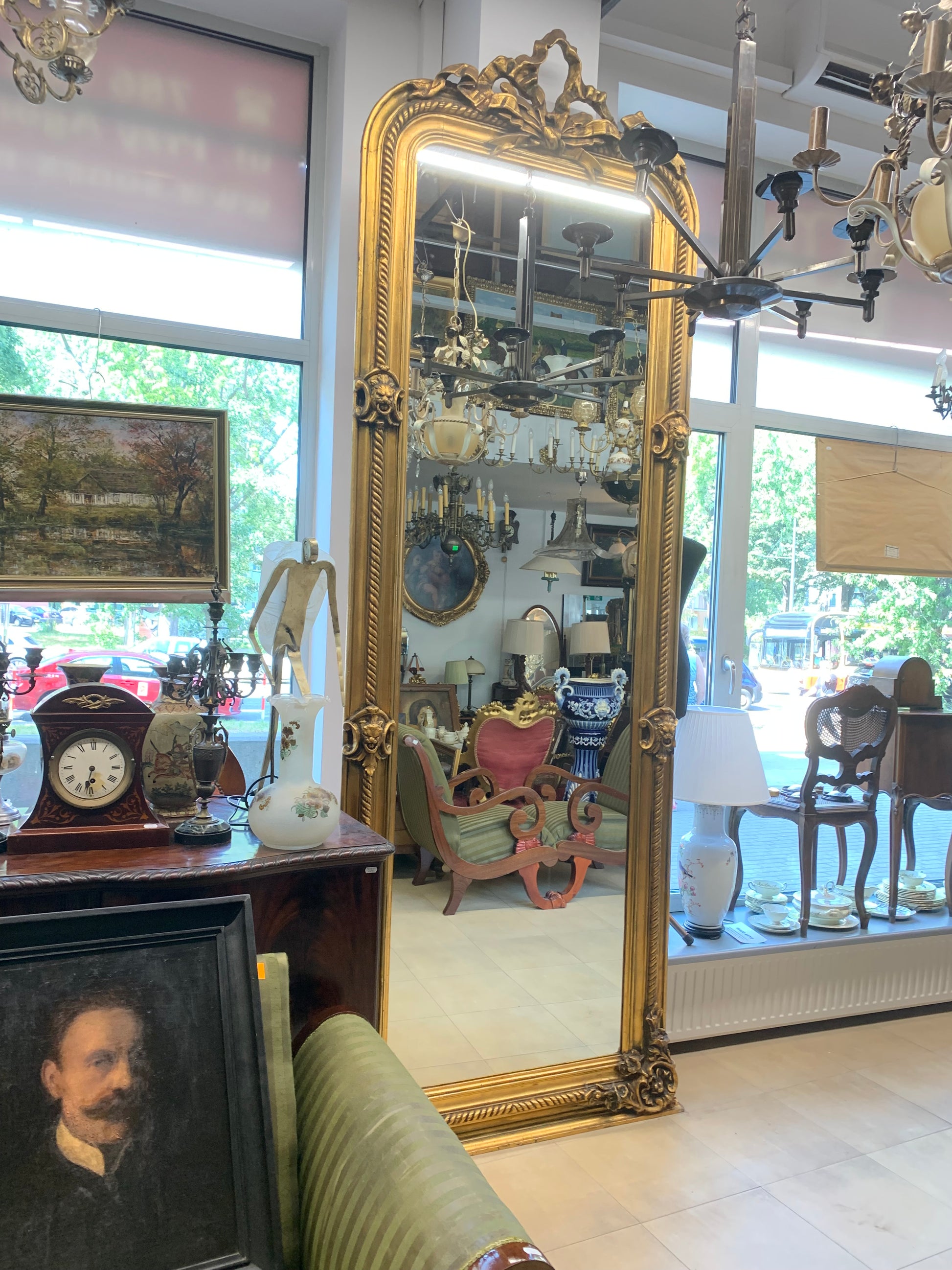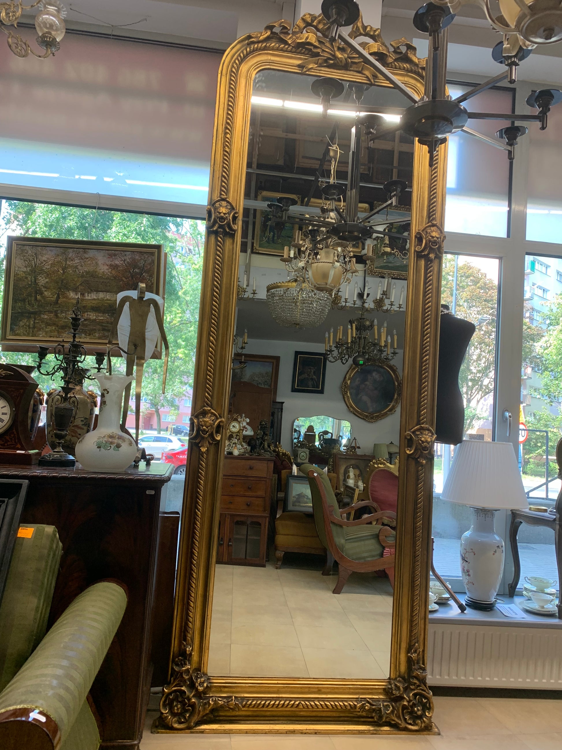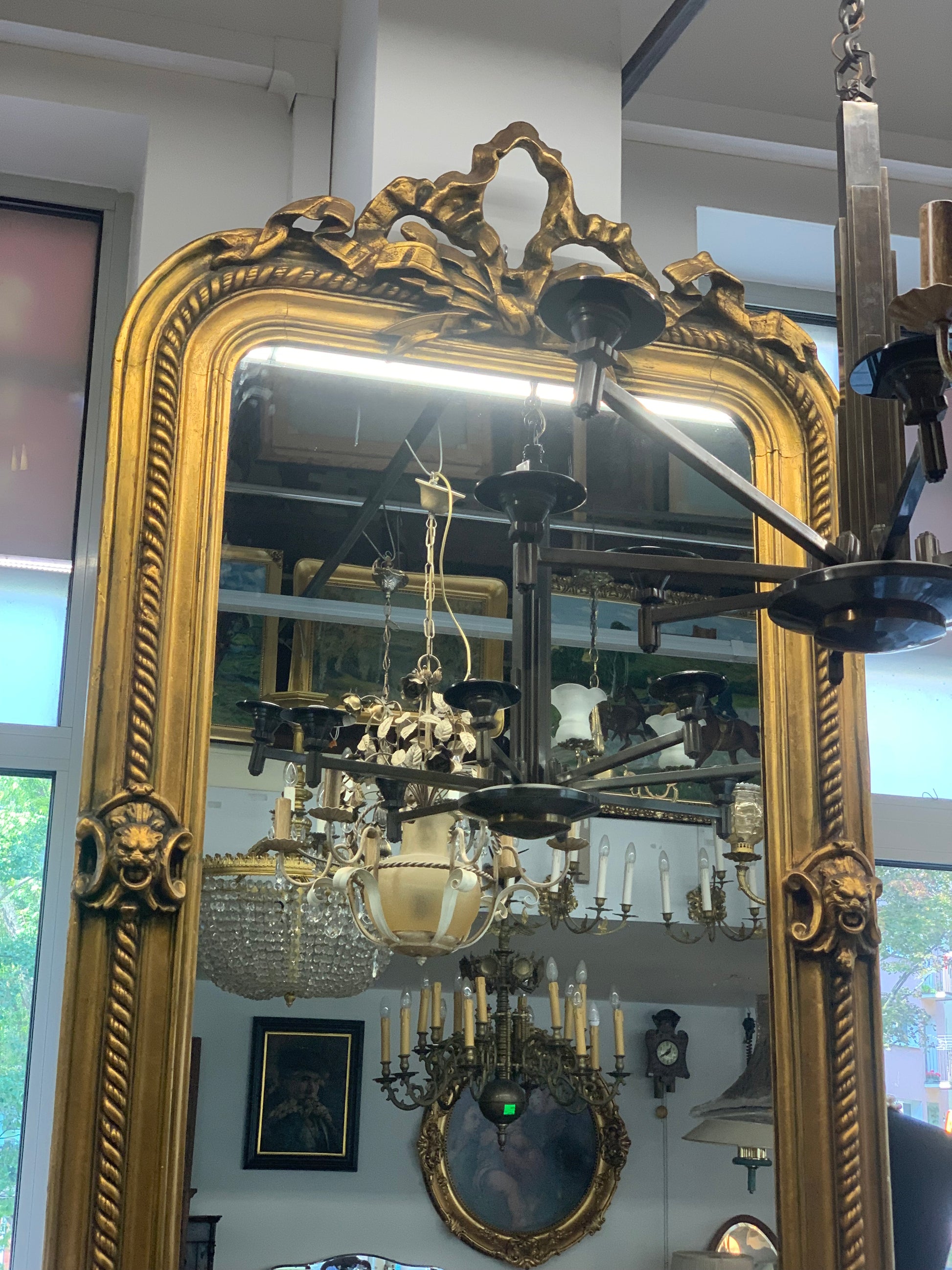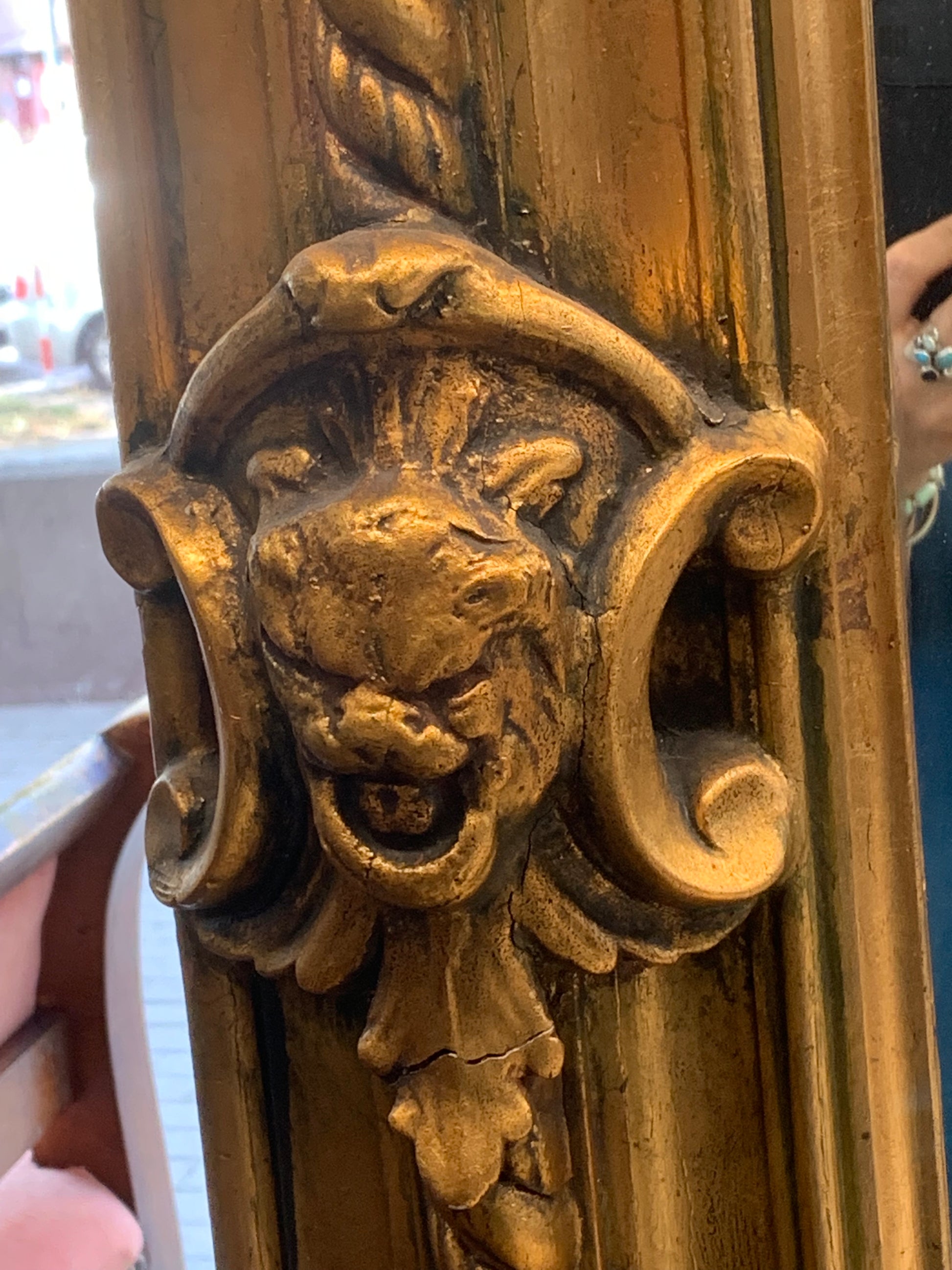 Duże lustro pałacowe, francuskie z kokardą i głowami lwa na złoconej ramie. Efektowne dopełnienie do dużego salonu. Stan lustra bardzo dobry.