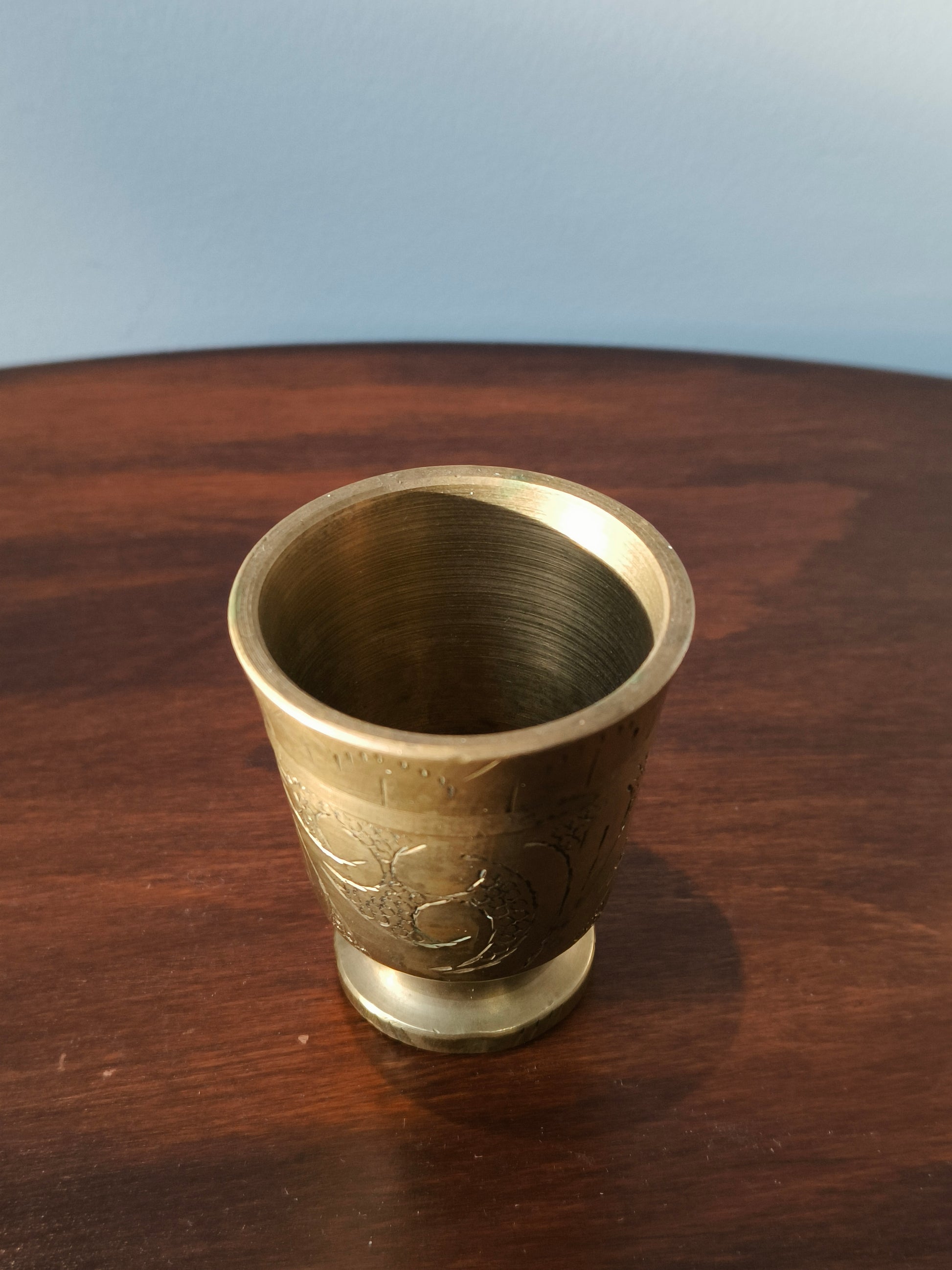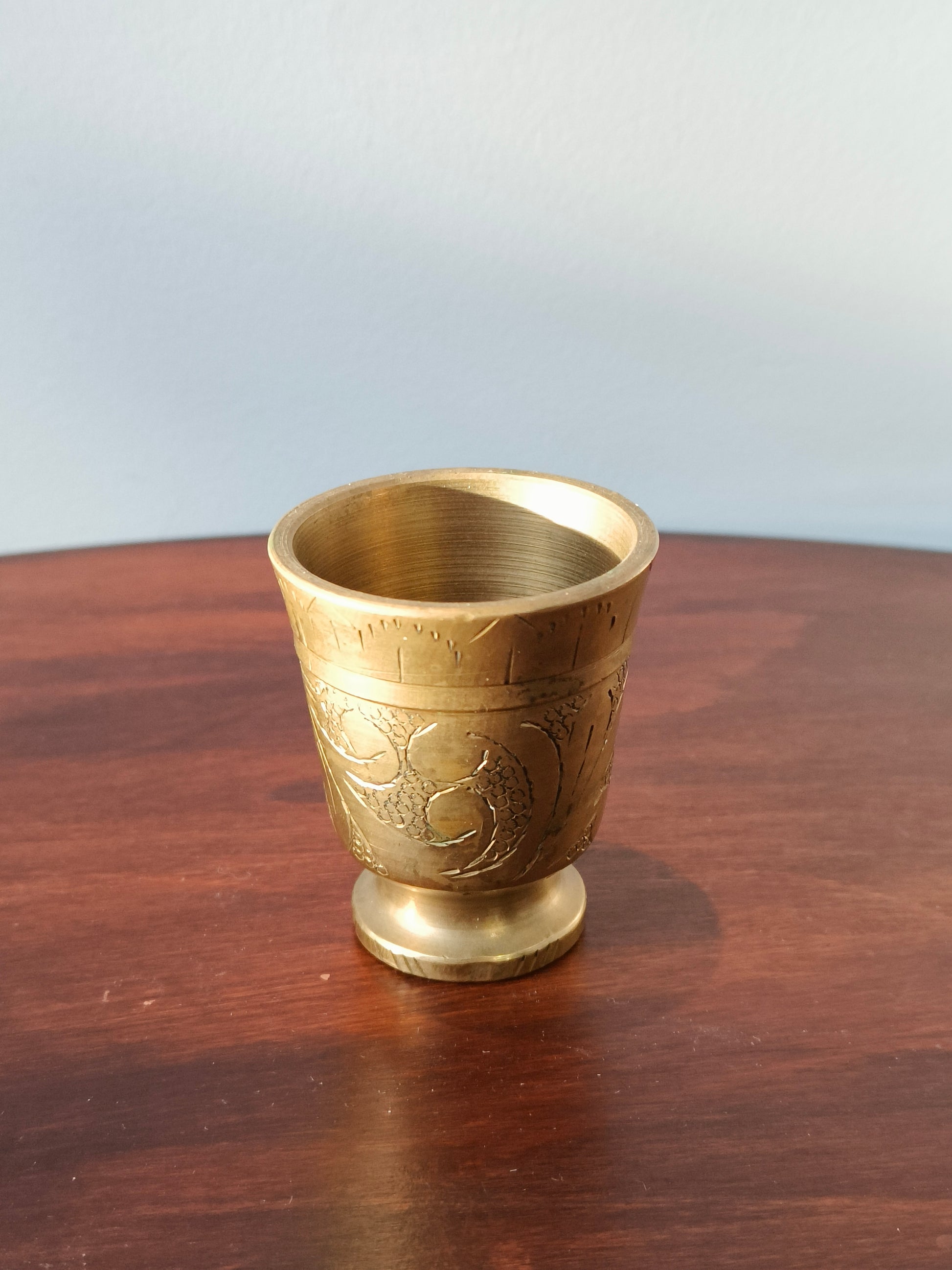 Moździerz miniatura z mosiądzu, zdobiony motywem roślinnym.