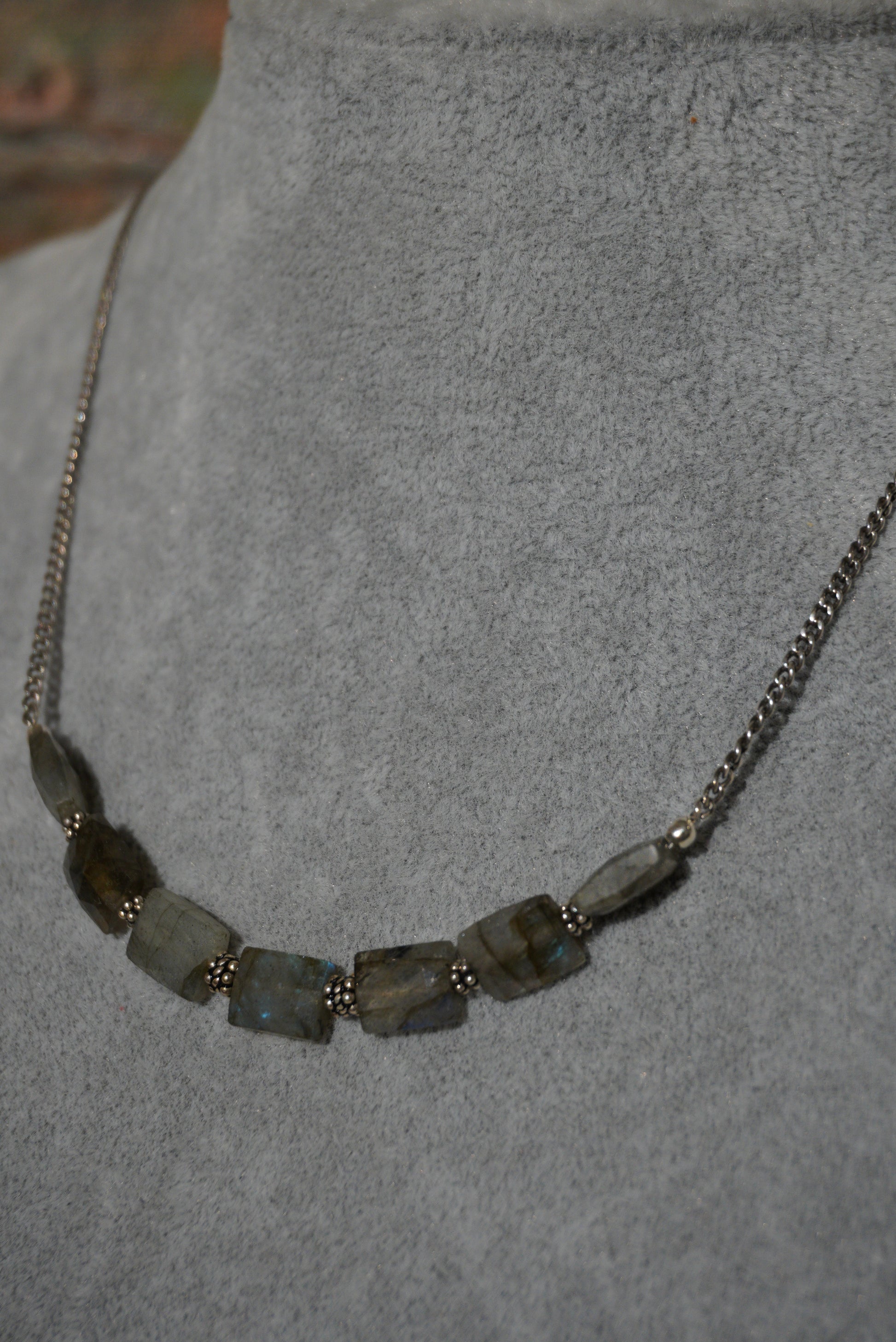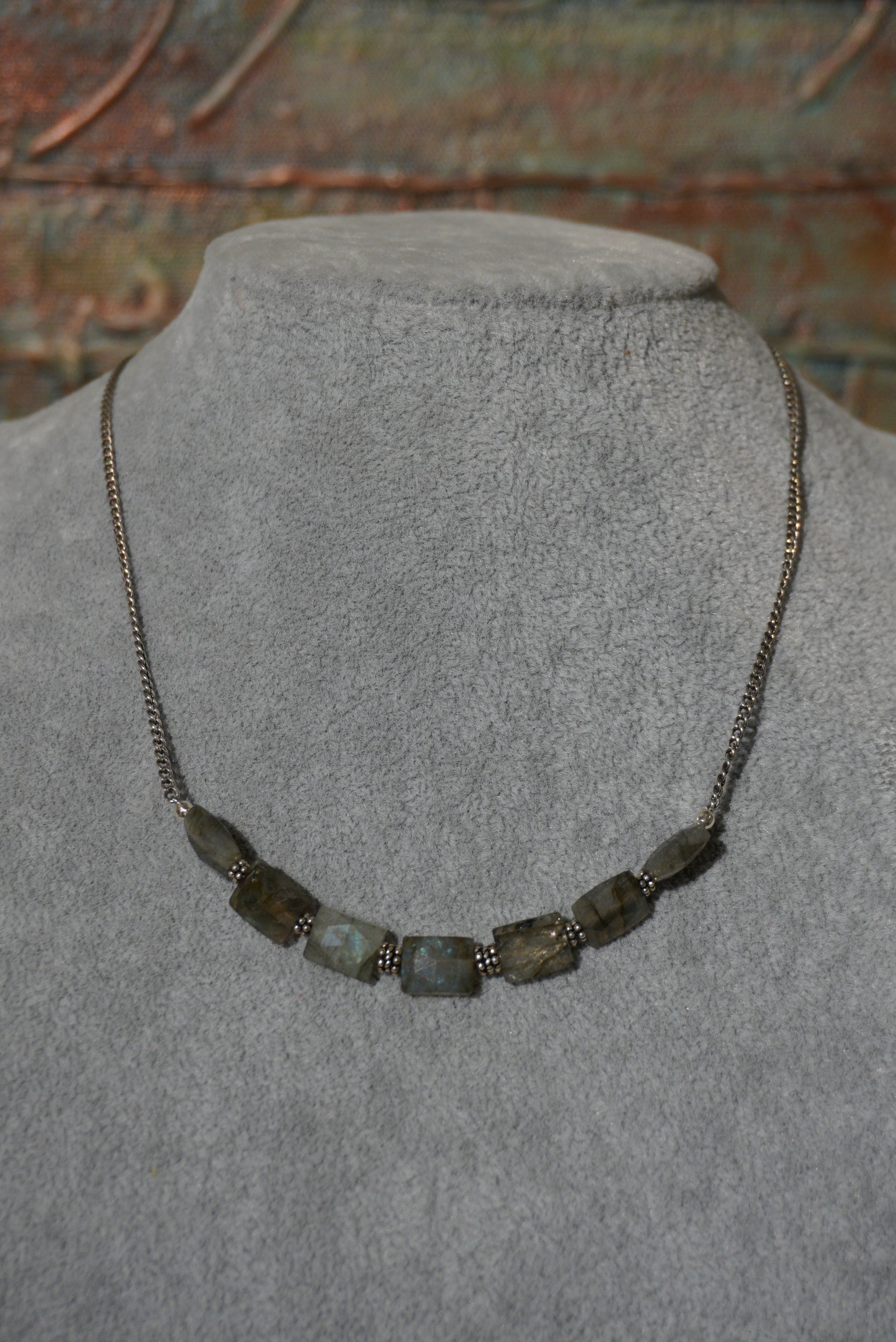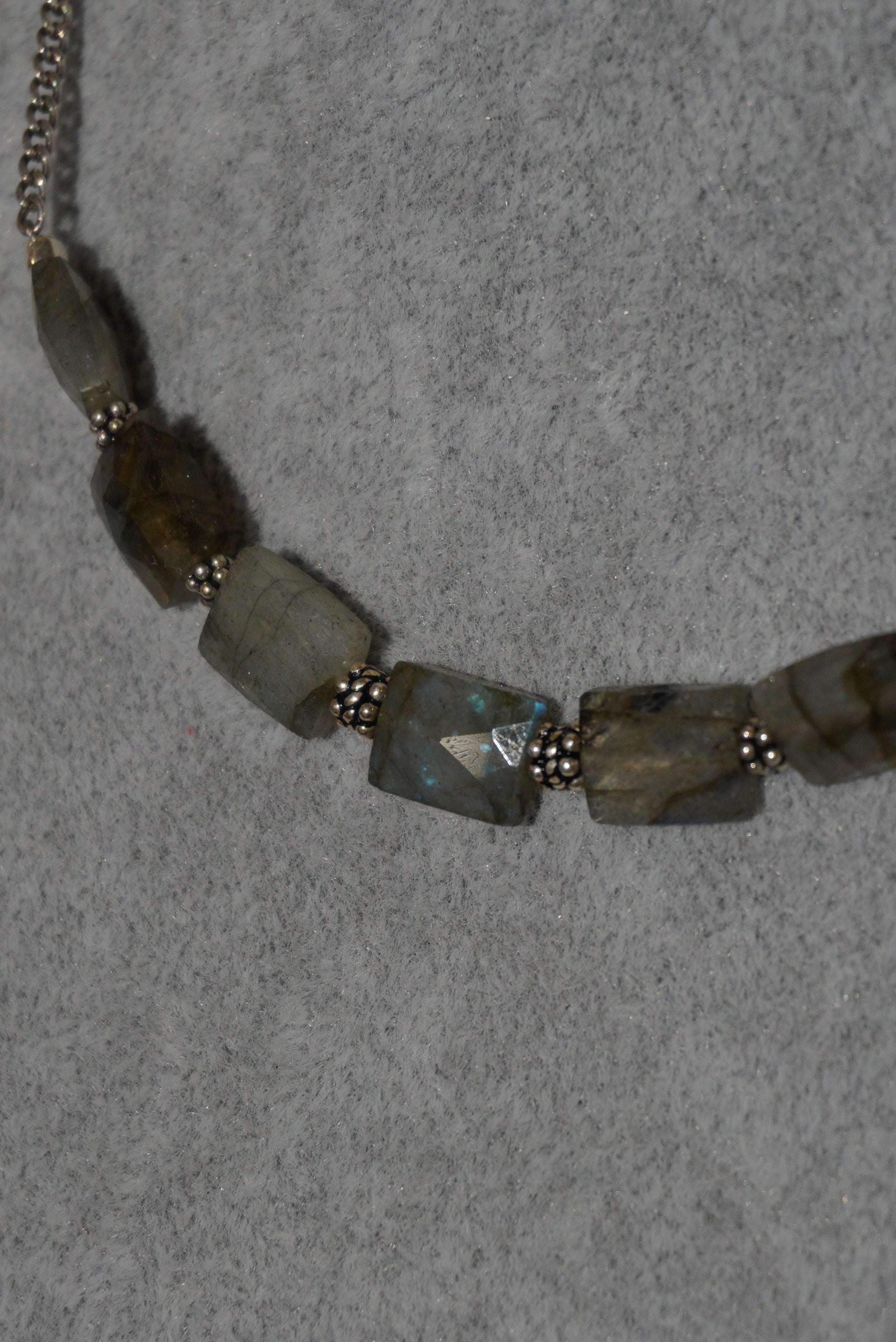 Naszyjnik z fasetowanego labradorytu, ze srebrnym łańcuszkiem.
