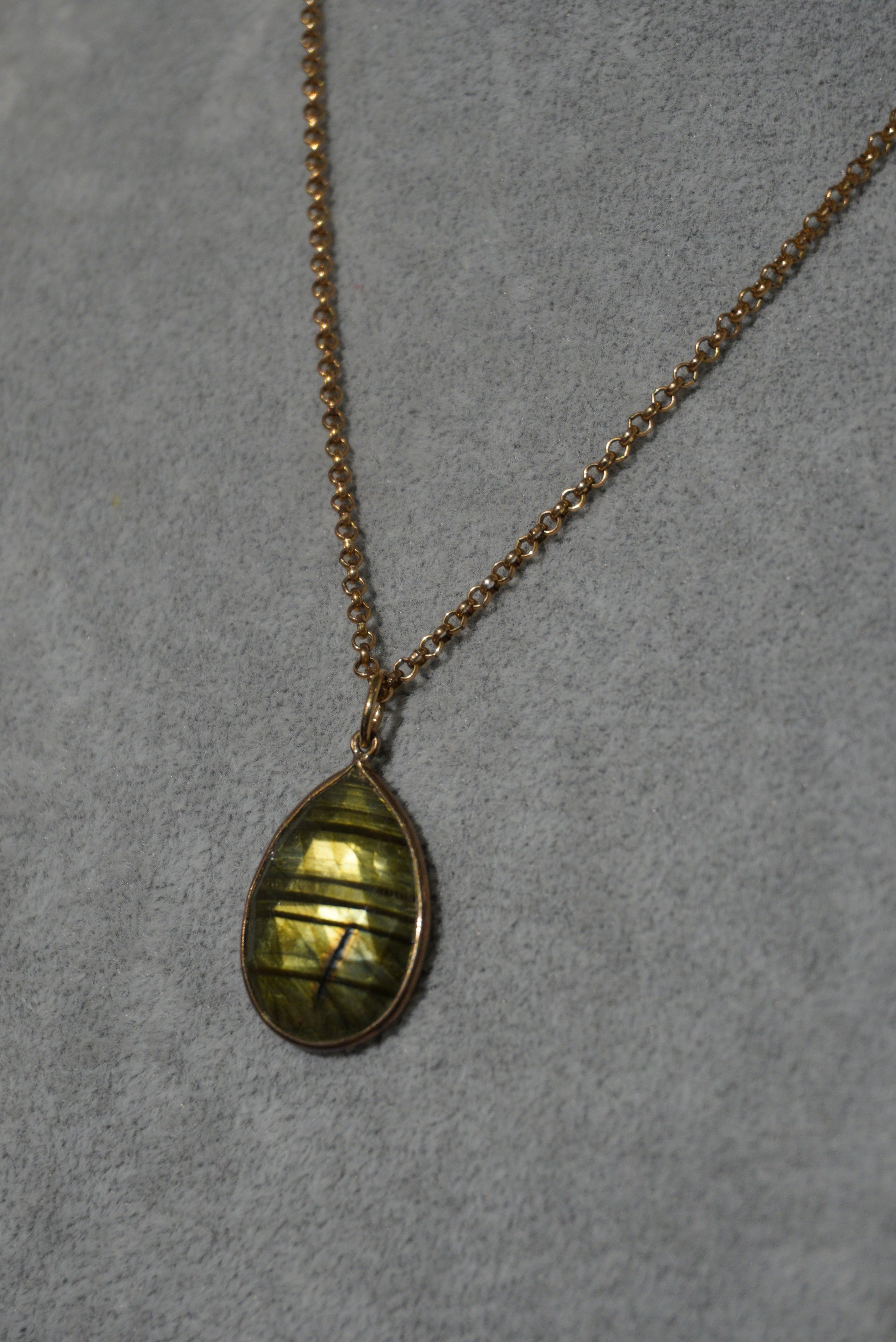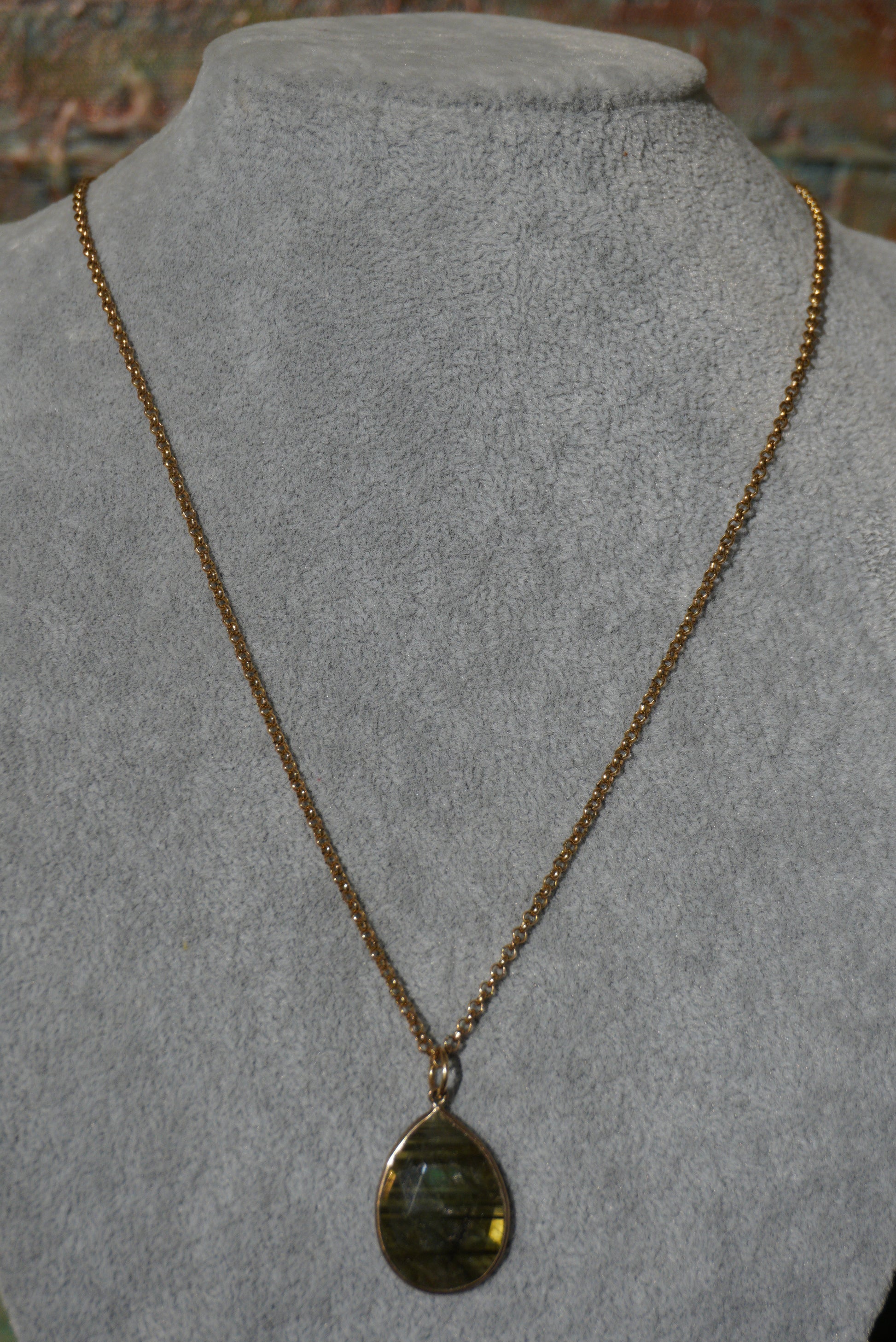 Naszyjnik, łańcuszek pozłacany, wisior labradoryt w kształcie łezki w odcieniach zieleni, oprawiony w sr. pozłacane.