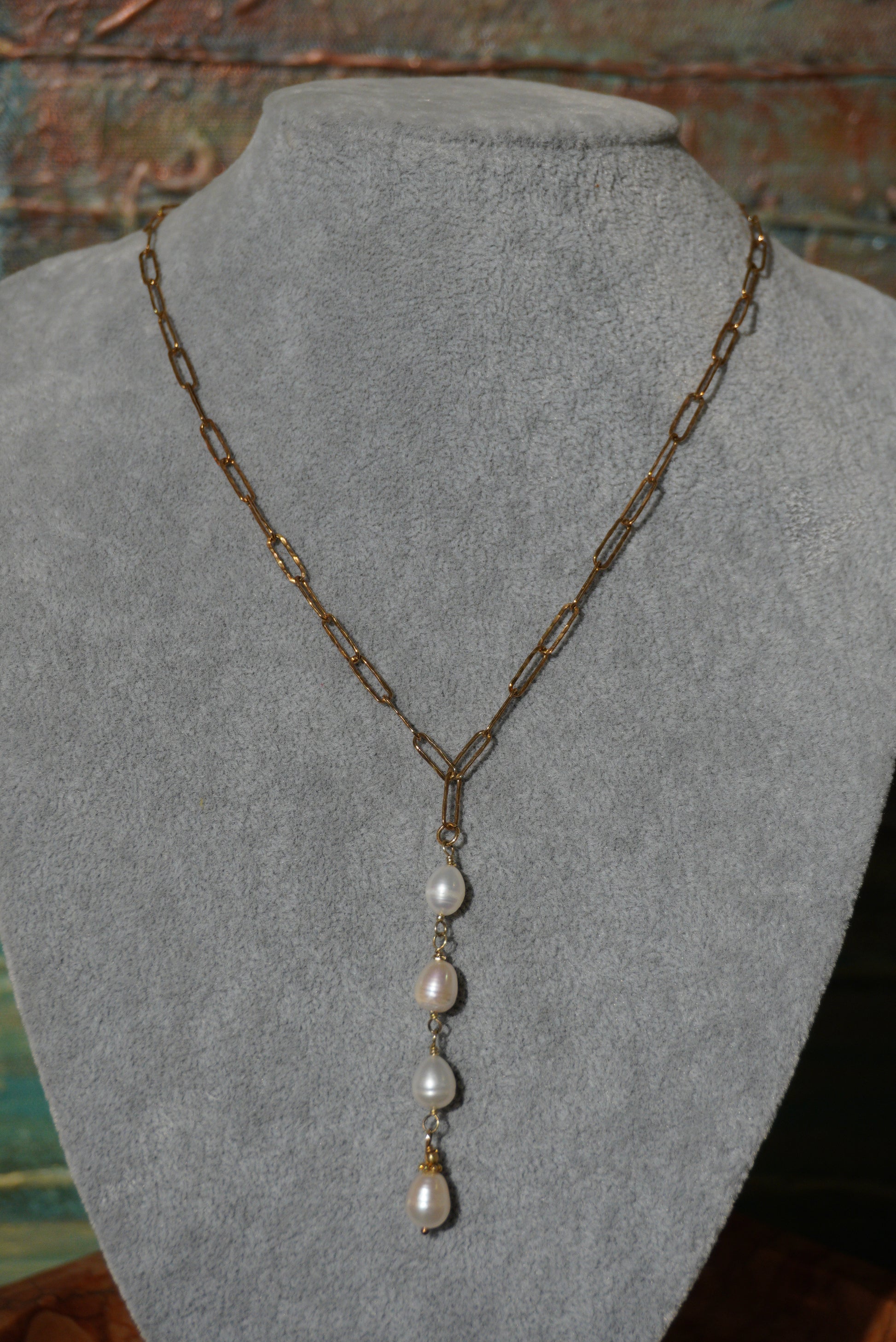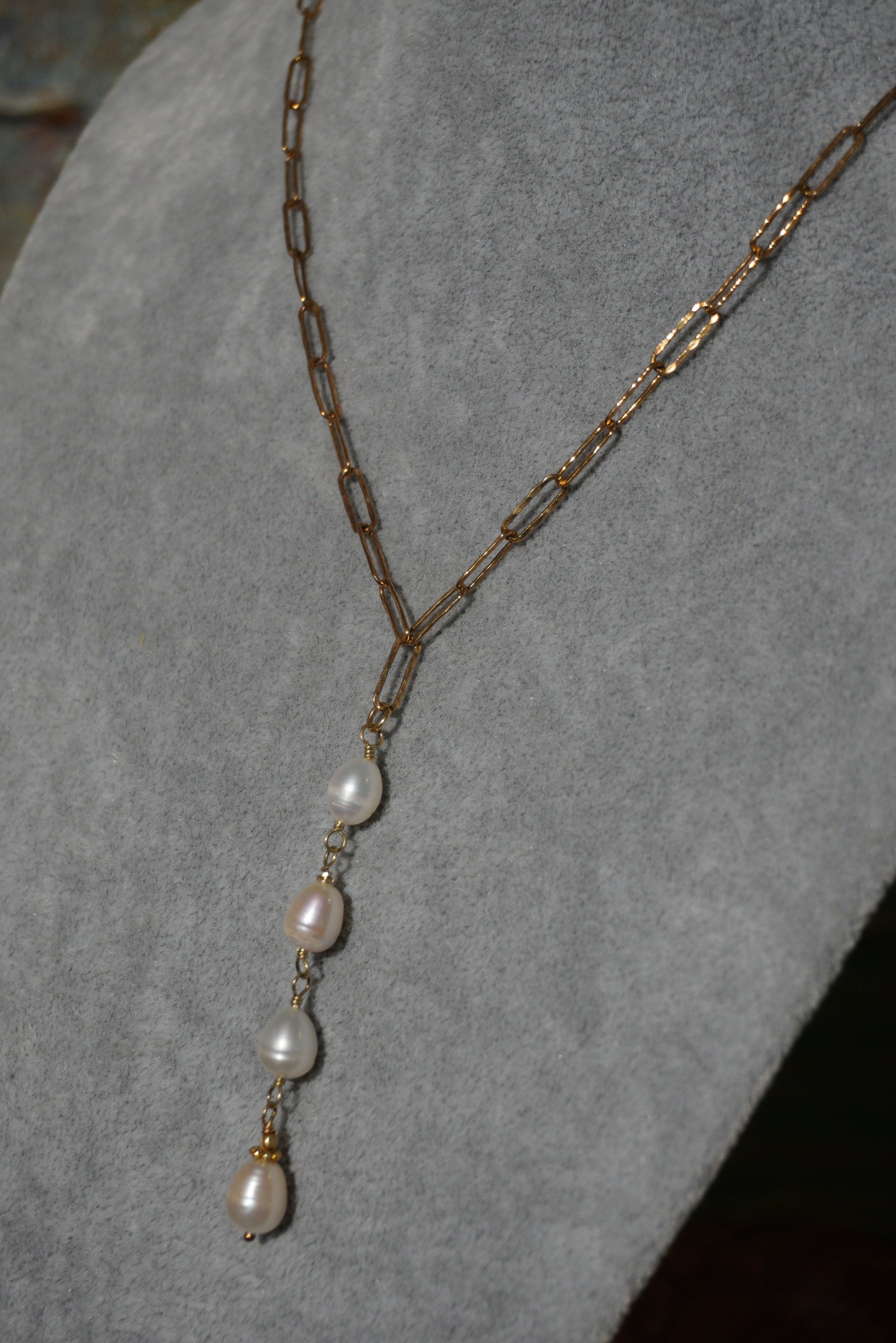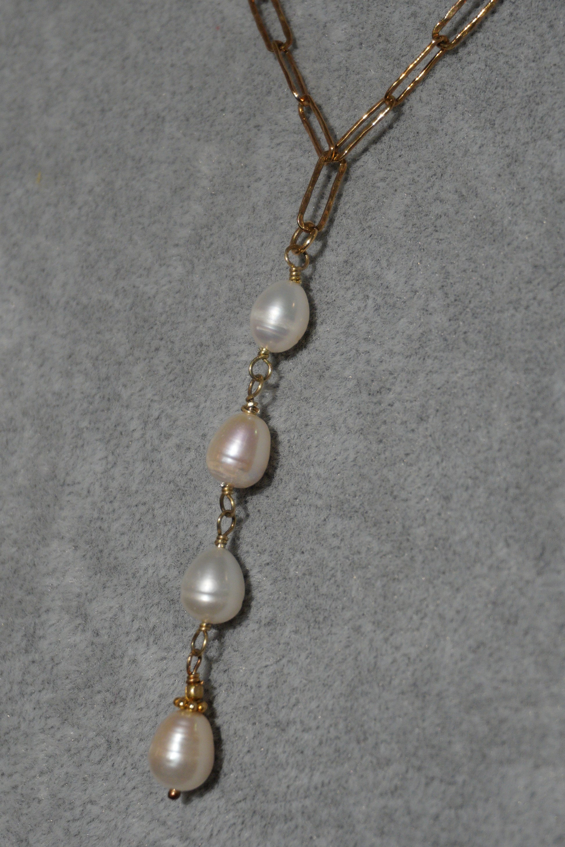 Naszyjnik, łańcuszek ze srebra pozłacanego, wisior - cztery perełki zawieszone na łańcuszku.