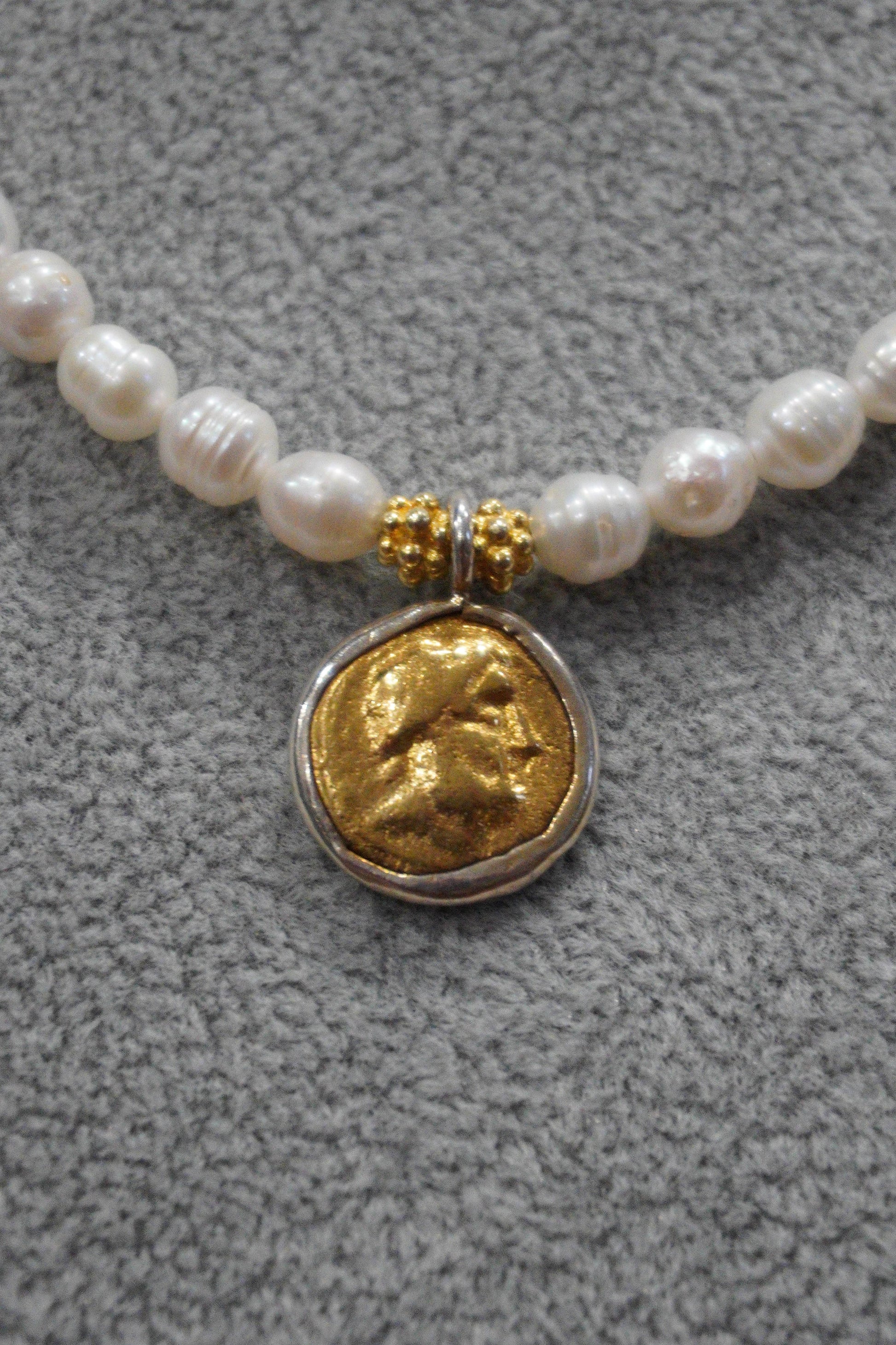 Naszyjnik, perła hodowlana, drobna, zawieszka w kształcie monety rzymskiej, srebro pozłacane.