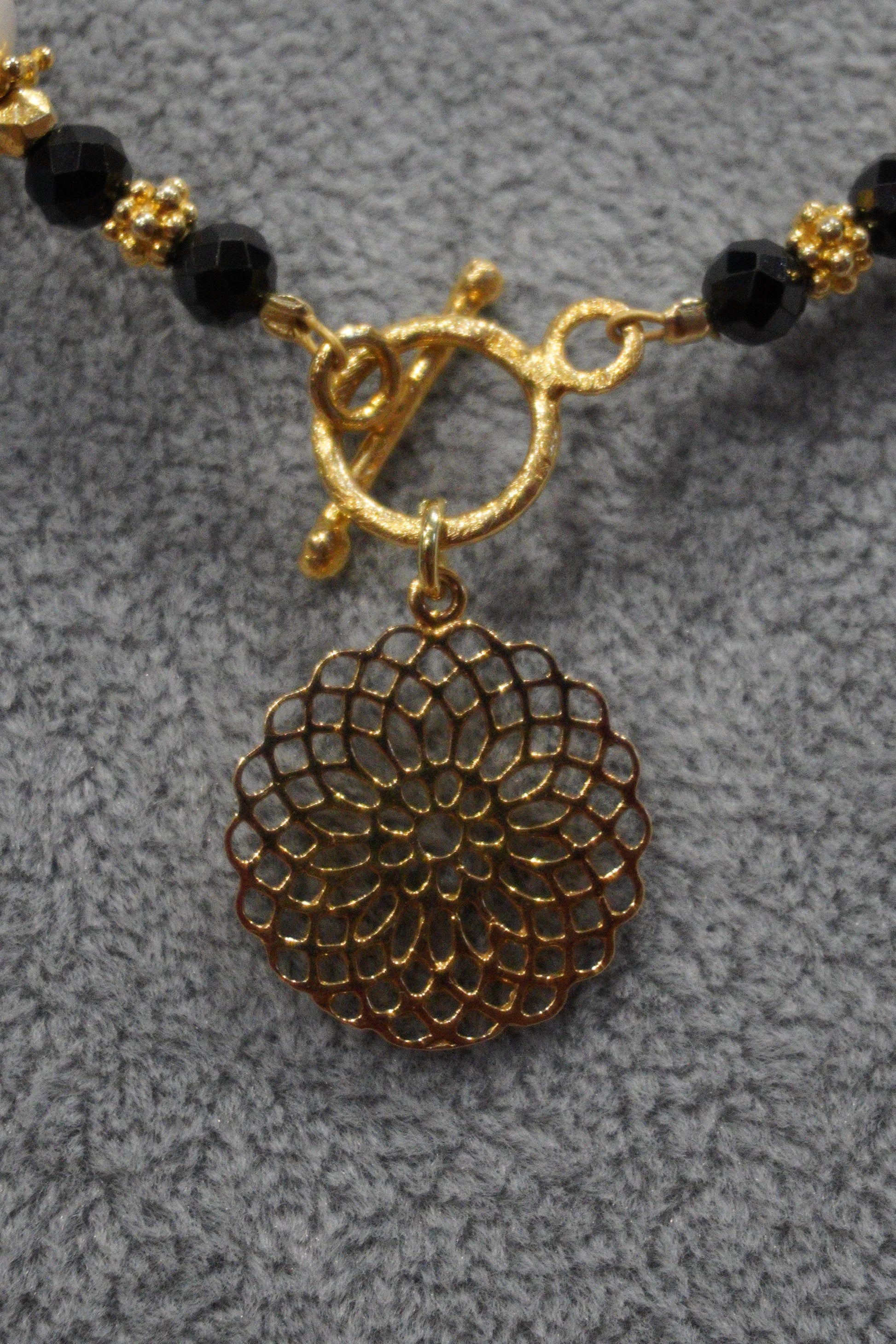 Naszyjnik, perła hodowlana, turmalin, zawieszka ażurowa w kształcie kwiatu, srebro pozłacane.