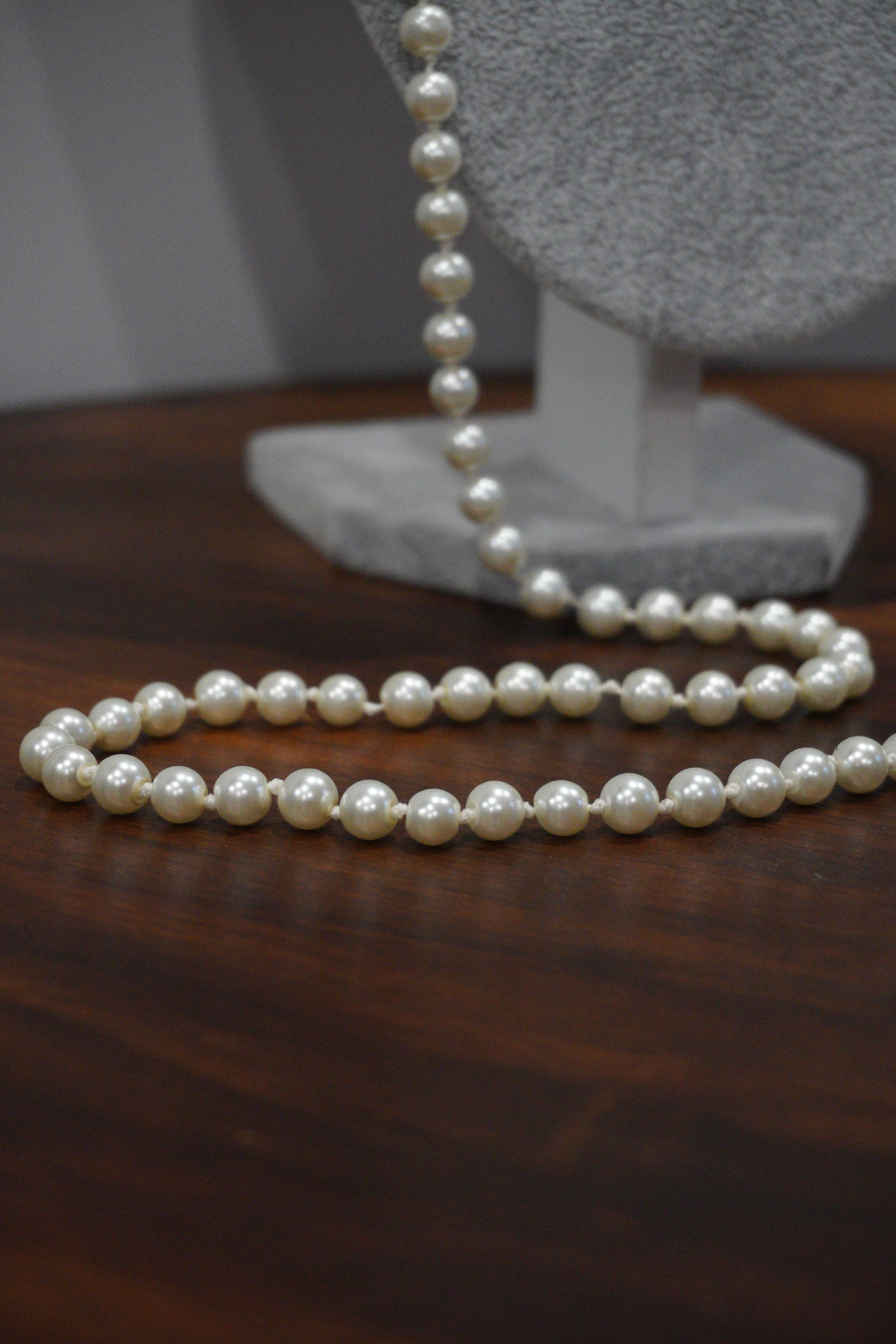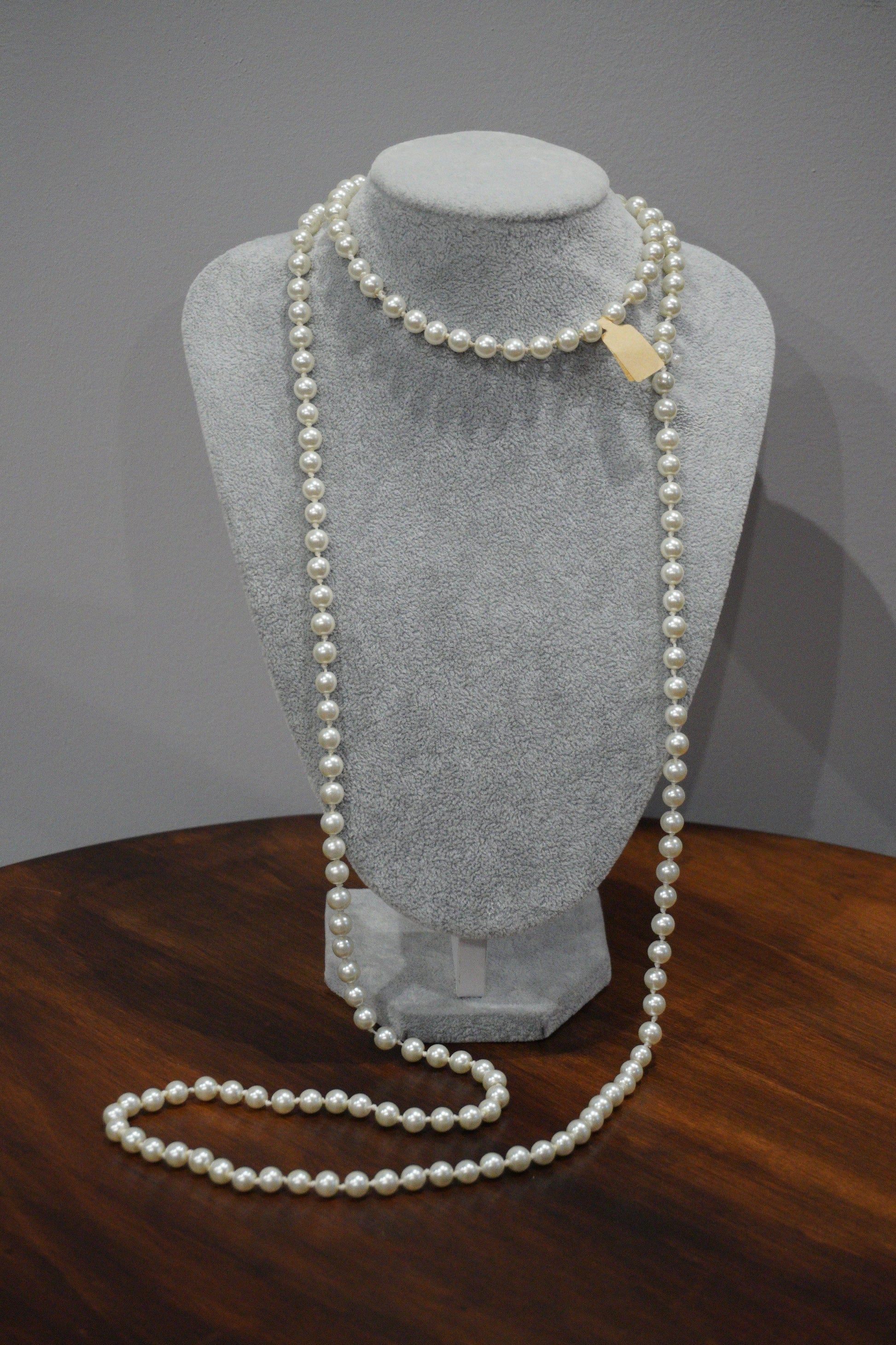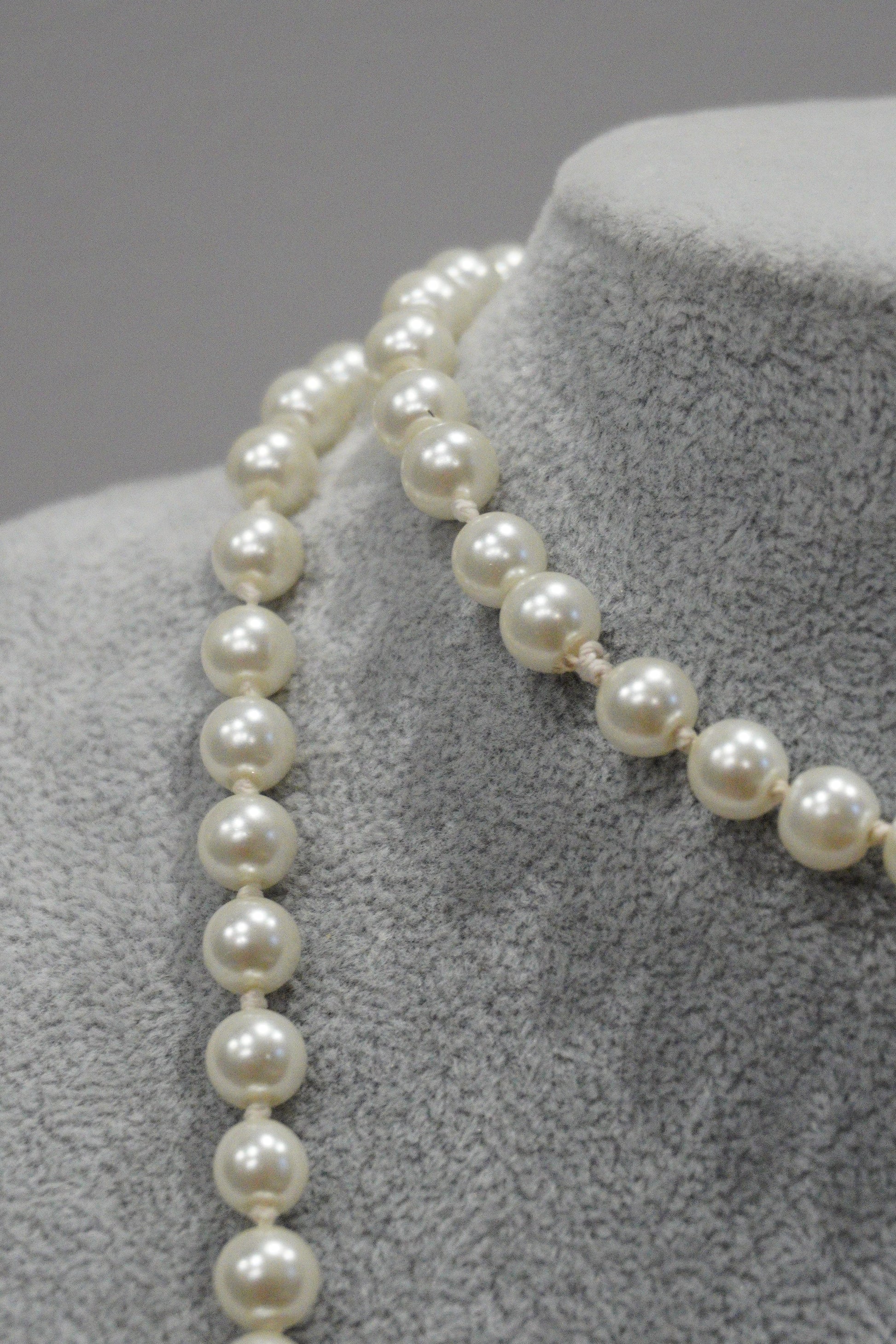 Bardzo długi naszyjnik ze sztucznej perły, supełkowany.