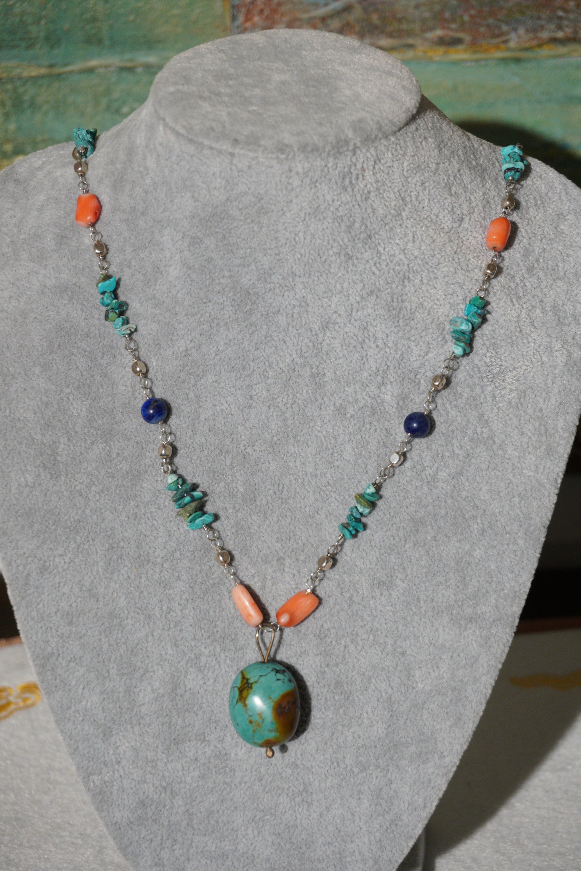 Naszyjnik turkus, koral, lapis lazuli, srebro 925